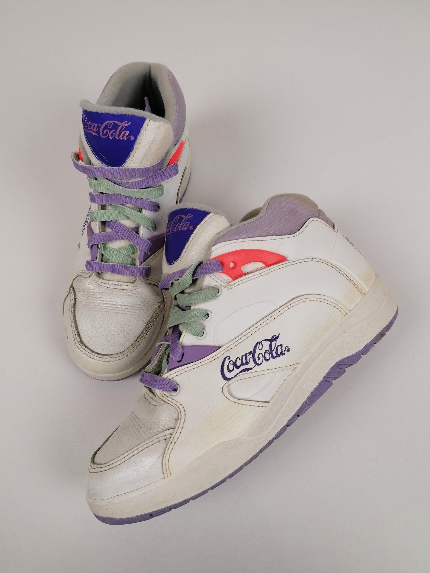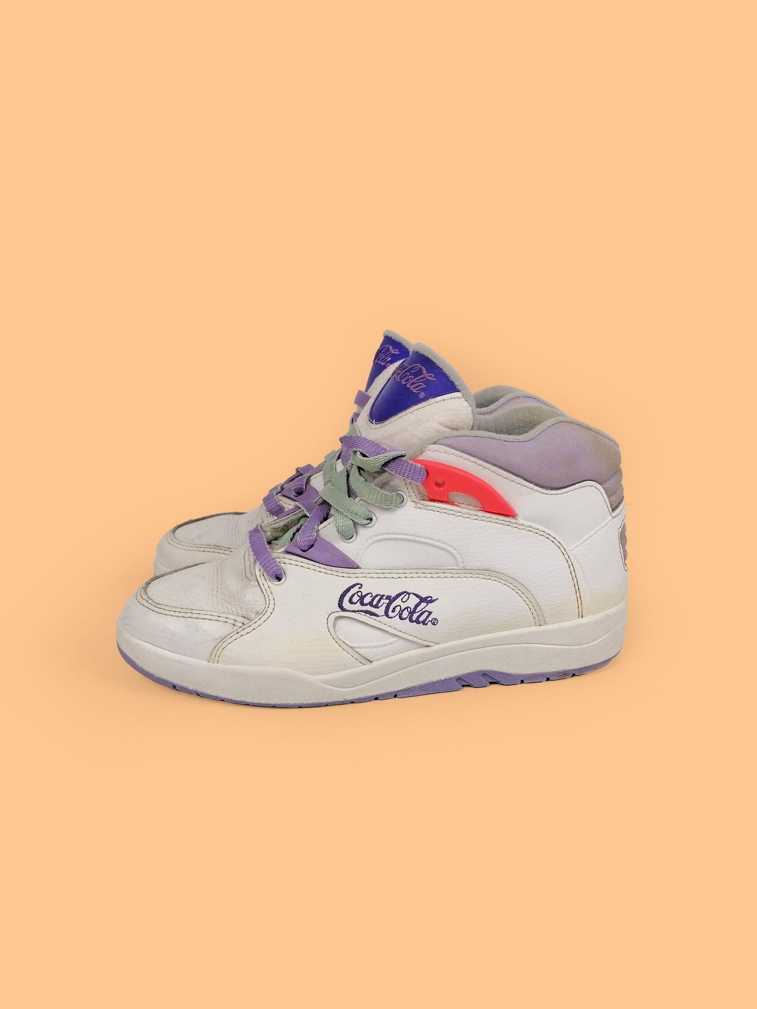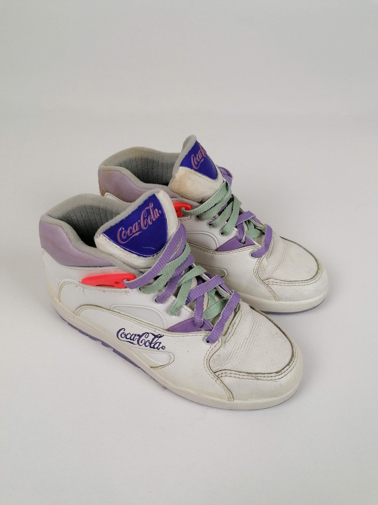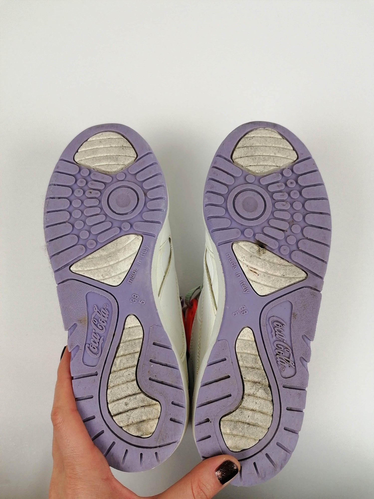 Authentic 1990's Coca Cola sneakers, two-tone laces in lilac and mint green, embroidery logo in purple. White leather, rubber midsoles, plastic accents in fluo orange.