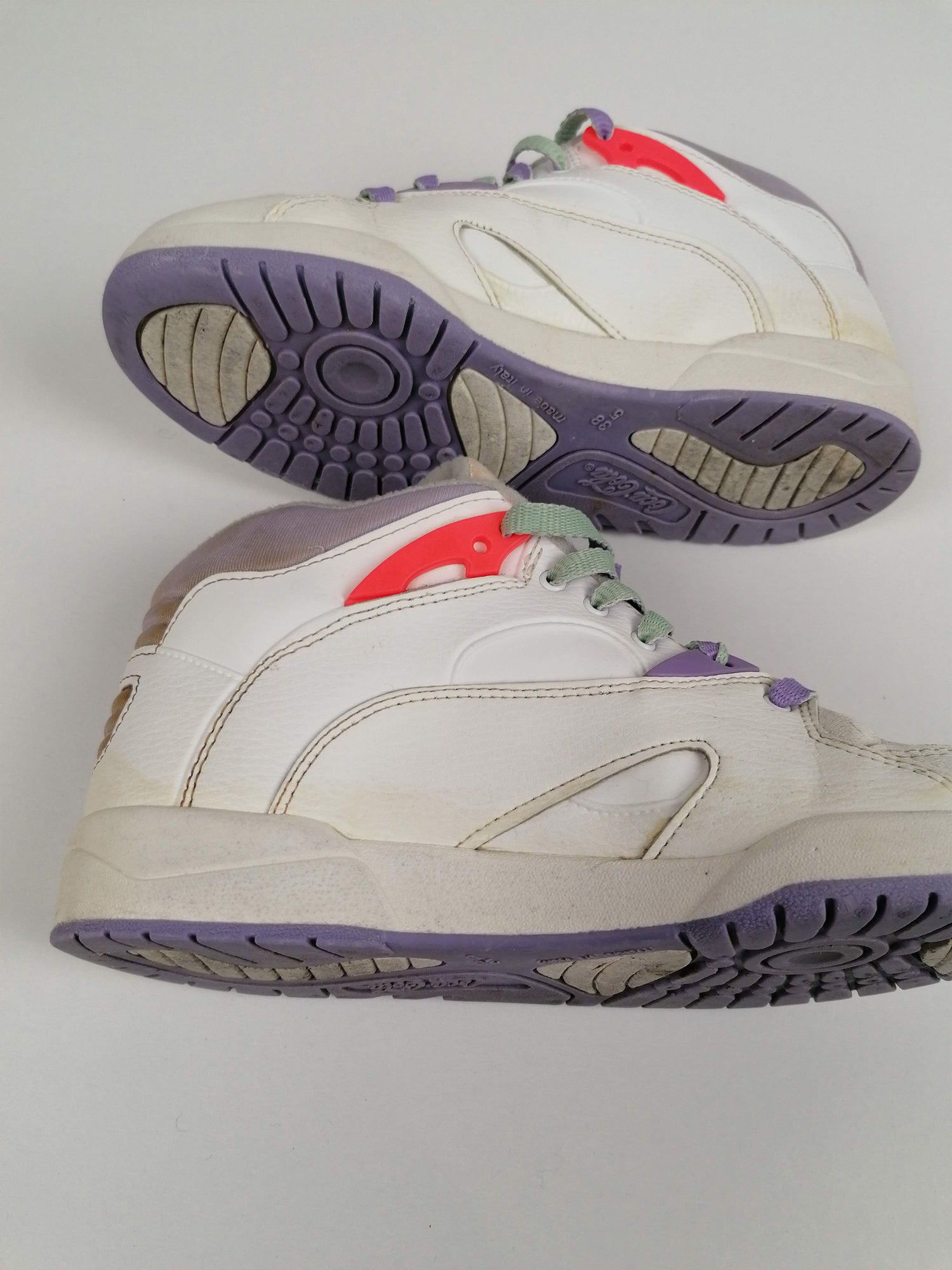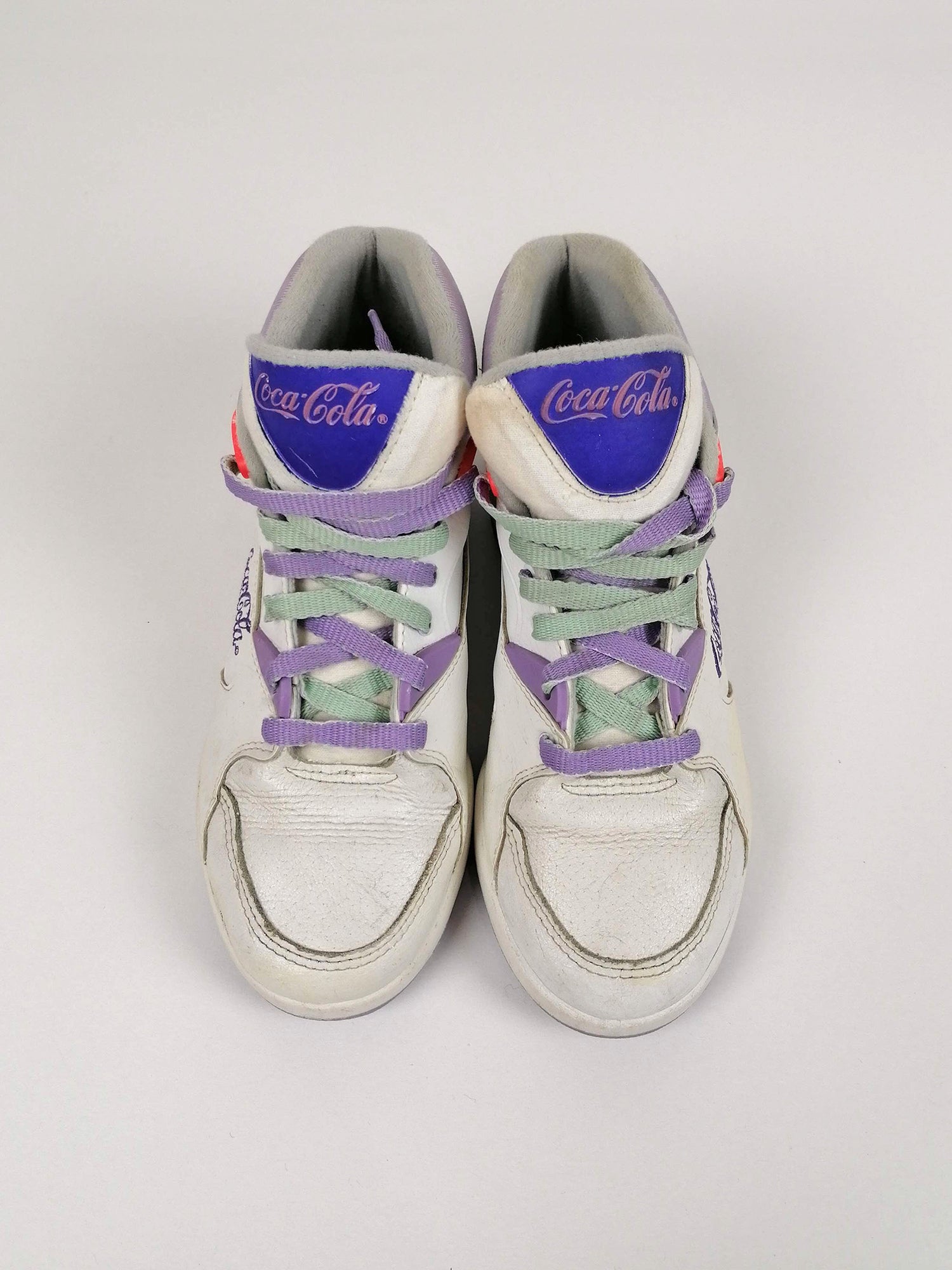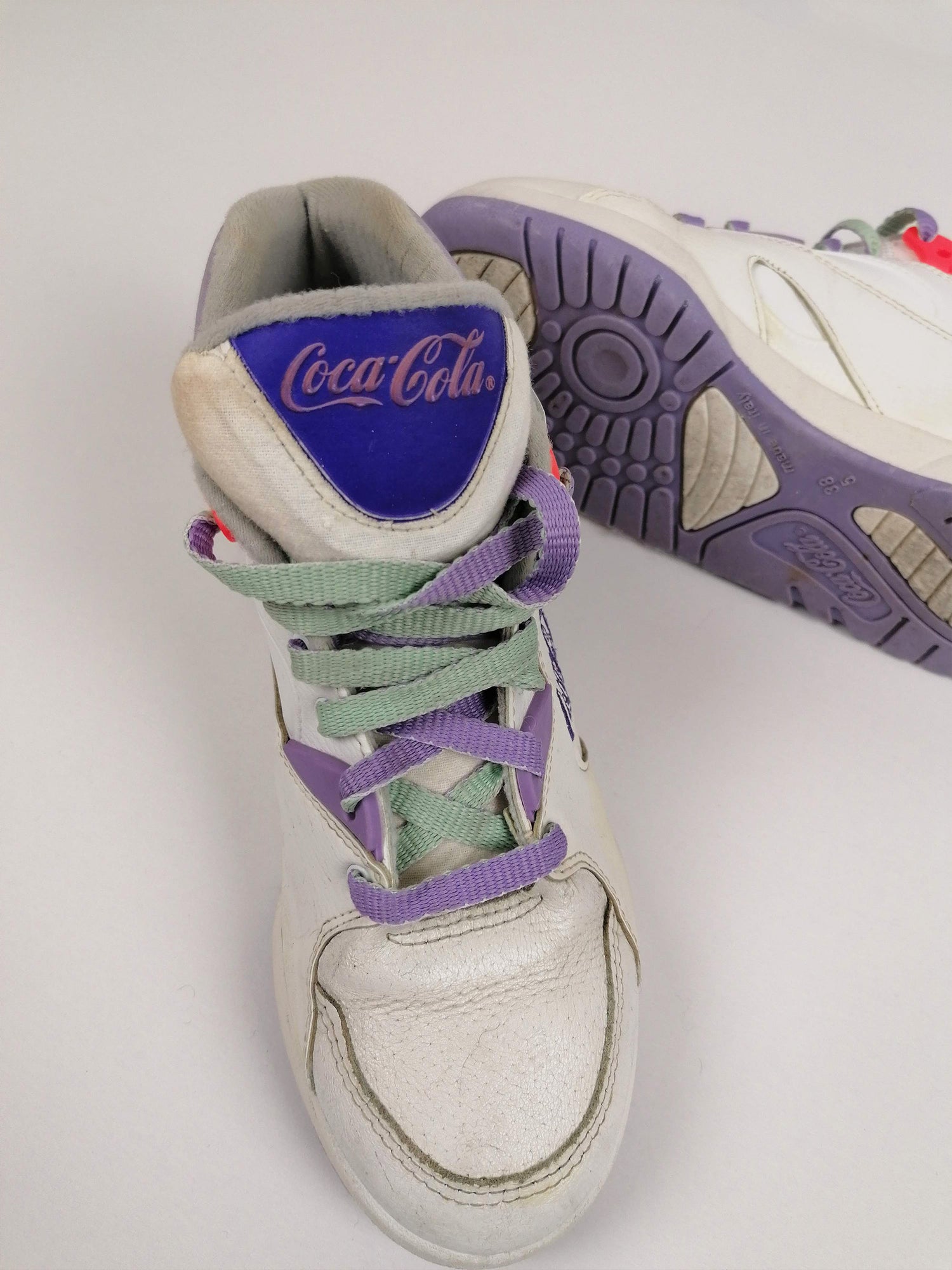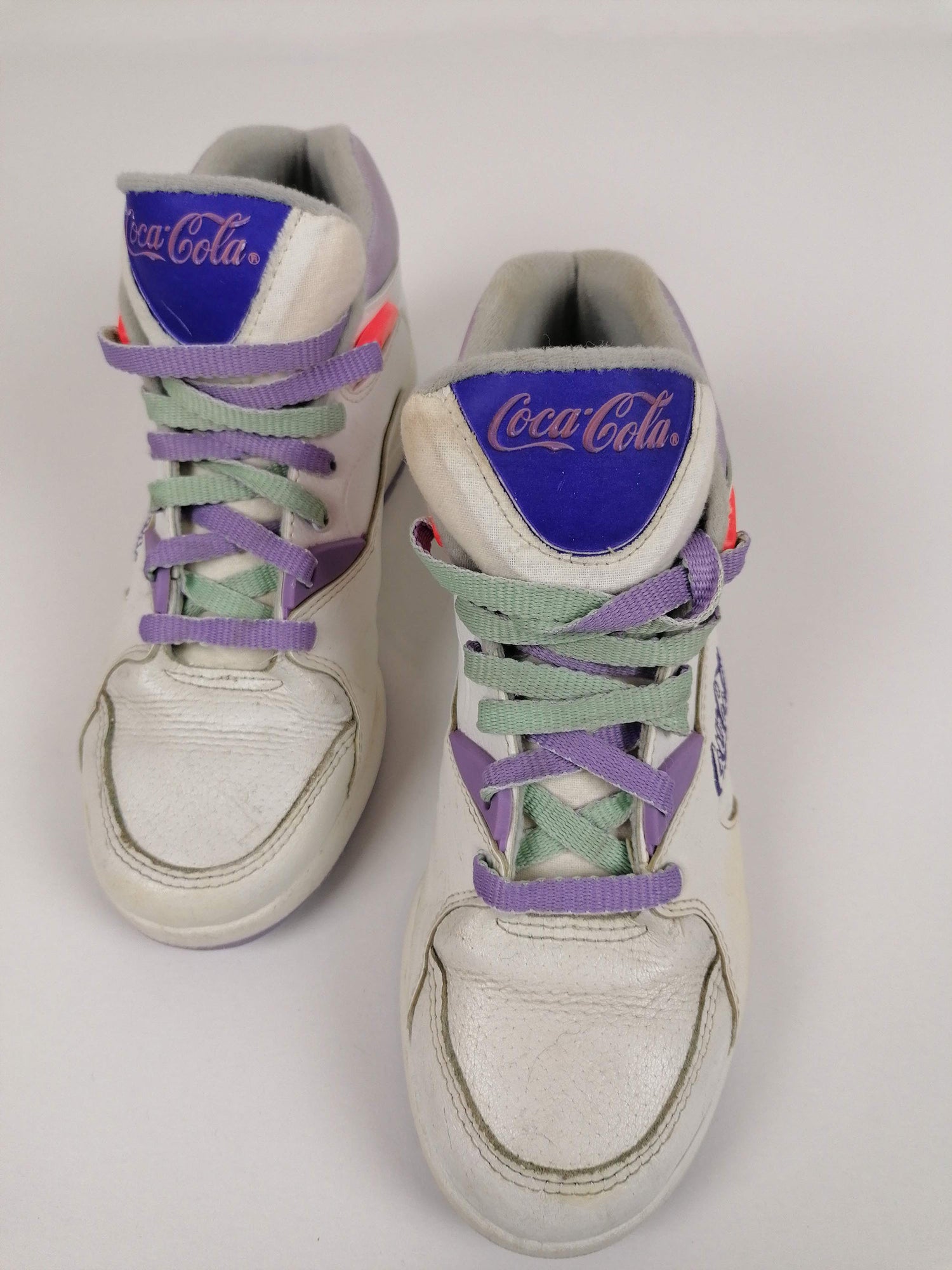 Authentic 1990's Coca Cola sneakers, two-tone laces in lilac and mint green, embroidery logo in purple. White leather, rubber midsoles, plastic accents in fluo orange.