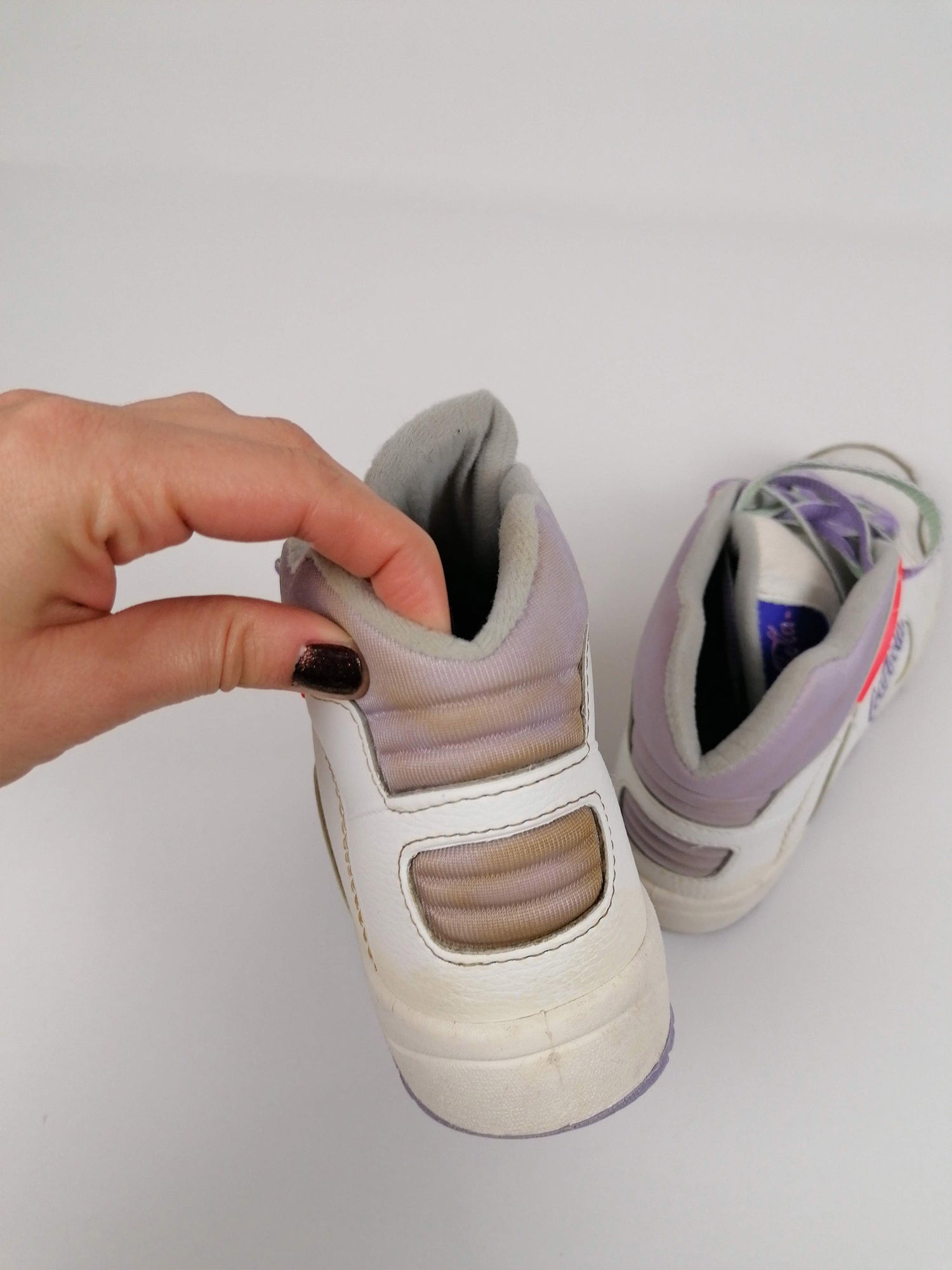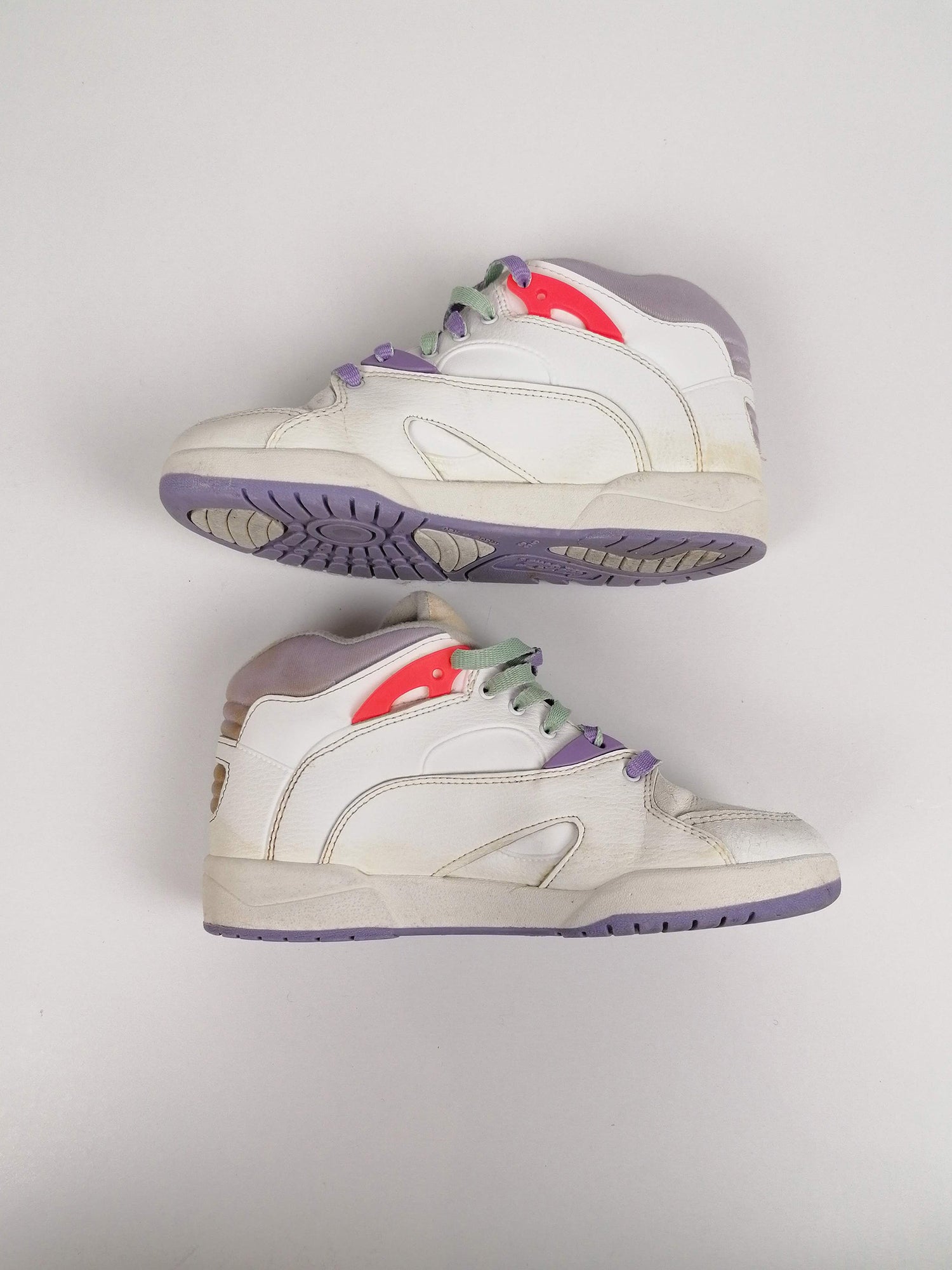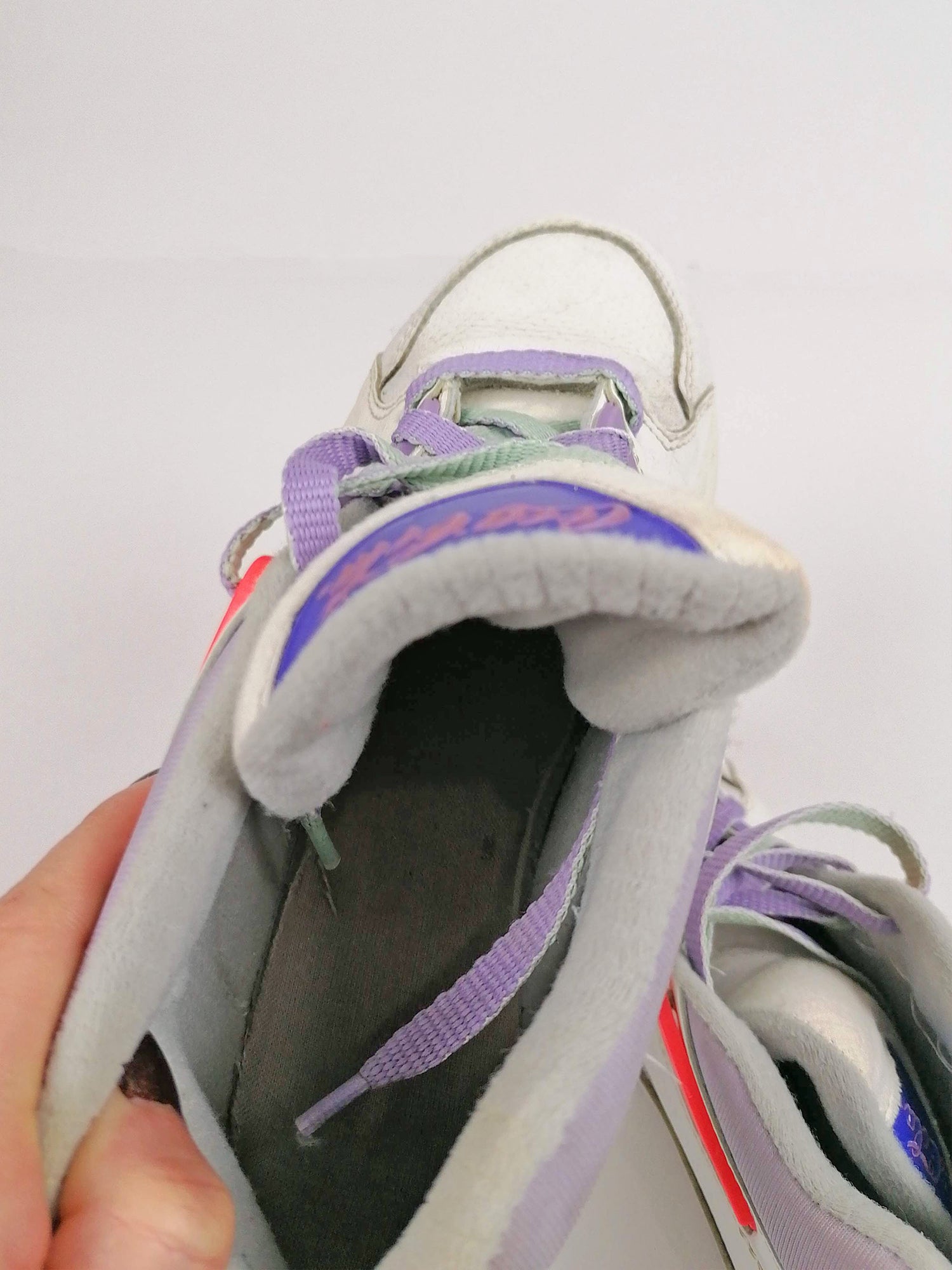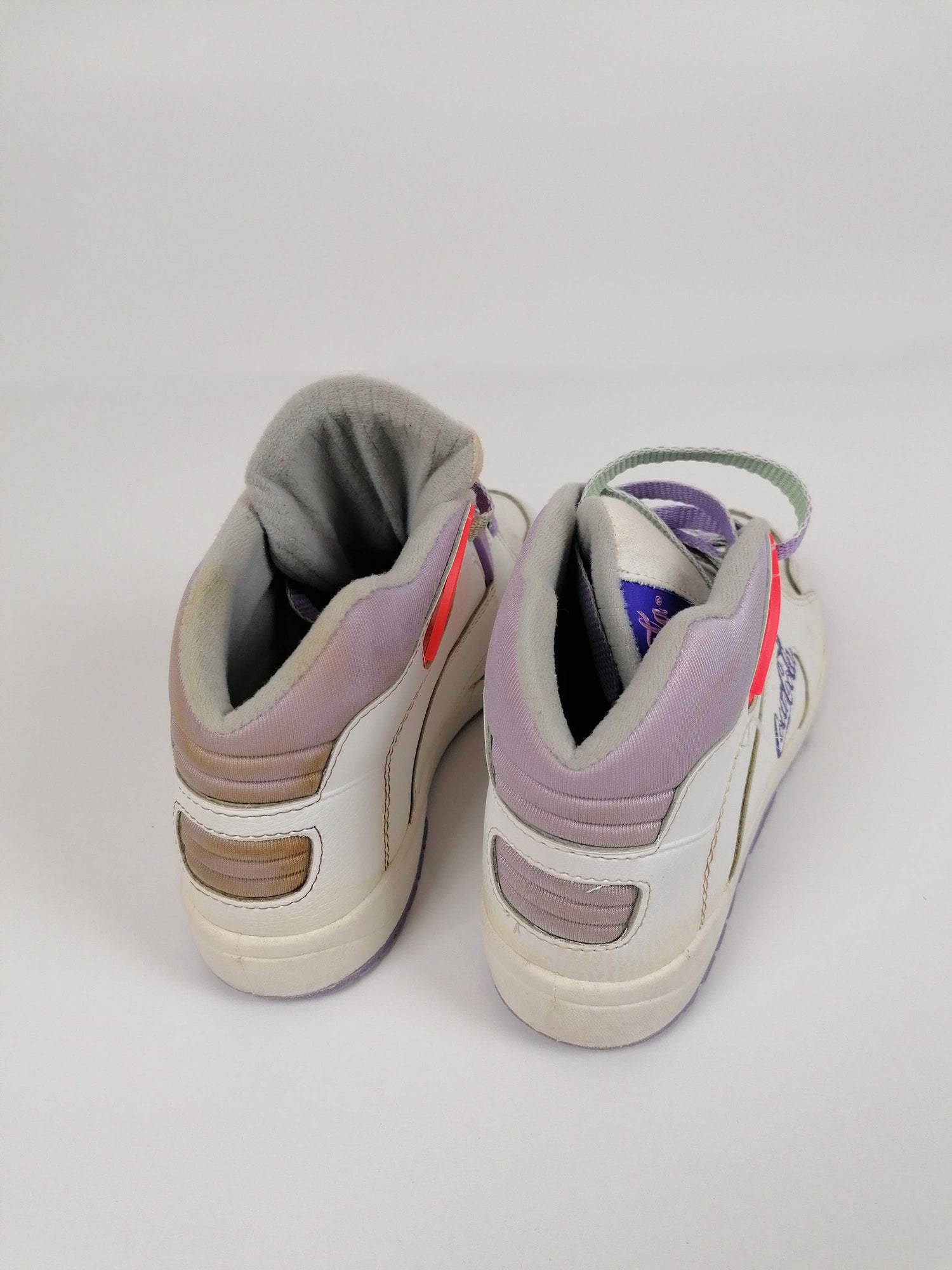 Authentic 1990's Coca Cola sneakers, two-tone laces in lilac and mint green, embroidery logo in purple. White leather, rubber midsoles, plastic accents in fluo orange.