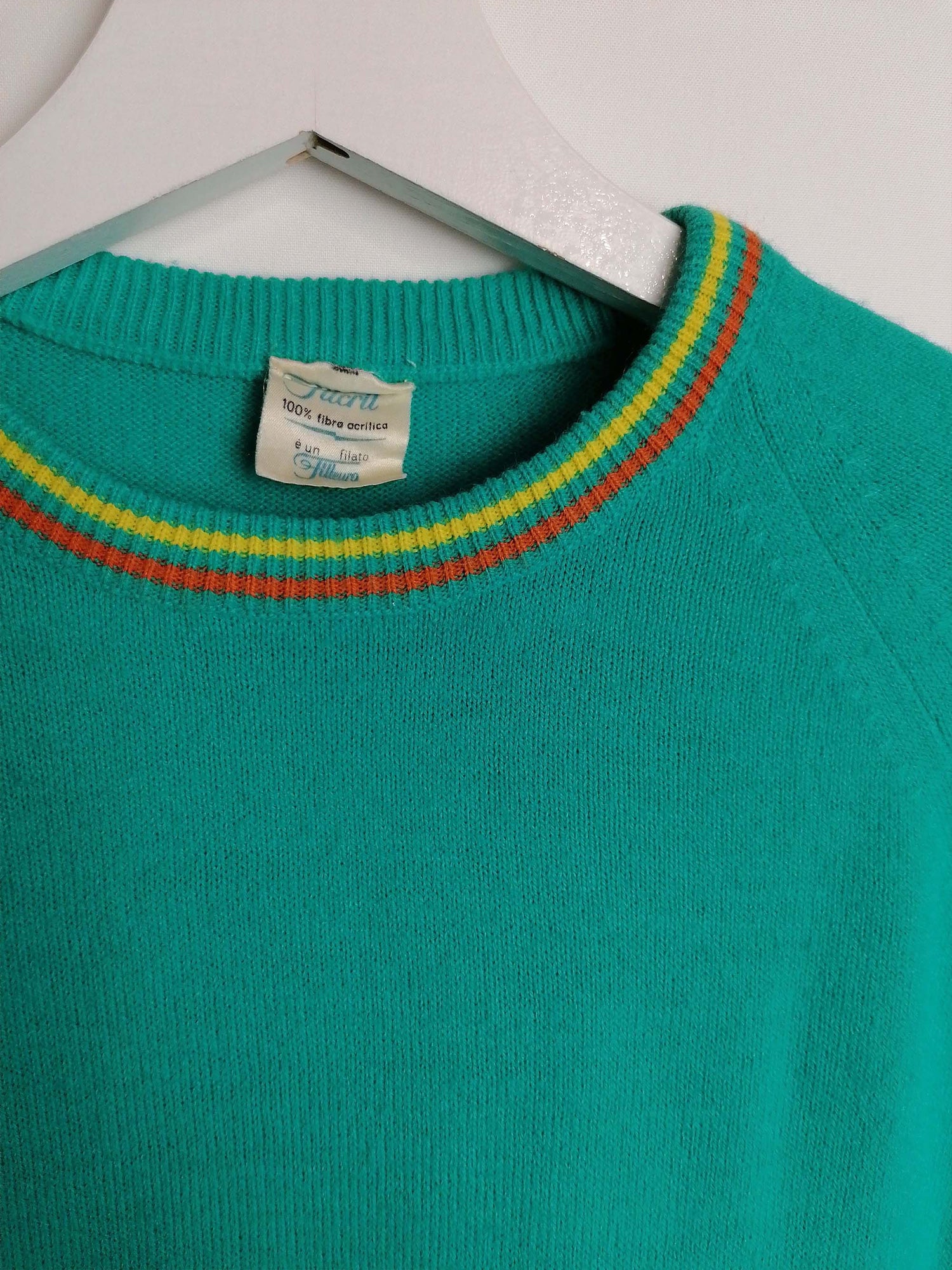 Exquisite vintage 70's soft knit acrylic top, turquoise with stripe accents on bottom and collar.