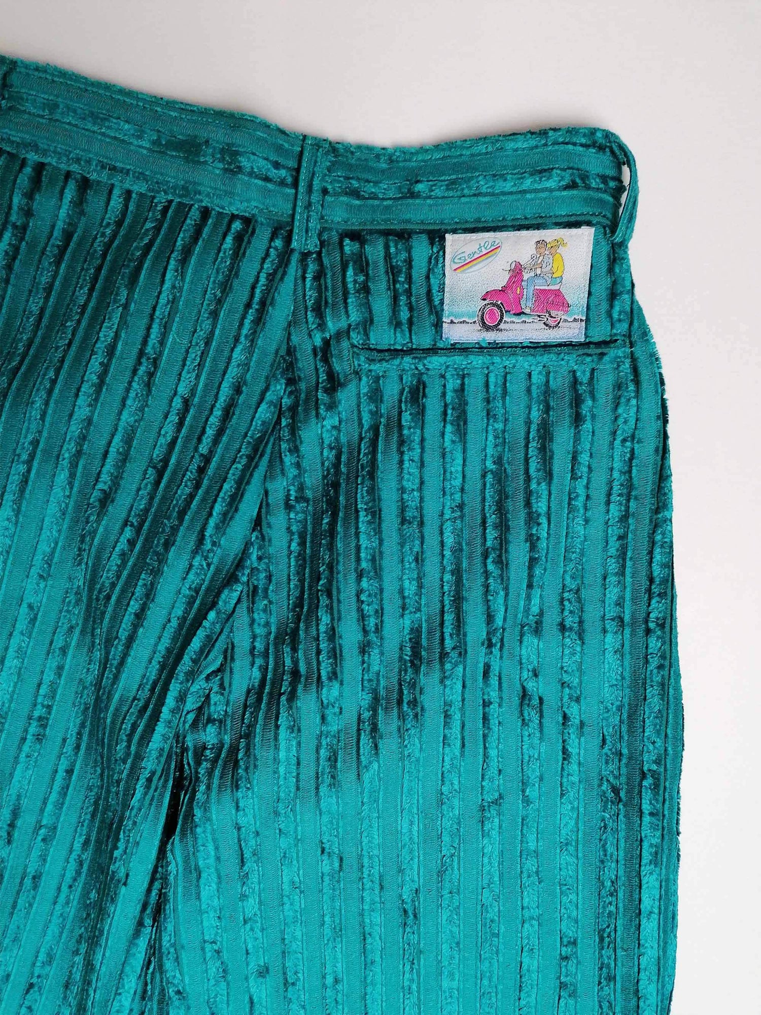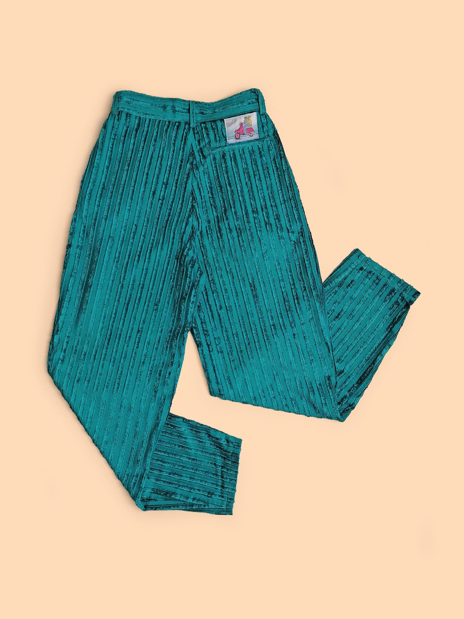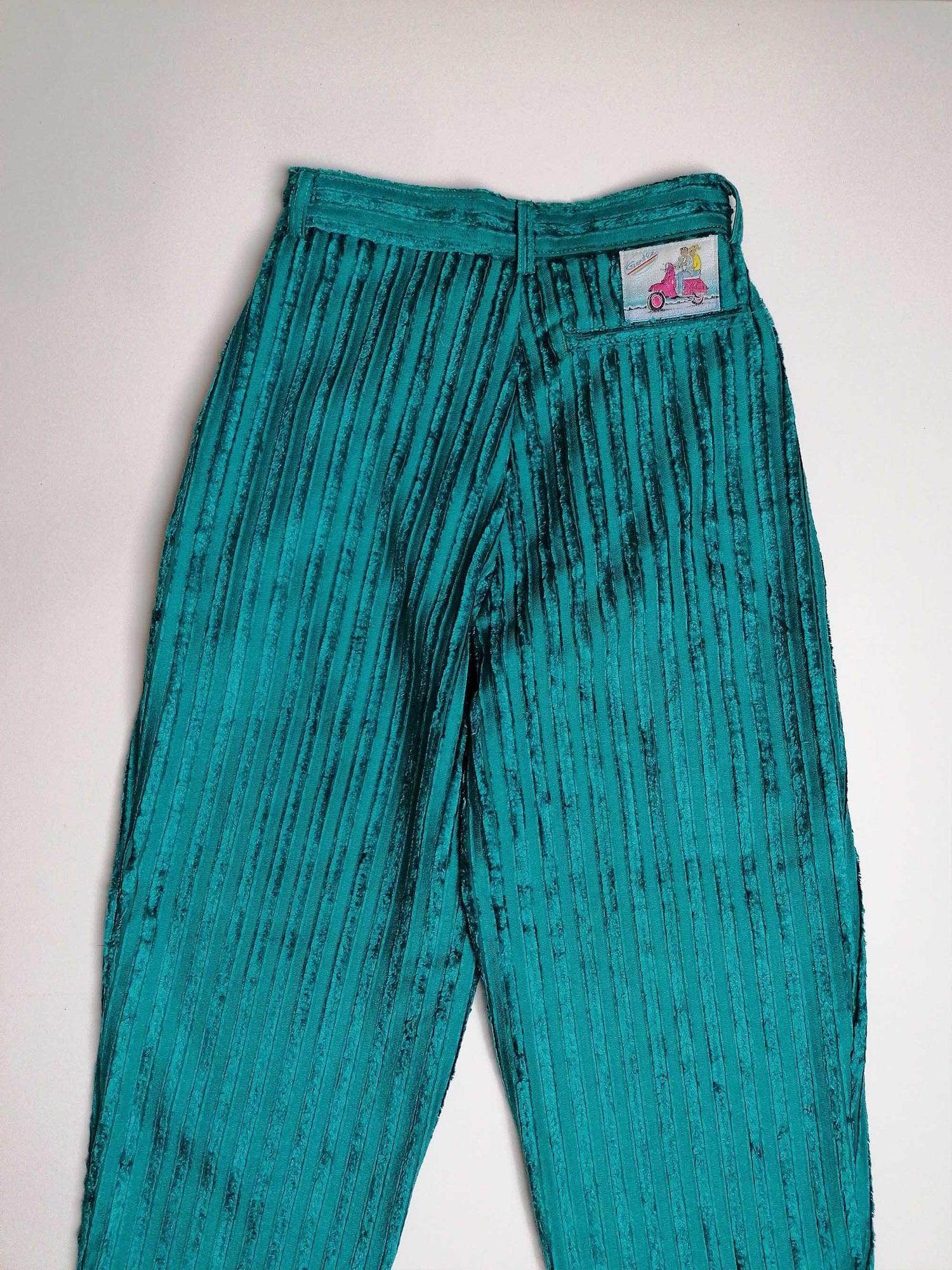 Gorgeous emerald green 80's high waist soft corduroy mom jeans, shiny, plush texture.