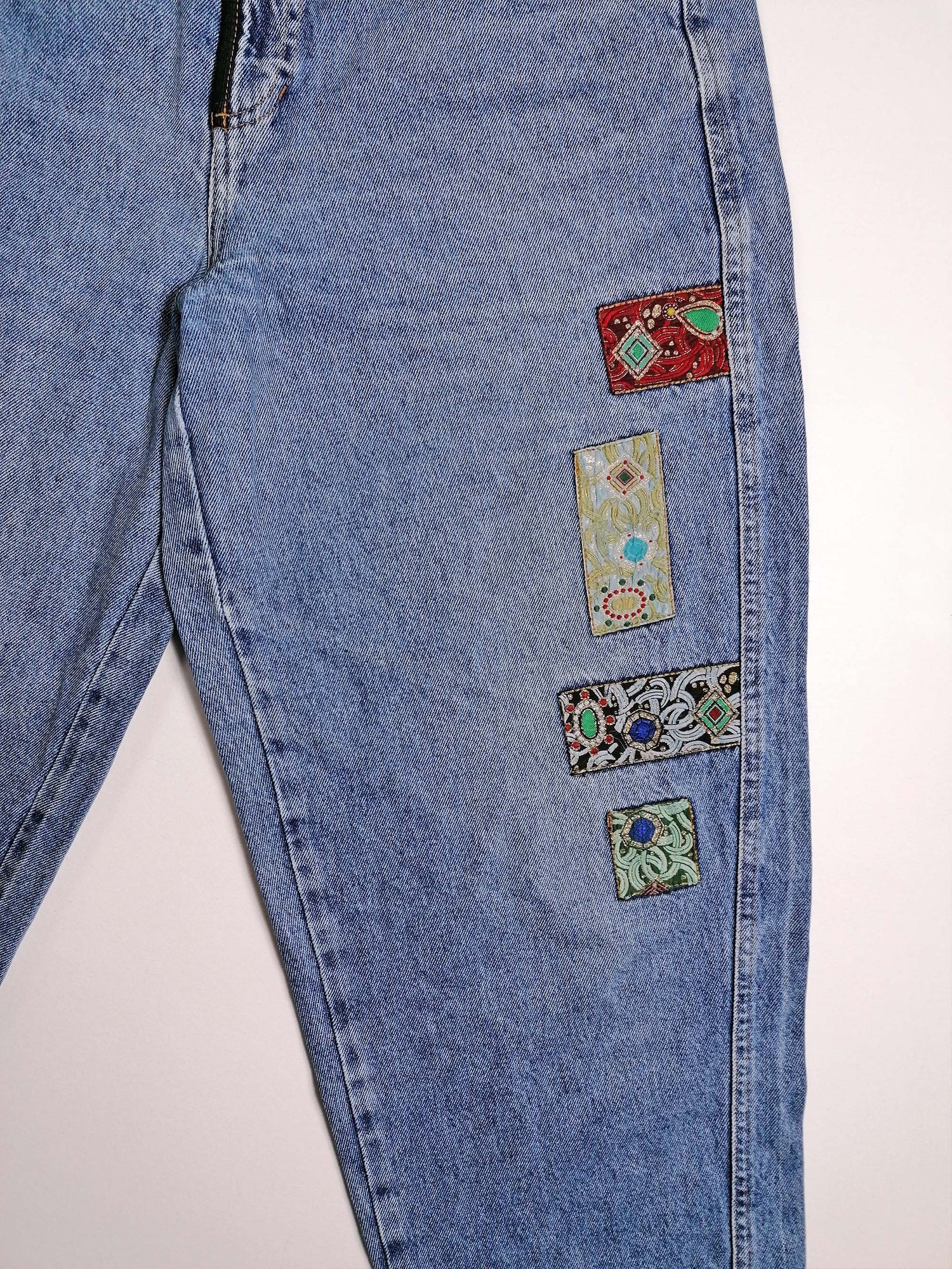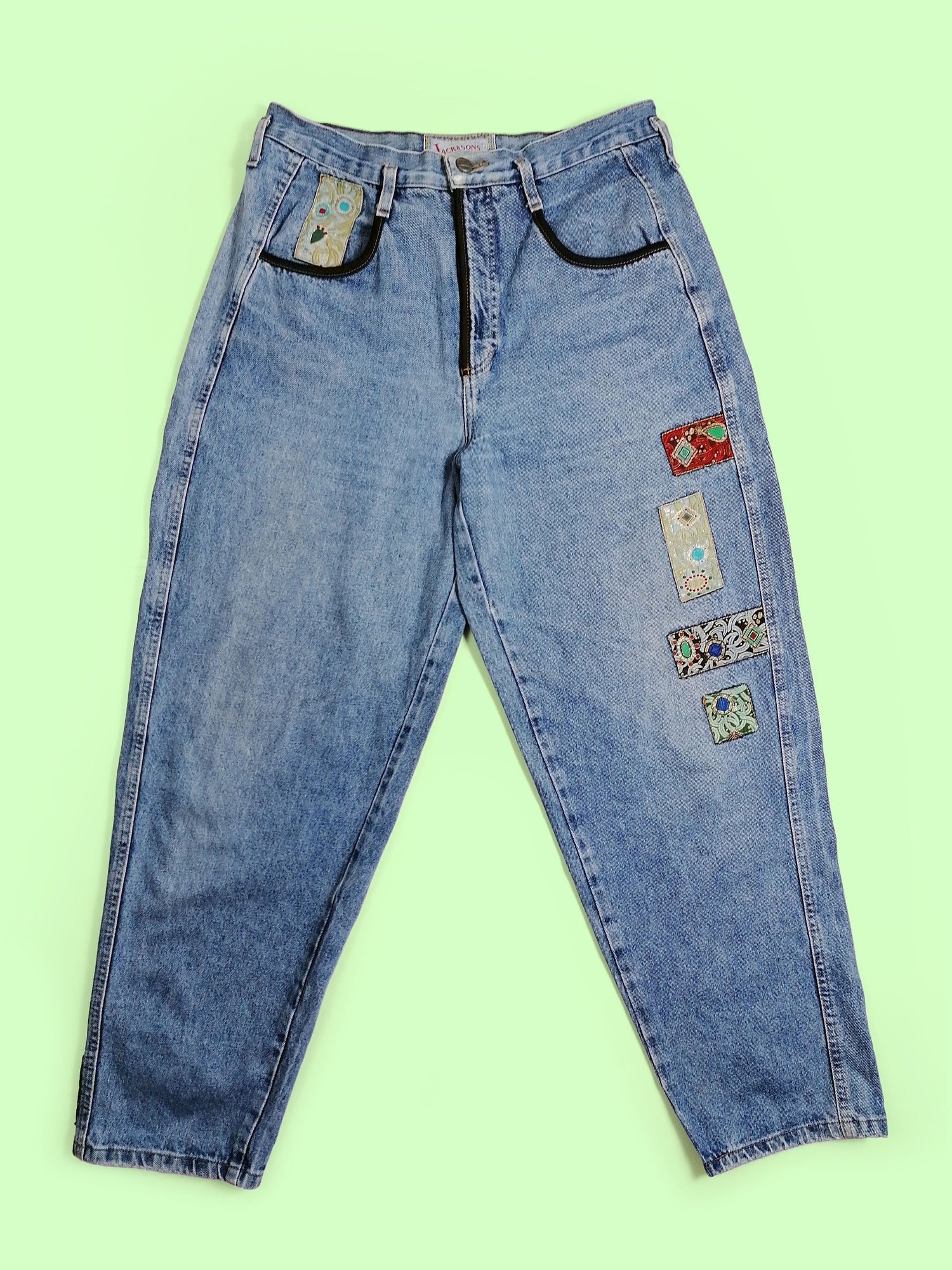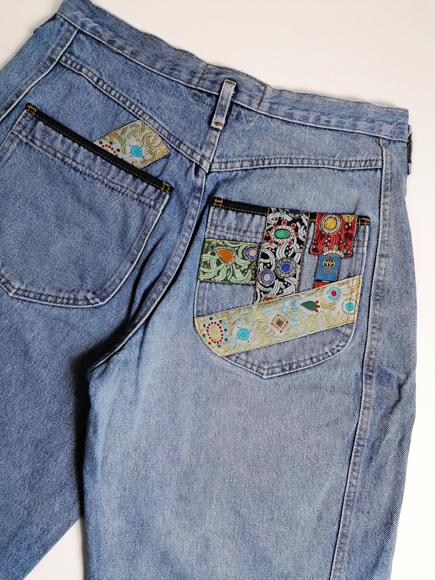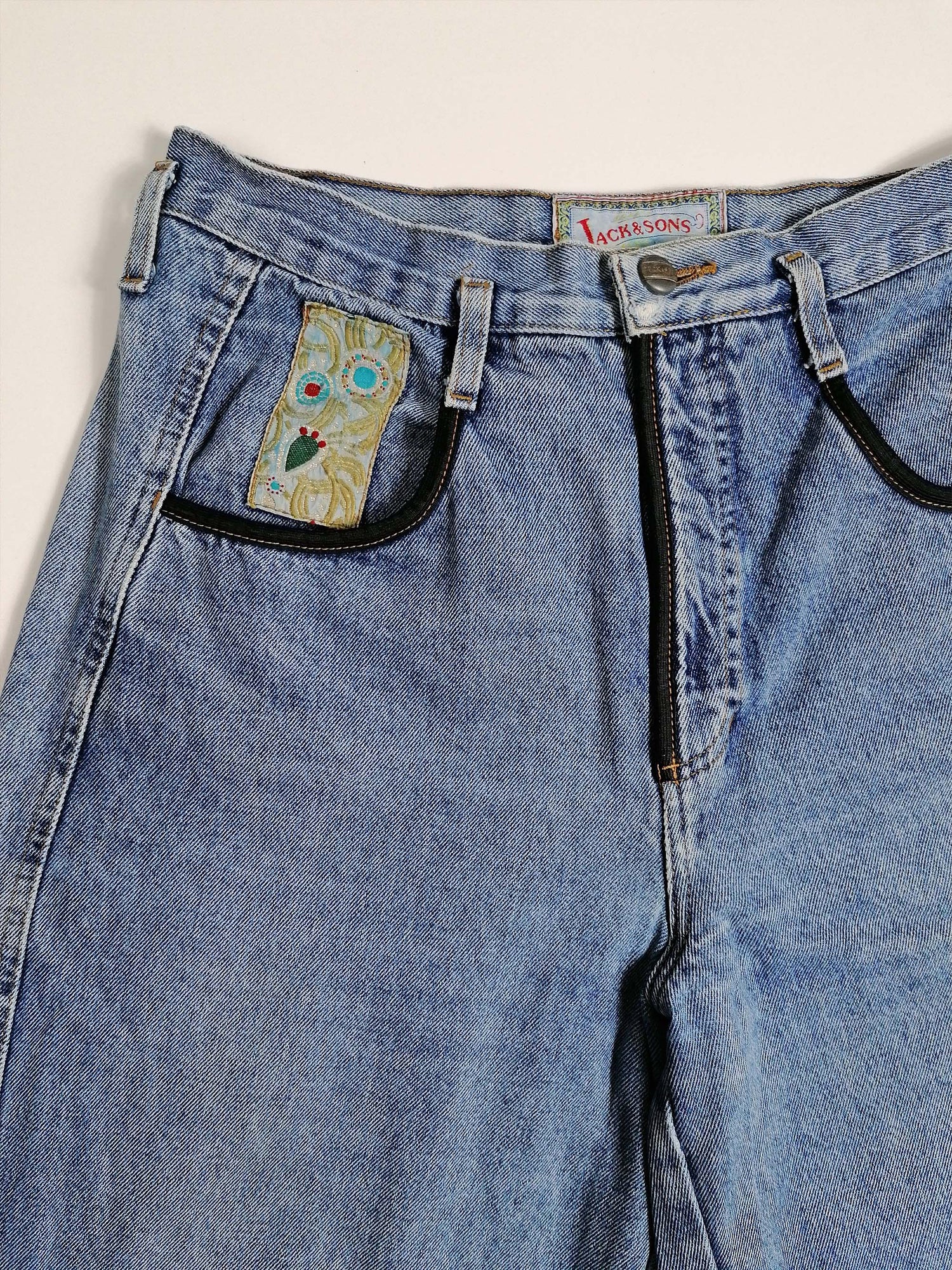 Stunning vintage 80's Jack and Sons high waist jeans, baggy fit. Patchwork details on pockets and thigh. Made in Italy.