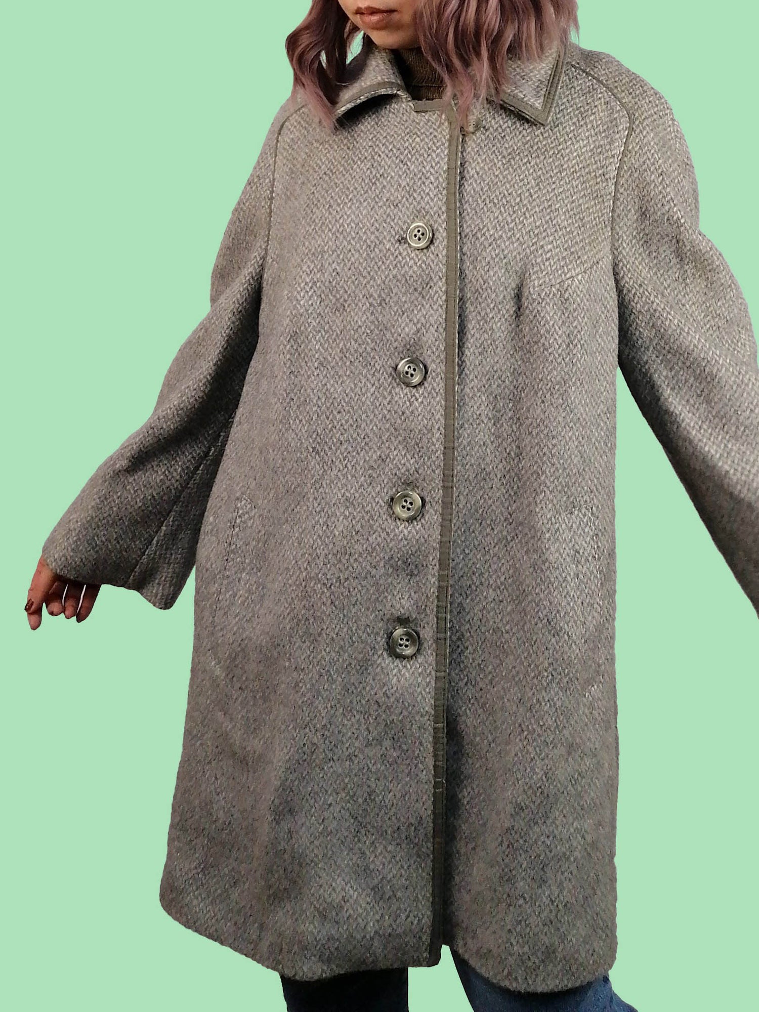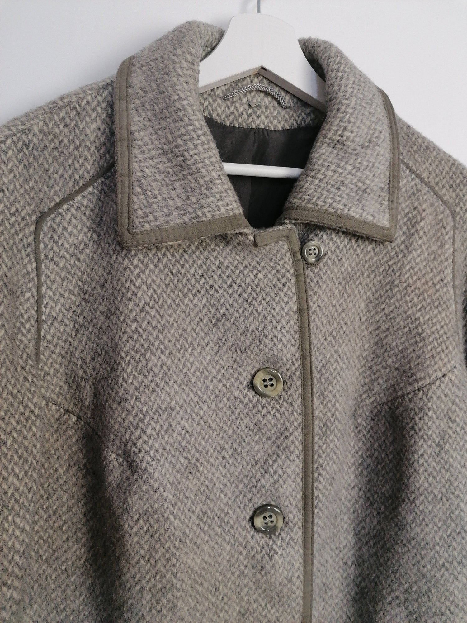 Vintage 80's pure new wool coat, made in West Germany. Beautiful duck-egg green, suede piping details.
