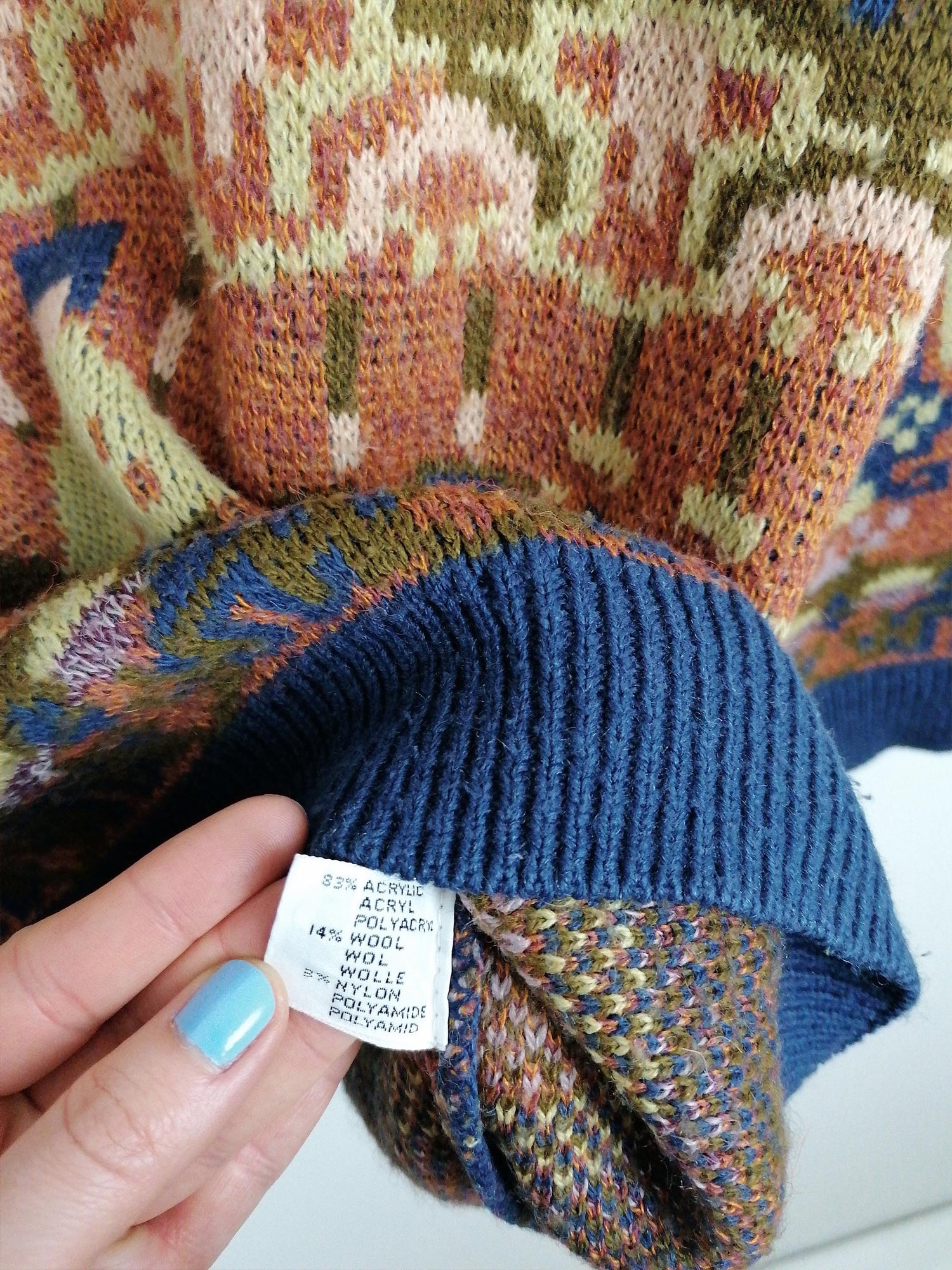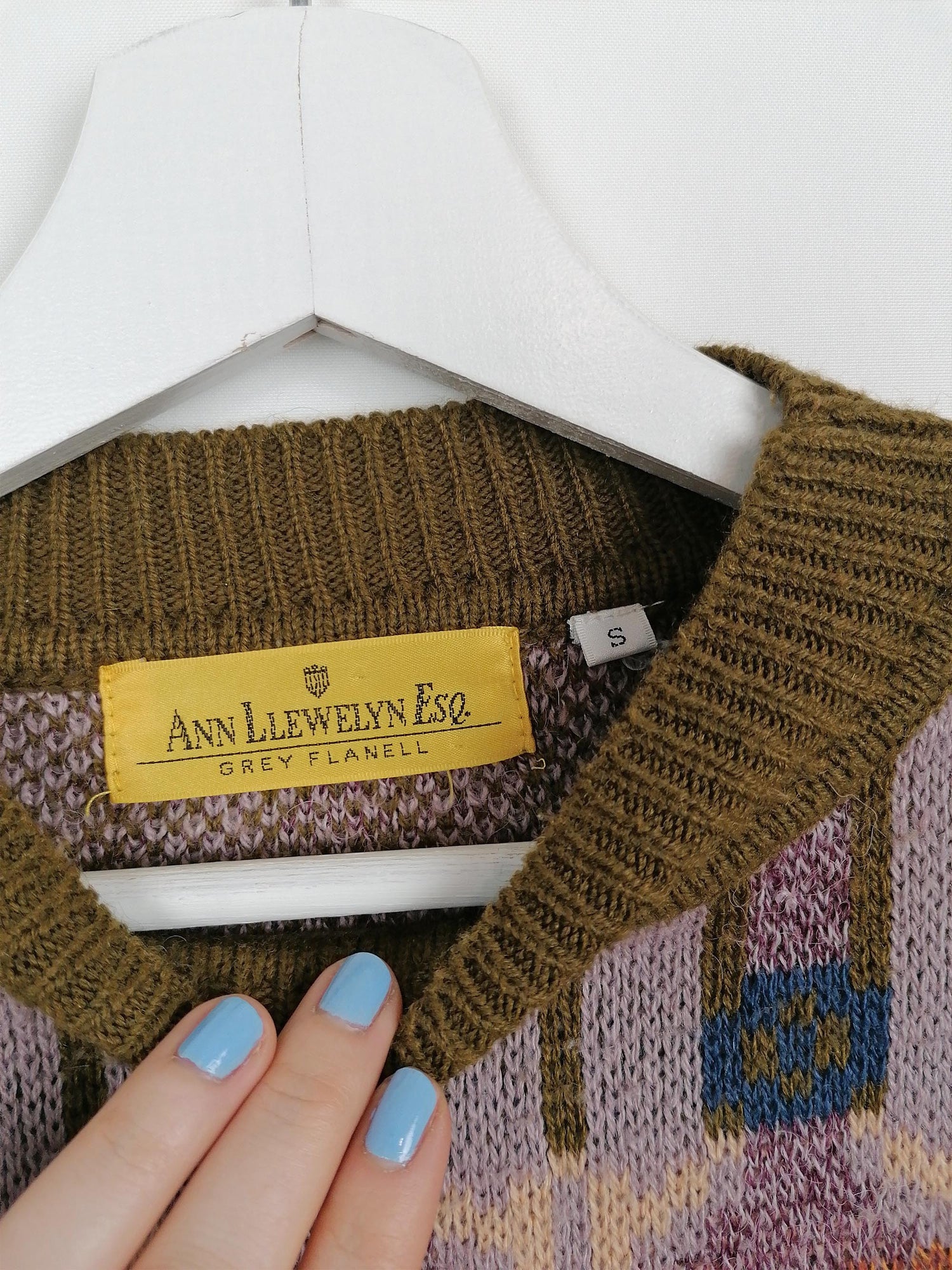 Vintage gorgeous rare find, ANN LLEWELYN Esq. patterned jumper, folk pattern. 83 % acrylic, 14% wool, 3% nylon.