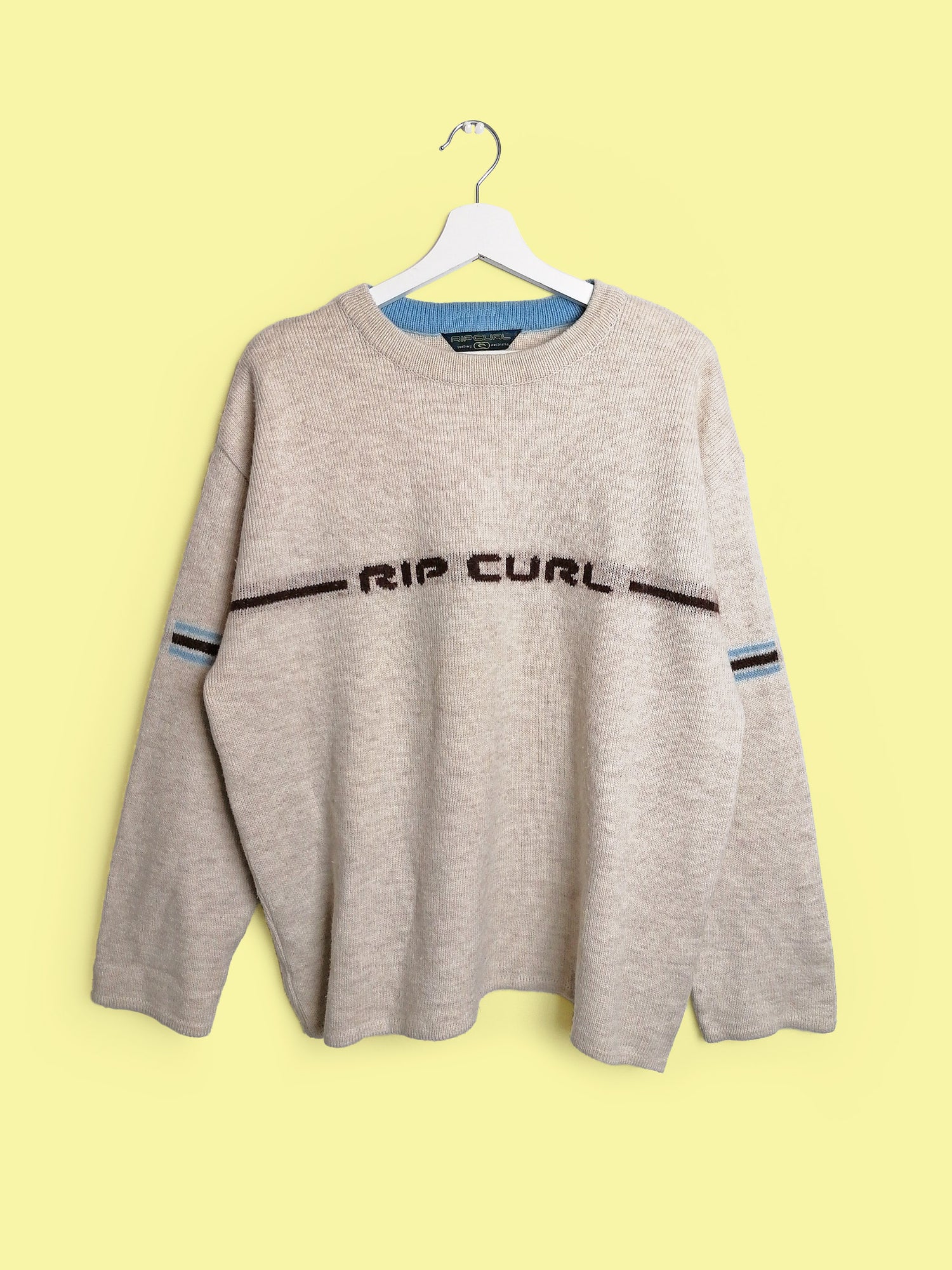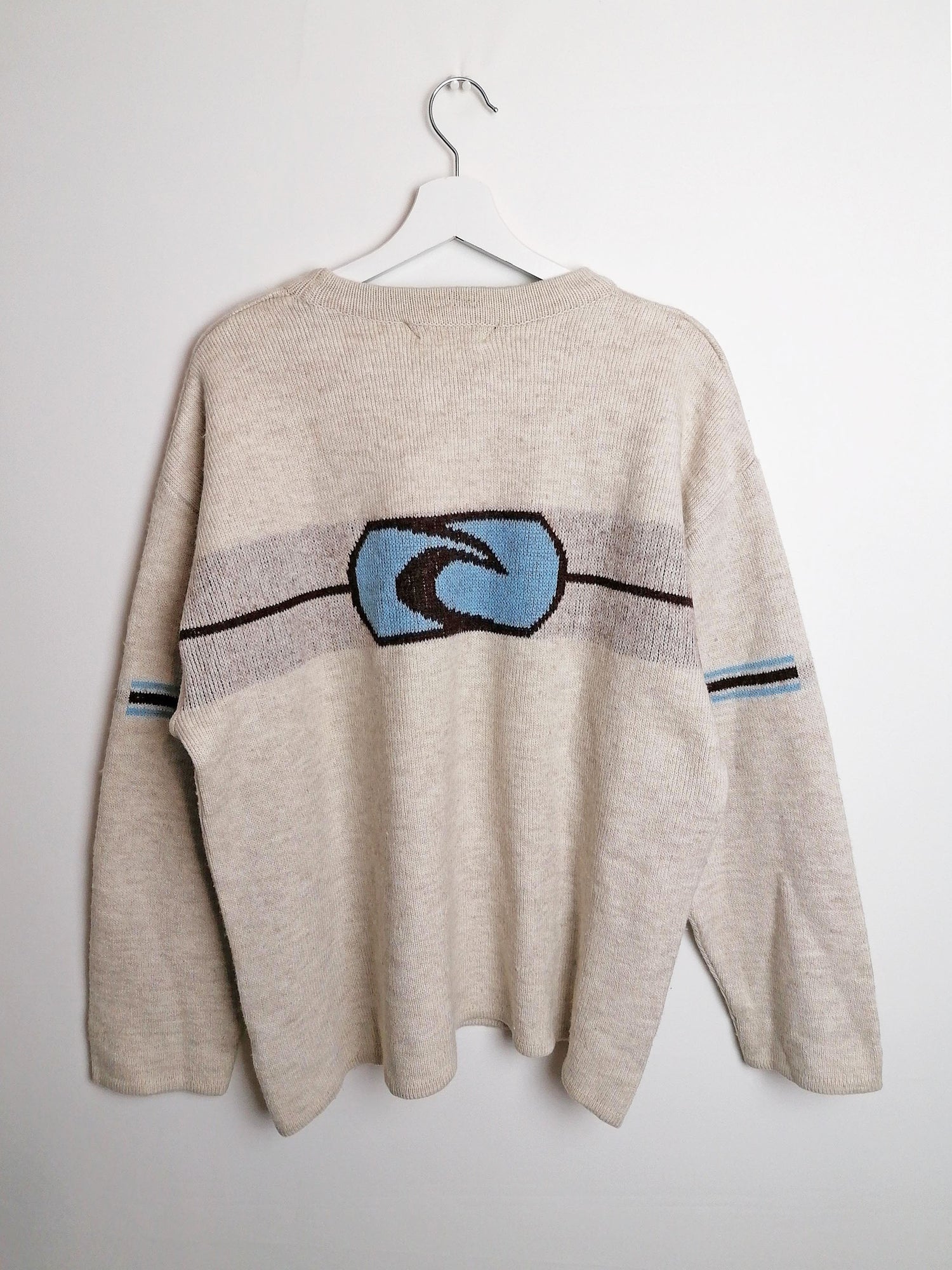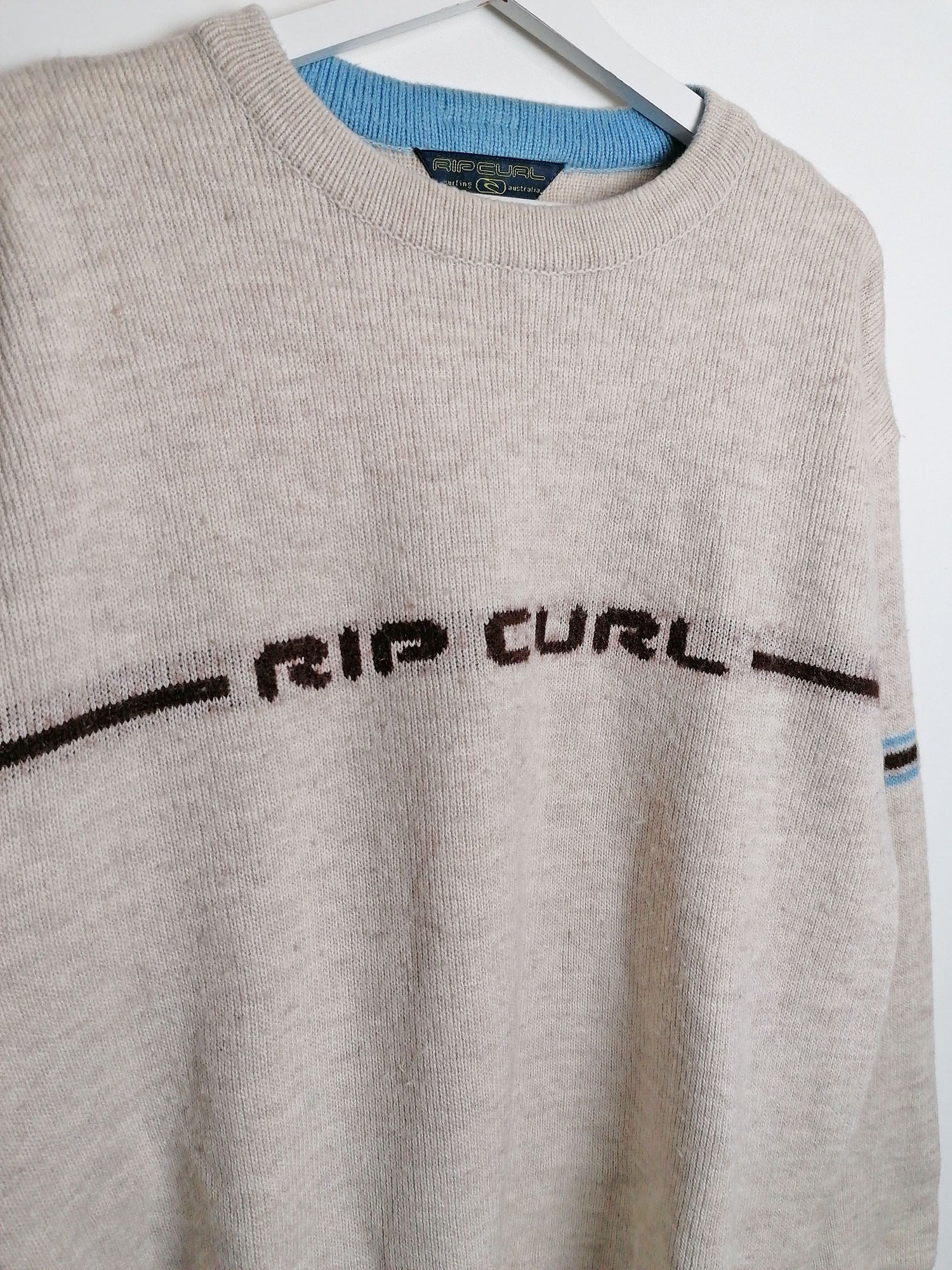 Vintage 90's RIP CURL Australia wool blend sweater, large logo on back. Beige with brown and blue.