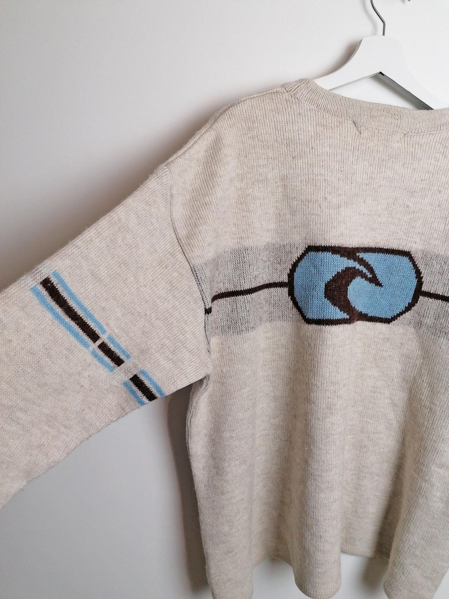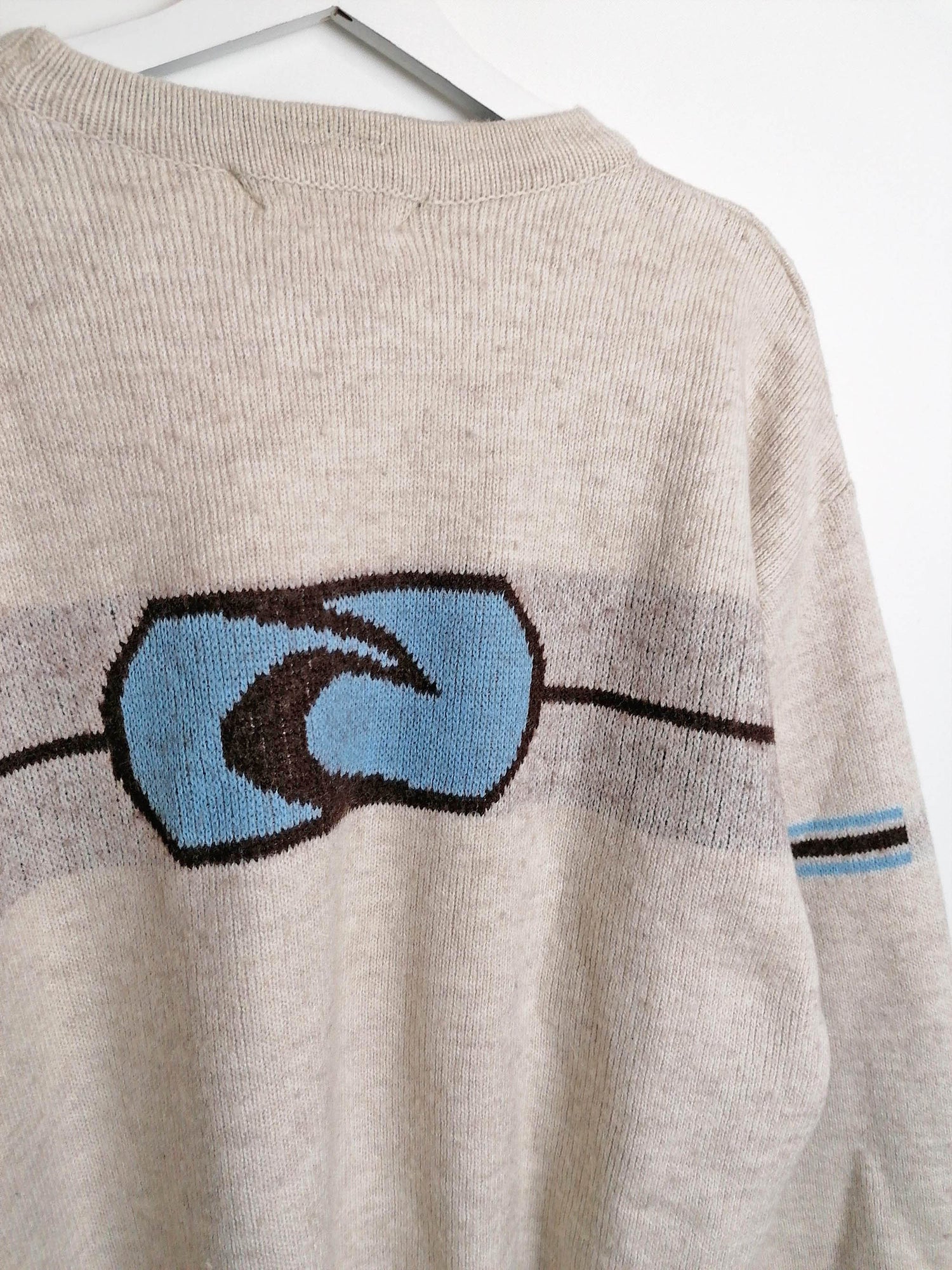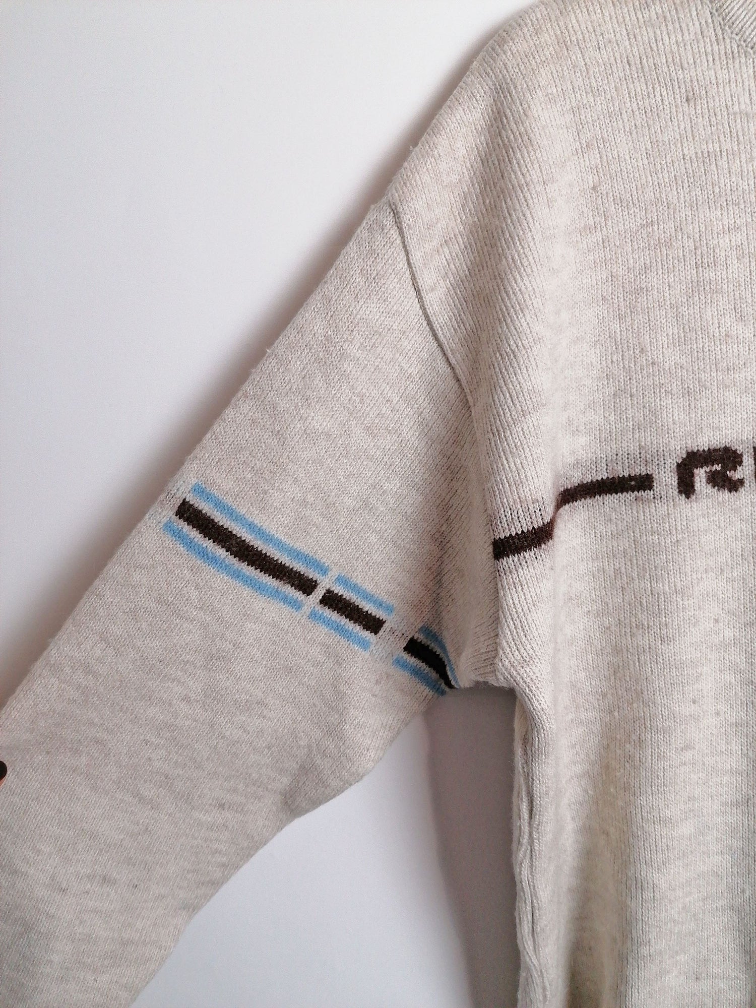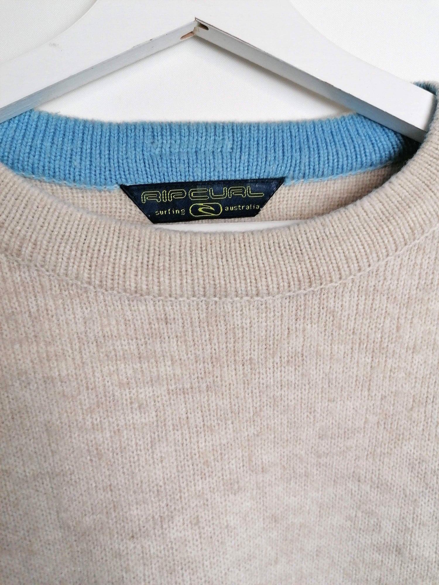 Vintage 90's RIP CURL Australia wool blend sweater, large logo on back. Beige with brown and blue.
