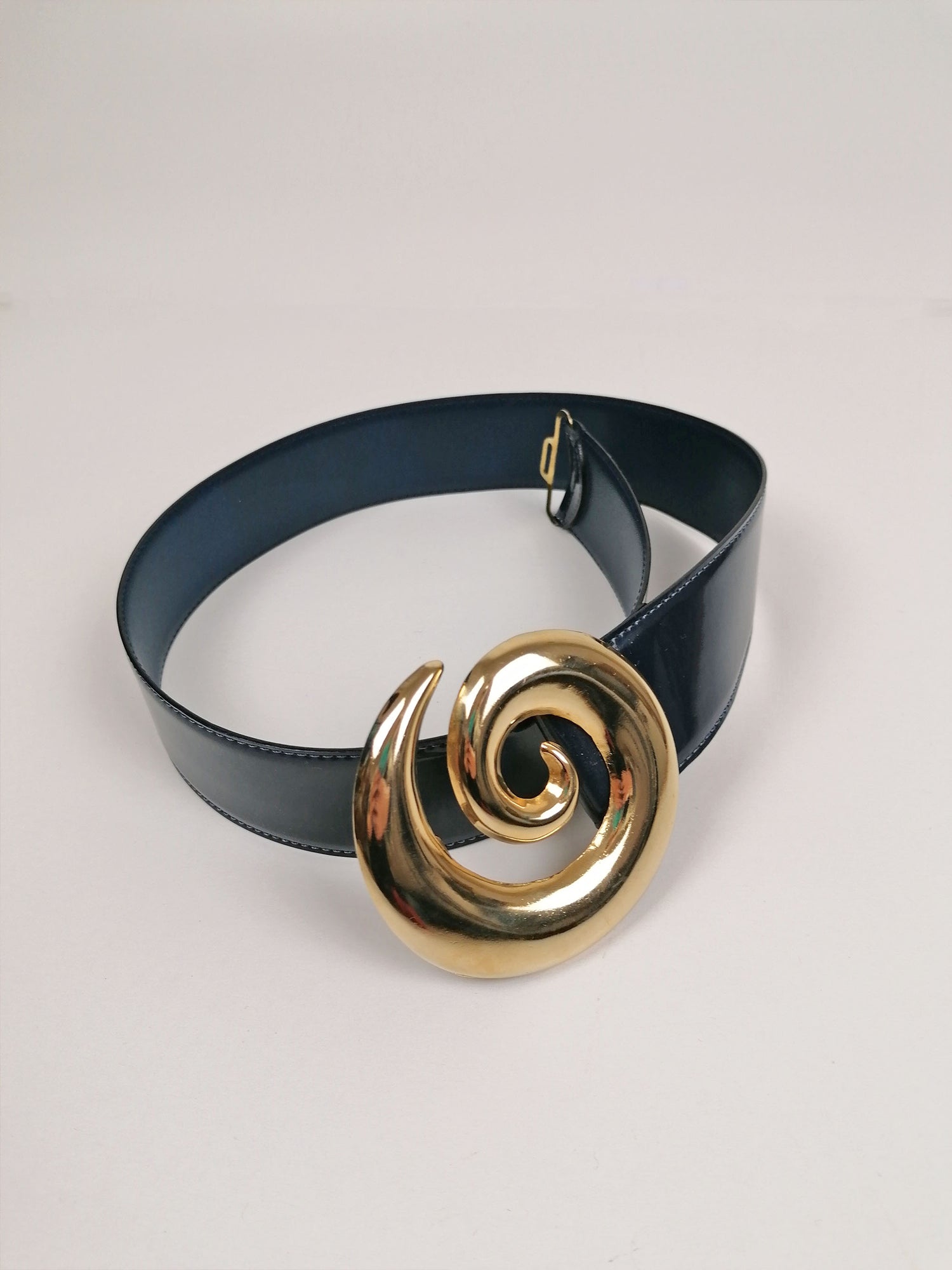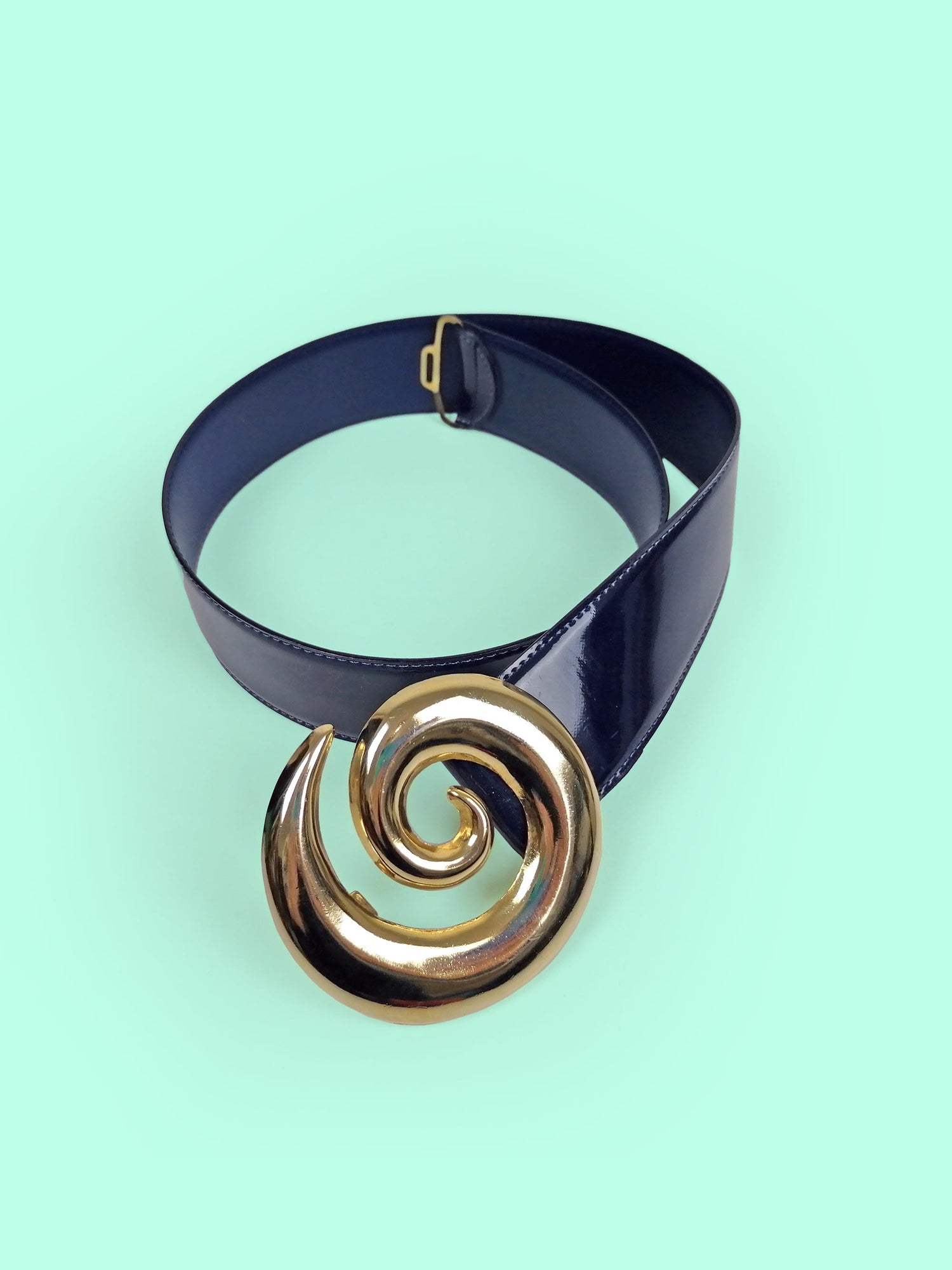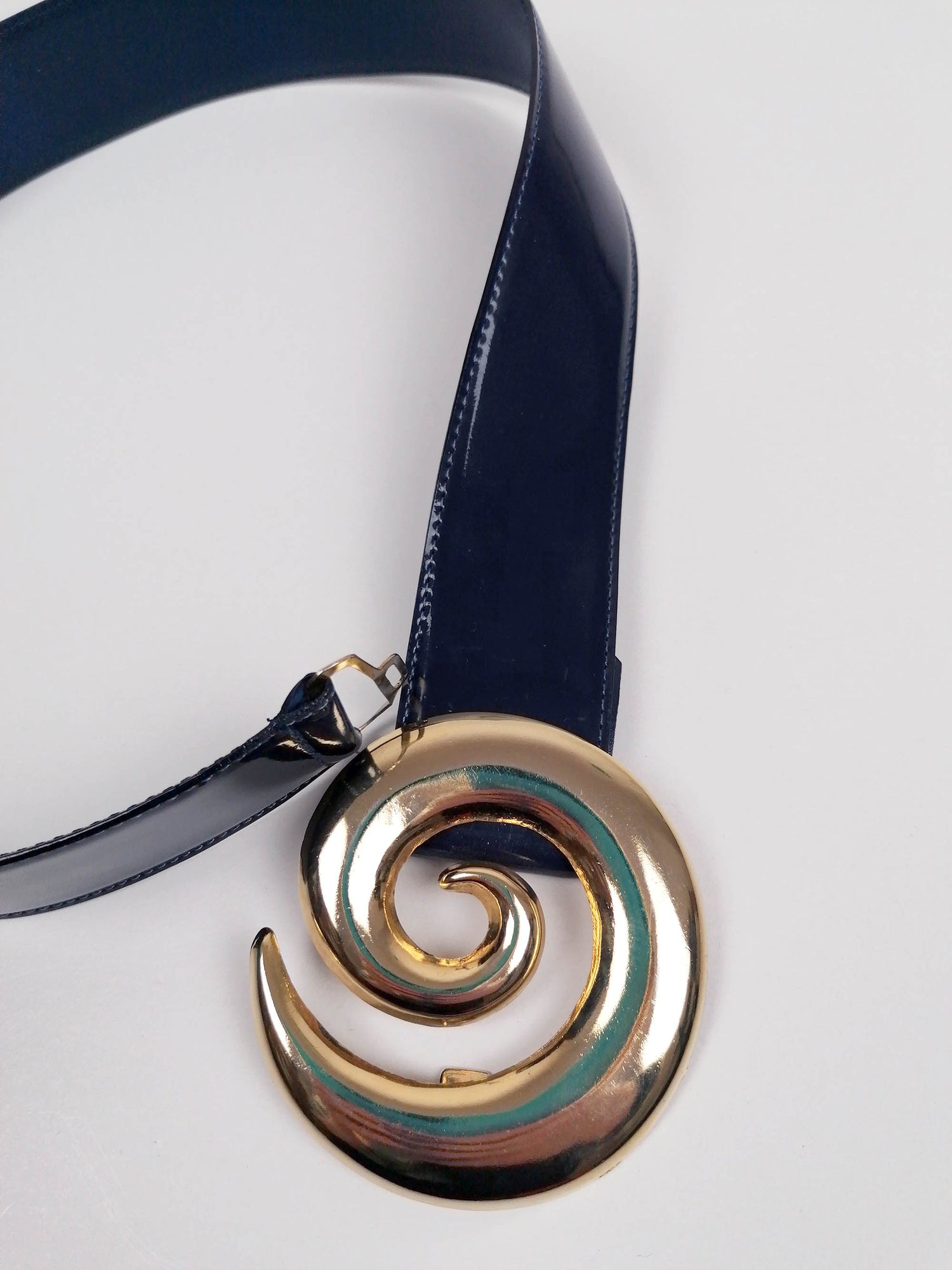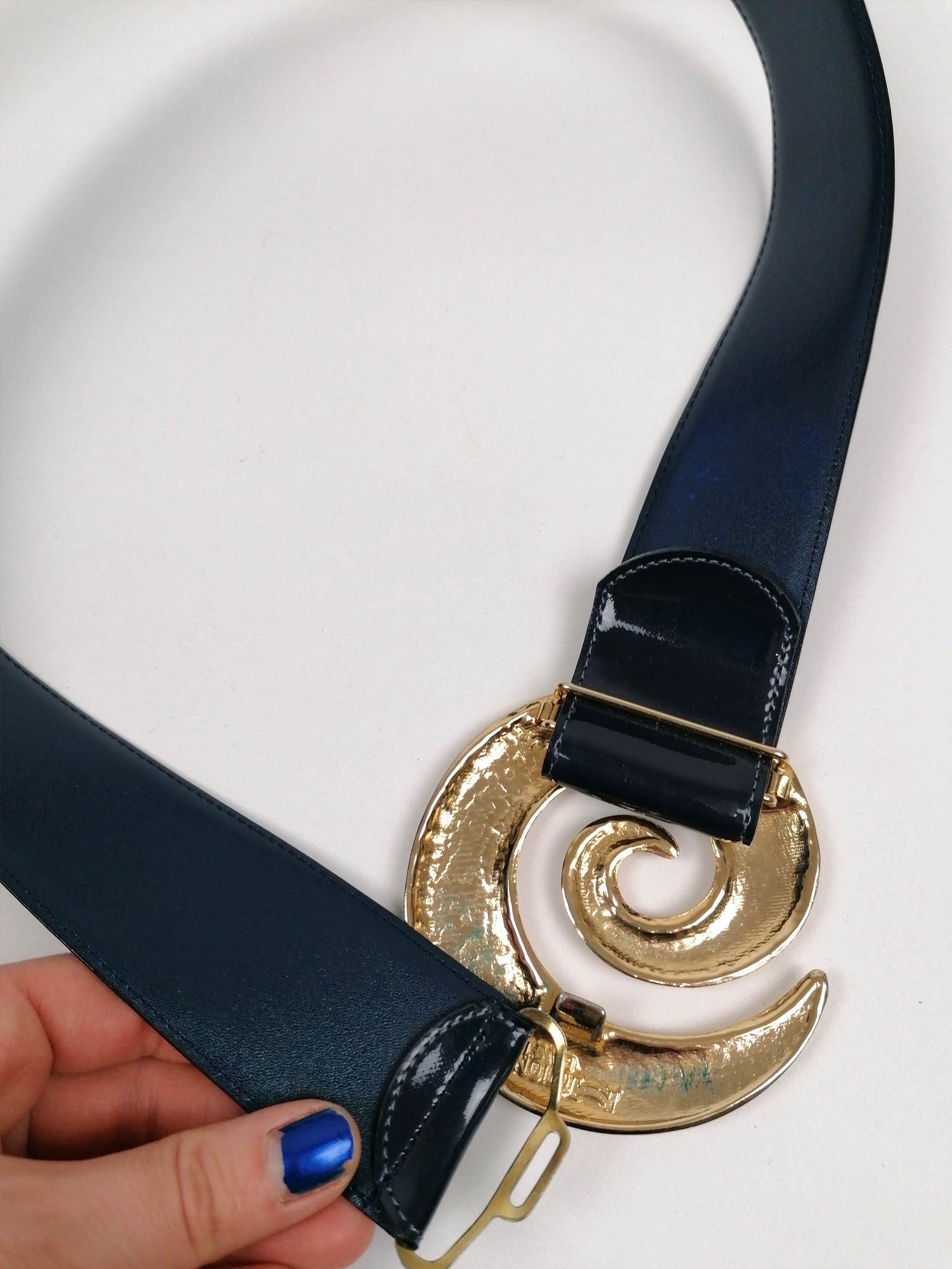 Gorgeous vintage 80's 90's shiny faux patent leather belt, navy blue with statement buckle. Would fit size XS-M, it's adjustable.