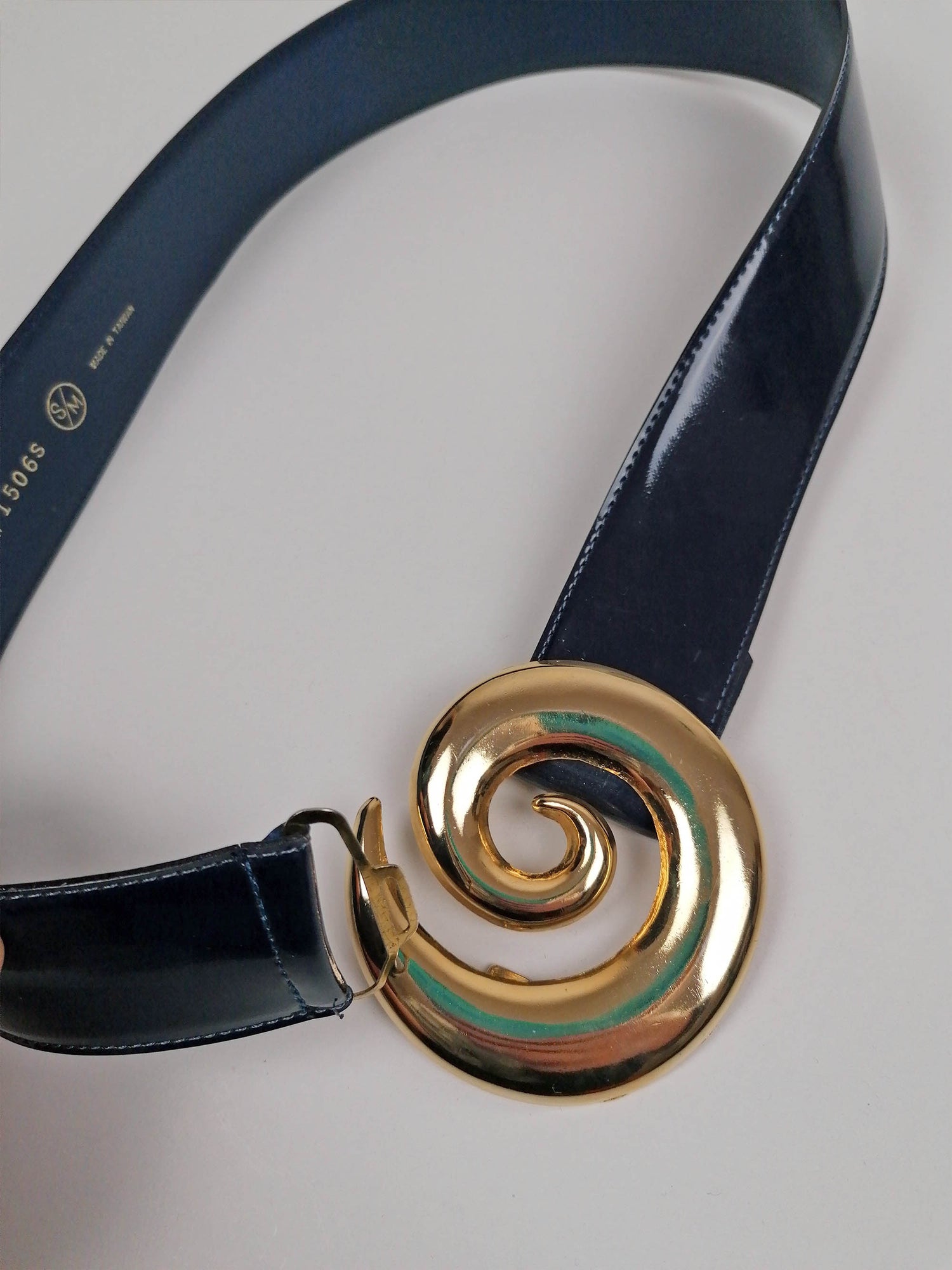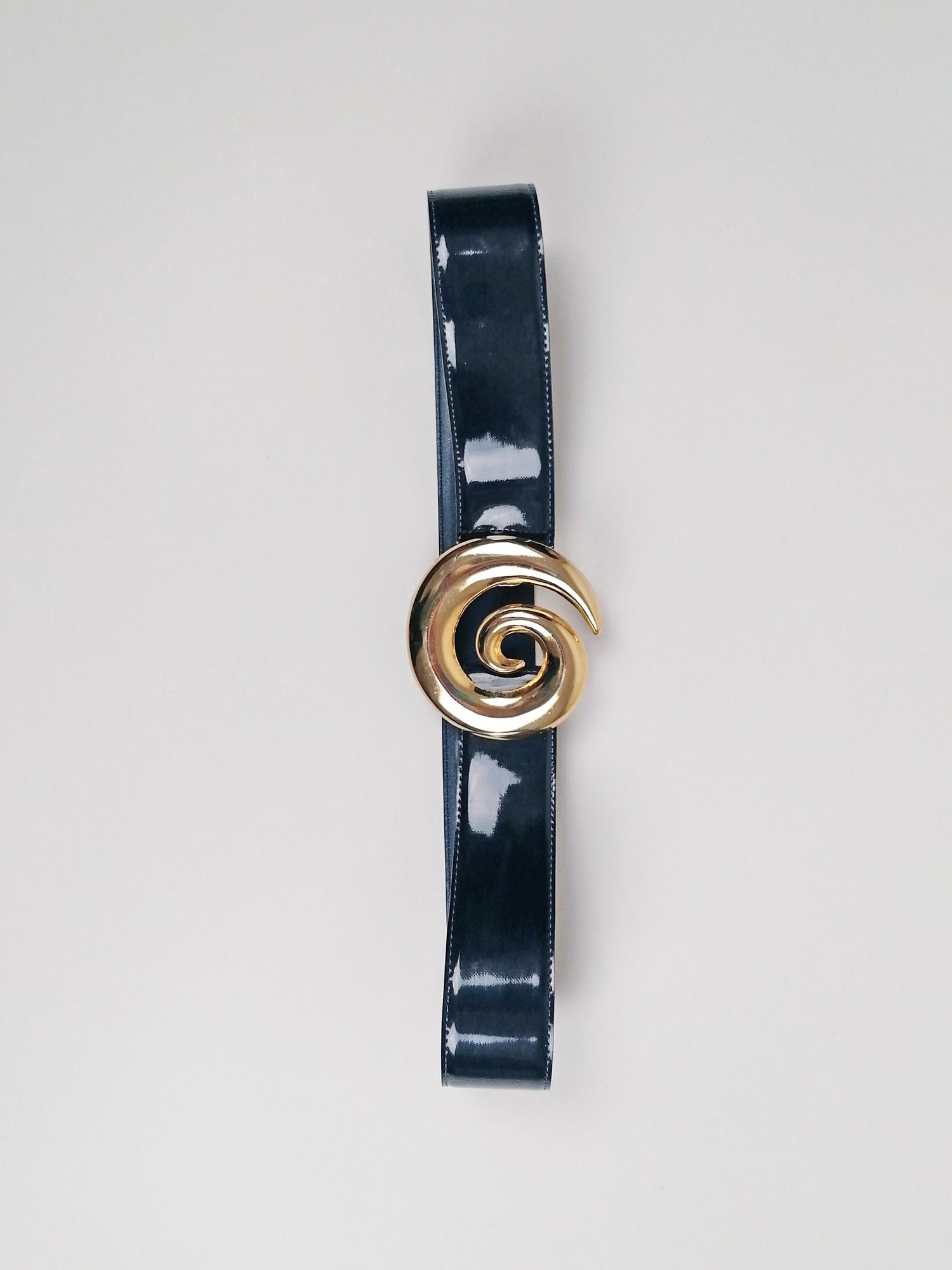 90's Shiny Navy Faux Patent Leather Belt Gold Buckle - size S-M