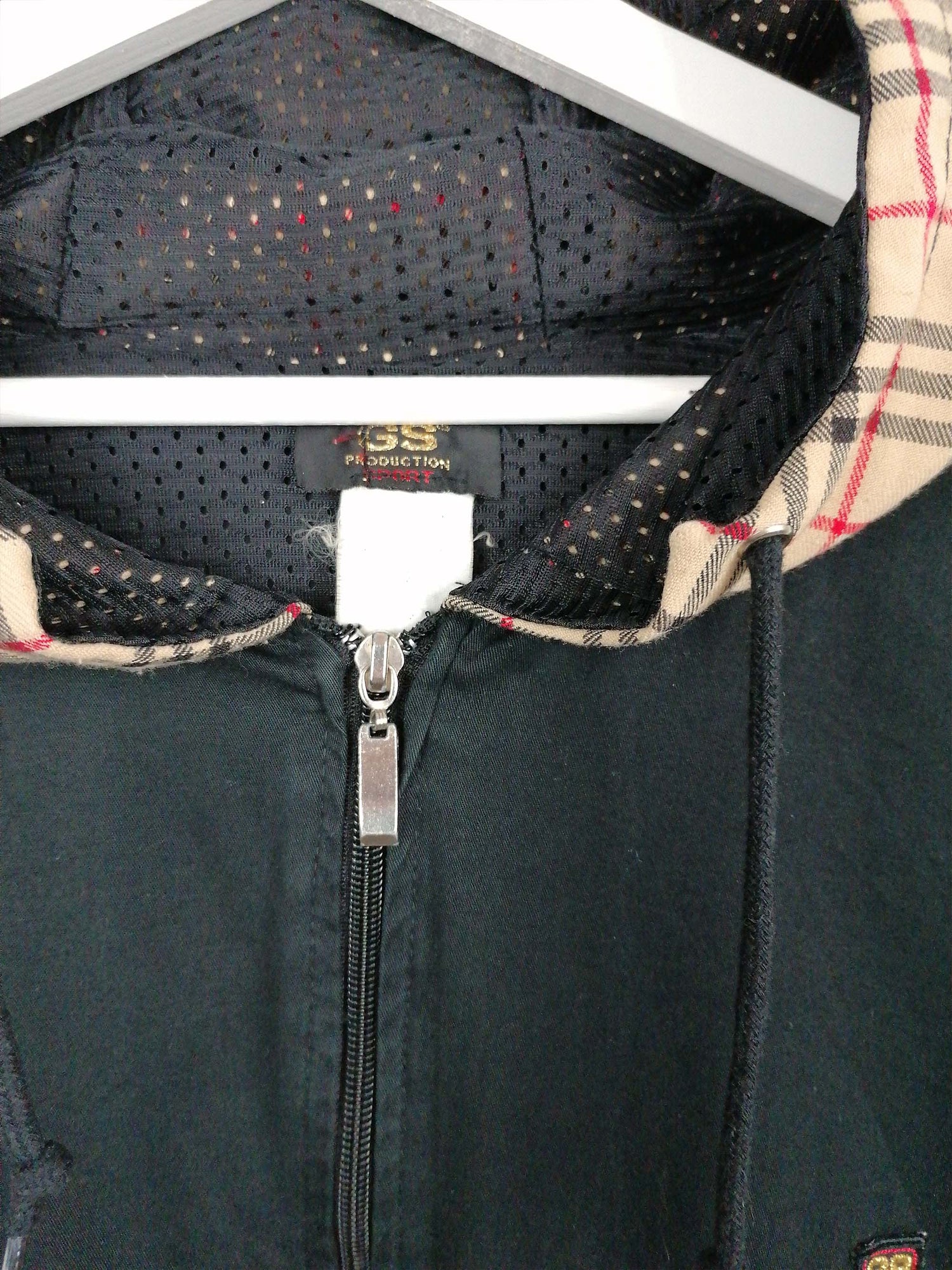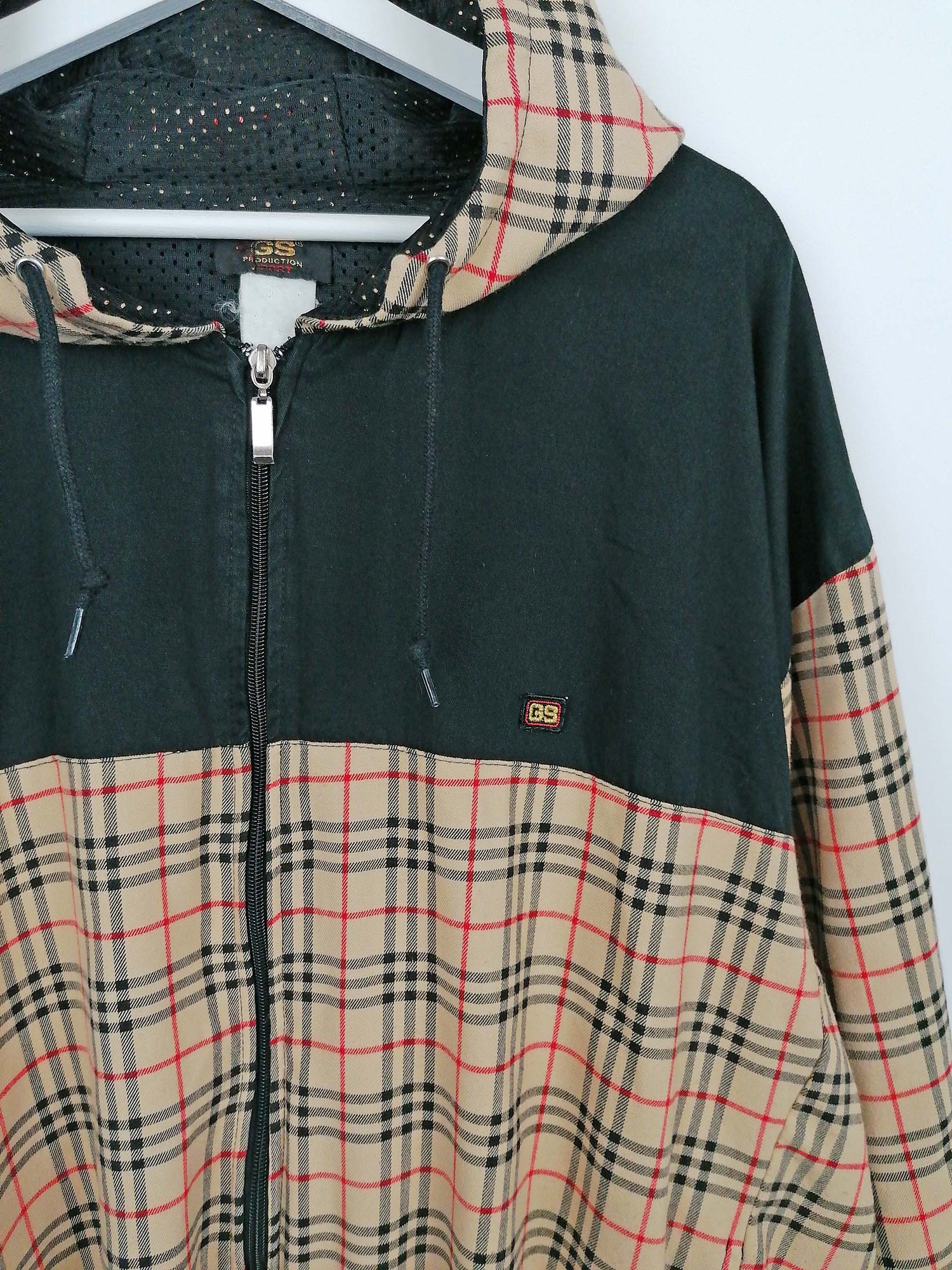 Vintage 90's GS Production Sport lightweight bomber jacket, plaid pattern. Elastic knit cuffs and bottom, adjustable hood.