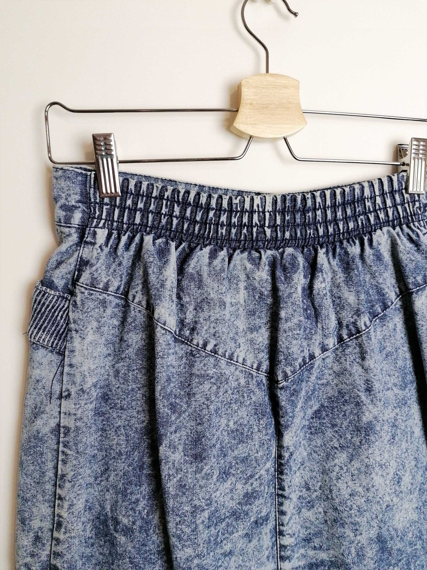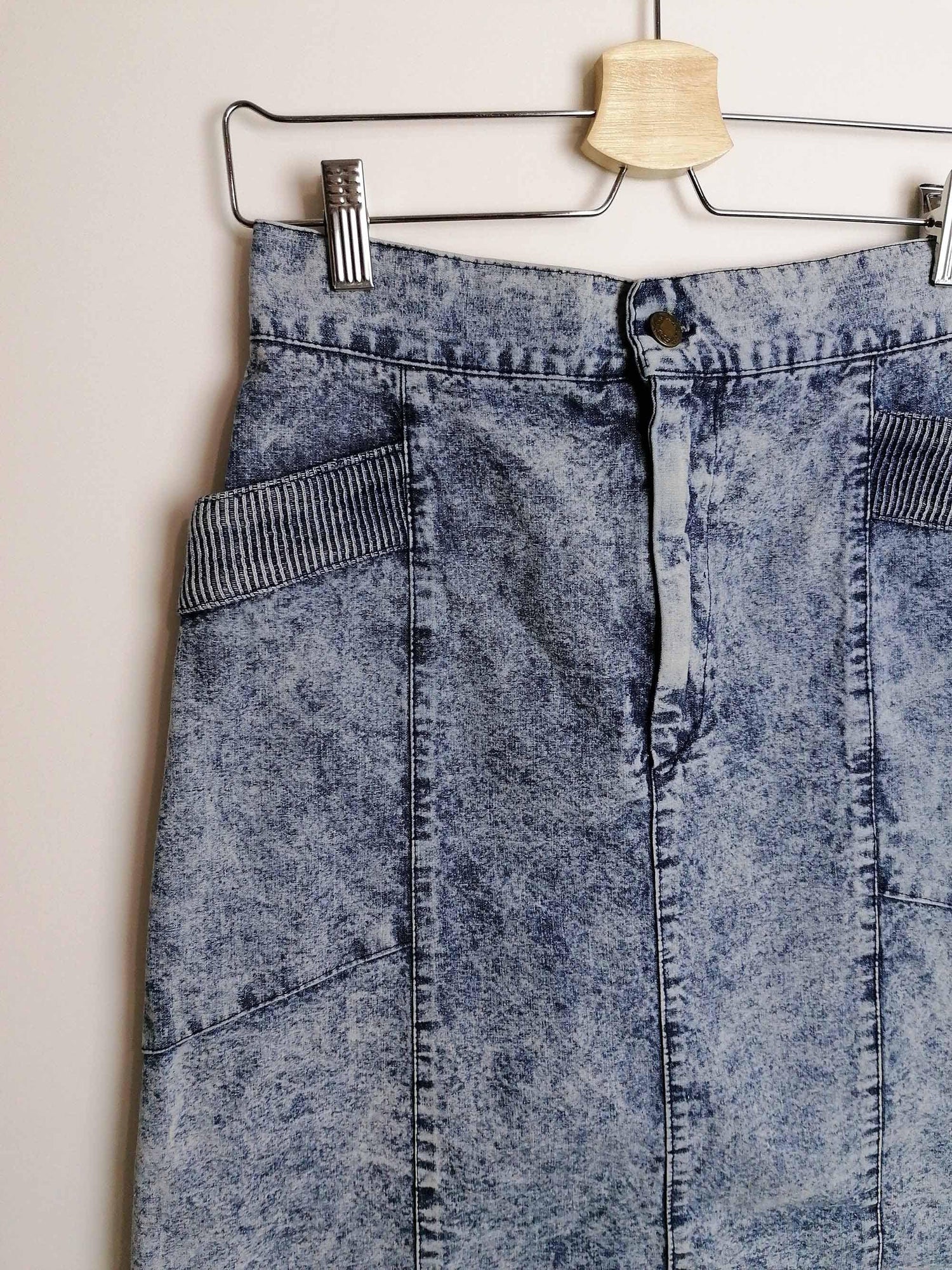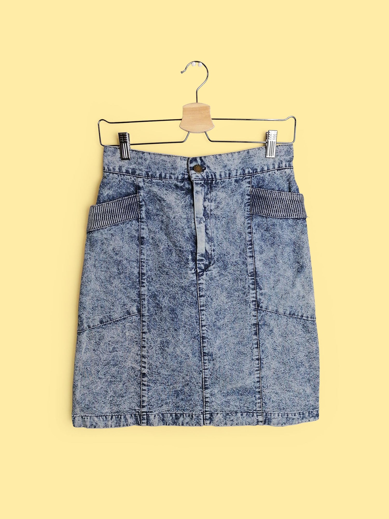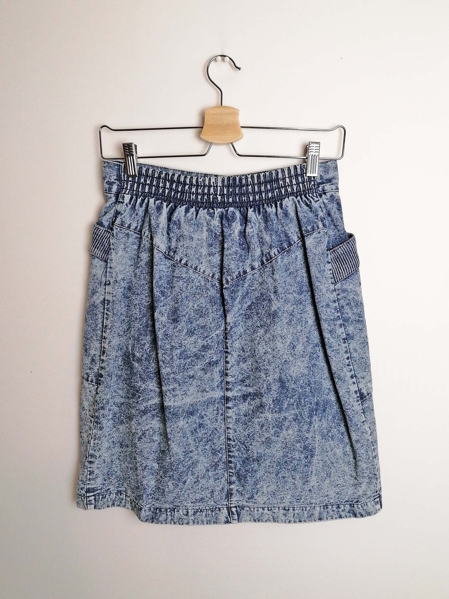 Gorgeous vintage 80's 90's acidwash denim skirt, partially elastic waist, side pockets. Made in USA.