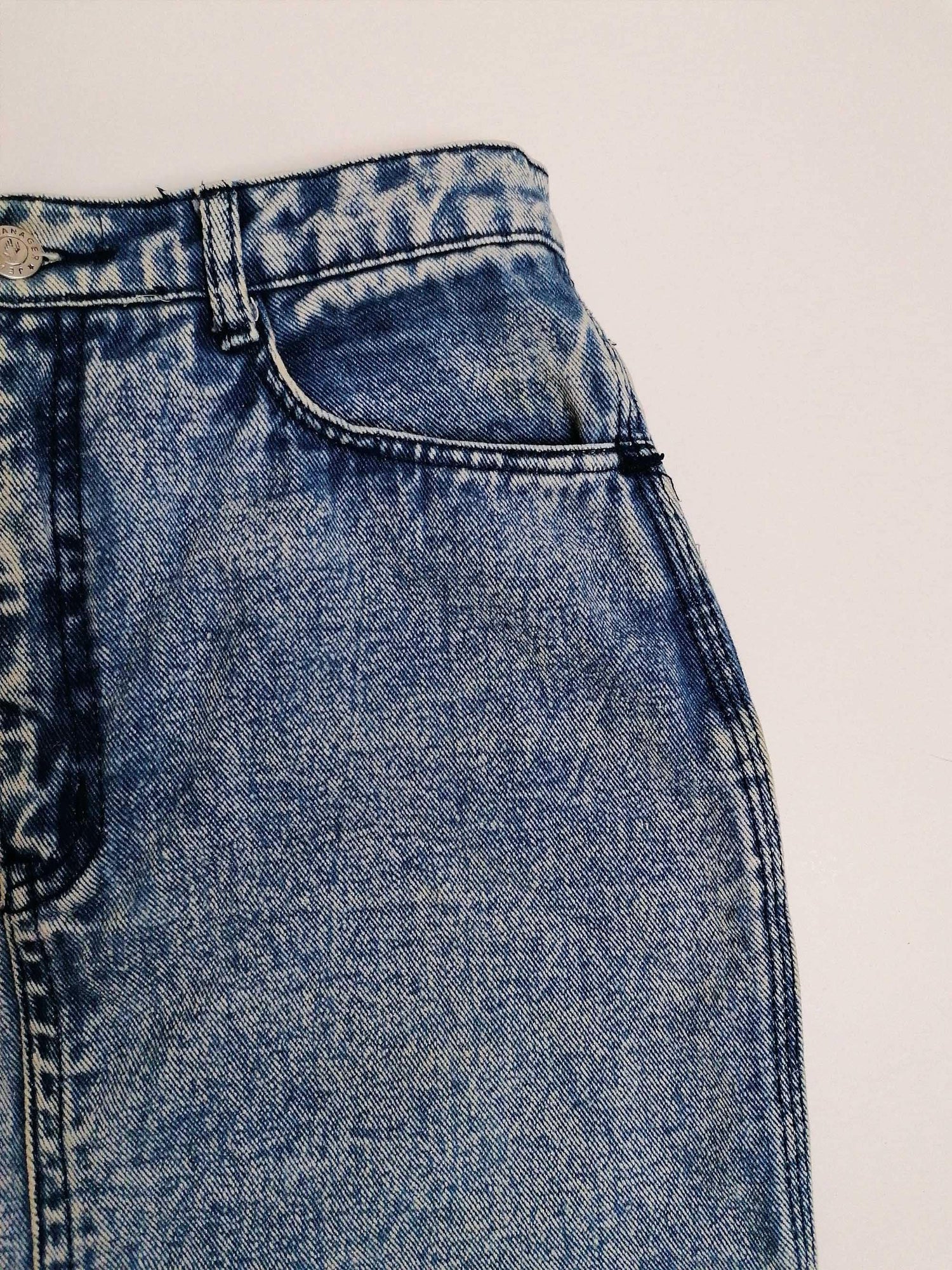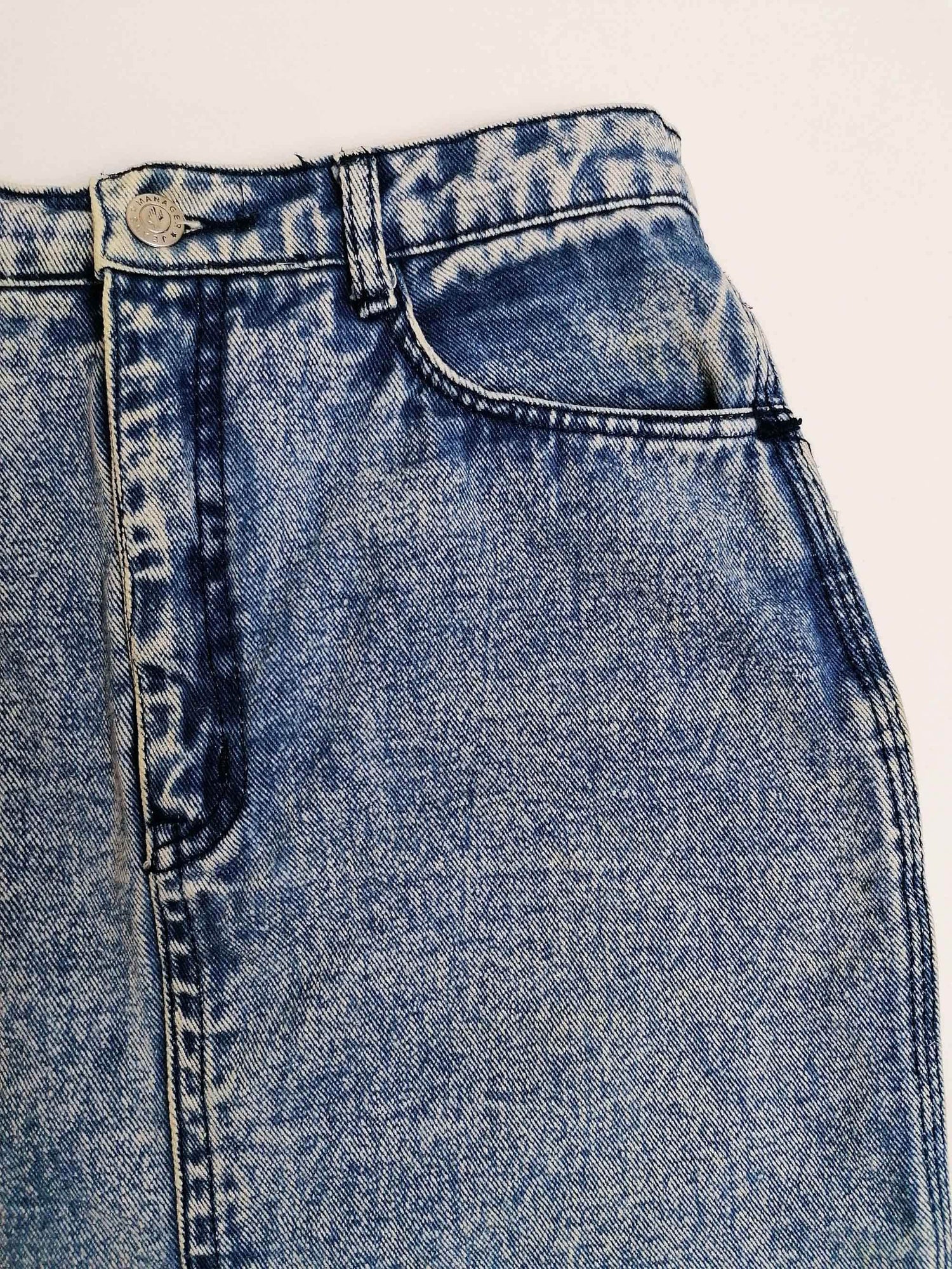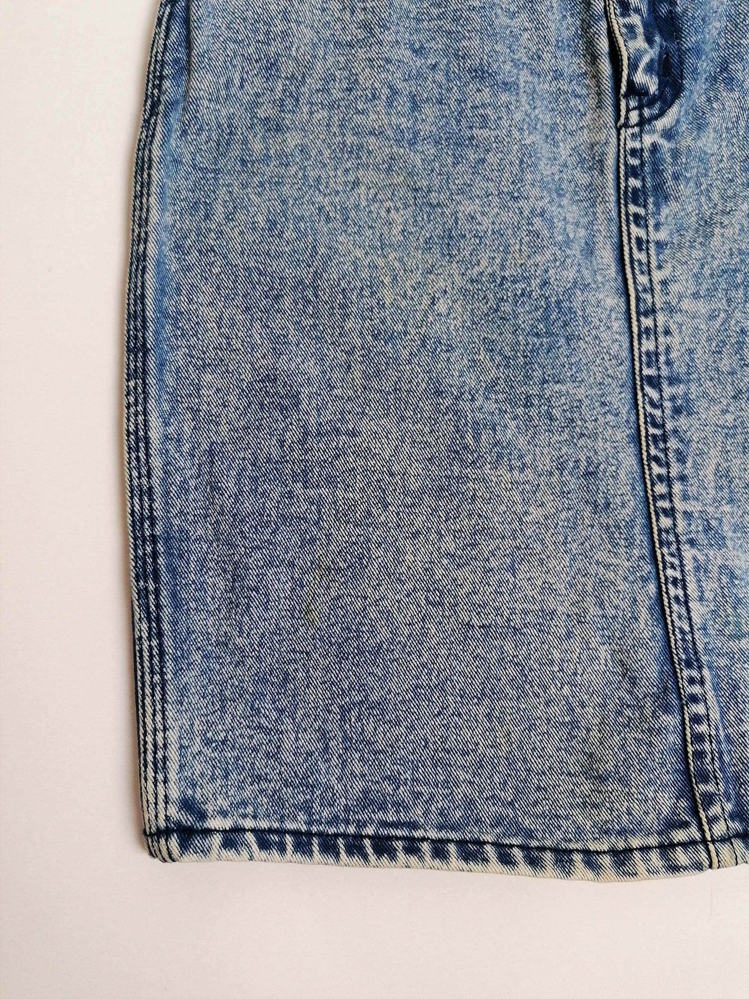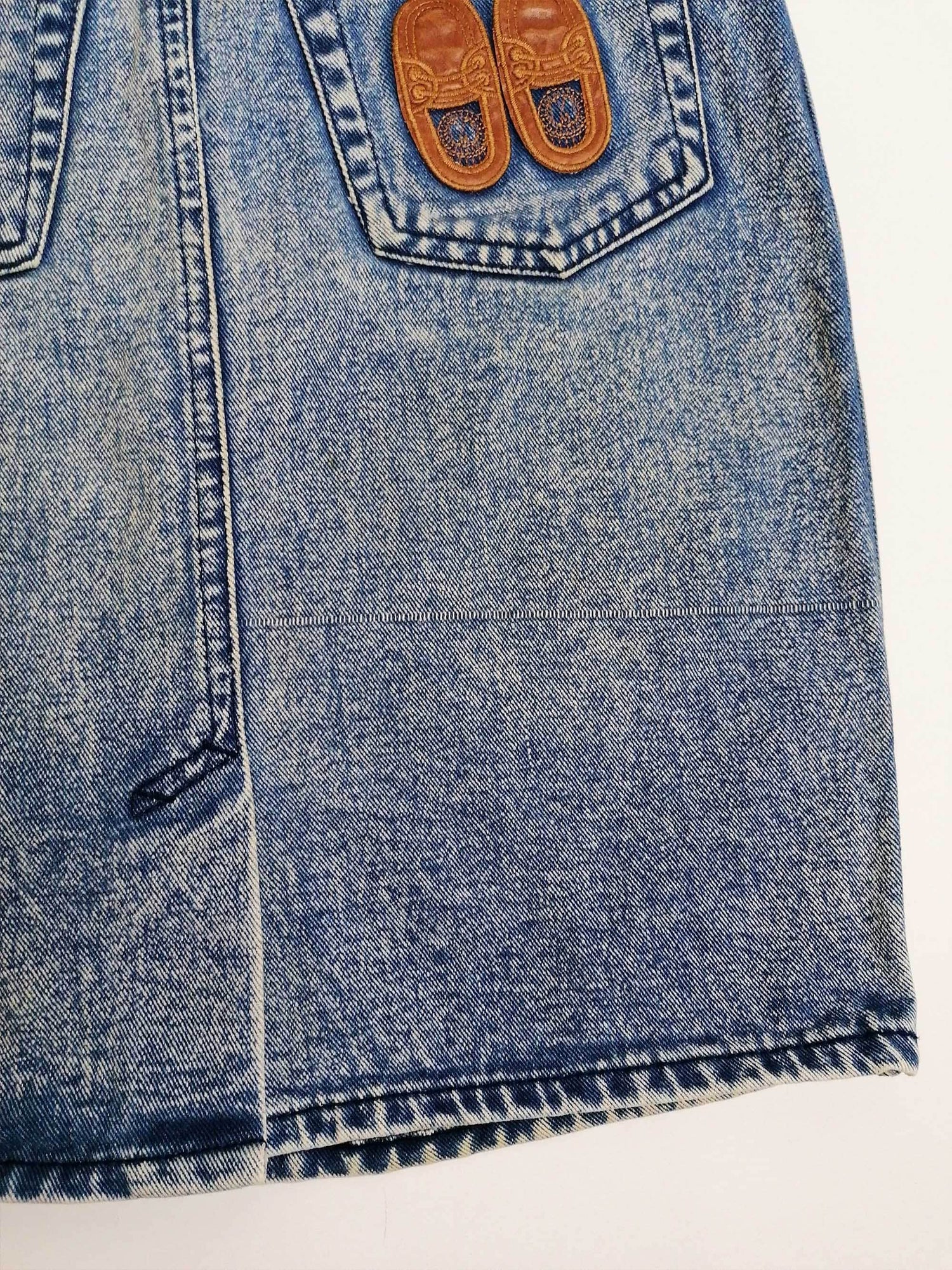 Gorgeous vintage 80's 90's acidwash high waist denim skirt, patch on back pocket.