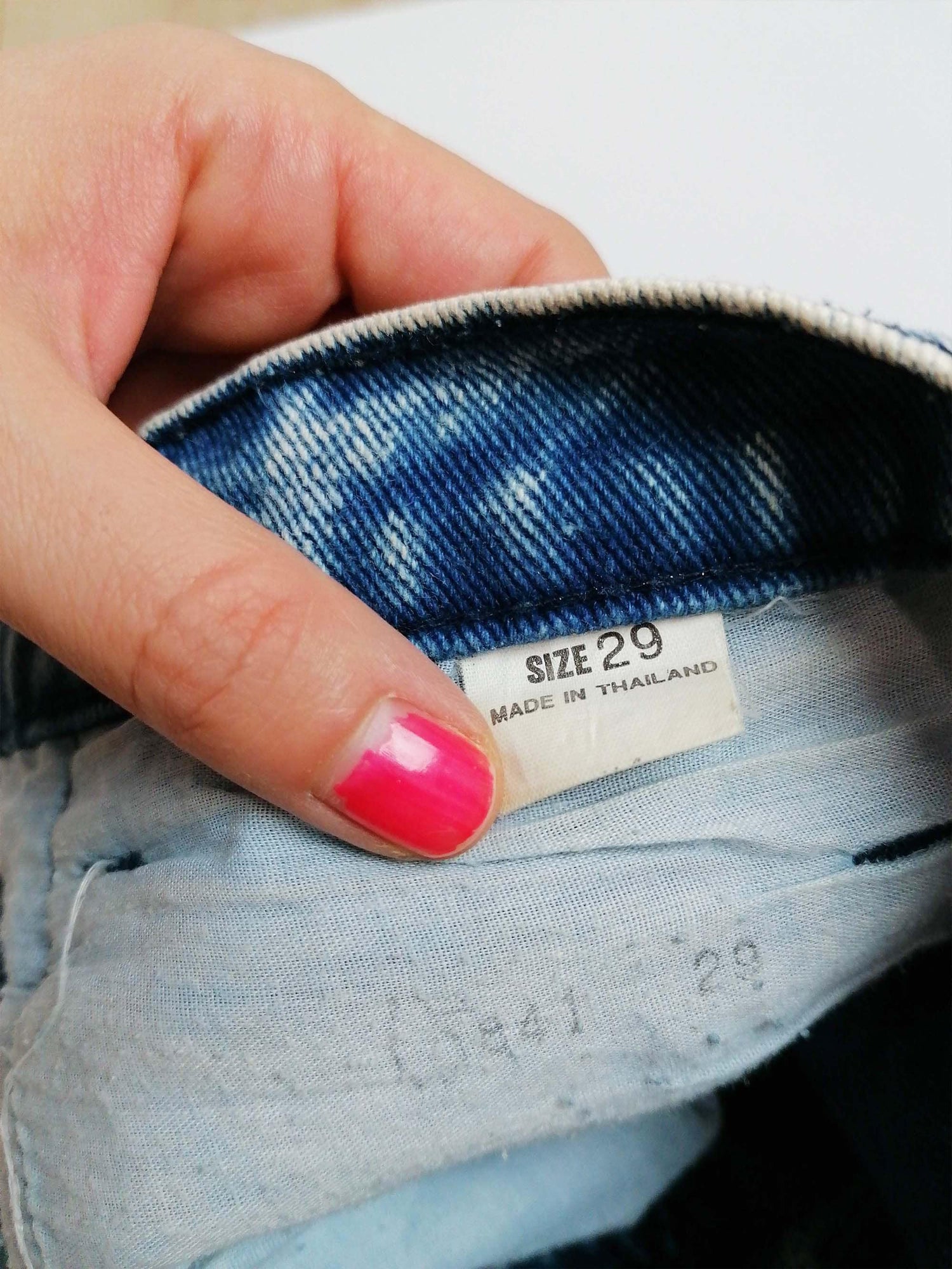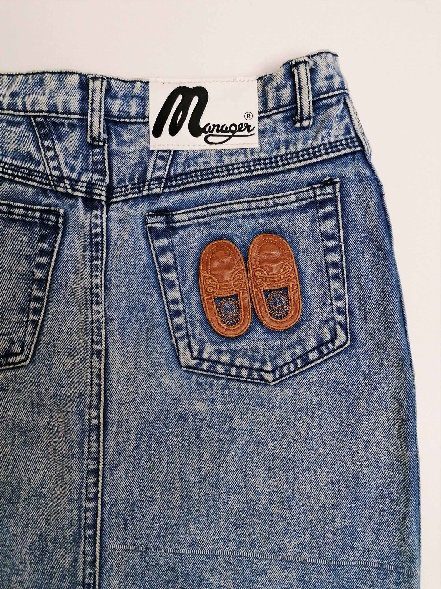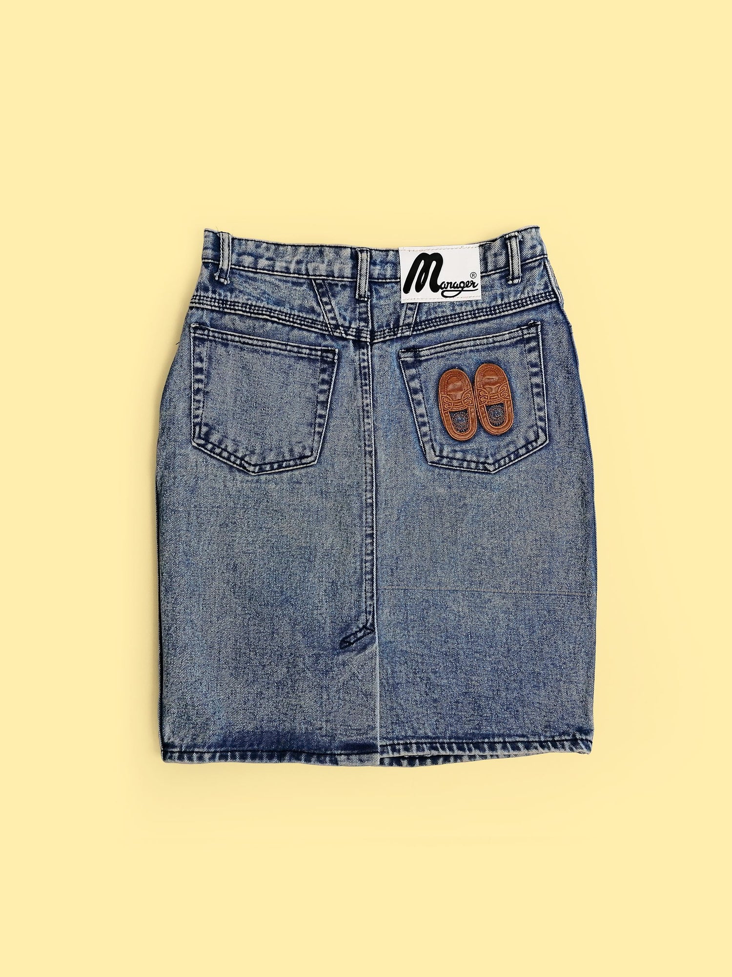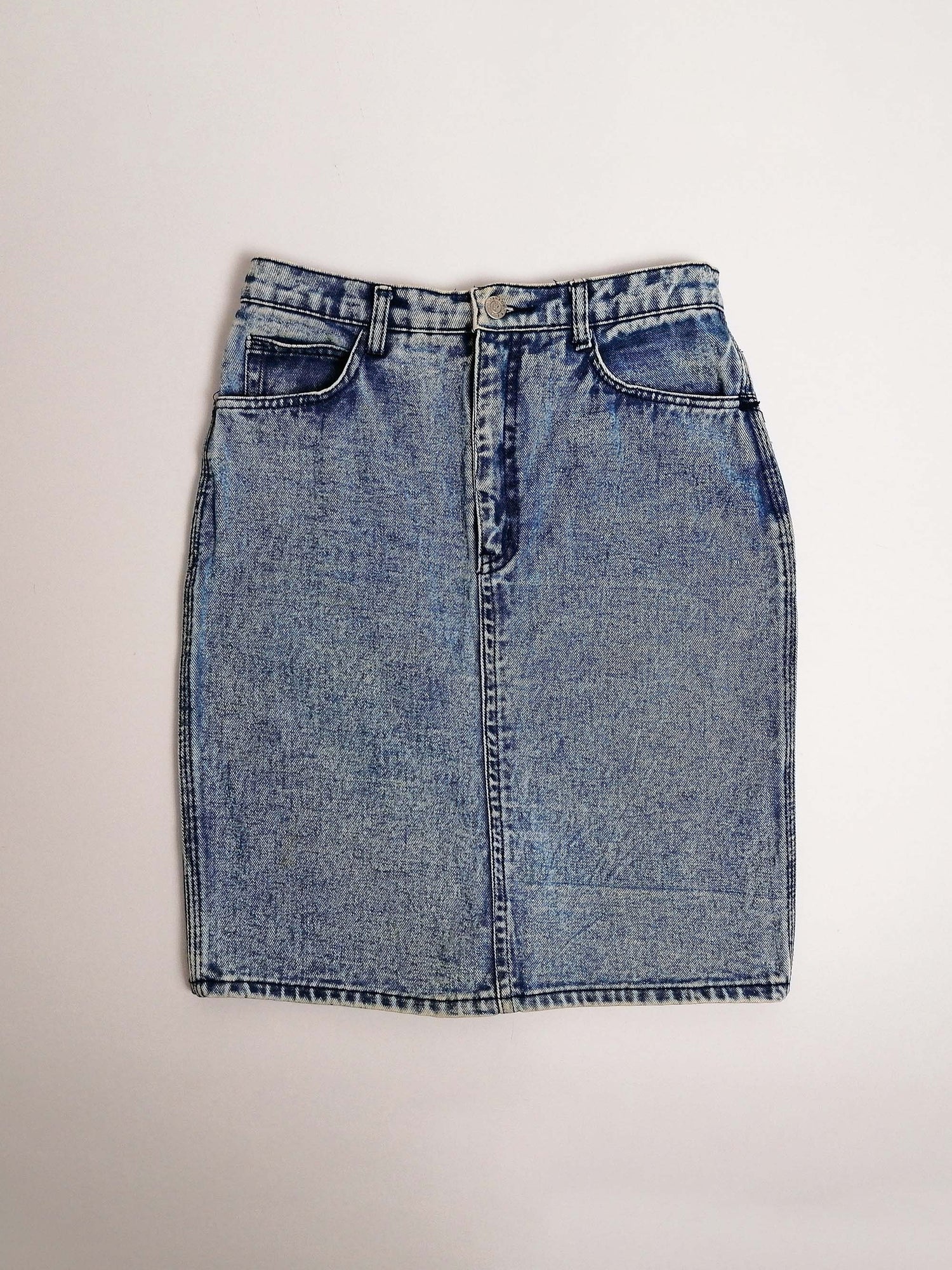 Gorgeous vintage 80's 90's acidwash high waist denim skirt, patch on back pocket.
