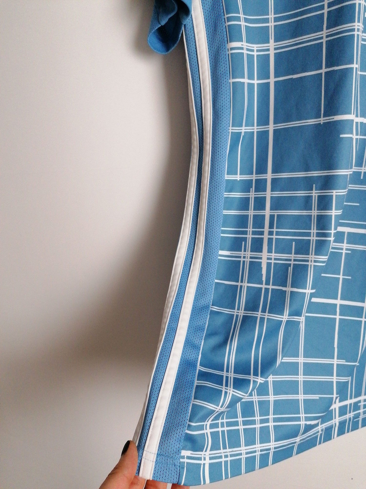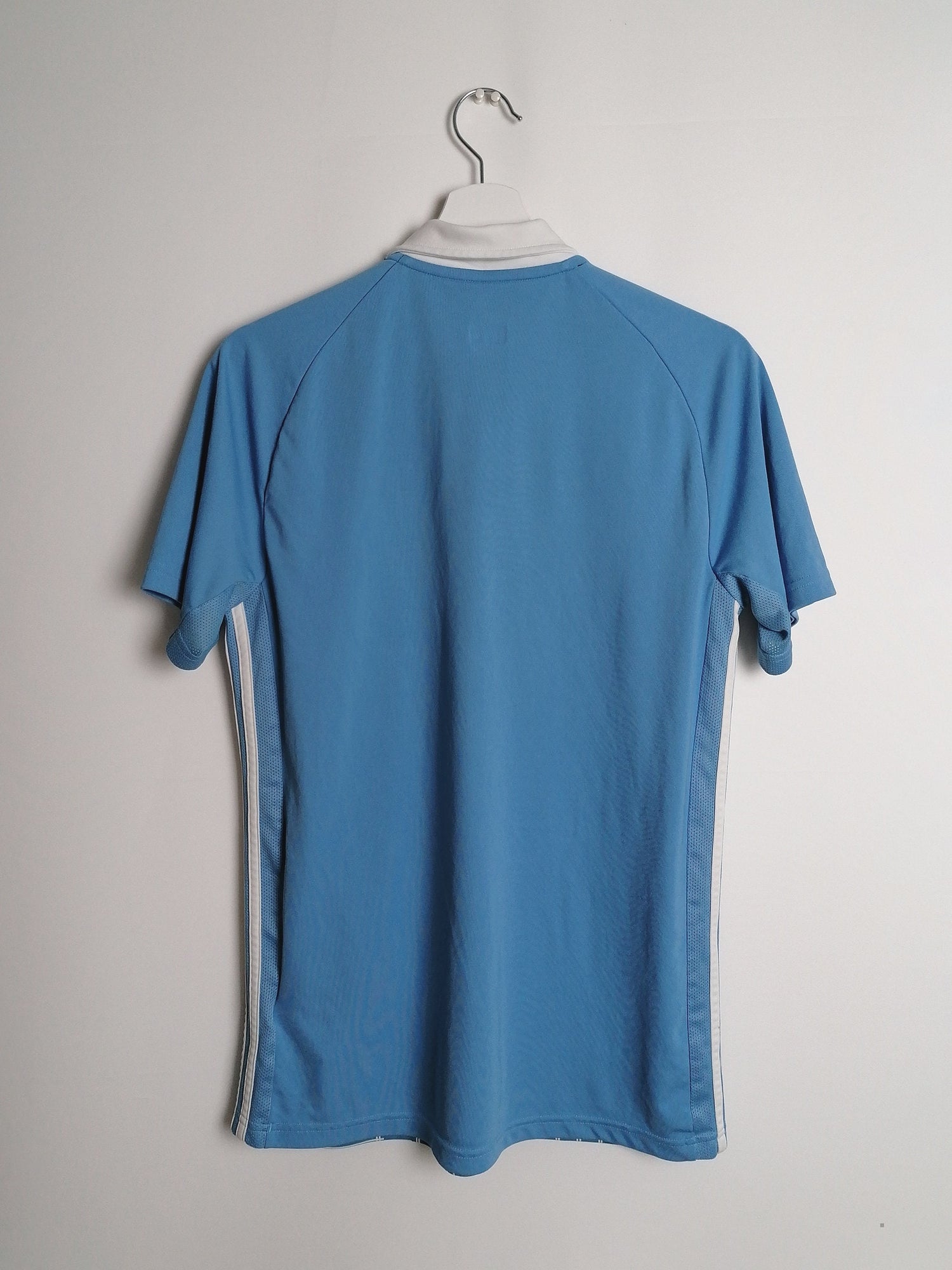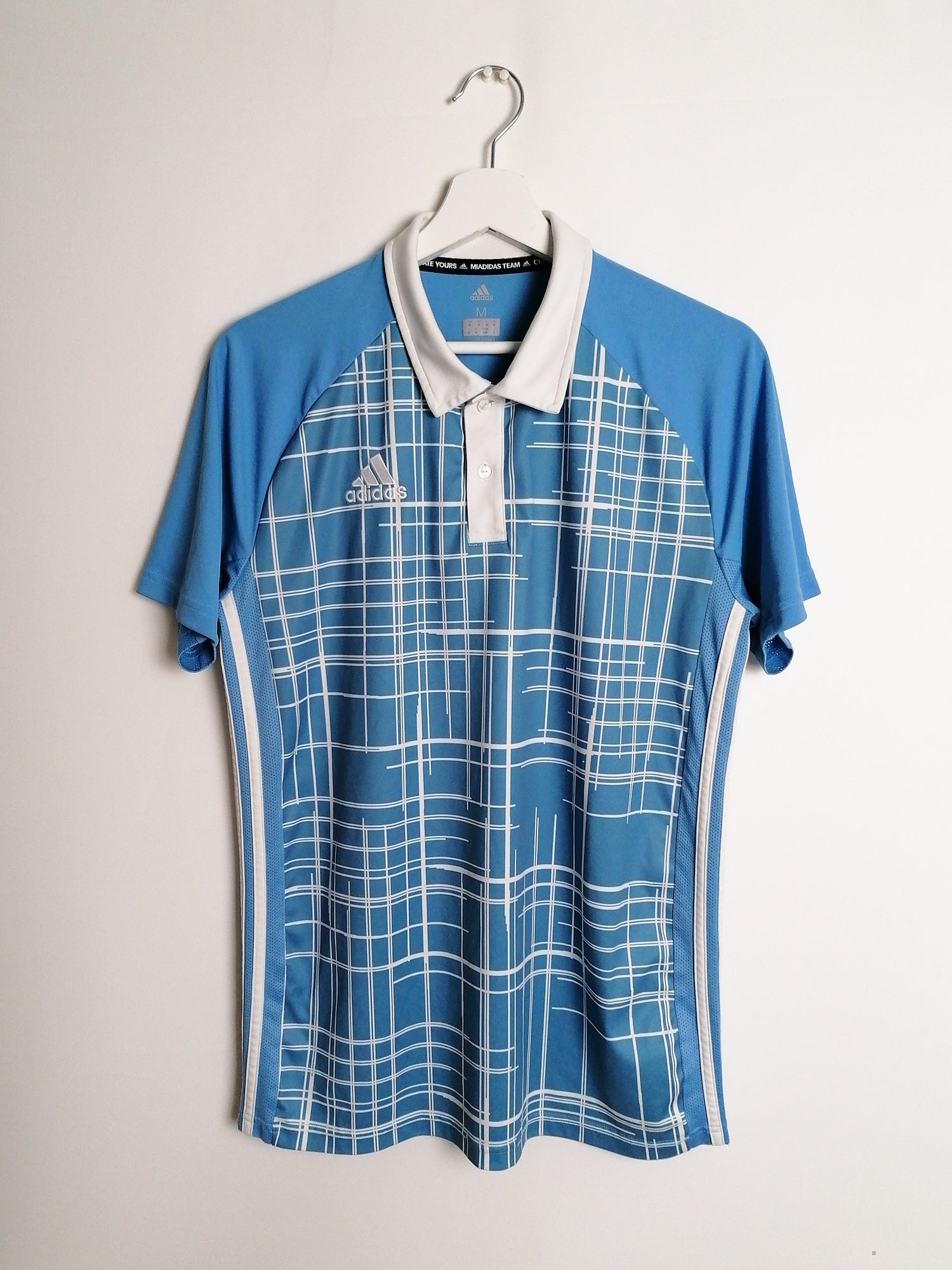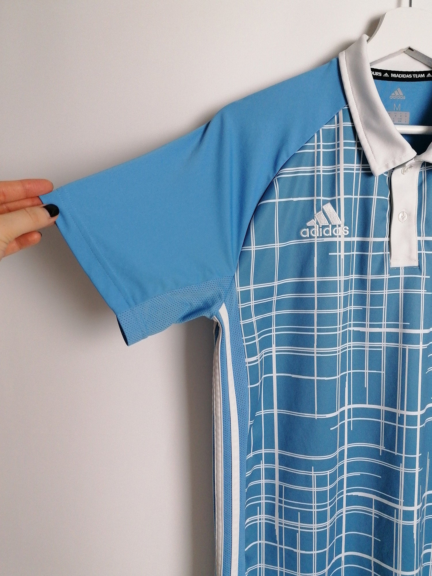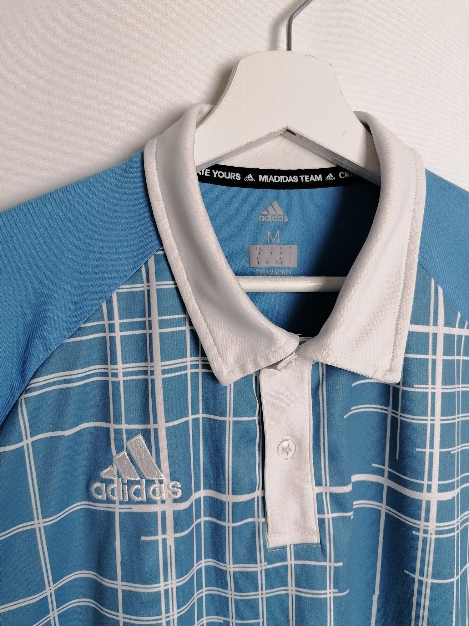 Vintage Adidas Miadidas Team 2018 Climacool football jersey, embroidery logo, light blue and white colour scheme.