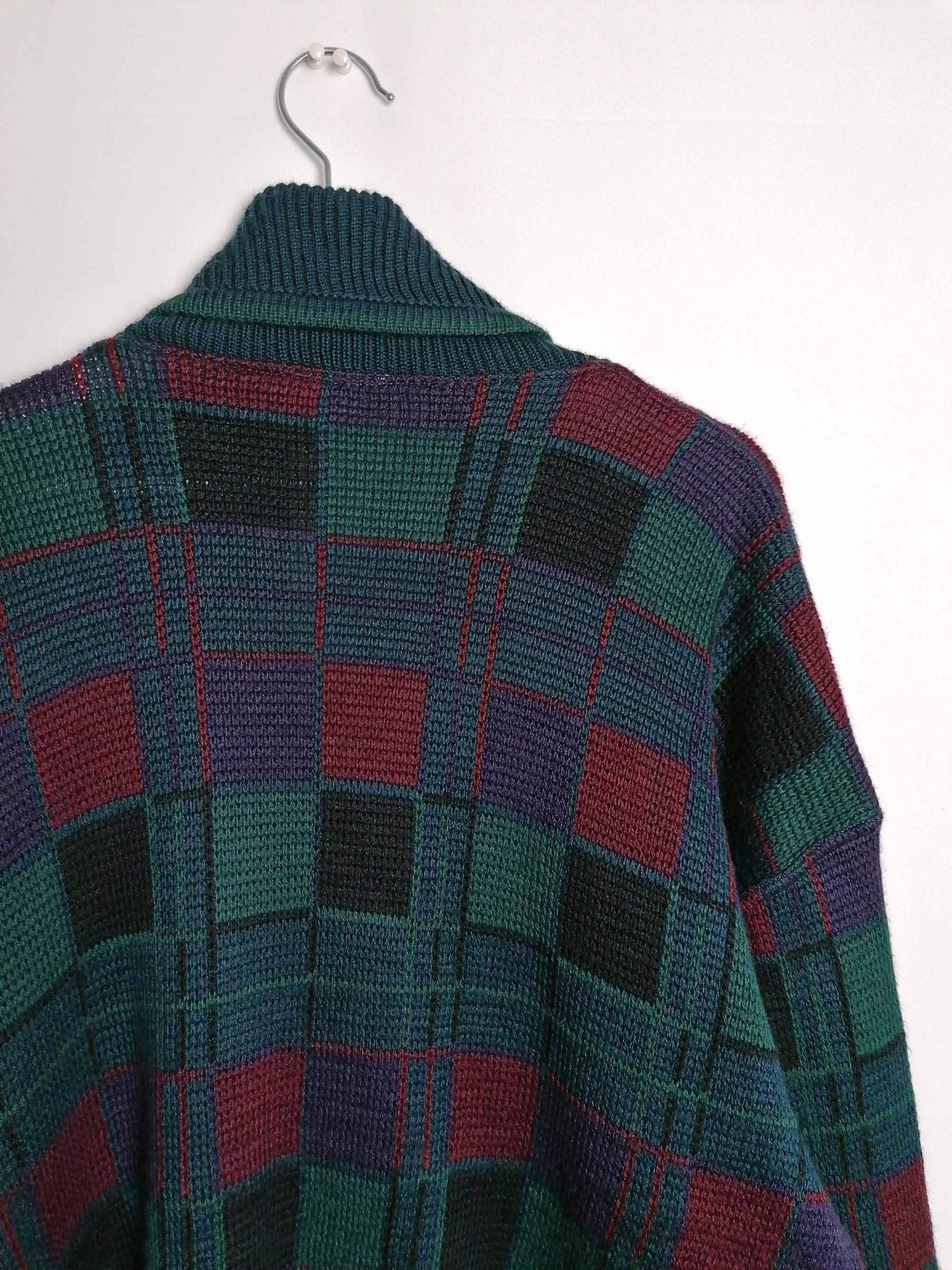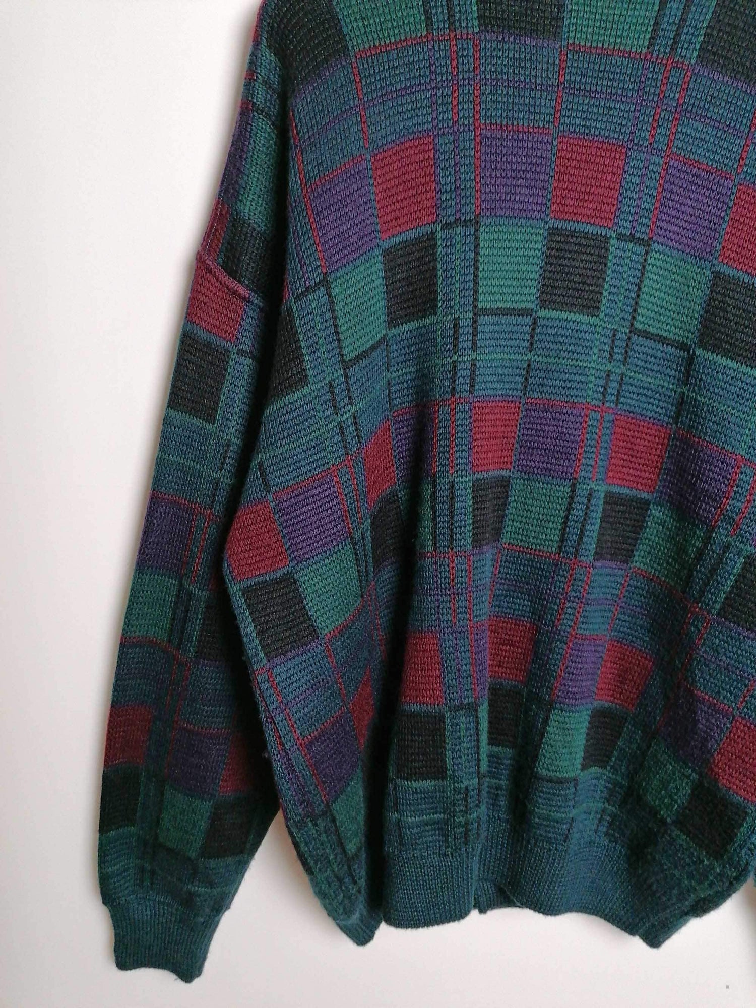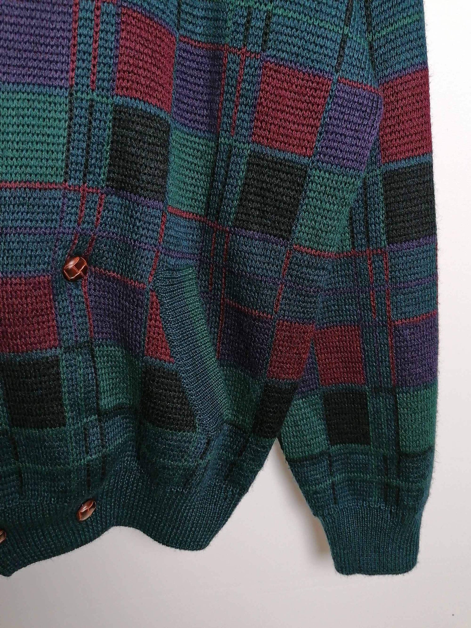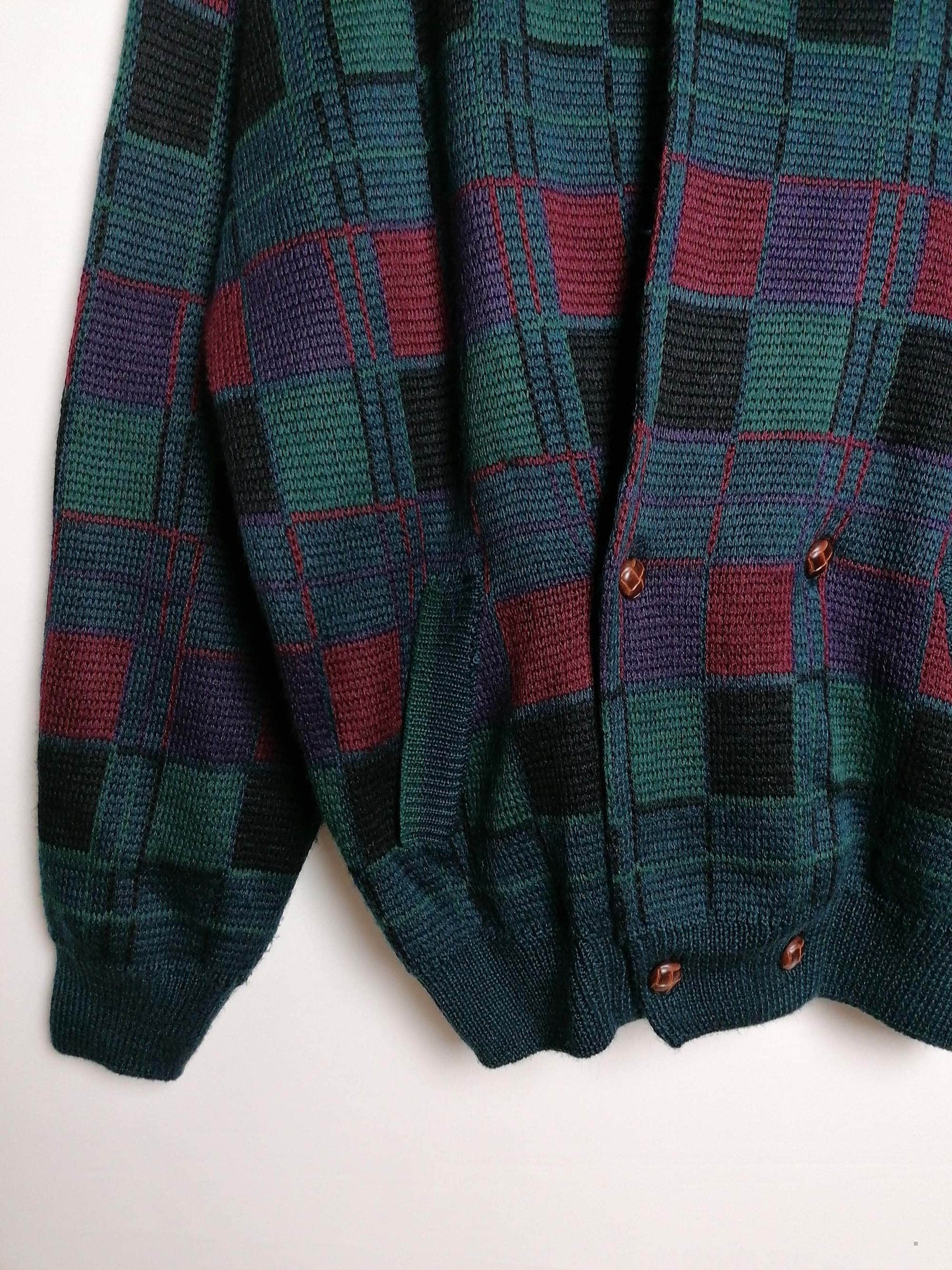 Vintage 80's 90's unisex oversized wool blend knit cardigan, beautiful pattern in dark green, purple and red.