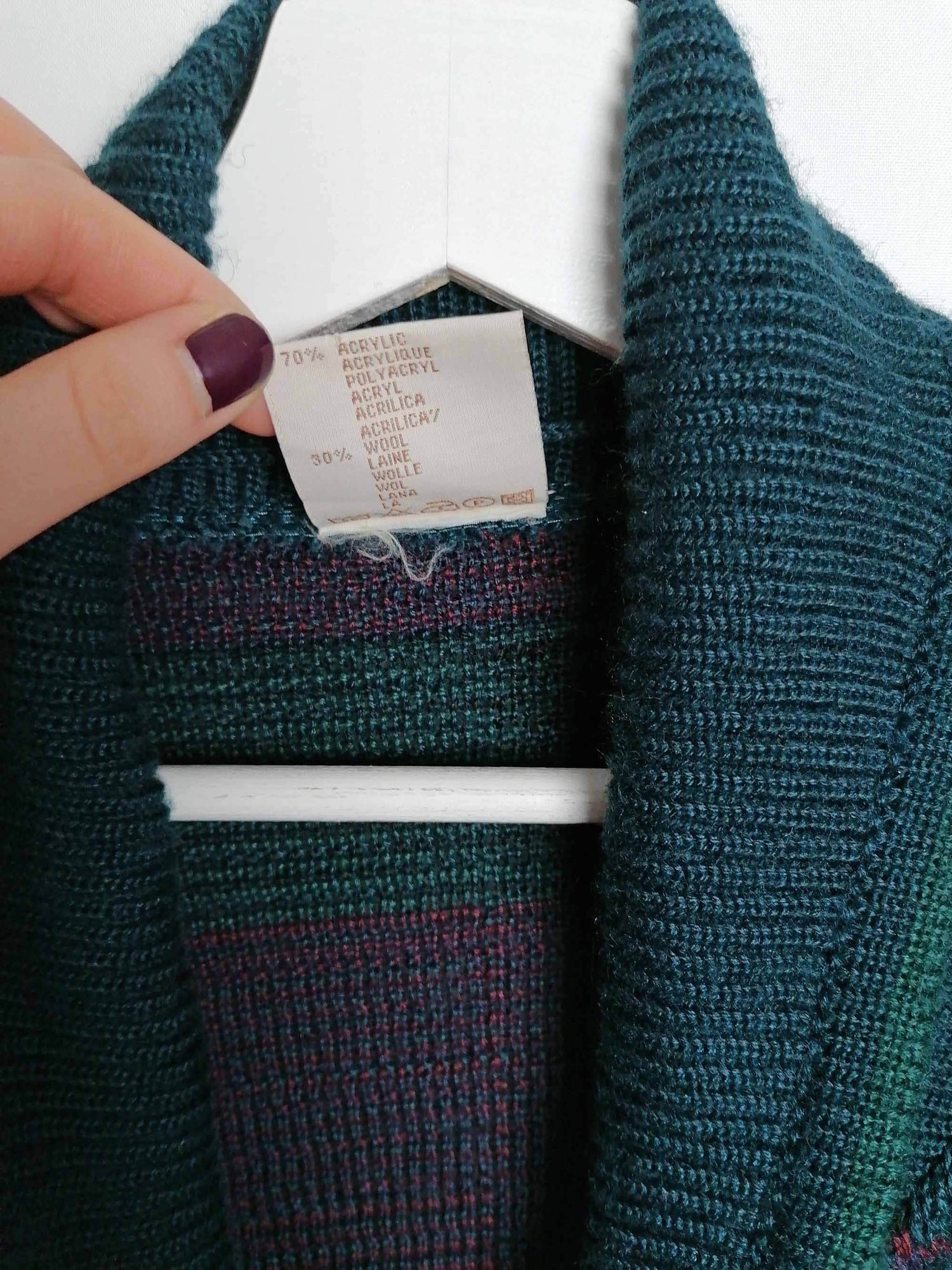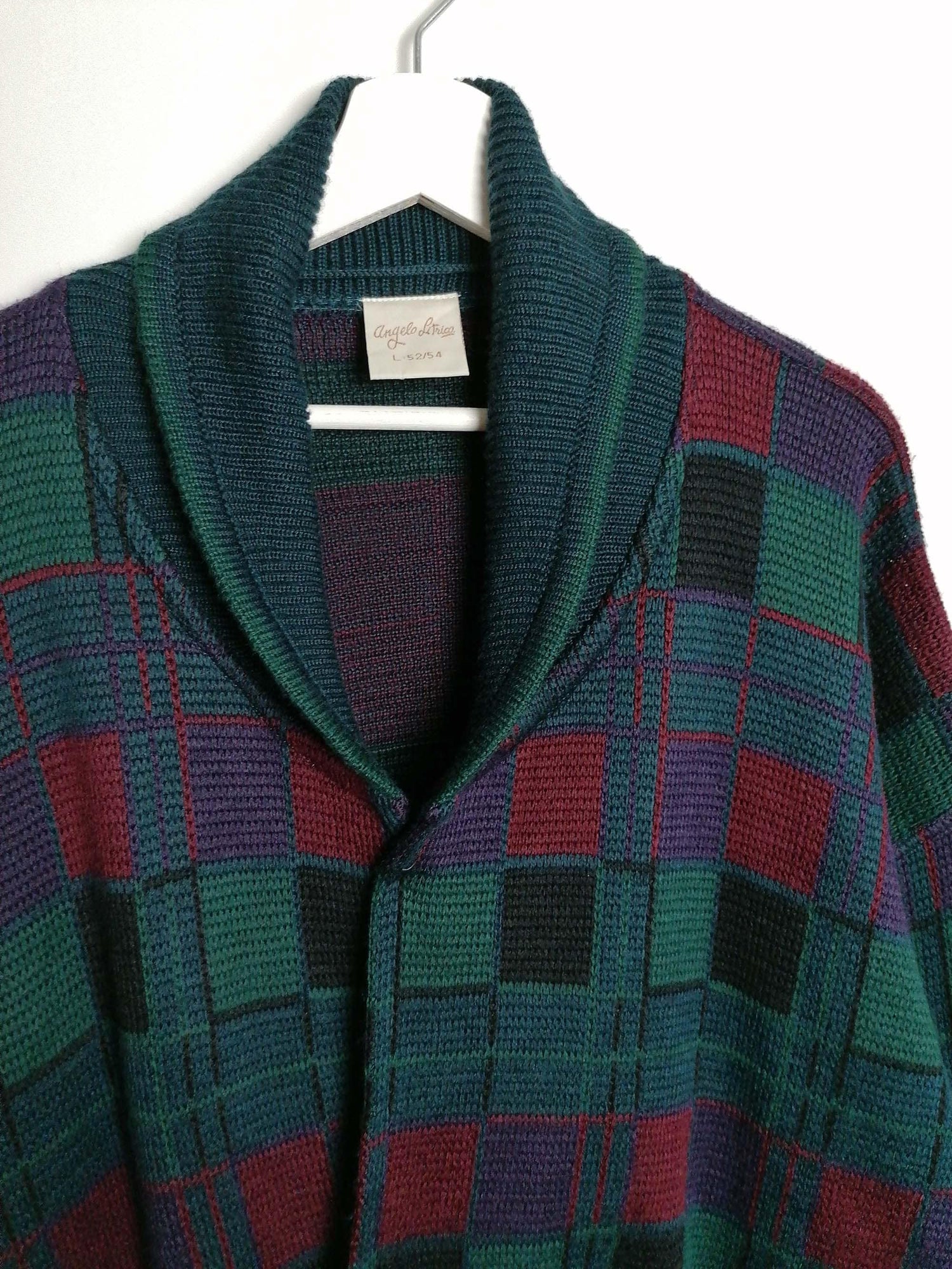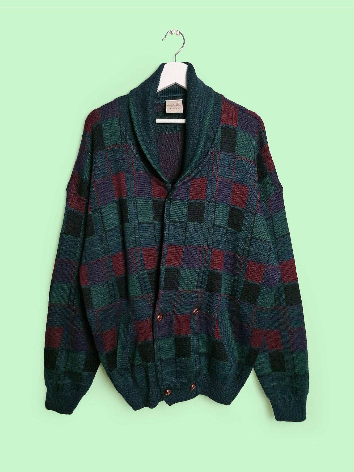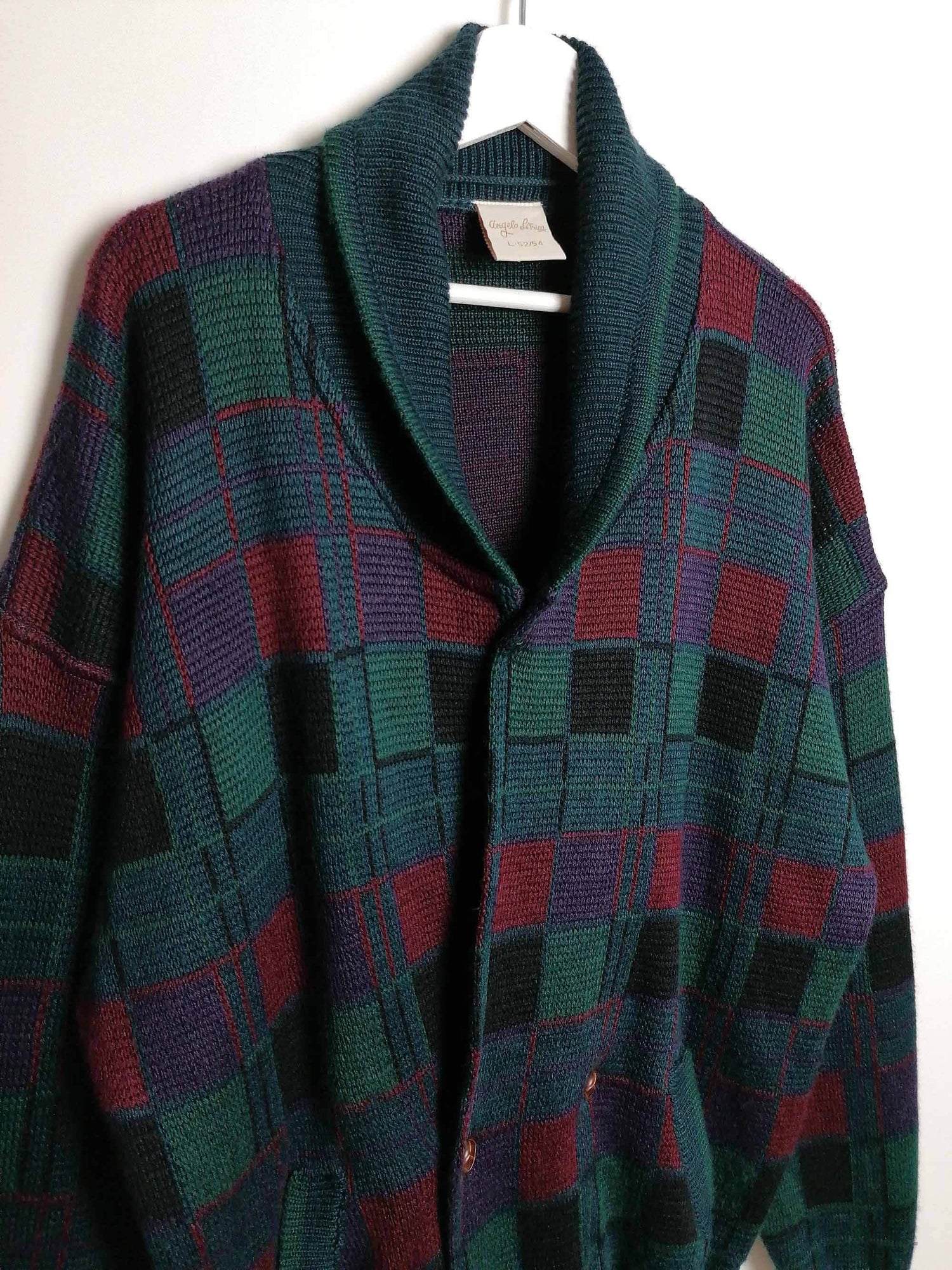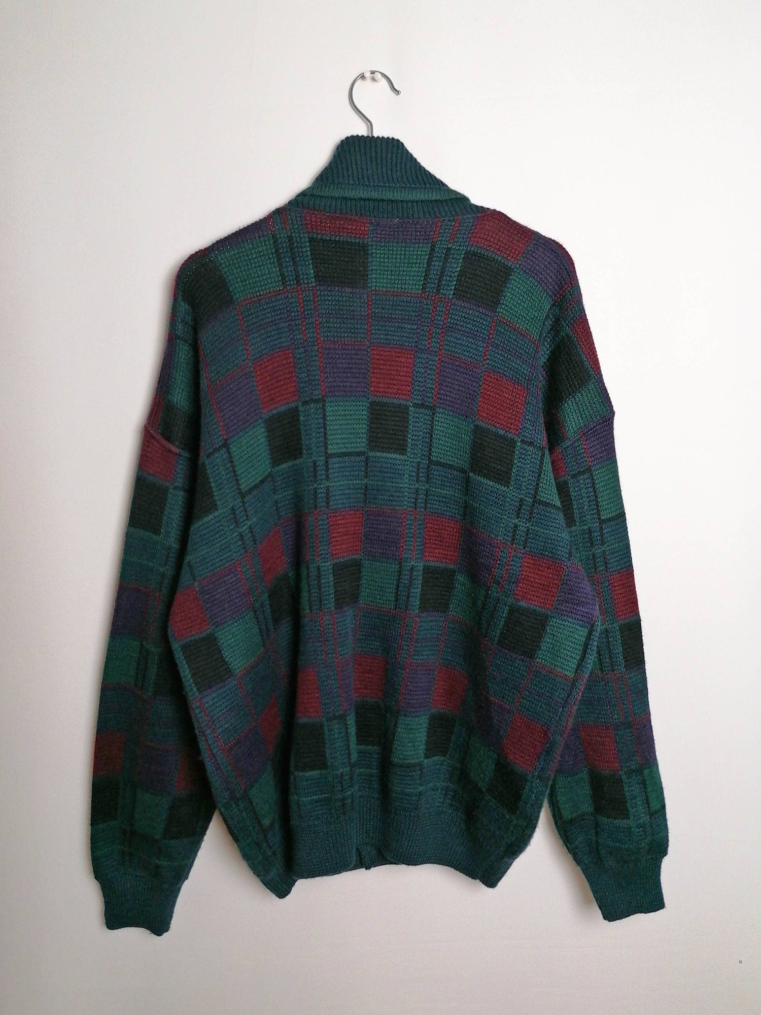 Vintage 80's 90's unisex oversized wool blend knit cardigan, beautiful pattern in dark green, purple and red.