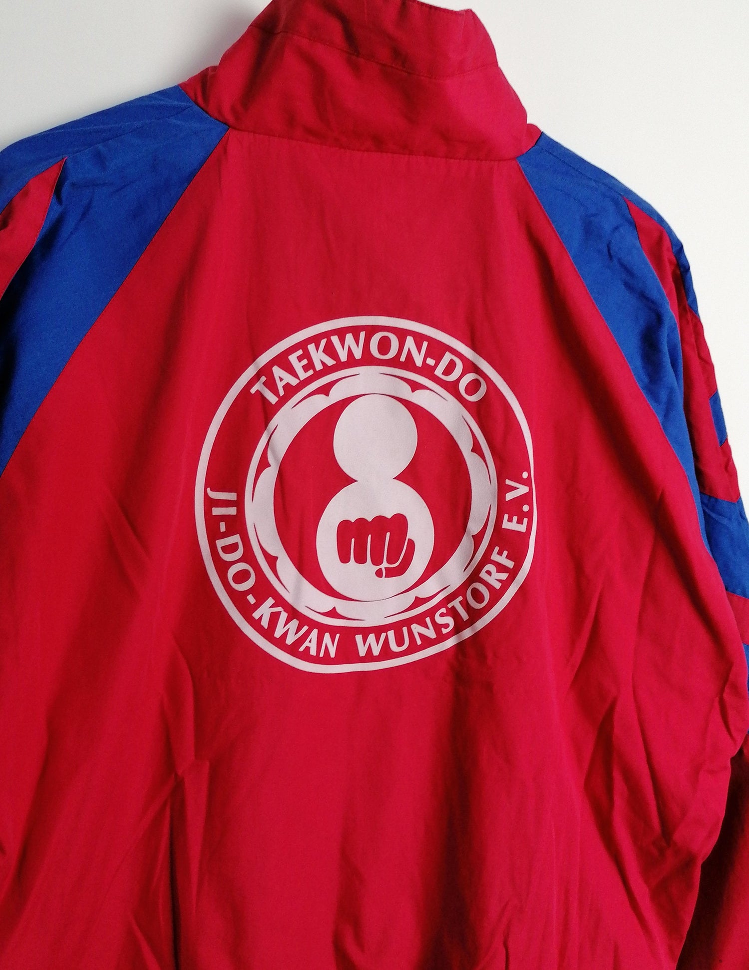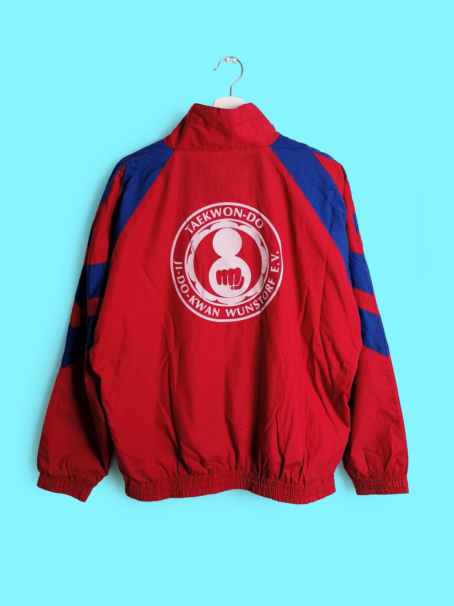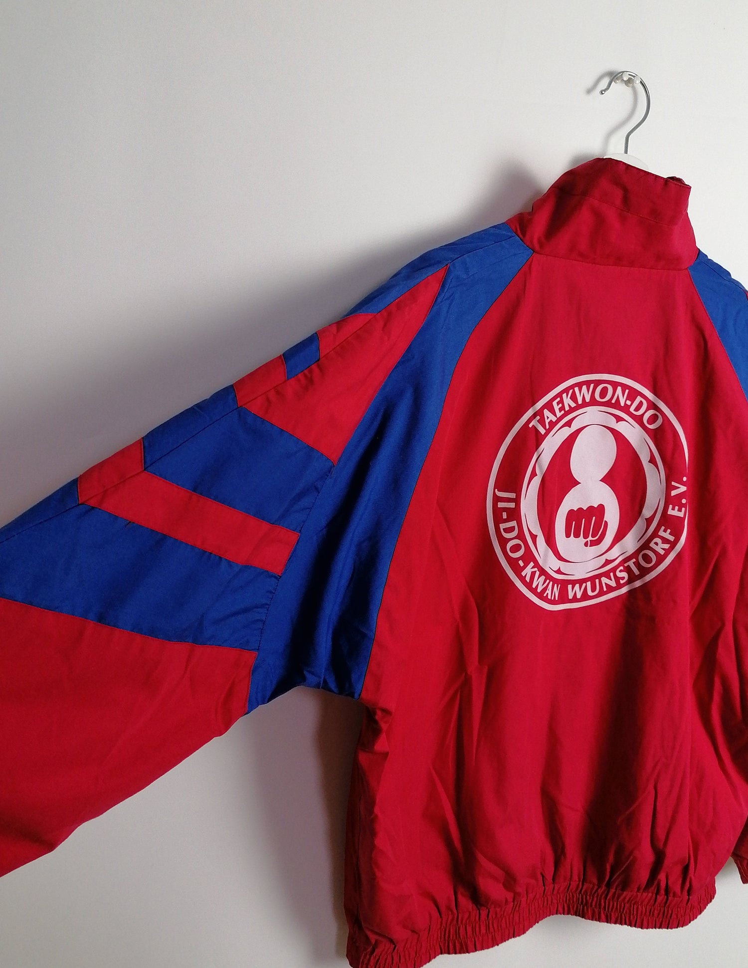 Vintage 90's soft shell track jacket, branded with huge taekwando logo on back. Beautiful cut, bright red and blue colour scheme. Brand BERRI, made in Denmark.