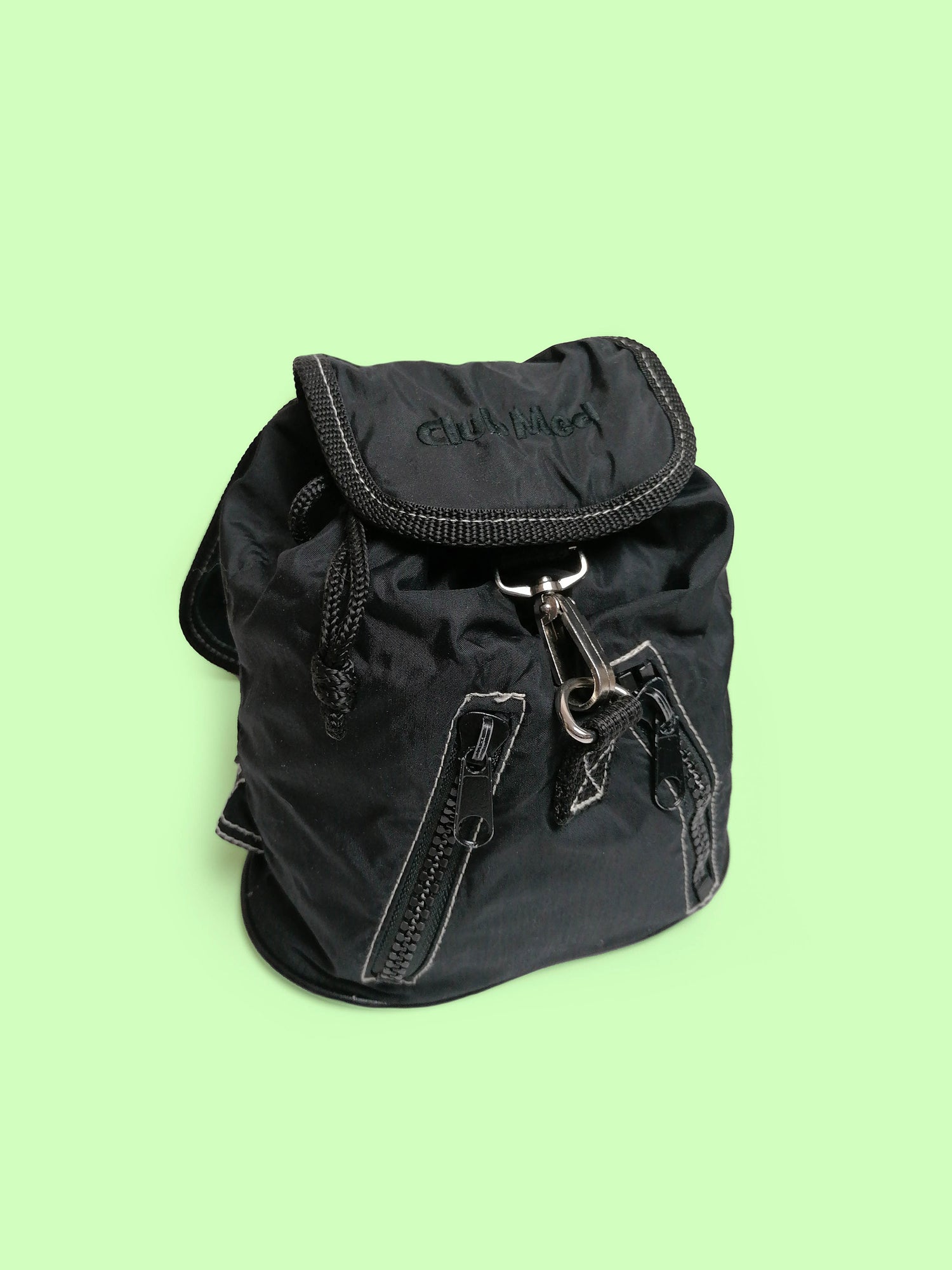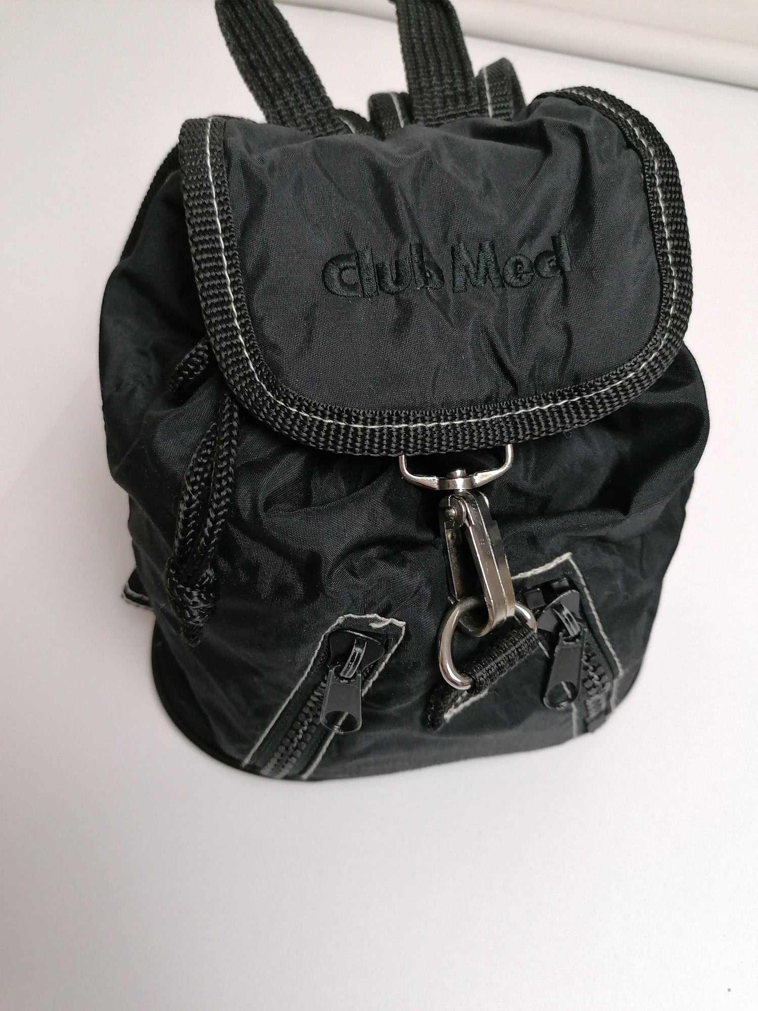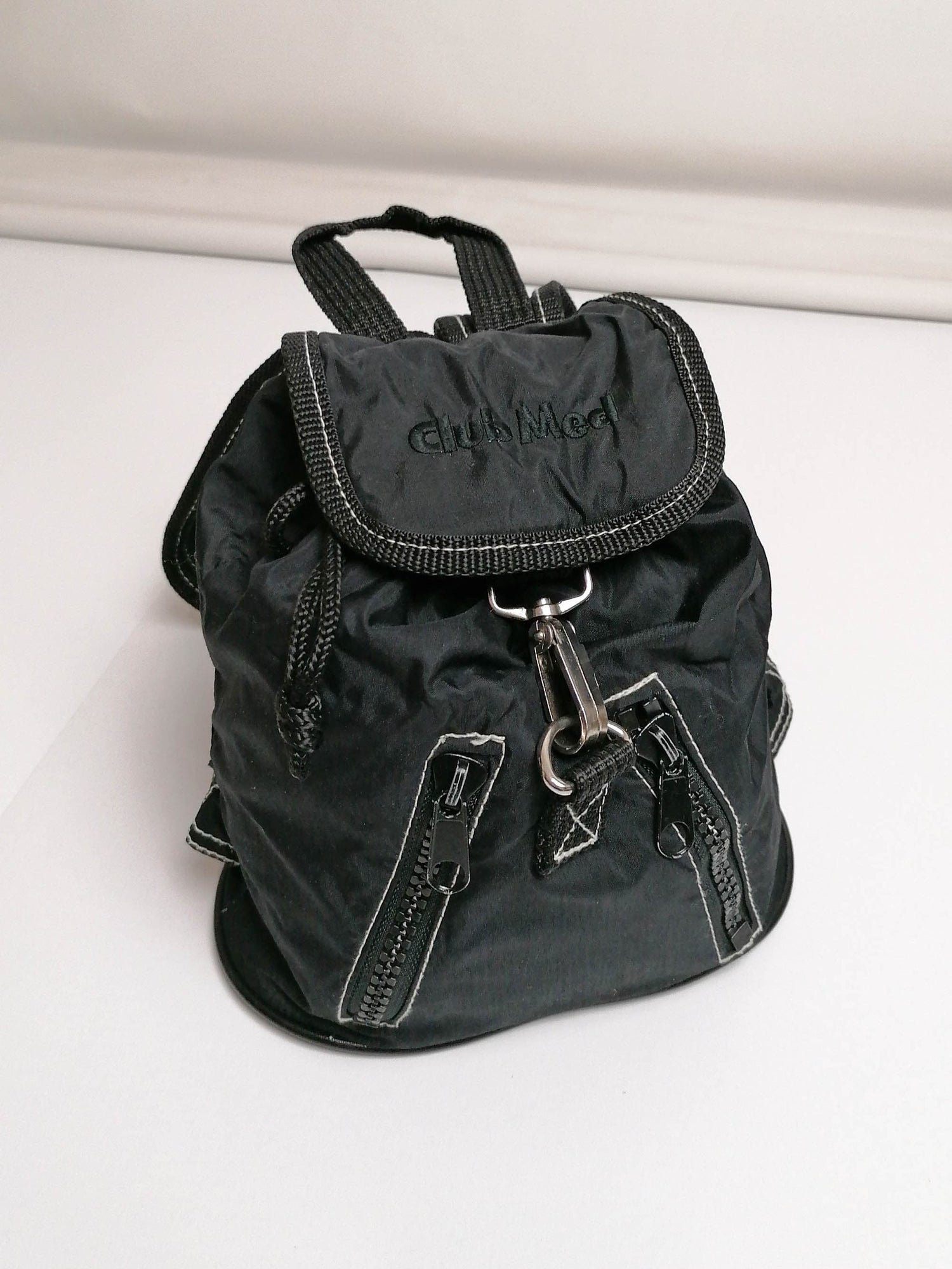 Super cute 90's small nylon backpack, Club Med embroidery logo, adjustable straps, drawstring closure. It's tiny, but roomy and has 2 zipper pockets.
