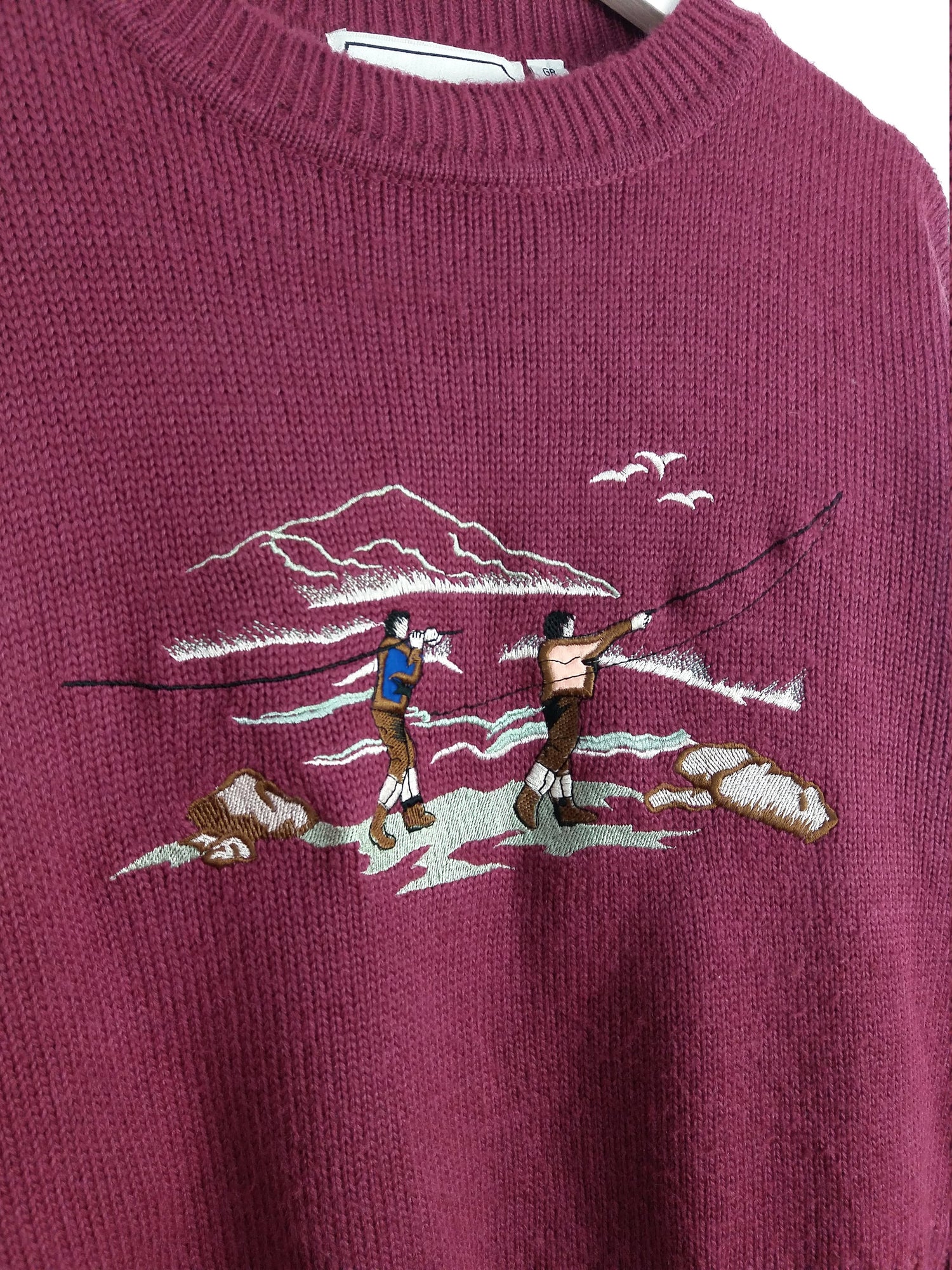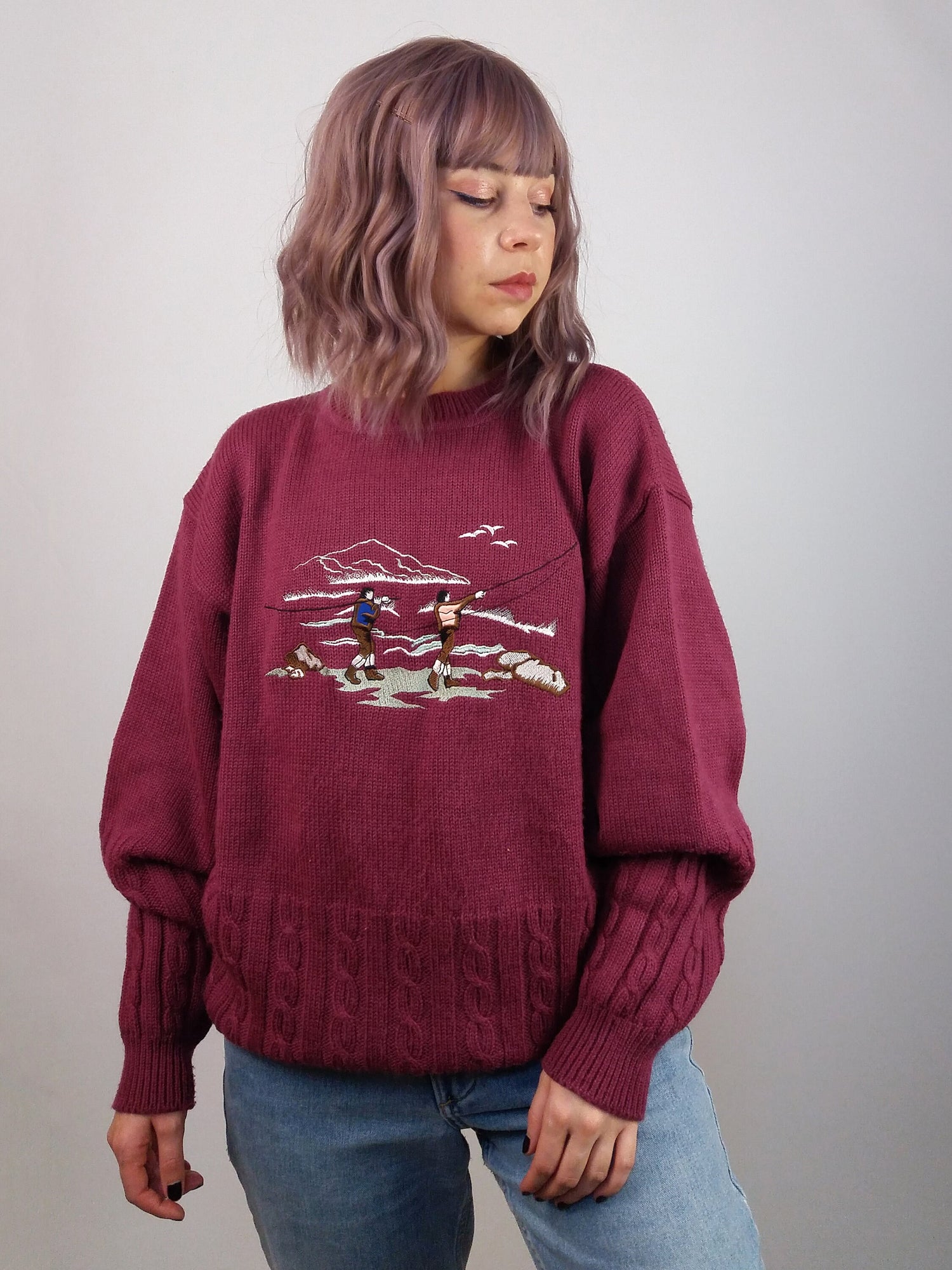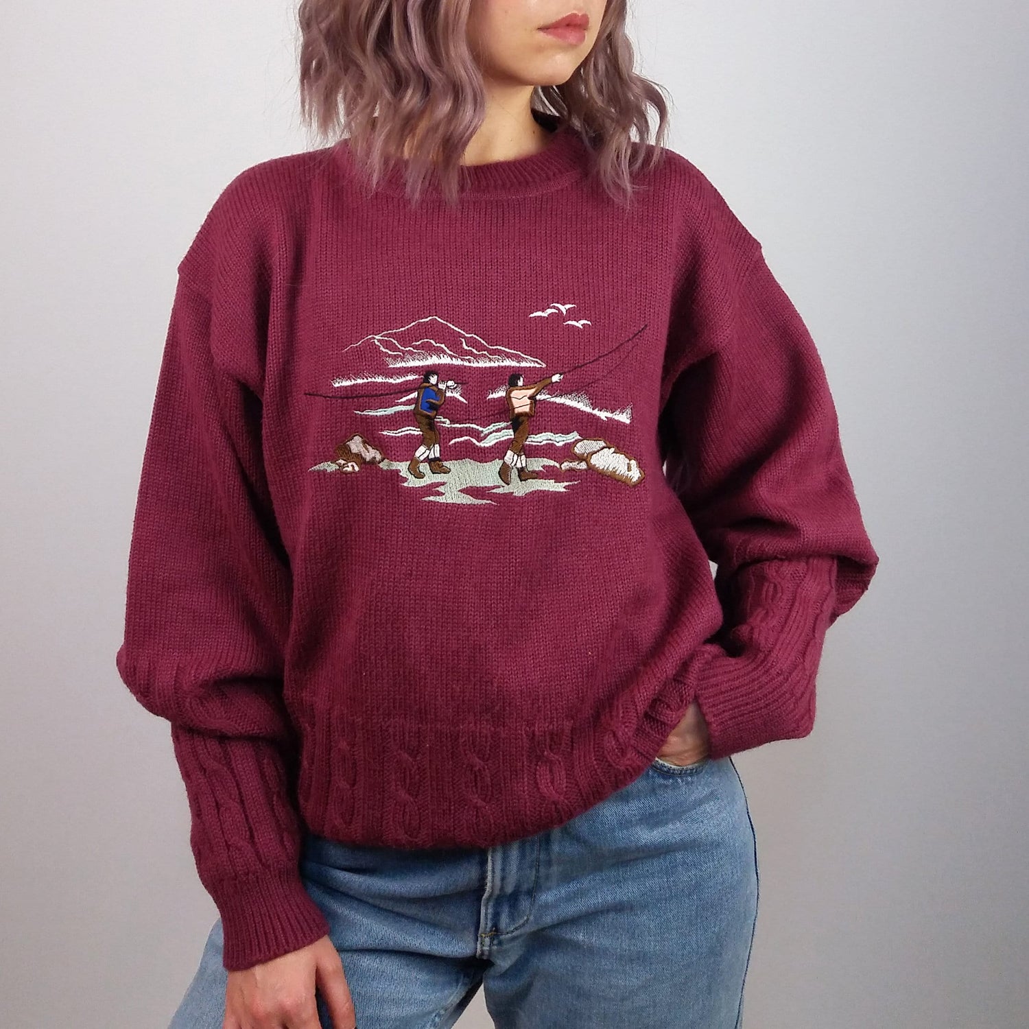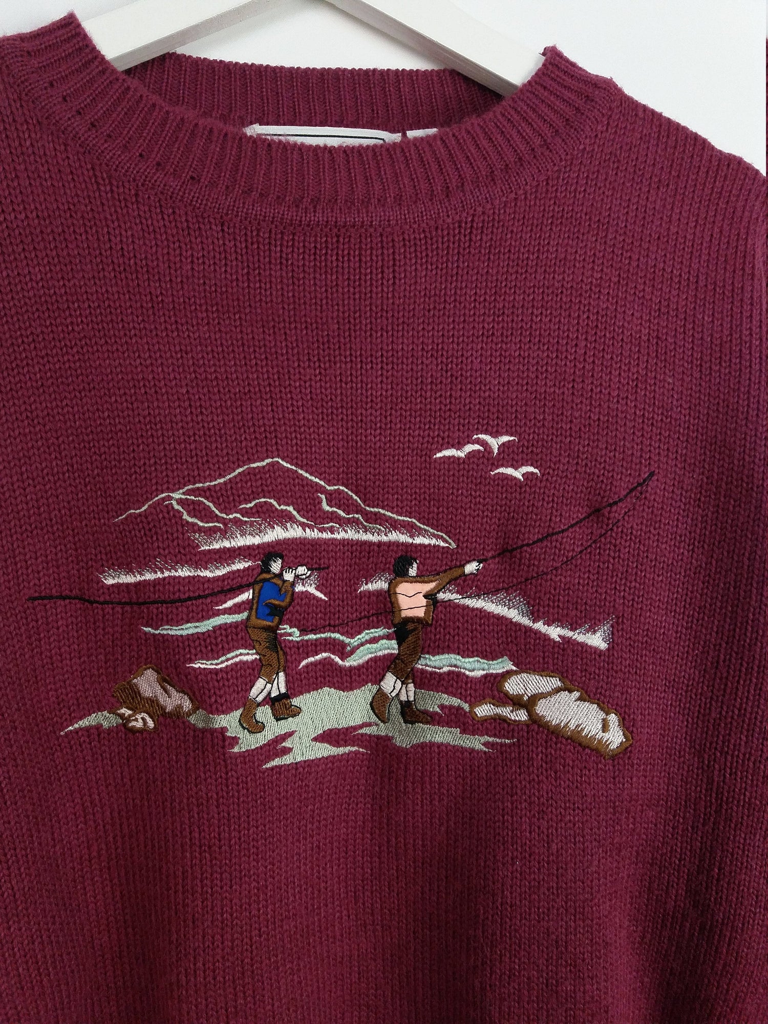 Gorgeous 80's 90's unisex vintage knit sweater, fishing scene embroidery, beautiful burgundy.
