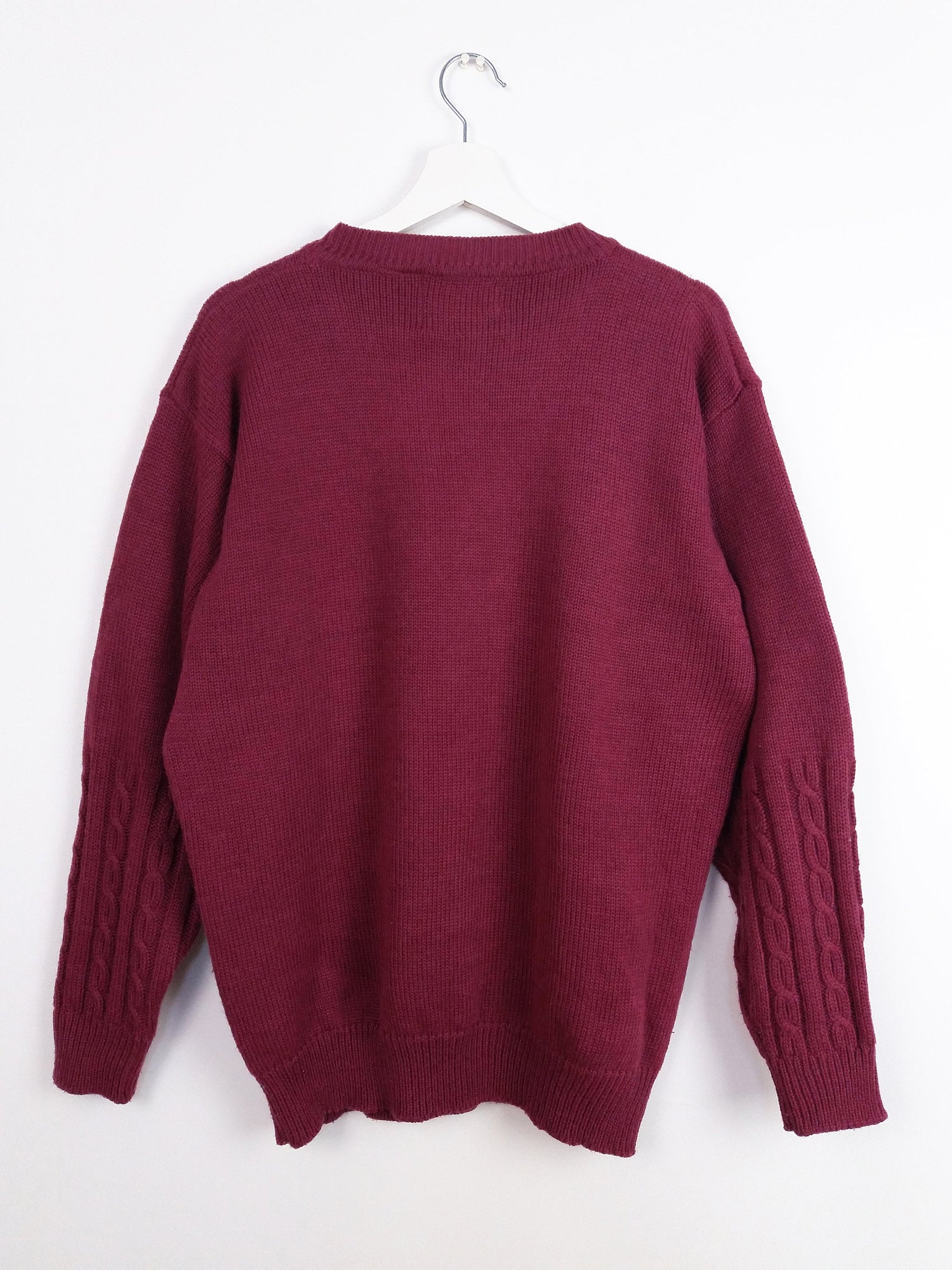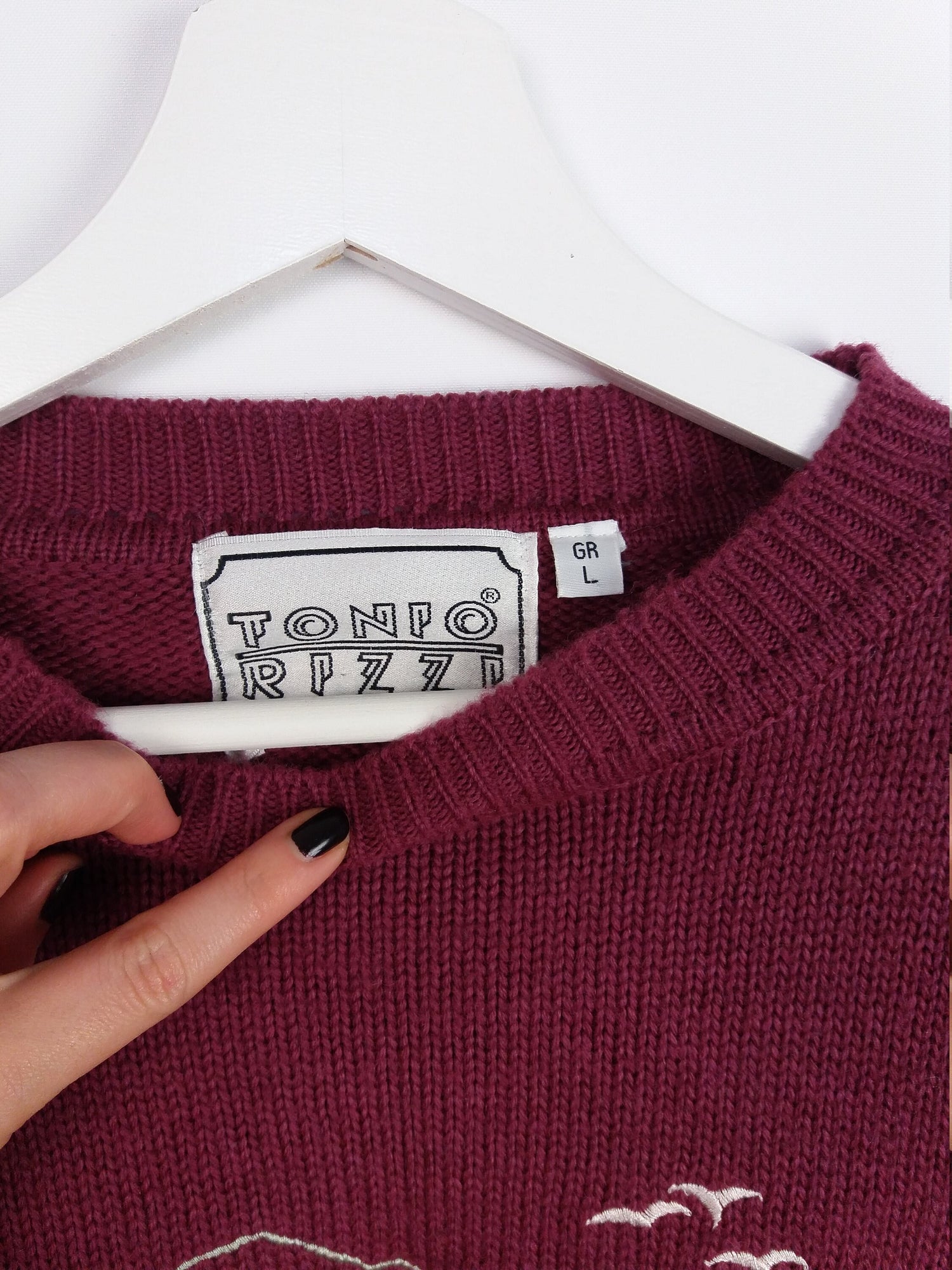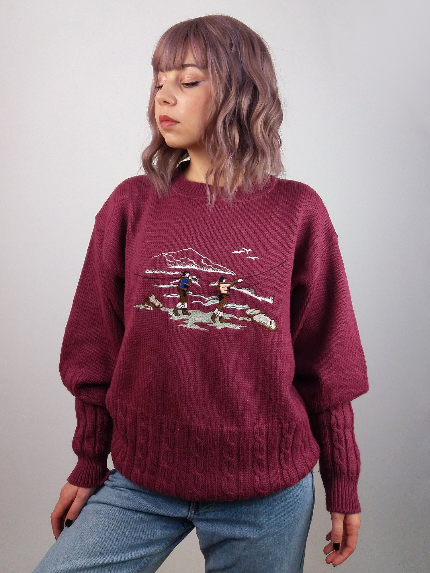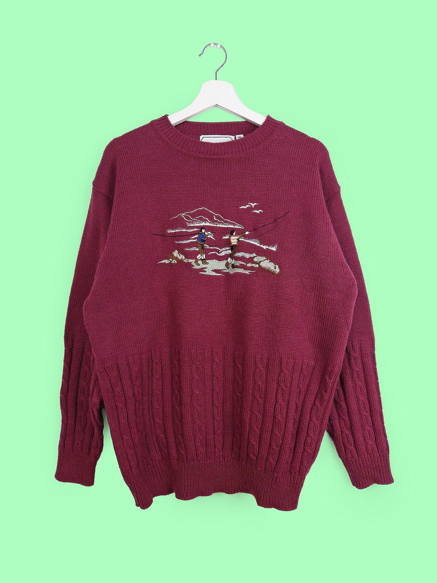Gorgeous 80's 90's unisex vintage knit sweater, fishing scene embroidery, beautiful burgundy.