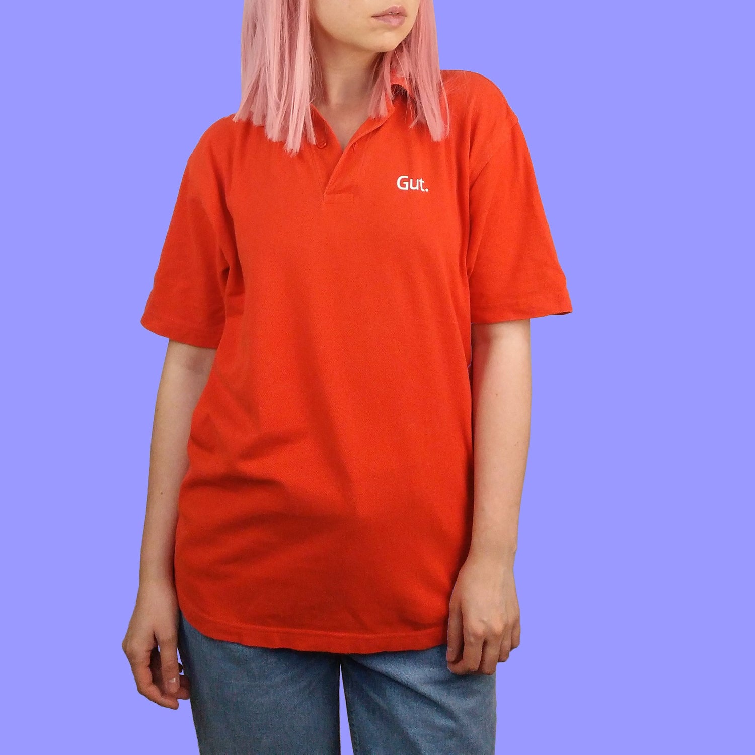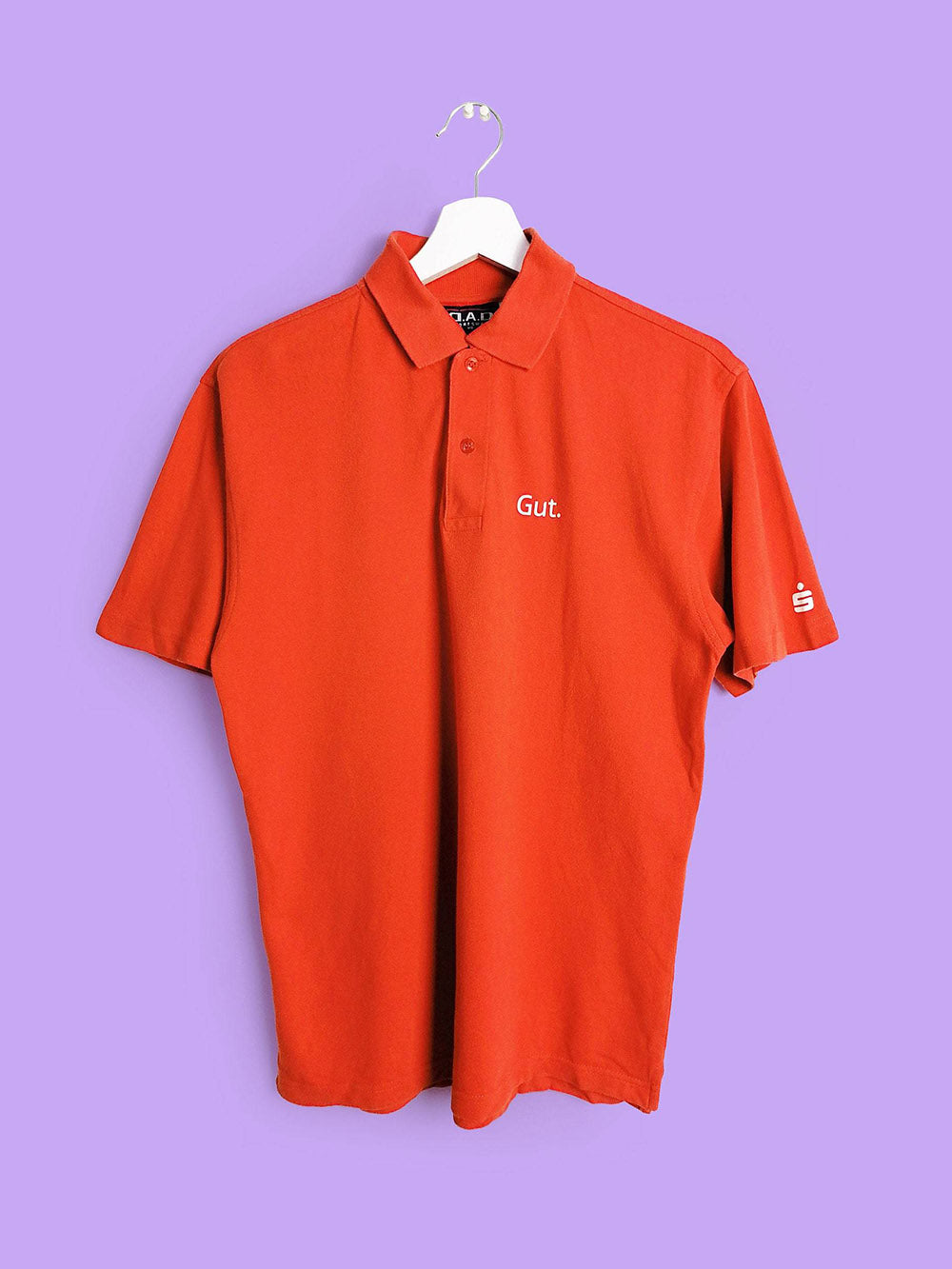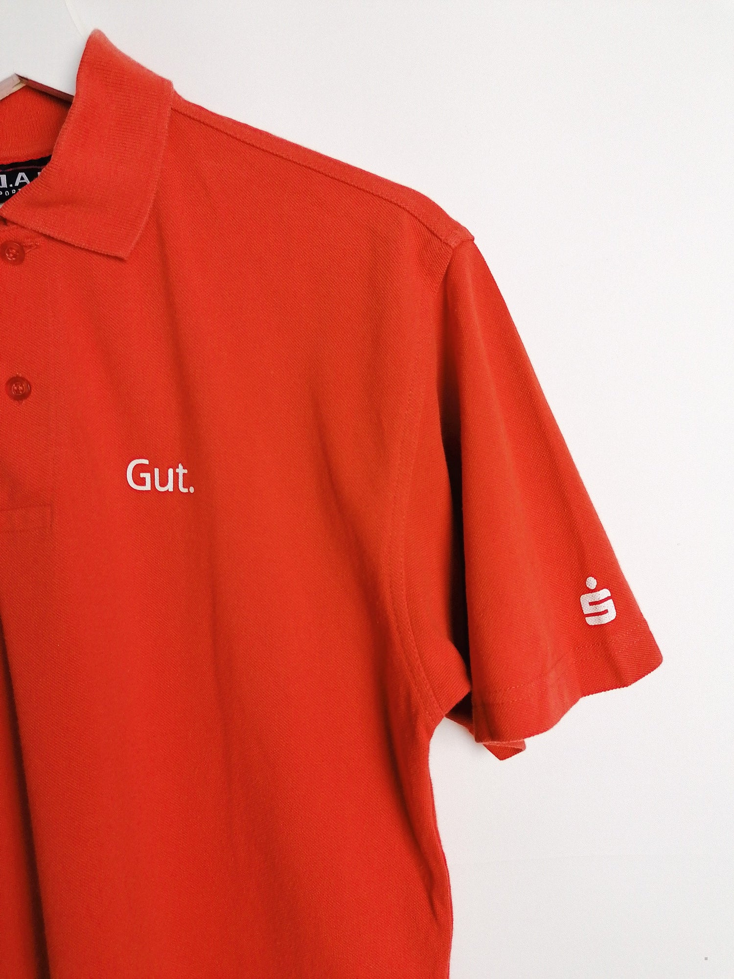 Beautiful vintage 90's unisex polo neck bank teller t-shirt in gorgeous orange (colour may vary from the picture). Small 'Gut' logo on breast and bank logo on sleeve