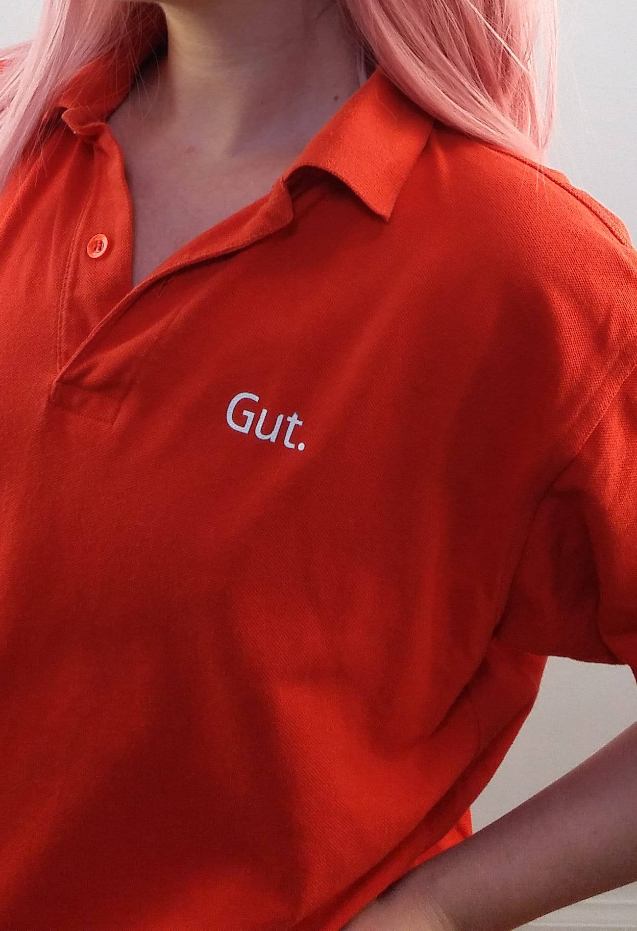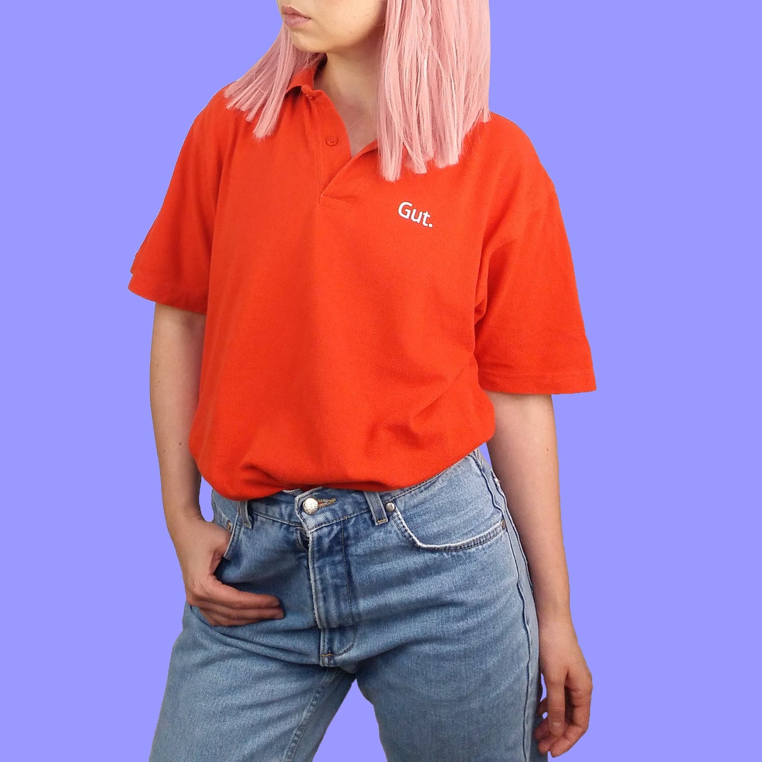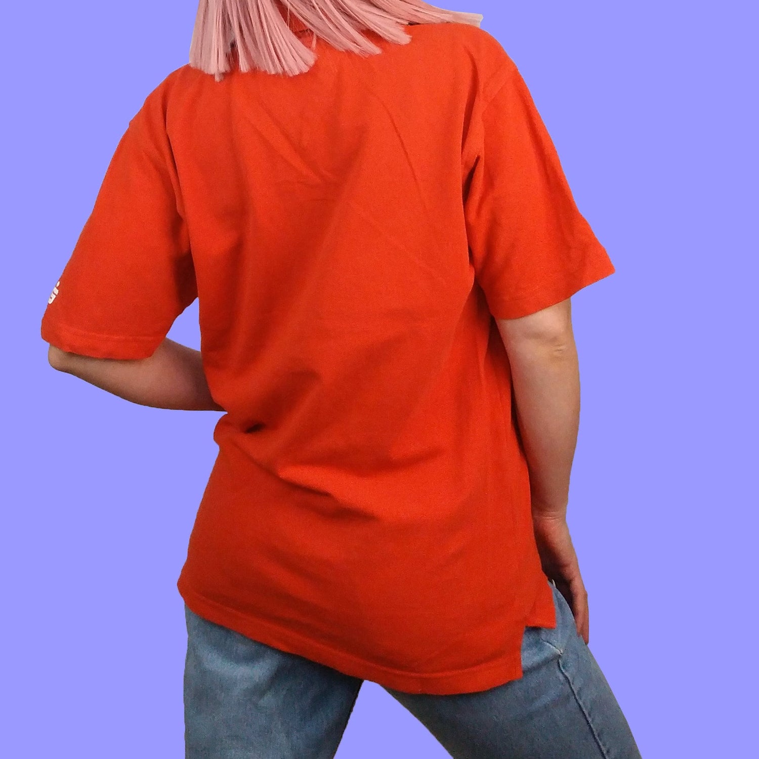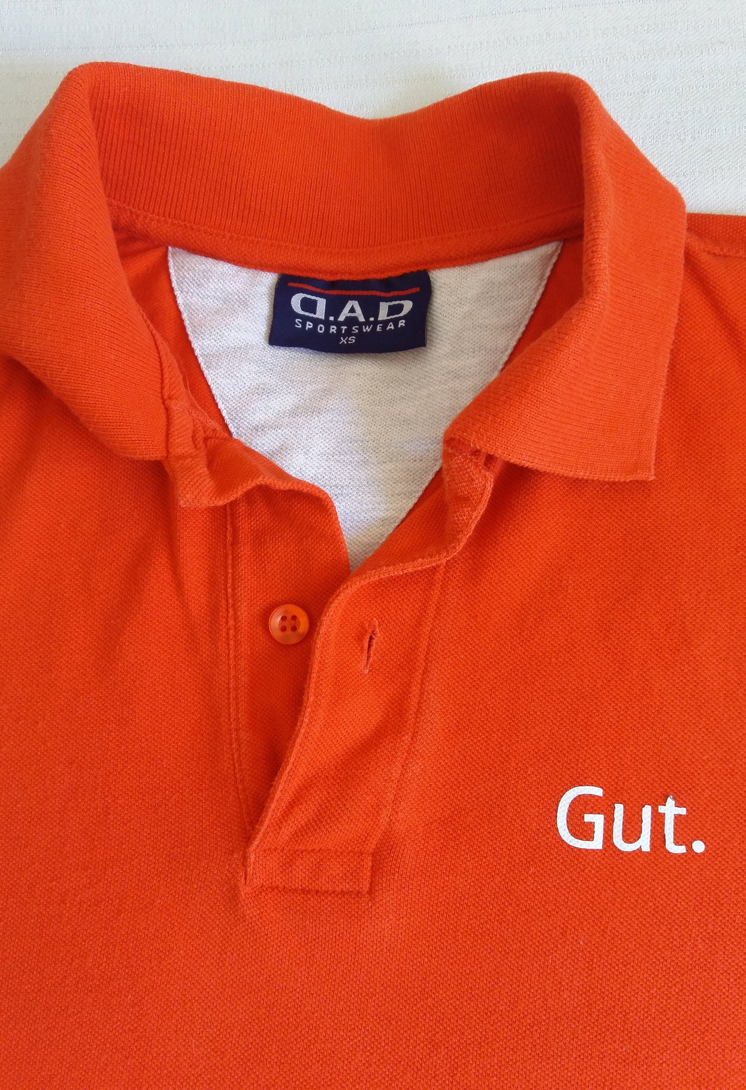 Beautiful vintage 90's unisex polo neck bank teller t-shirt in gorgeous orange (colour may vary from the picture). Small 'Gut' logo on breast and bank logo on sleeve