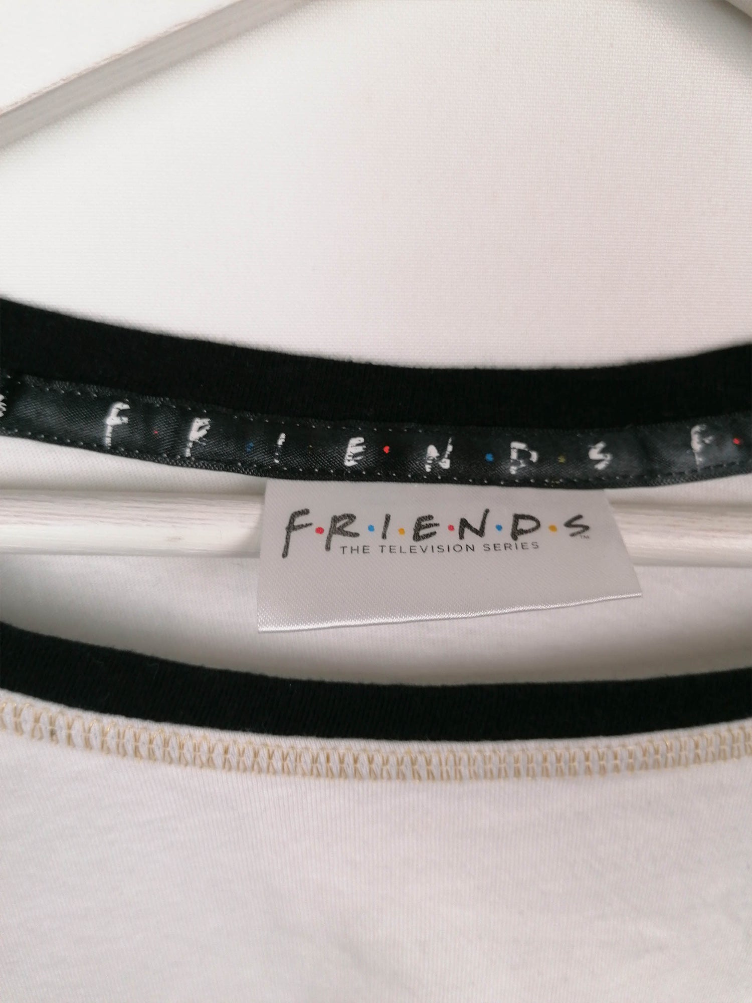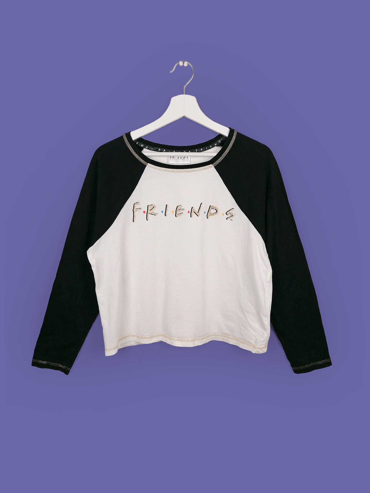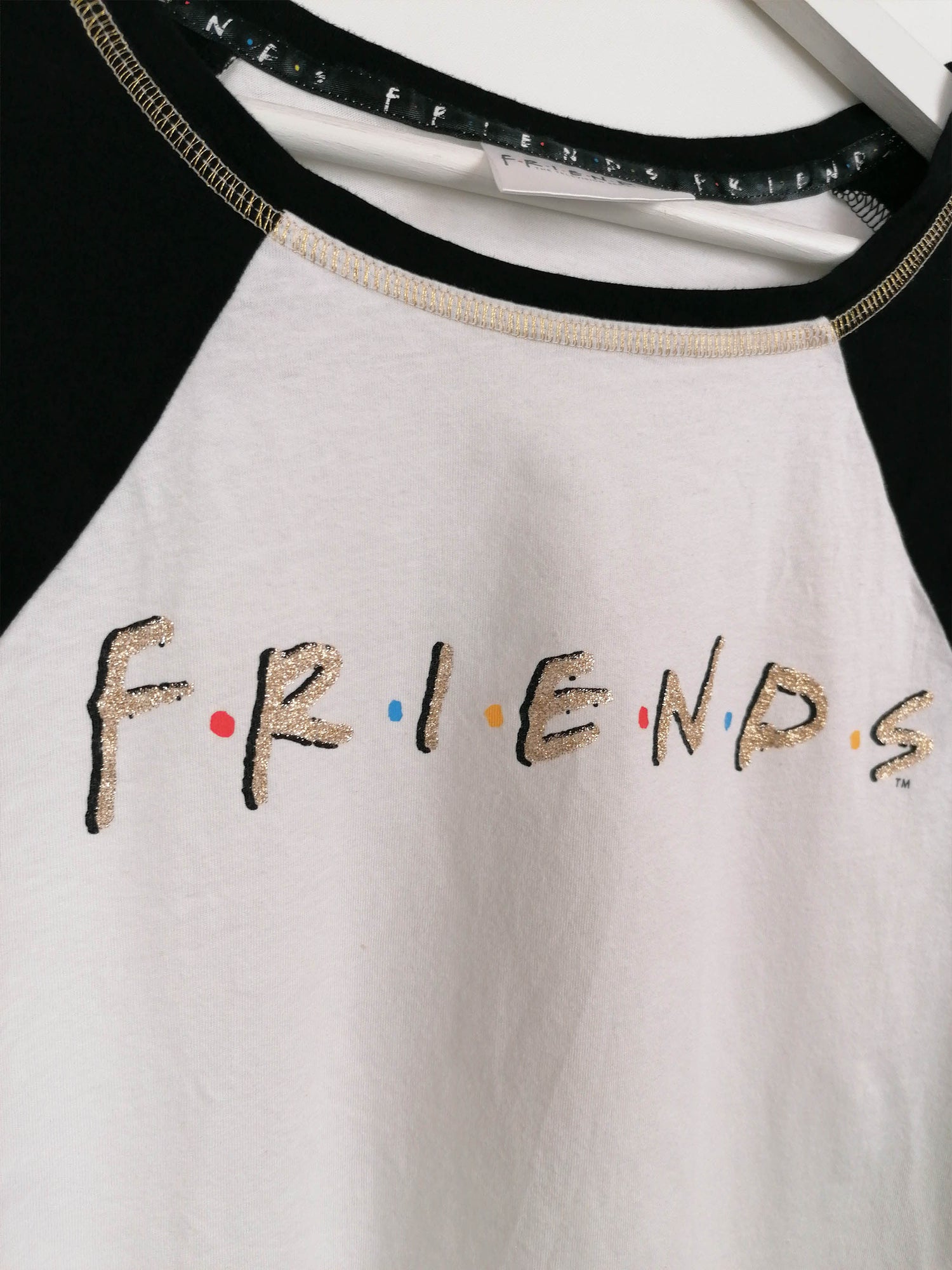Vintage Friends TV series t-shirt, raglan sleeve, black and white. Gold thread stitching and gold glitter on logo.