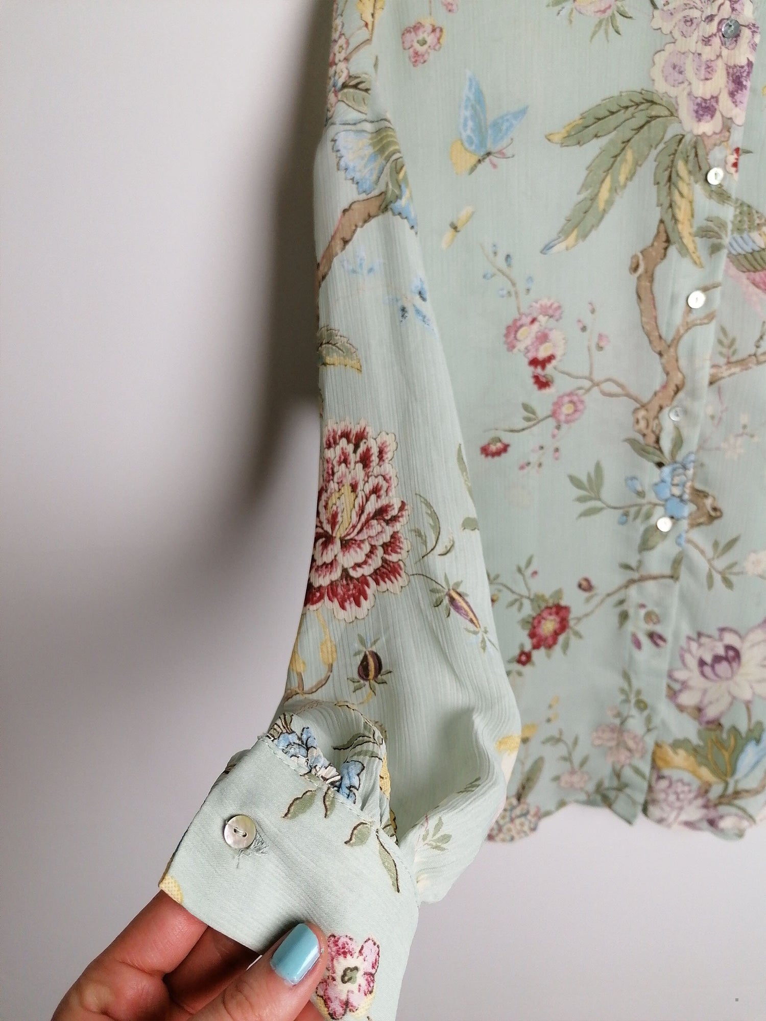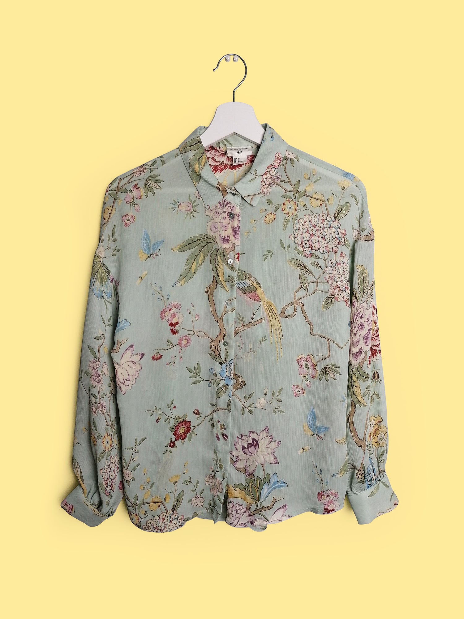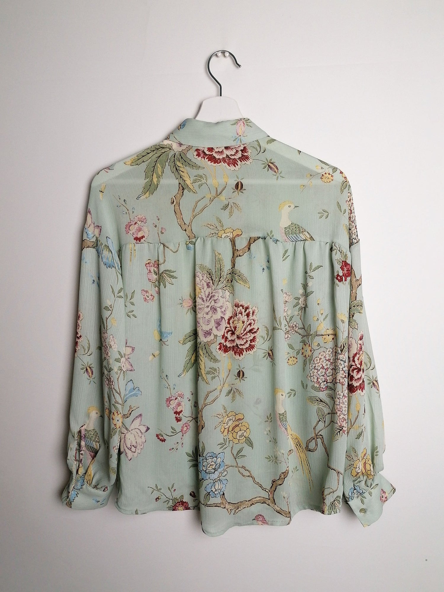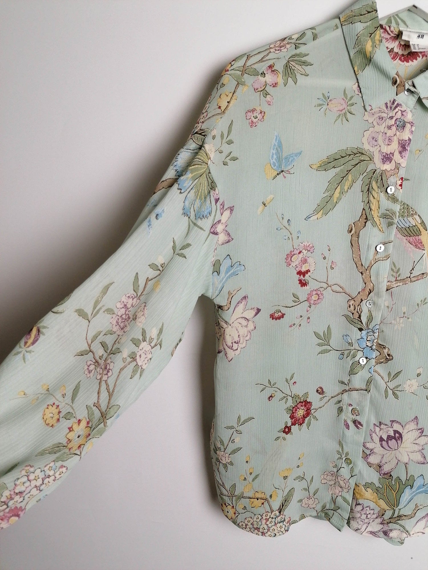 H&M x GP & J Baker 2018 collaboration button-up blouse, see-through, sea-foam green with birds and flowers print. It's not a vintage item, but very cute and breezy.