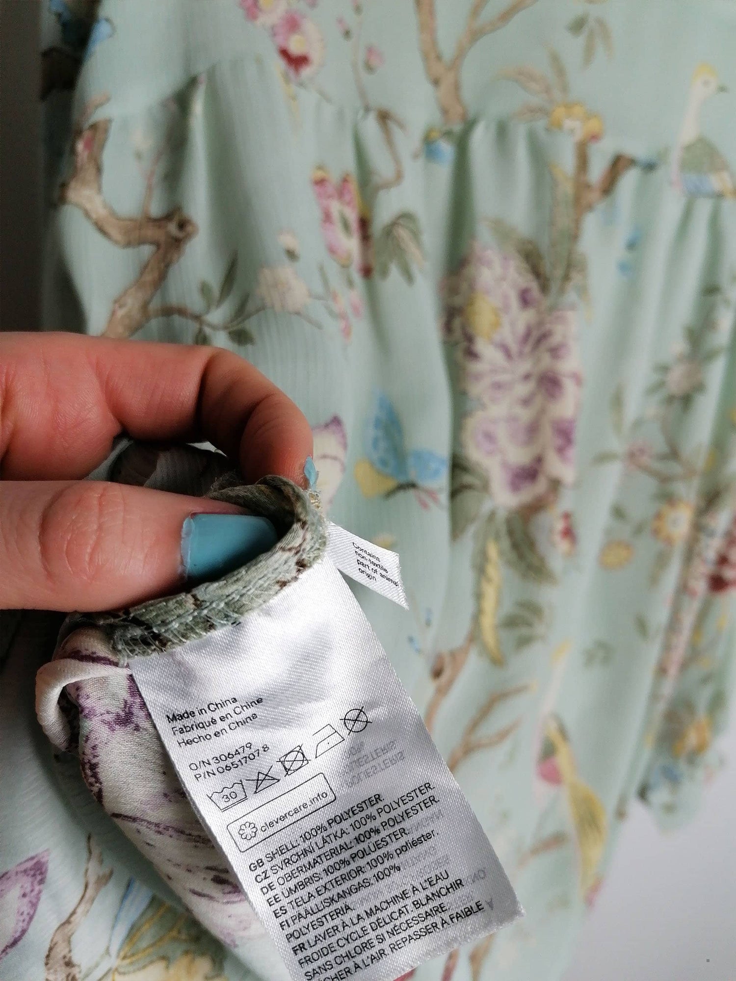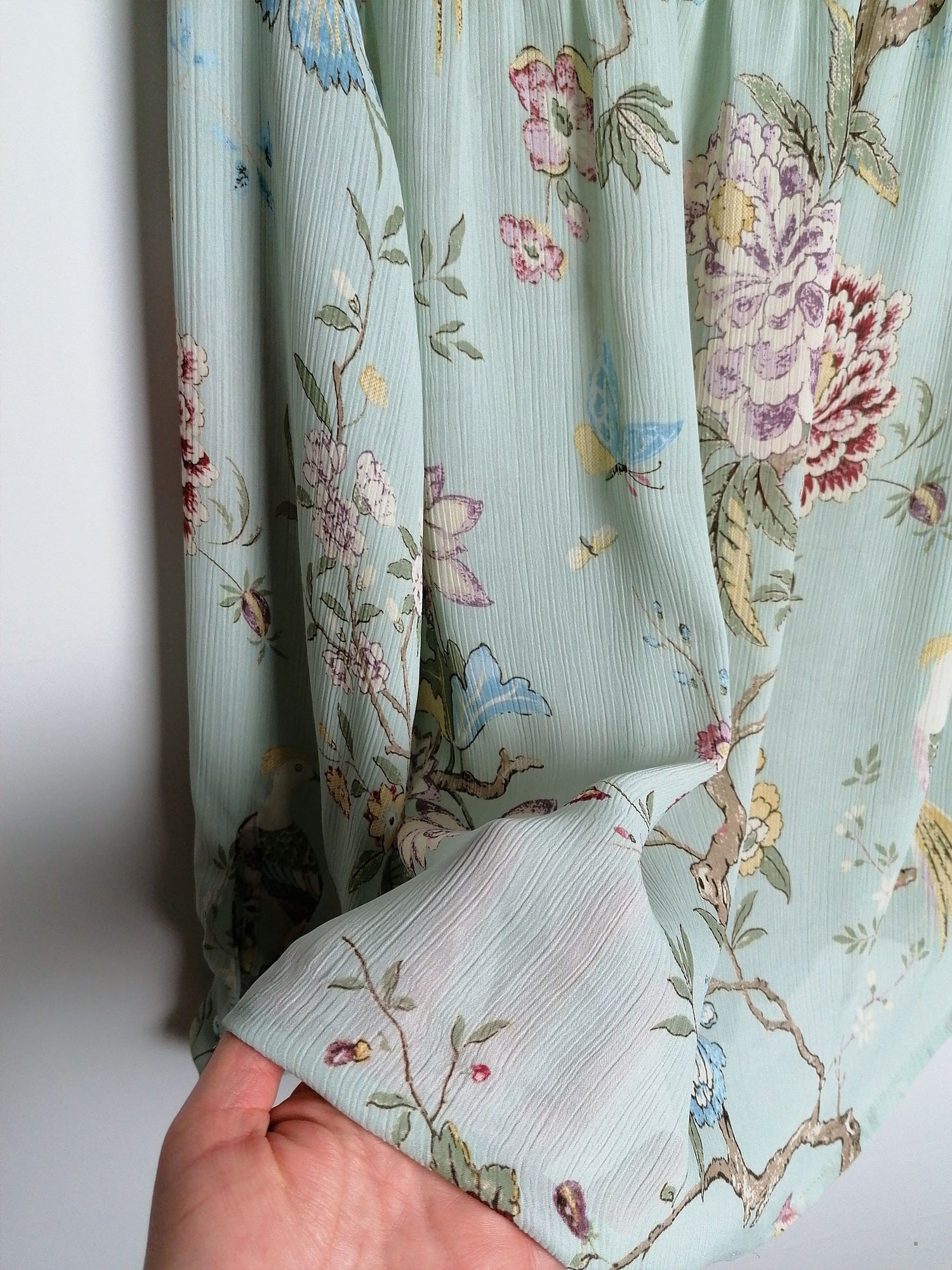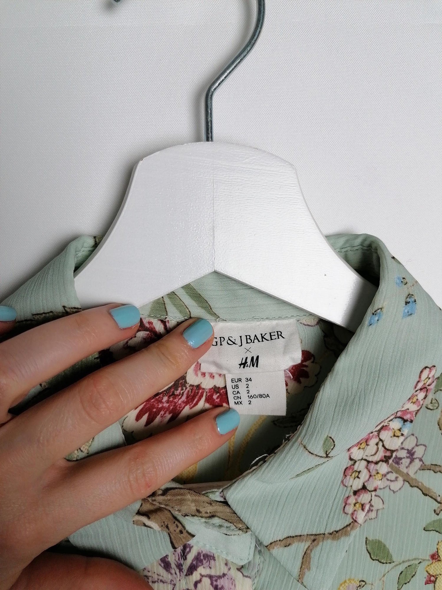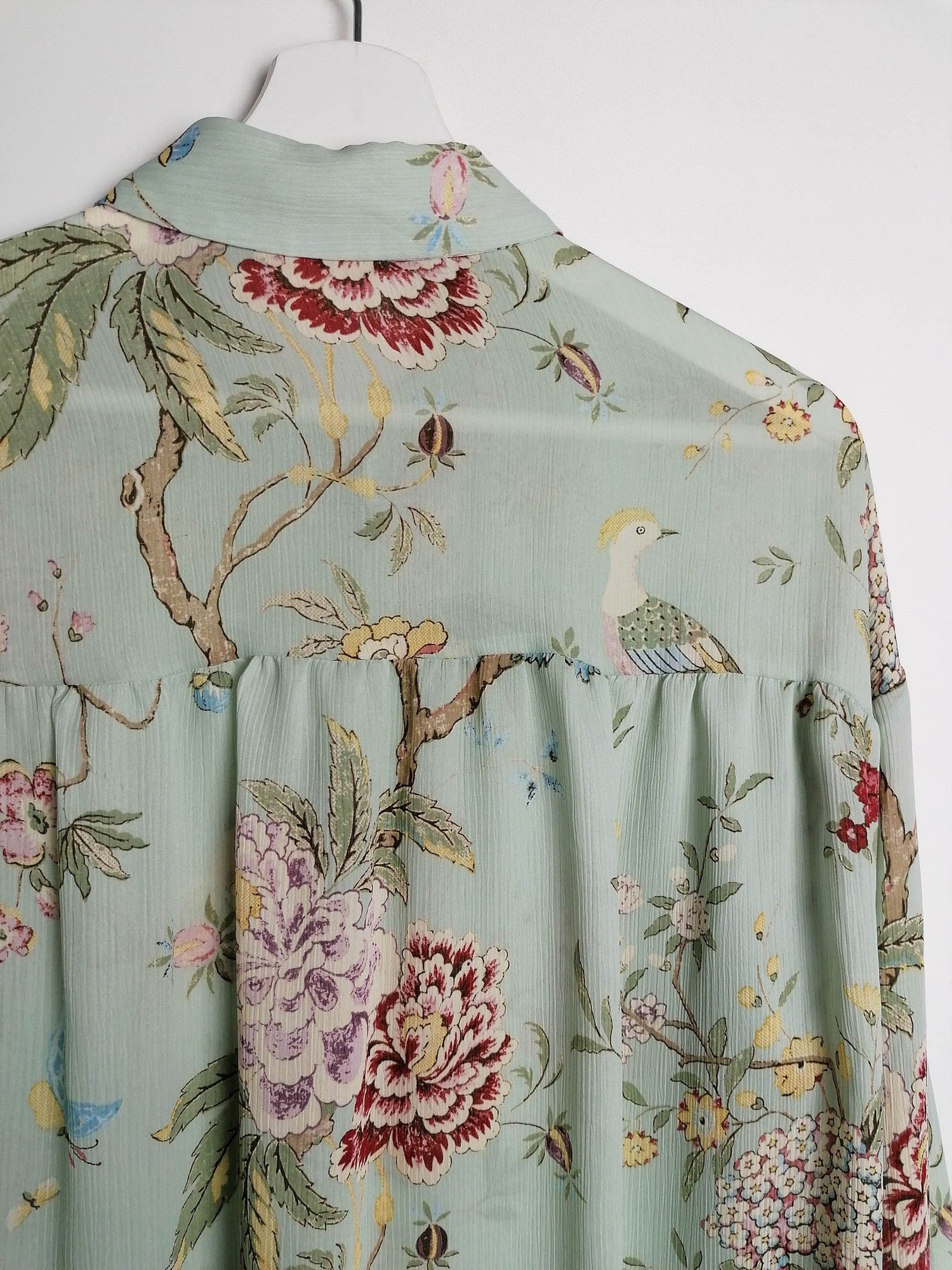 H&M x GP & J Baker 2018 collaboration button-up blouse, see-through, sea-foam green with birds and flowers print. It's not a vintage item, but very cute and breezy.