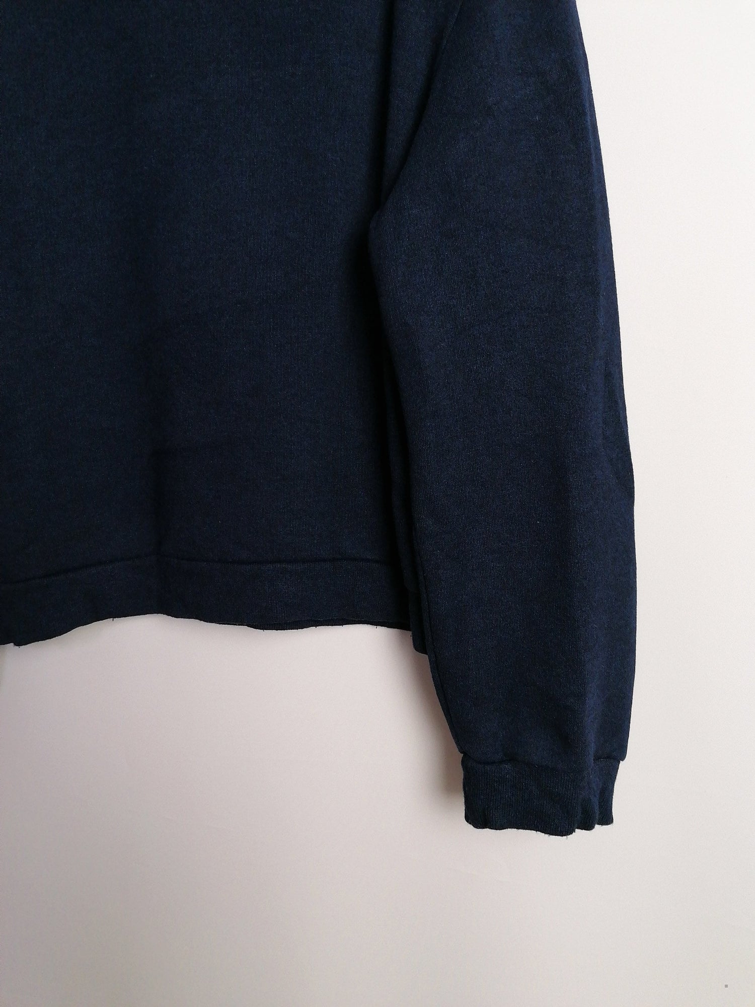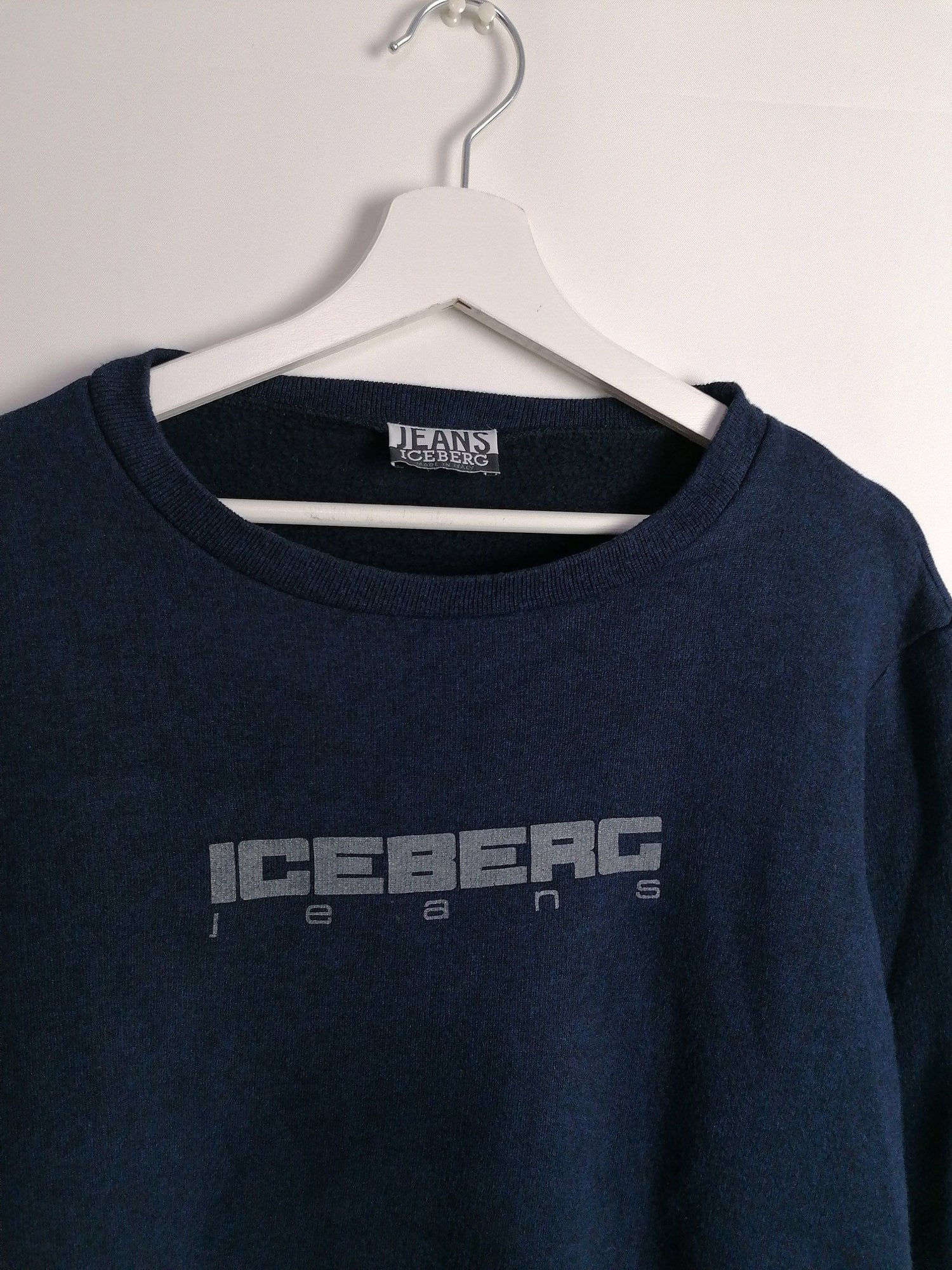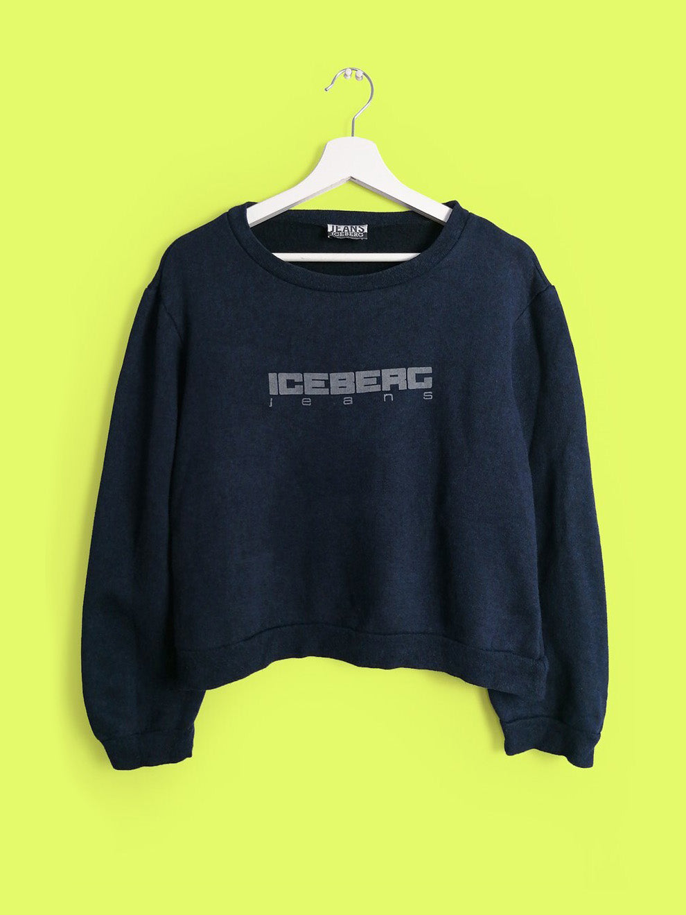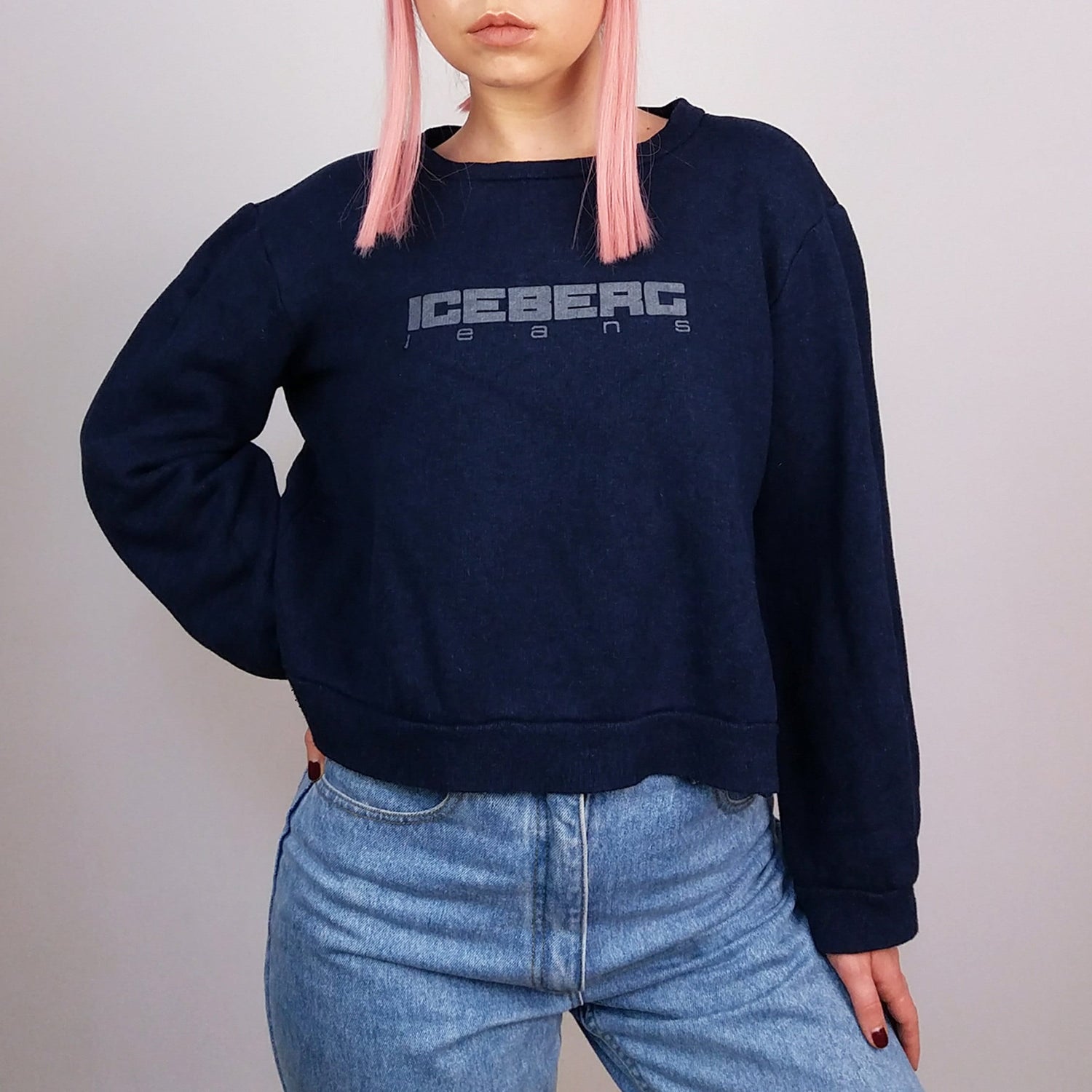 Vintage 90's ICEBERG JEANS crew-neck cropped sweatshirt, faded look spell-out front logo on navy, elastic cuffs and bottom.