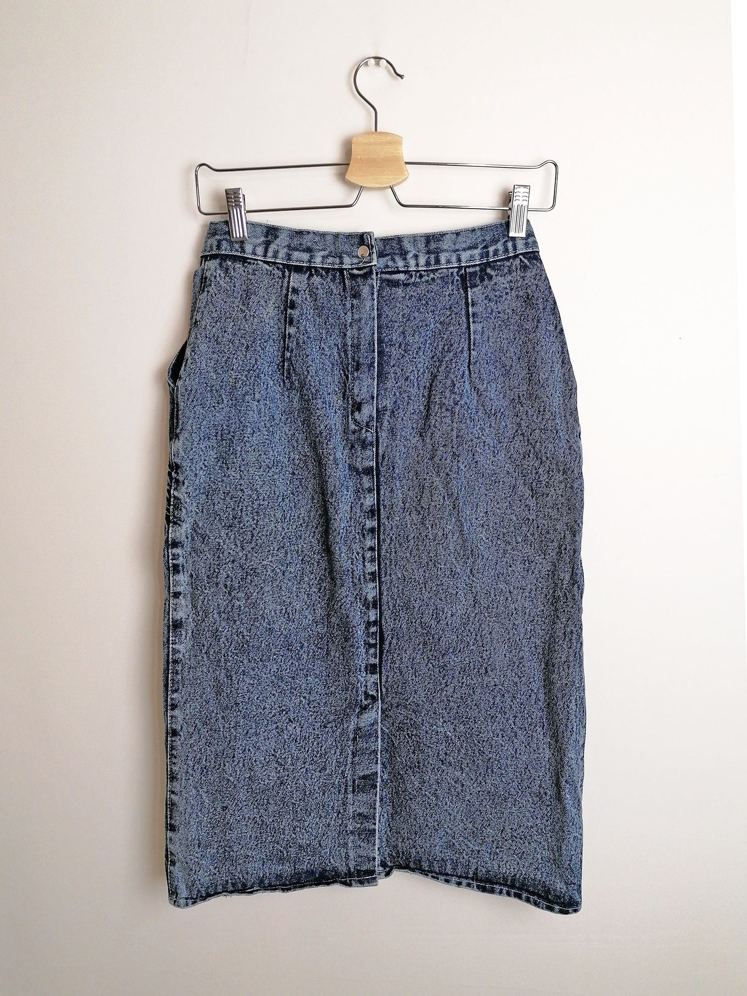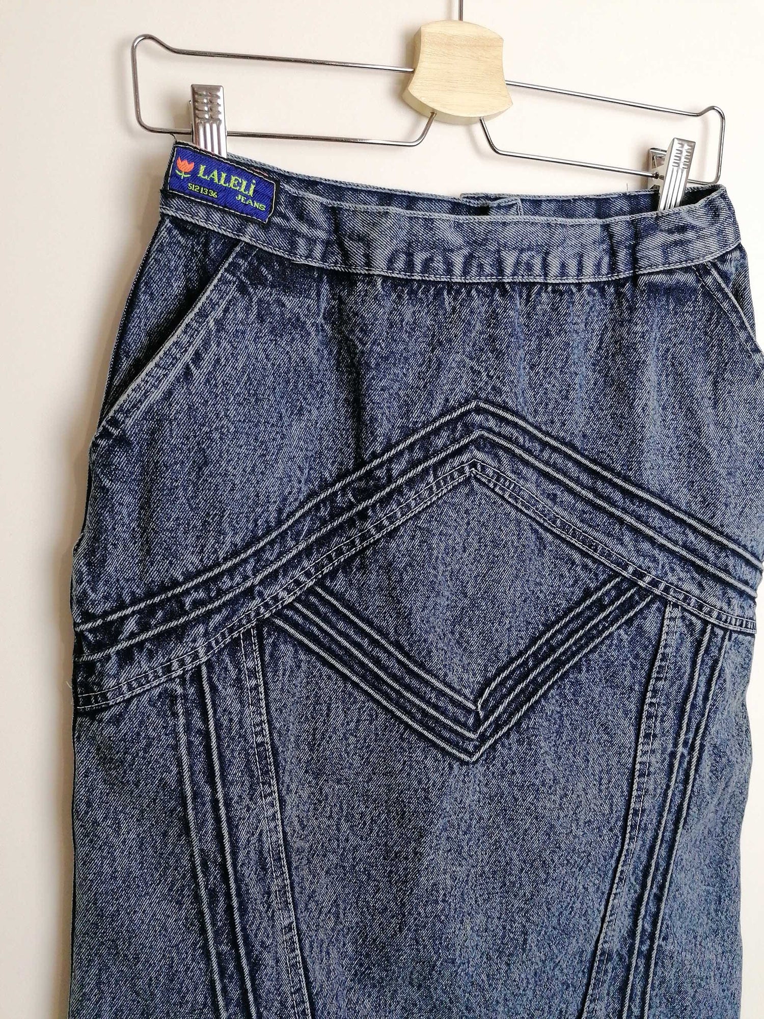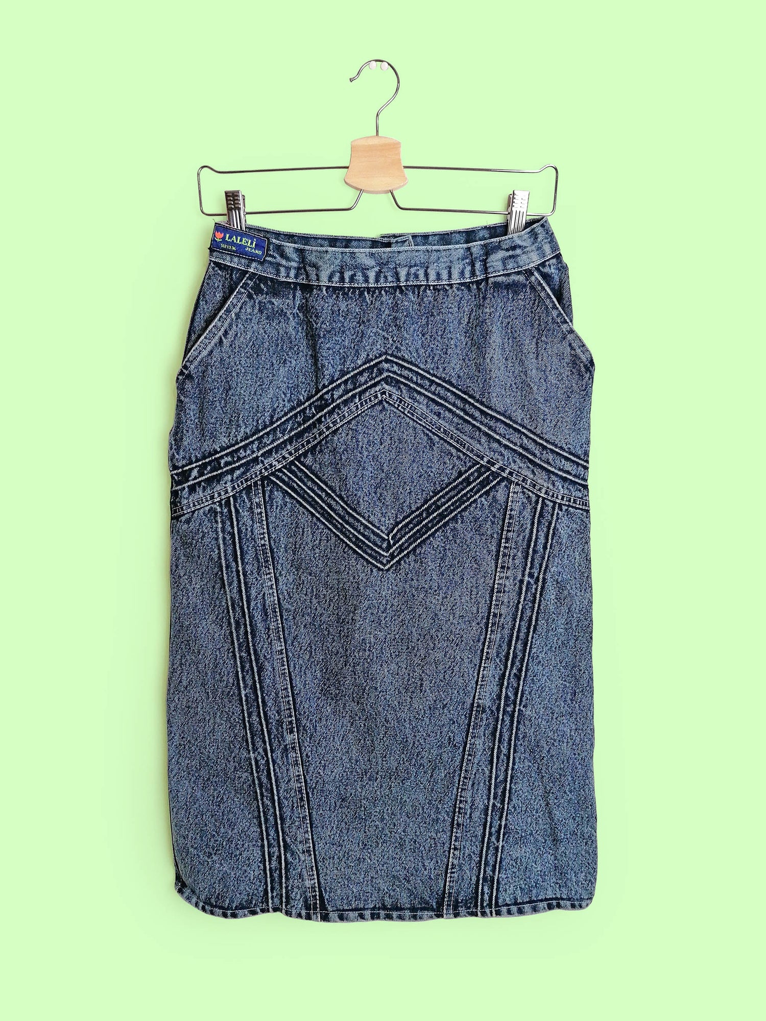 Gorgeous vintage 80's 90's acidwash high waist denim skirt, side pockets. Brand Laleli.