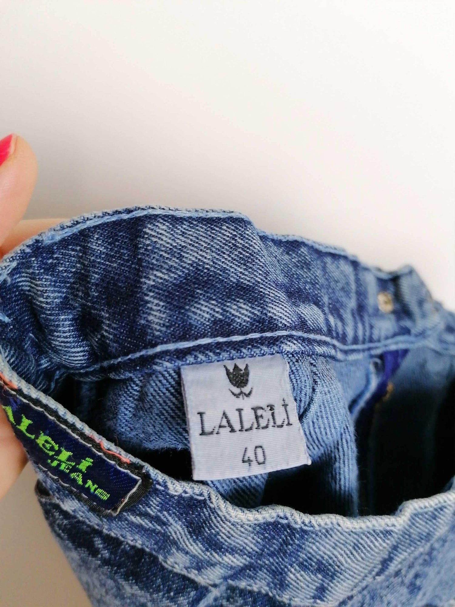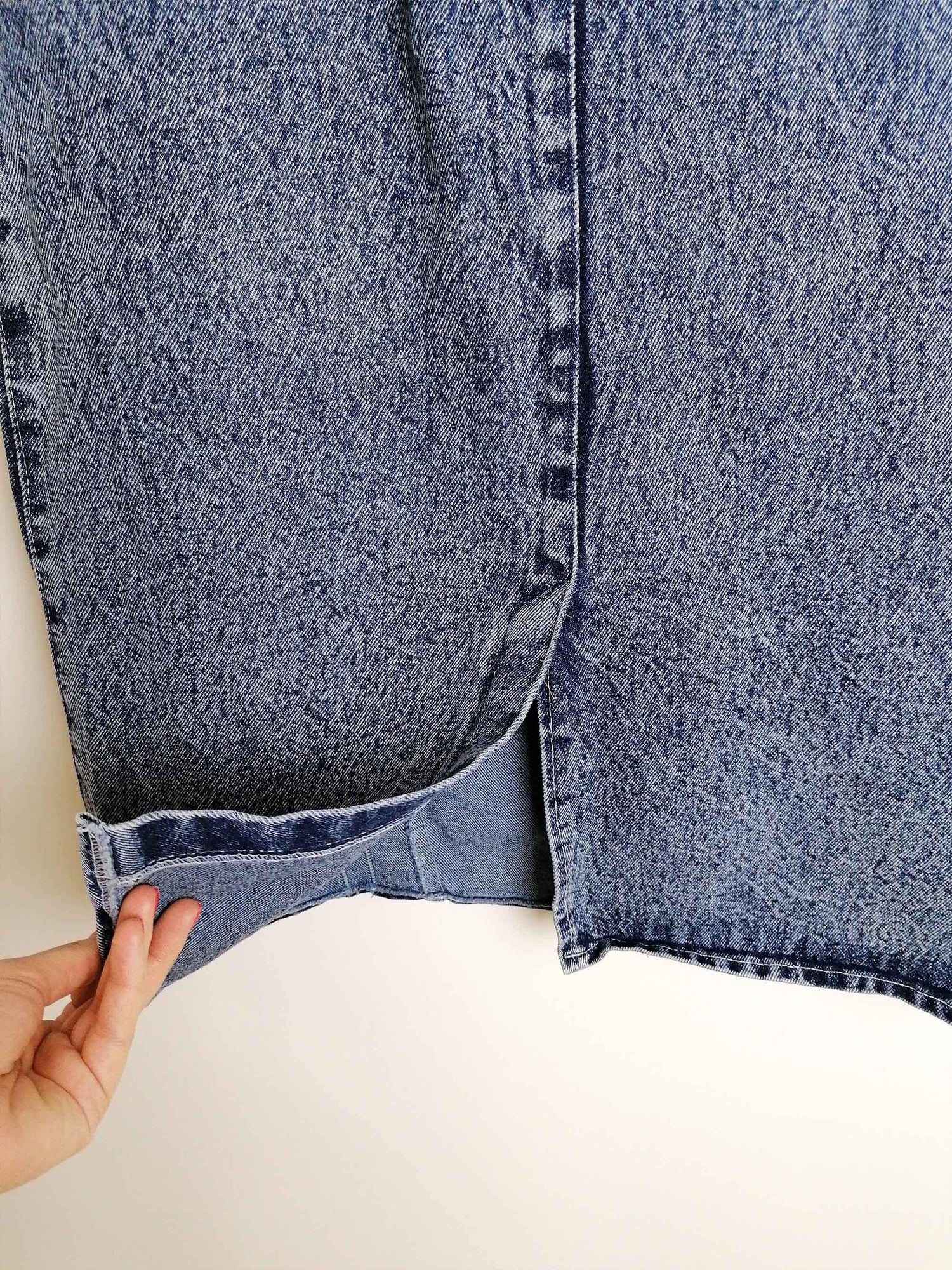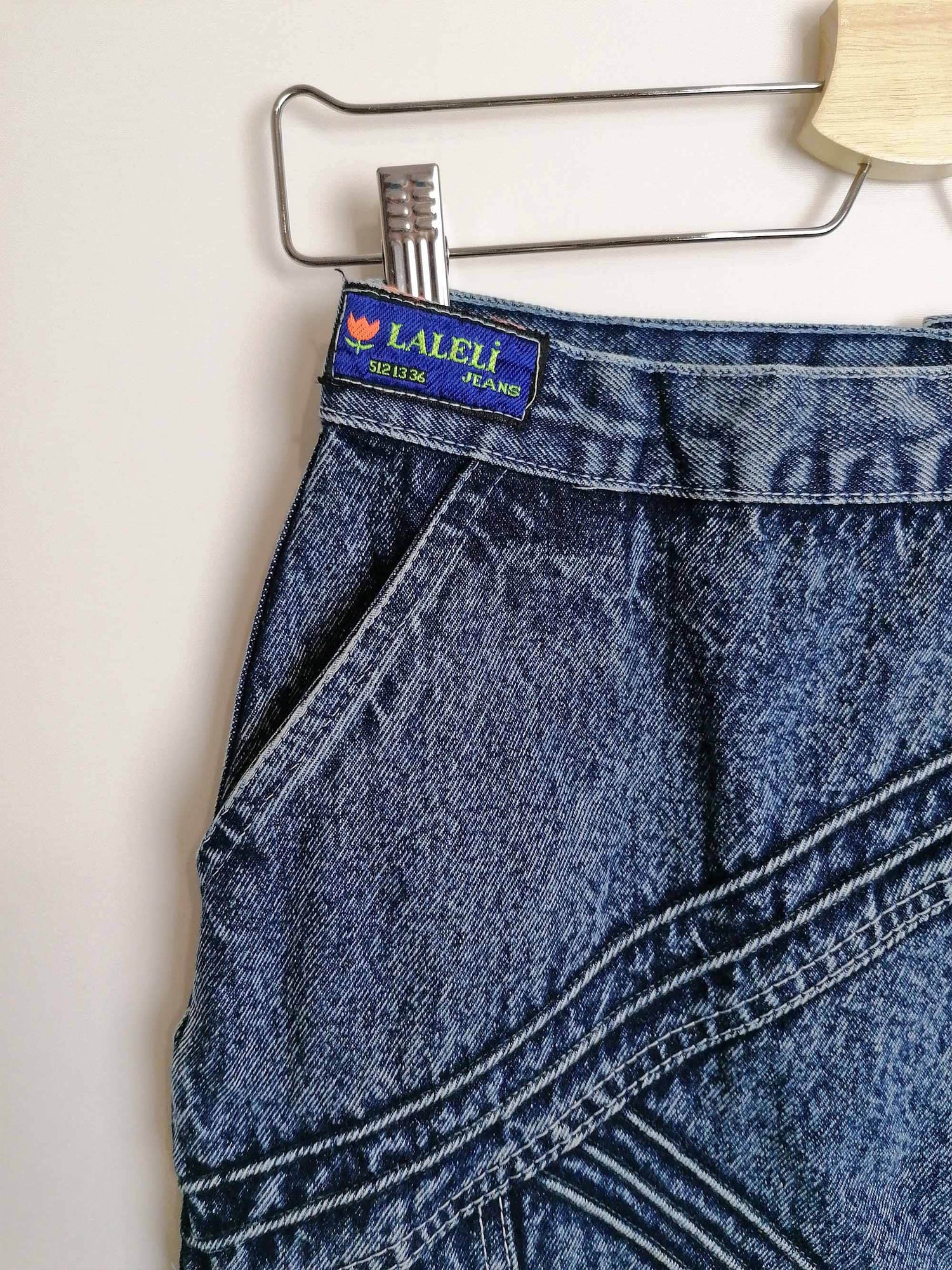 Gorgeous vintage 80's 90's acidwash high waist denim skirt, side pockets. Brand Laleli.