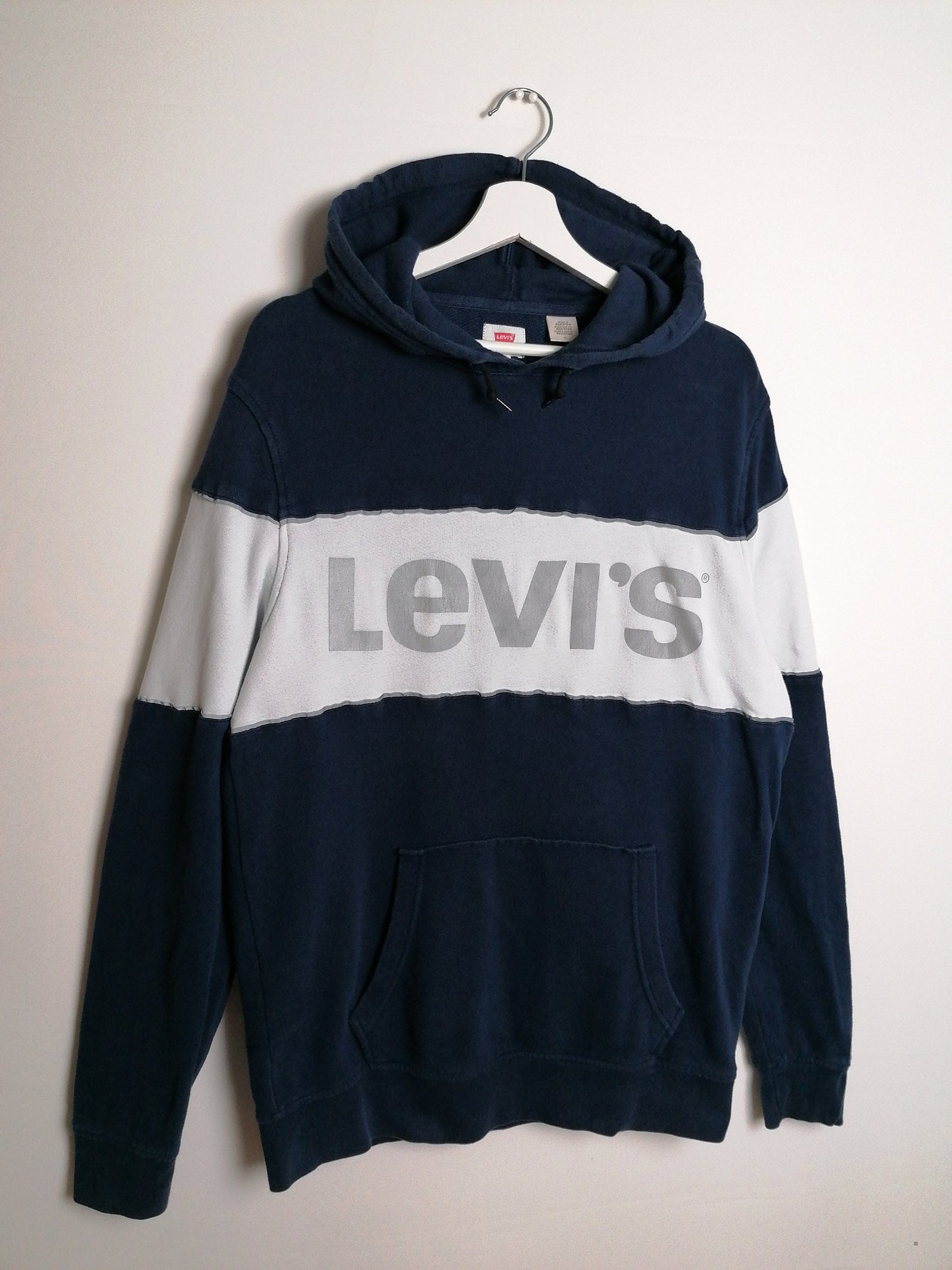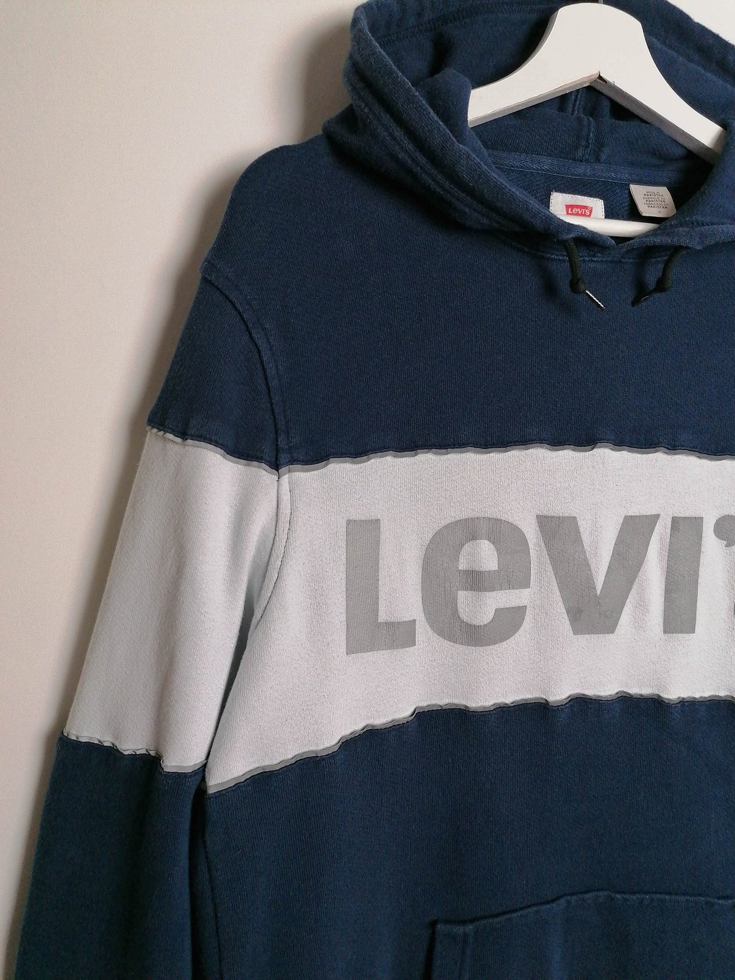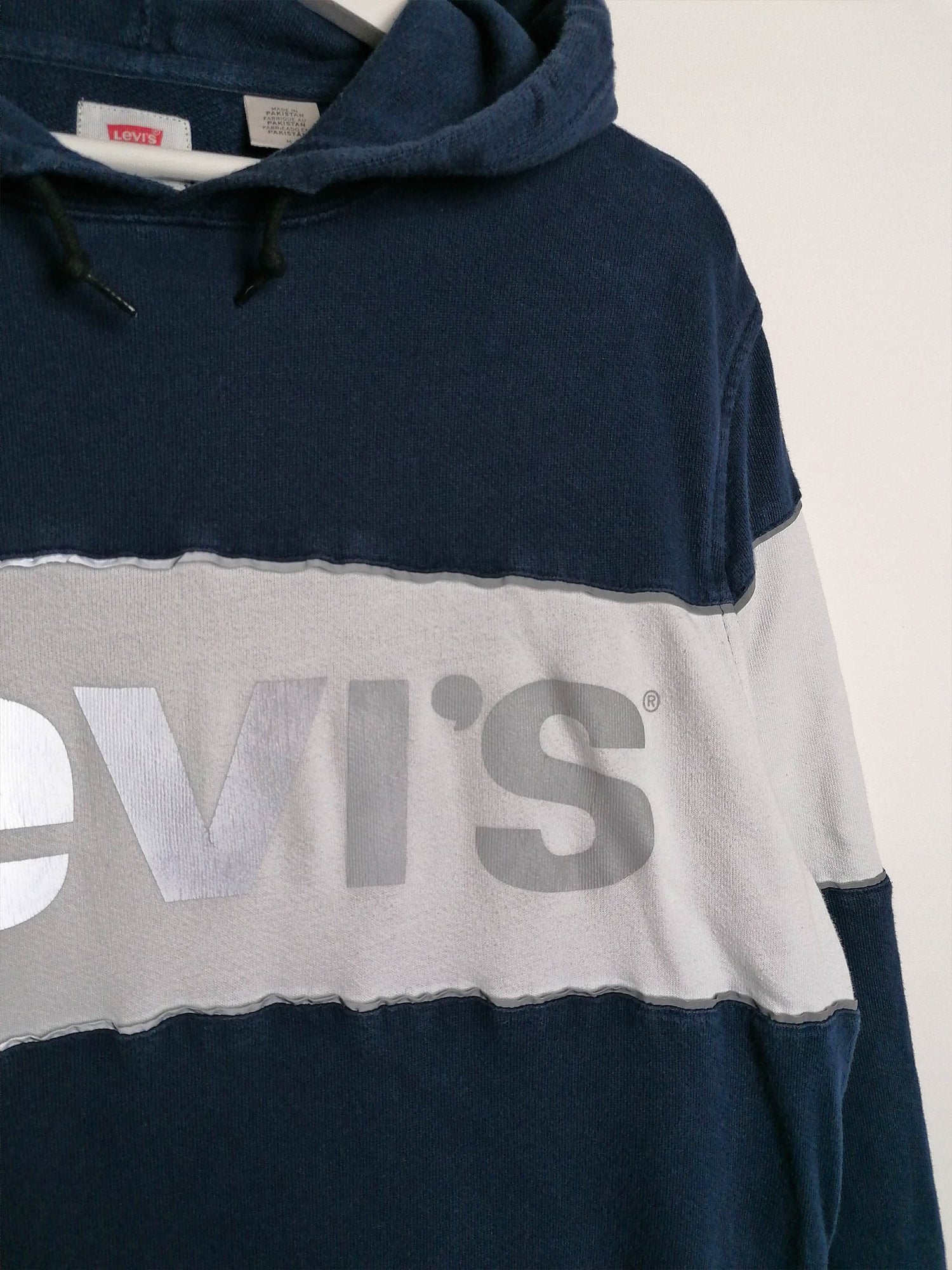 Vintage Levi's hoodie in navy with reflective logo on front, front pouch pocket, drawstring hood. Made in Pakistan.