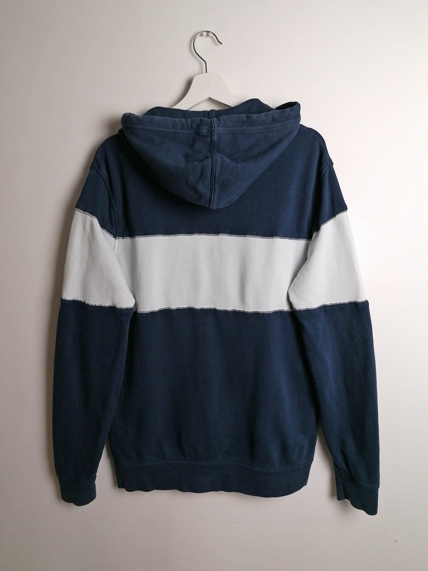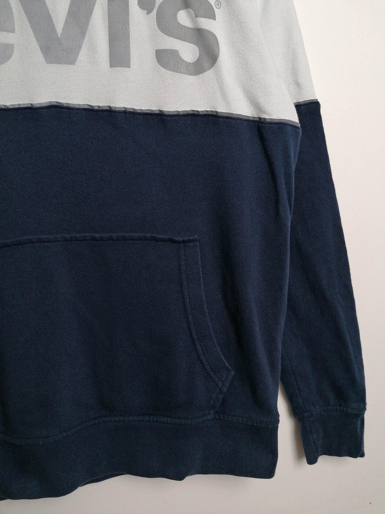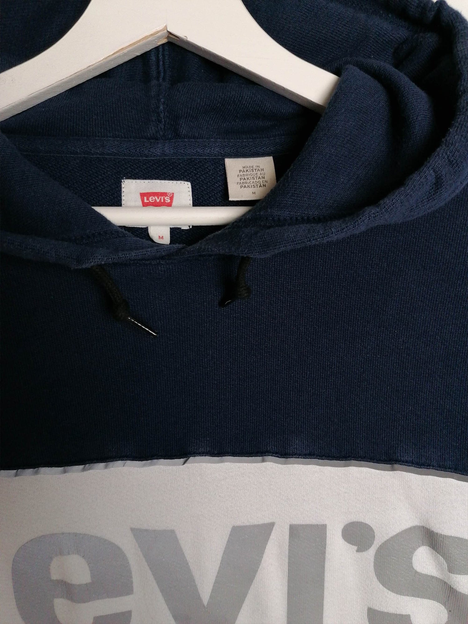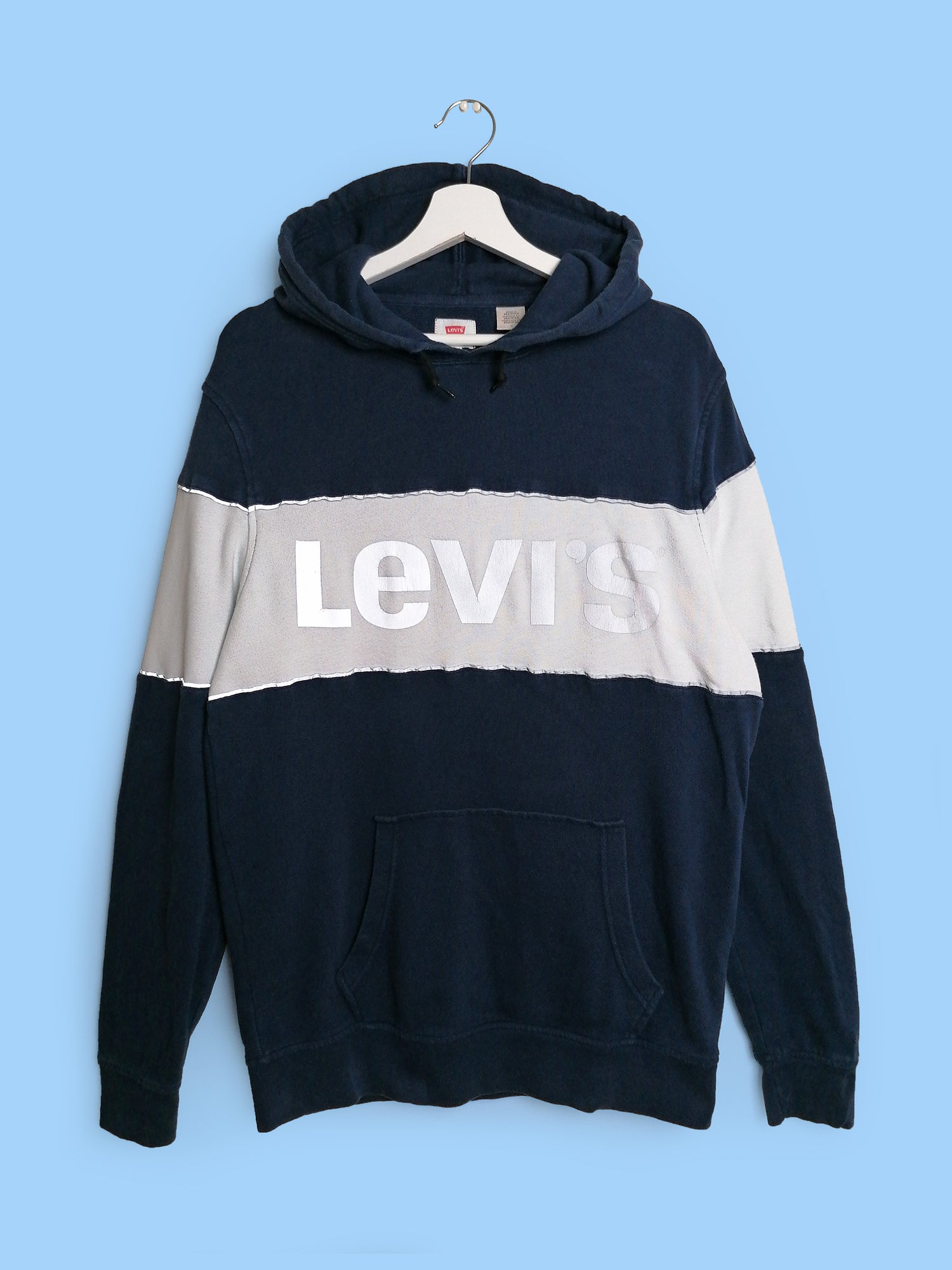 Vintage Levi's hoodie in navy with reflective logo on front, front pouch pocket, drawstring hood. Made in Pakistan.