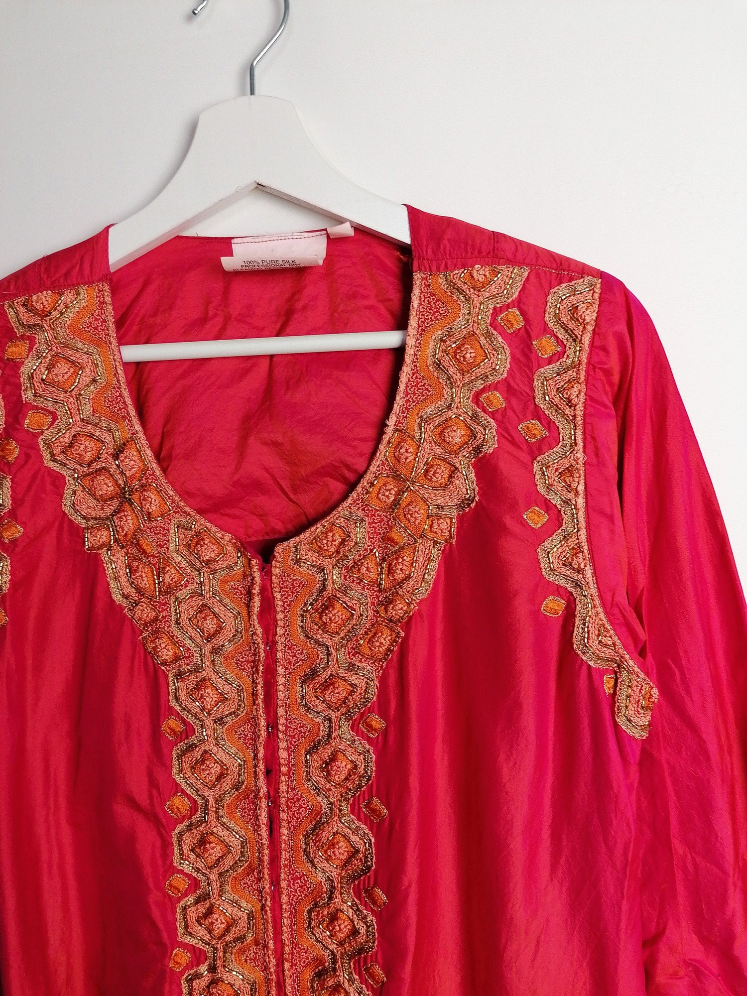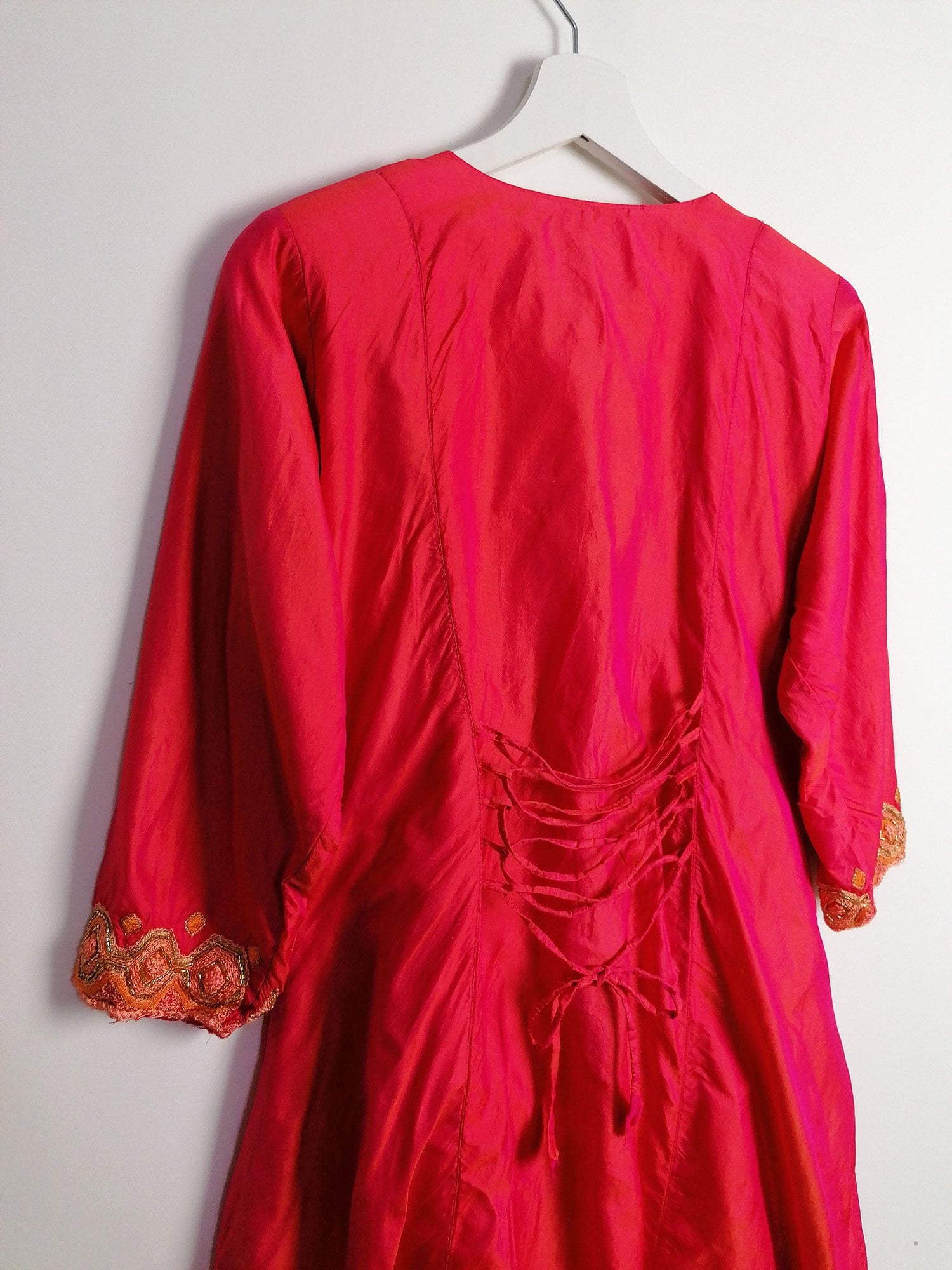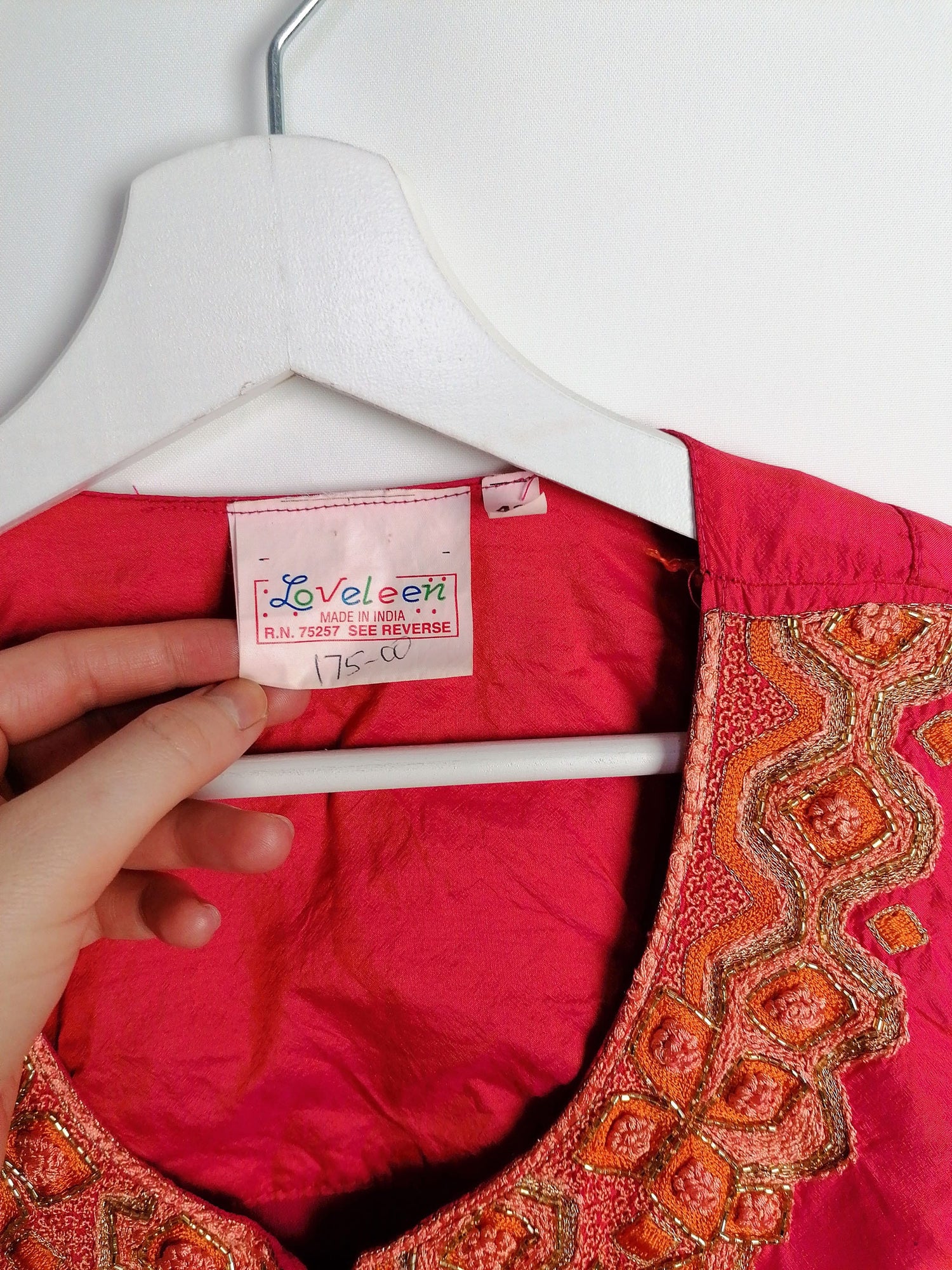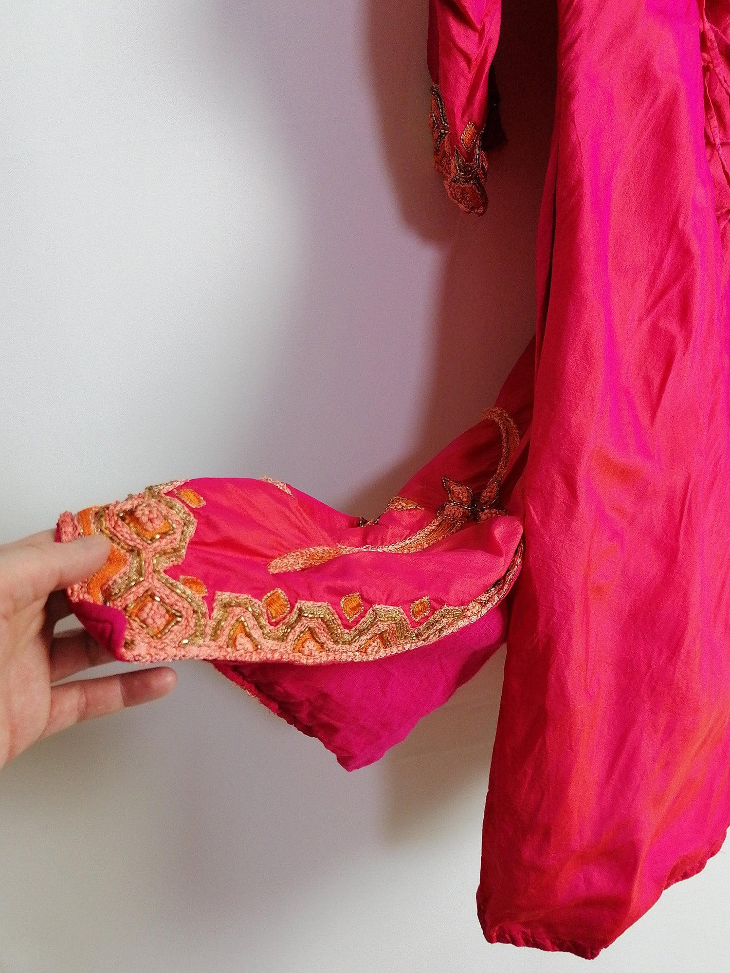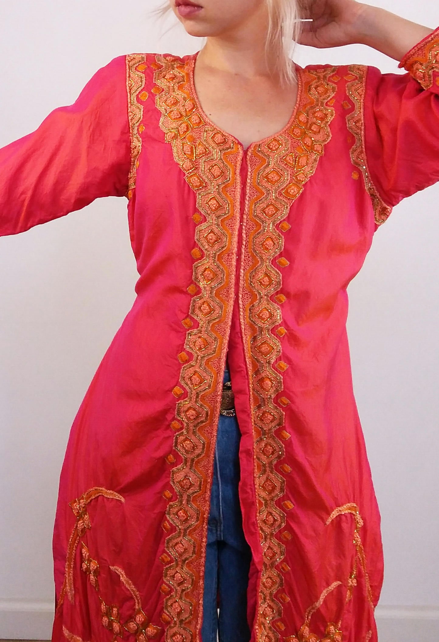 Exquisite vintage Indian kurti top, intricate beaded embroidery, stunning sunset colours pink and orange, shiny pure silk fabric. A-line cut, side slits, corset-like back, hook-and-eye front closure. Fully lined, slightly padded shoulders.