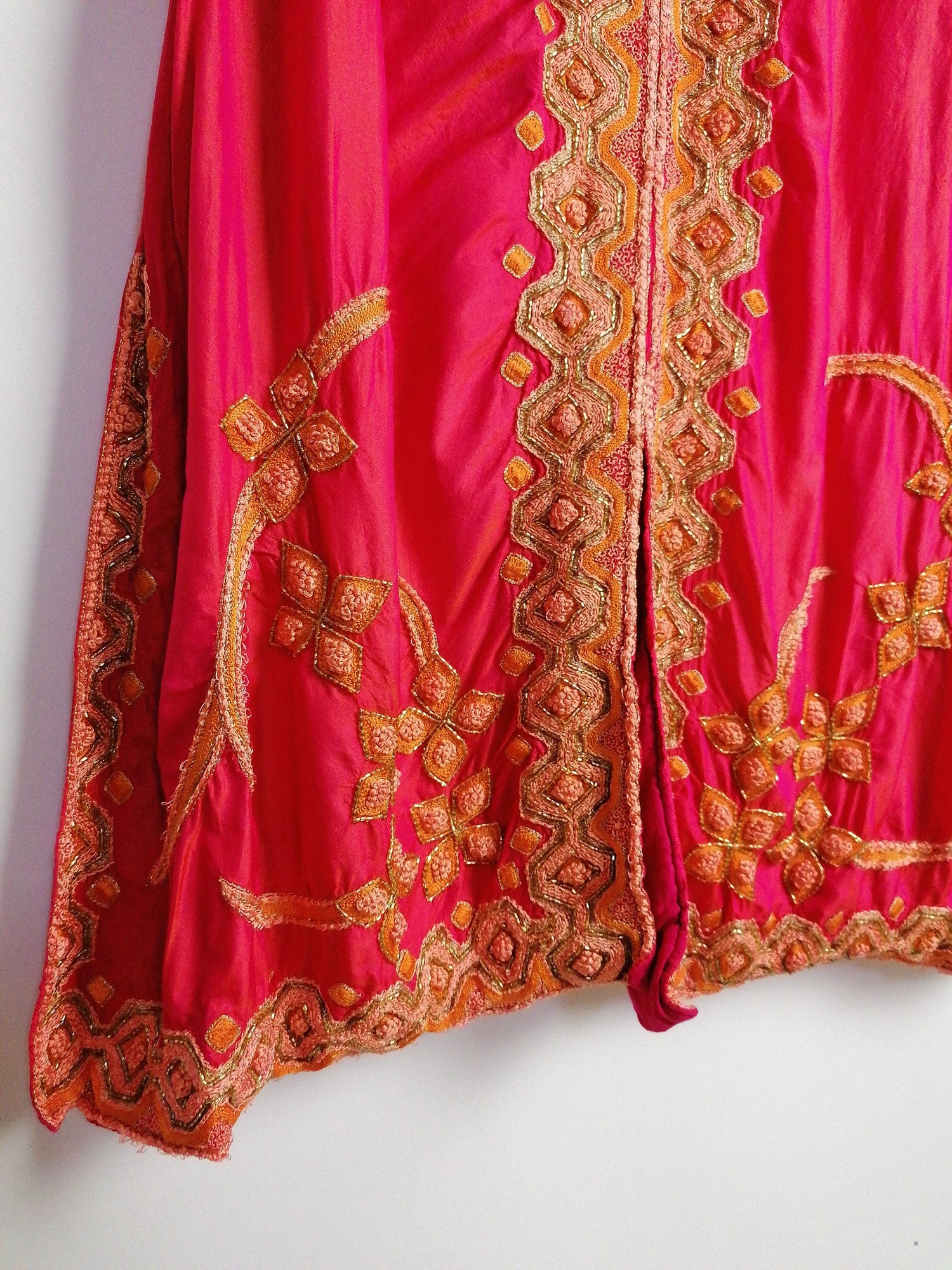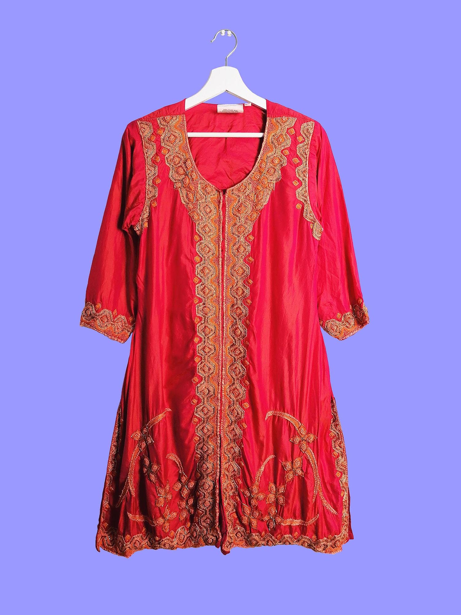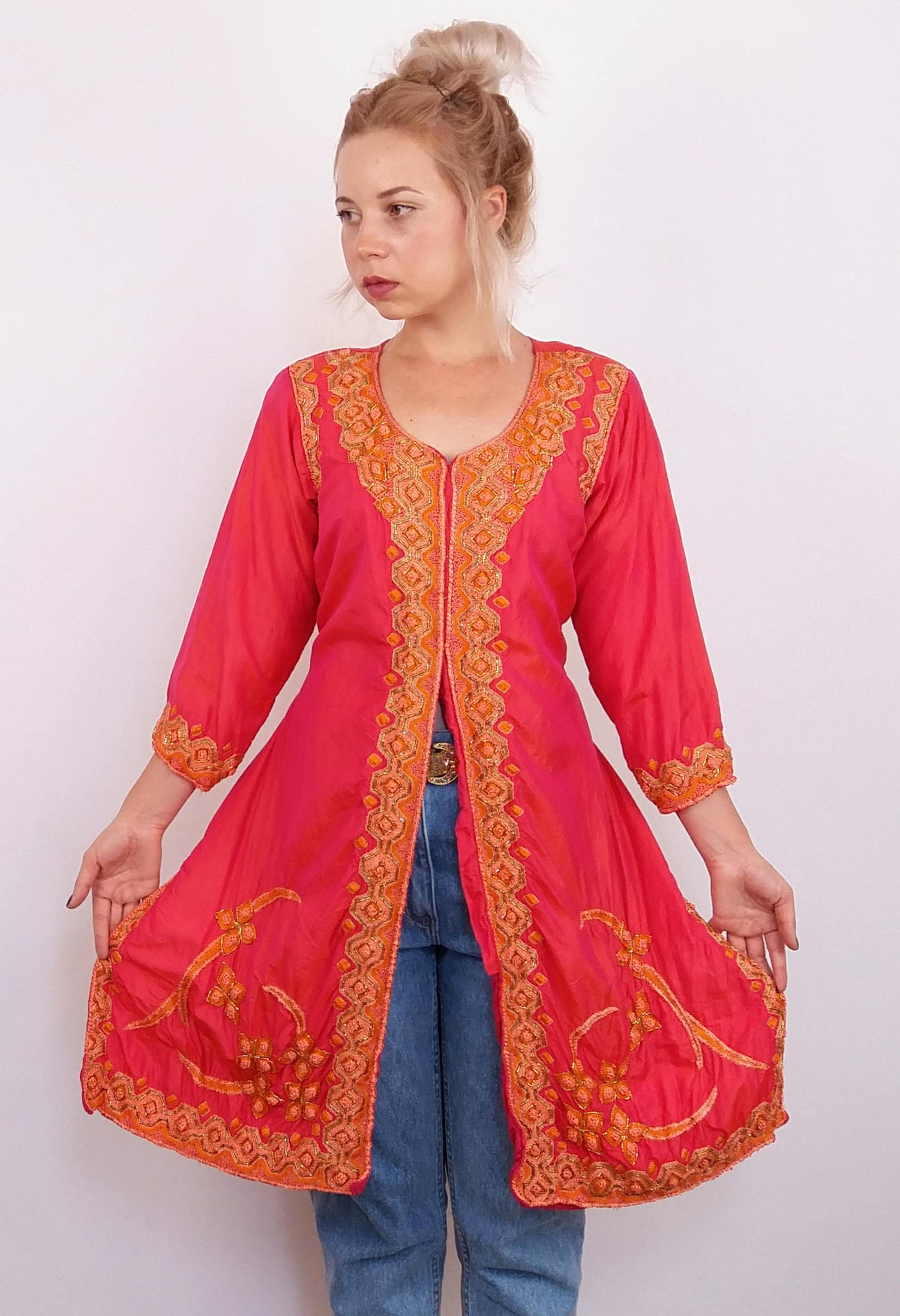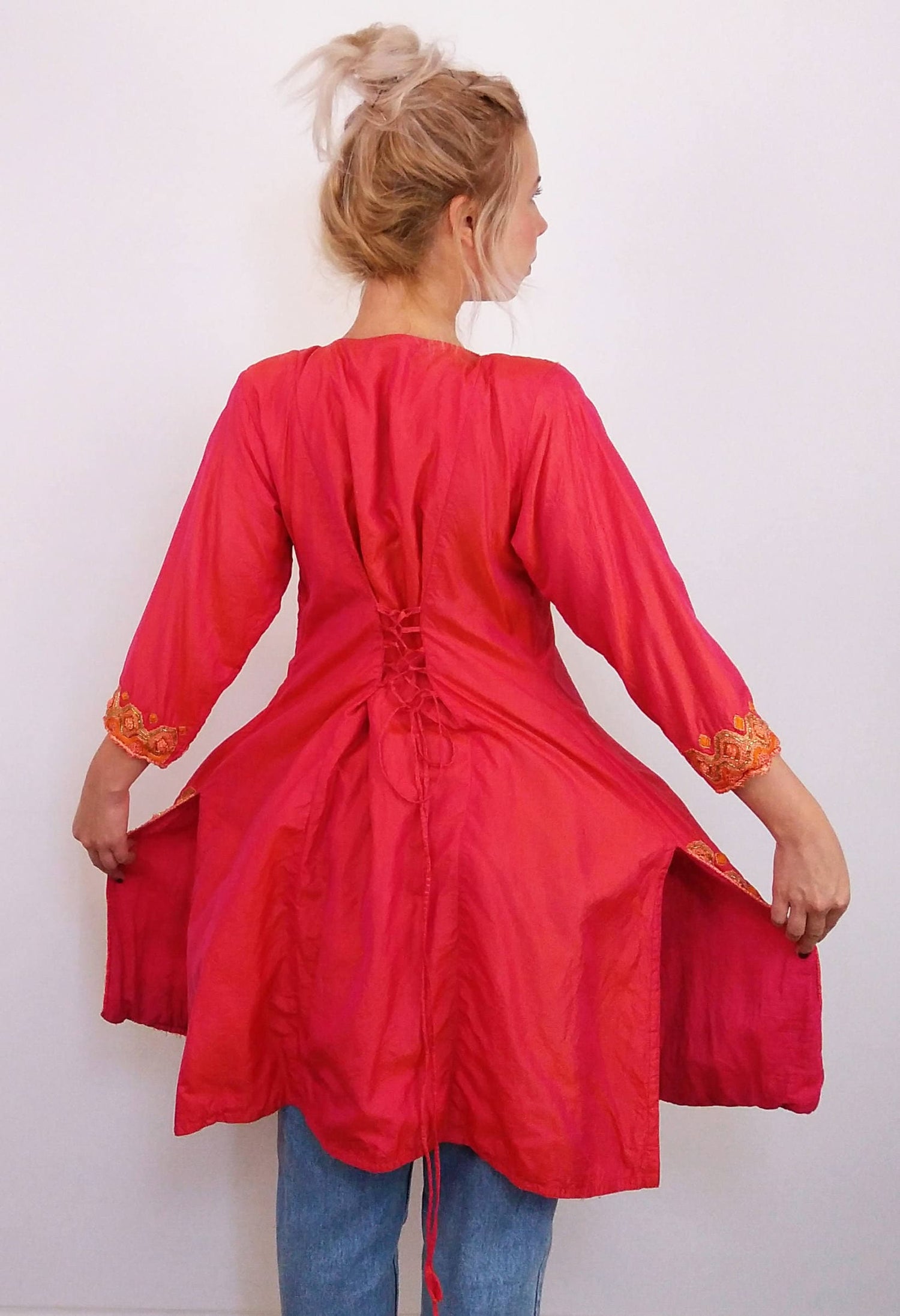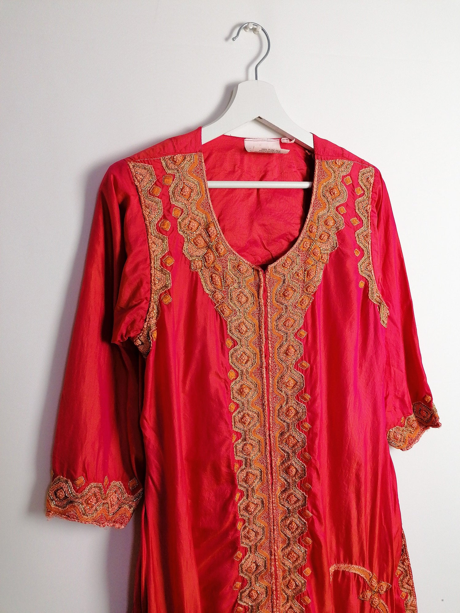 Exquisite vintage Indian kurti top, intricate beaded embroidery, stunning sunset colours pink and orange, shiny pure silk fabric. A-line cut, side slits, corset-like back, hook-and-eye front closure. Fully lined, slightly padded shoulders.