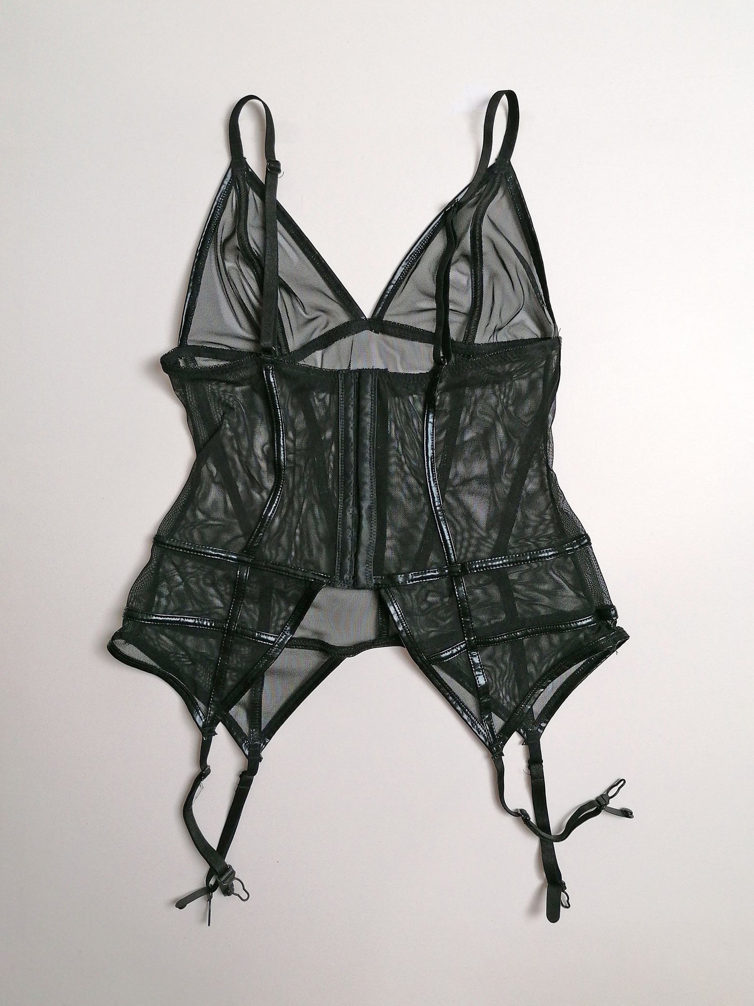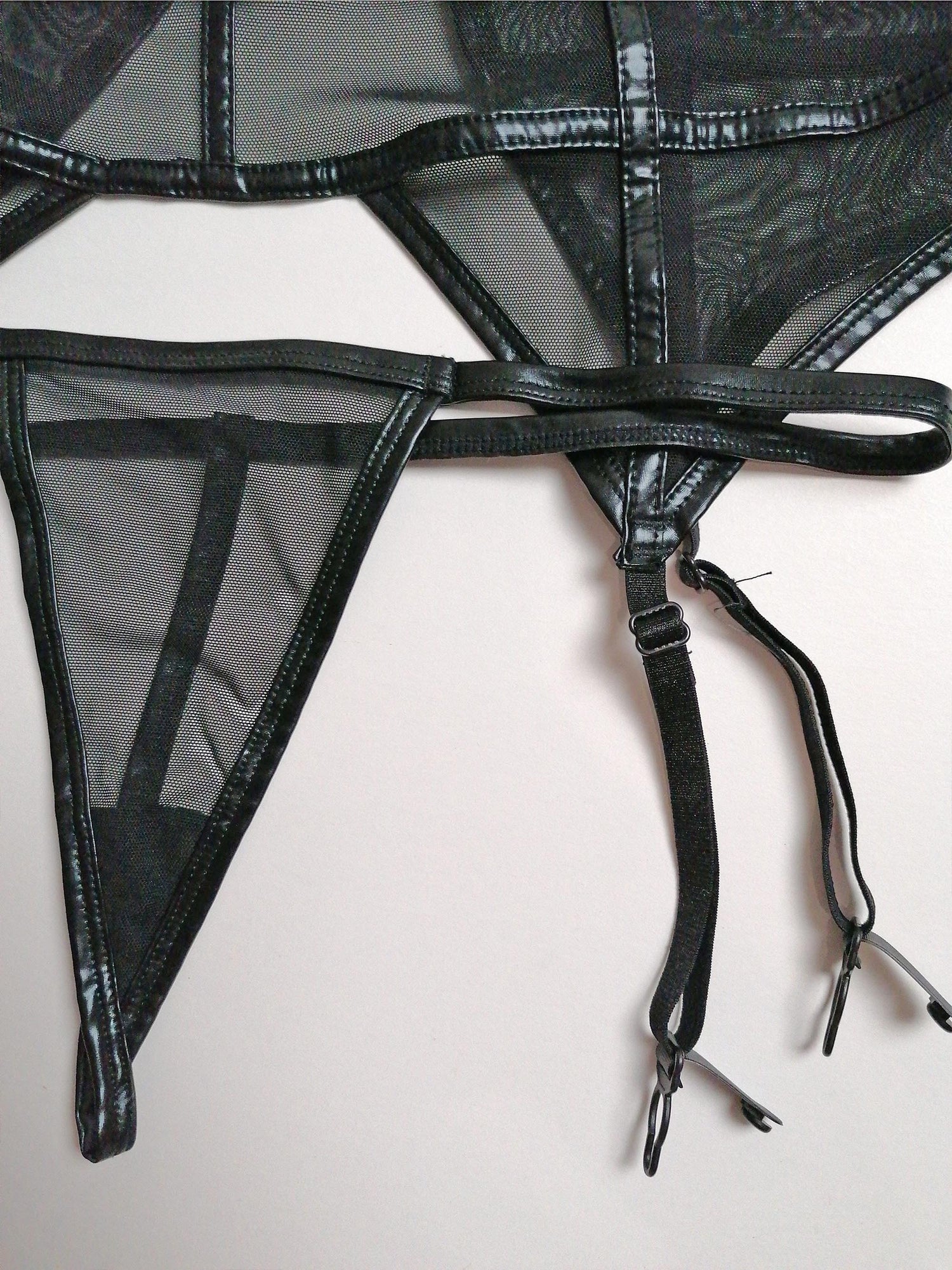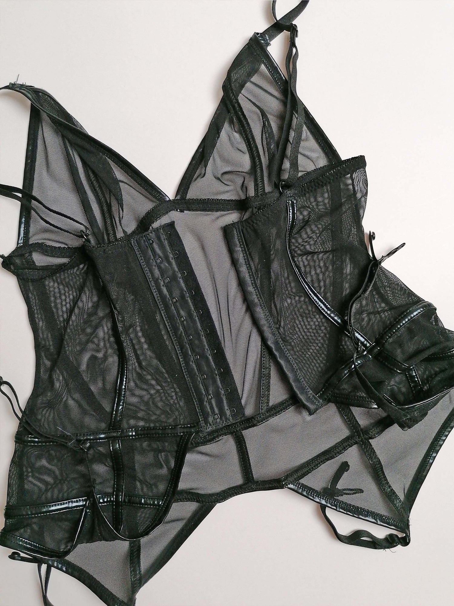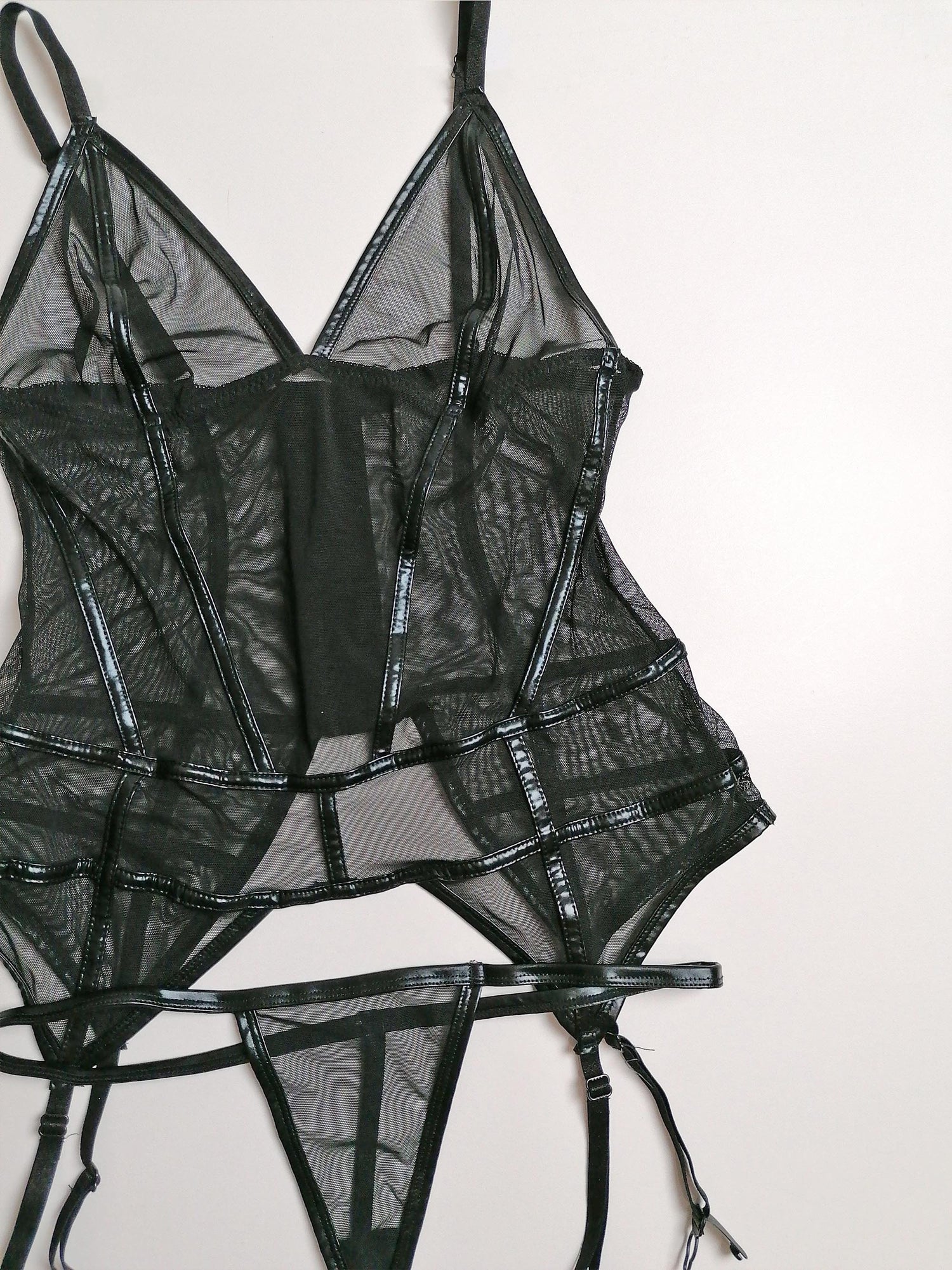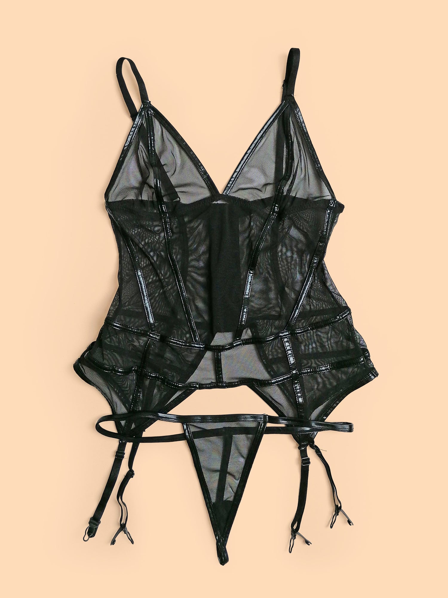 Mesh Corset Top and Thong Black Lingerie Set - size S-M