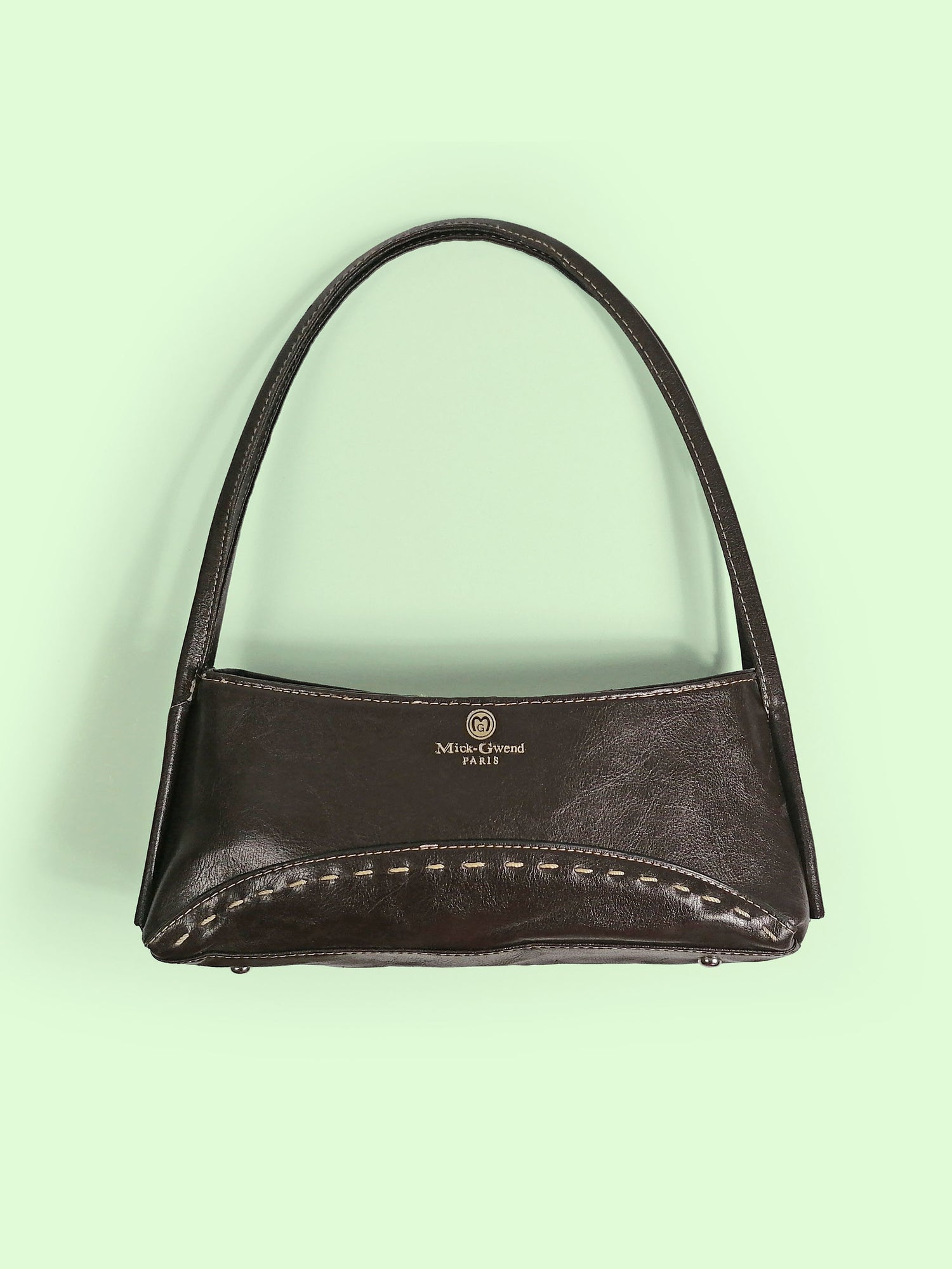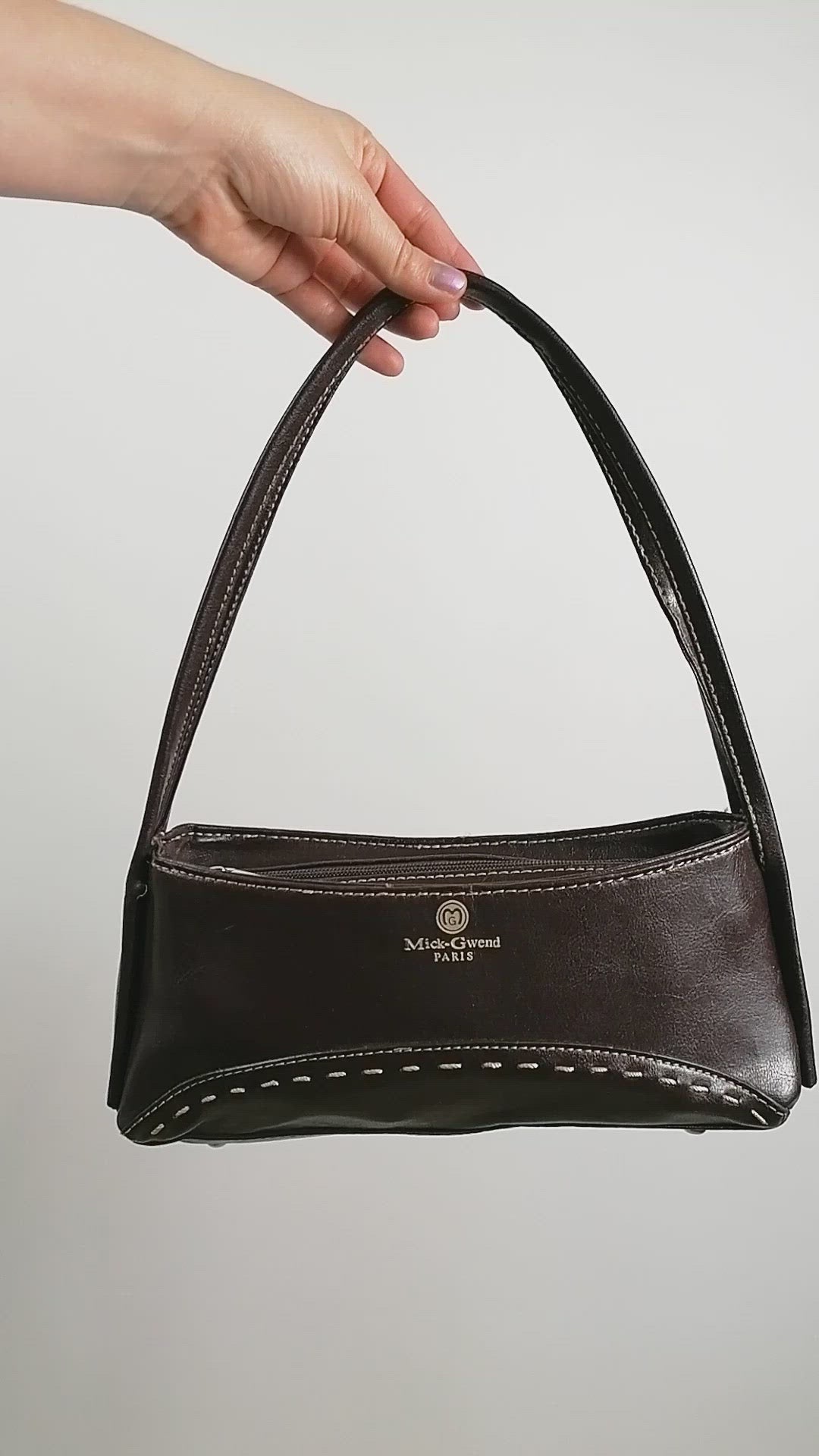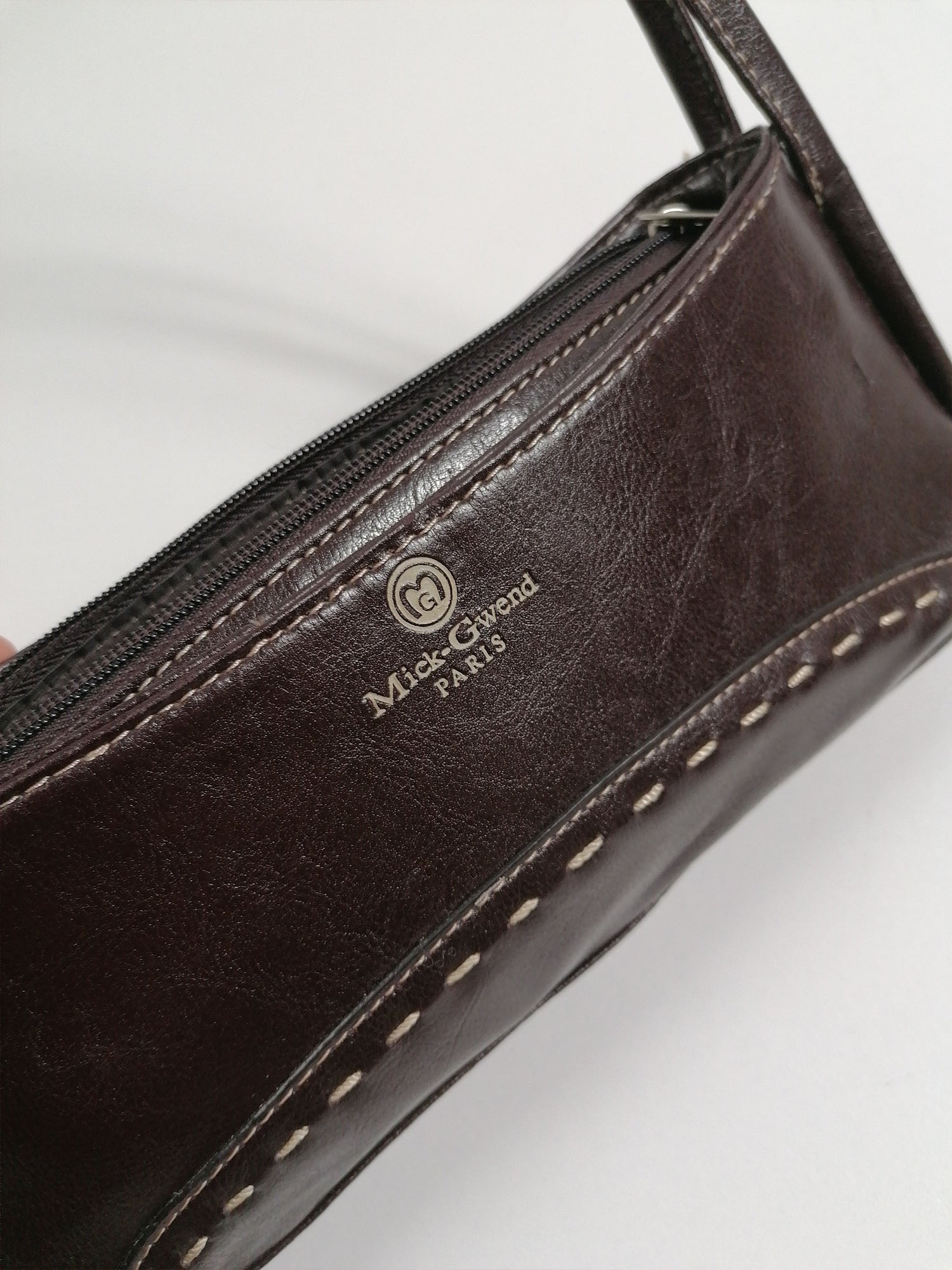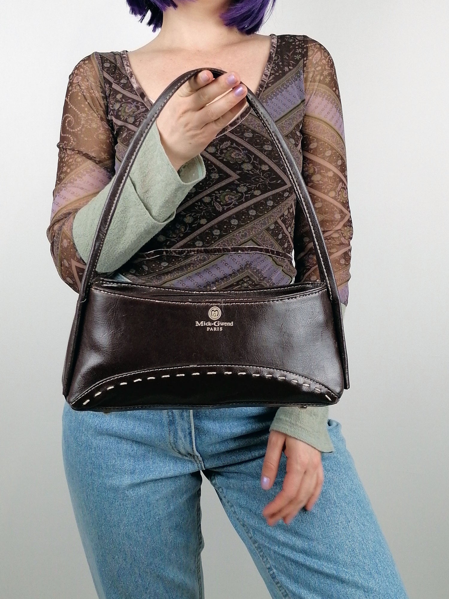 MICK GWEND vintage Y2K small baguette bag, faux leather, brown with cream stitching.