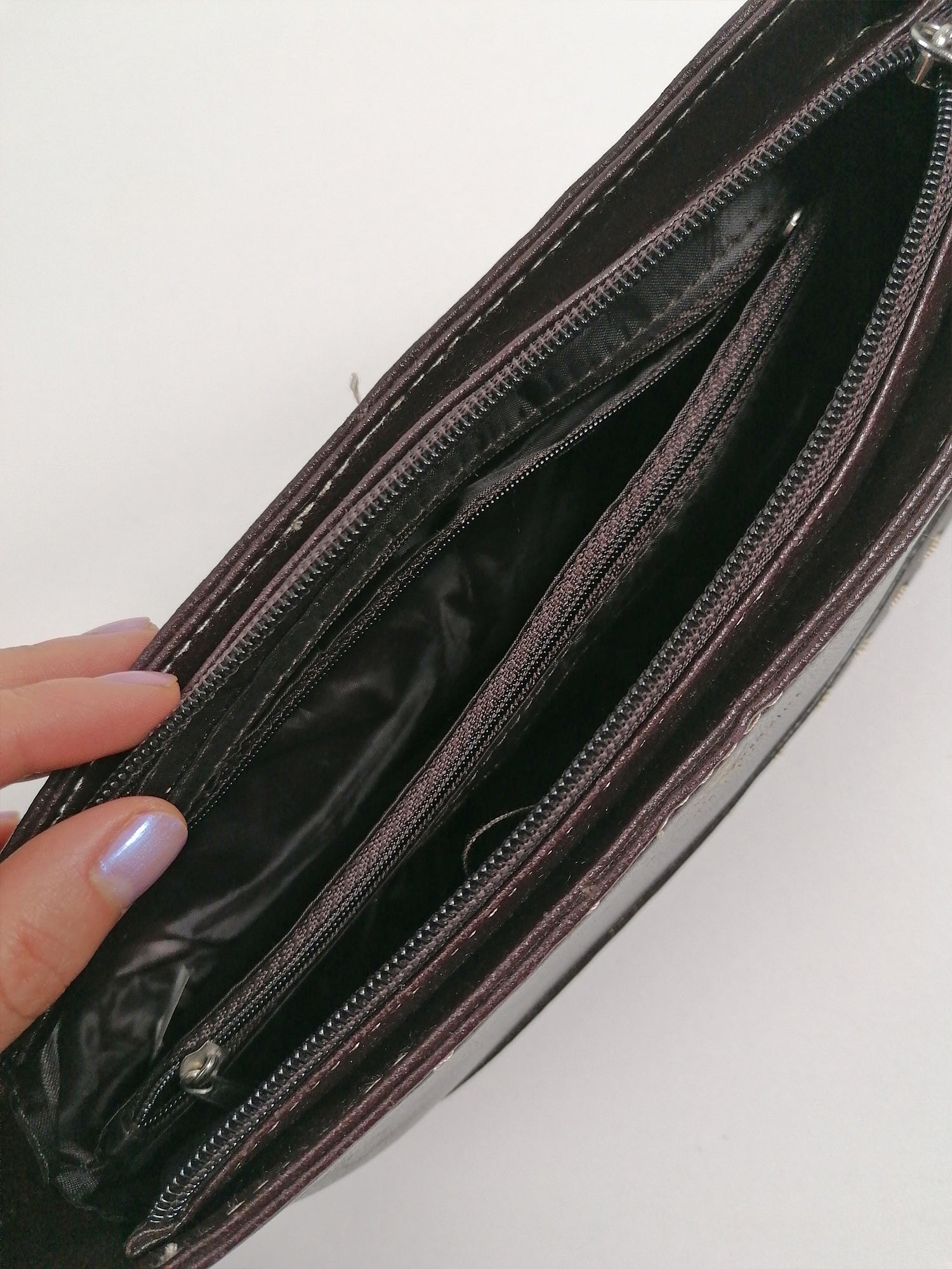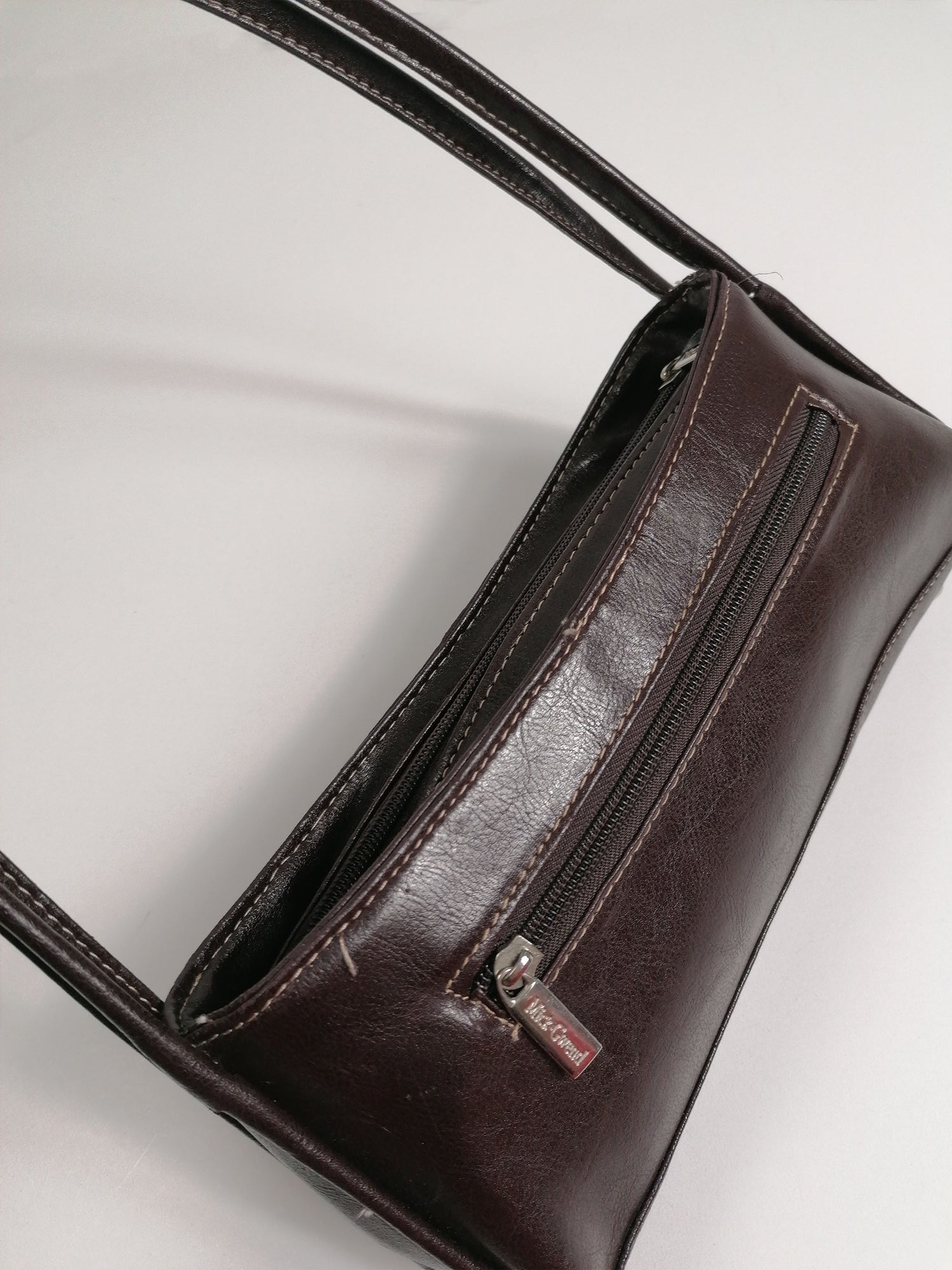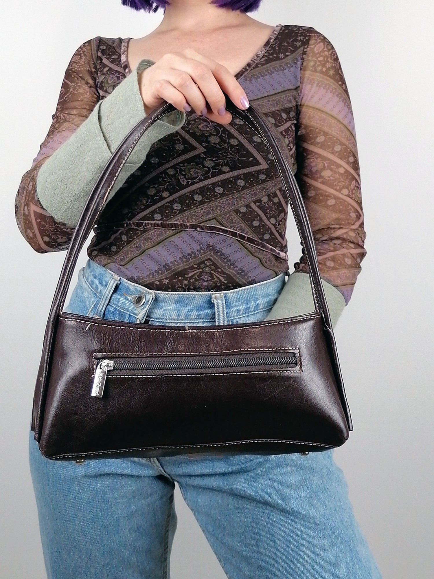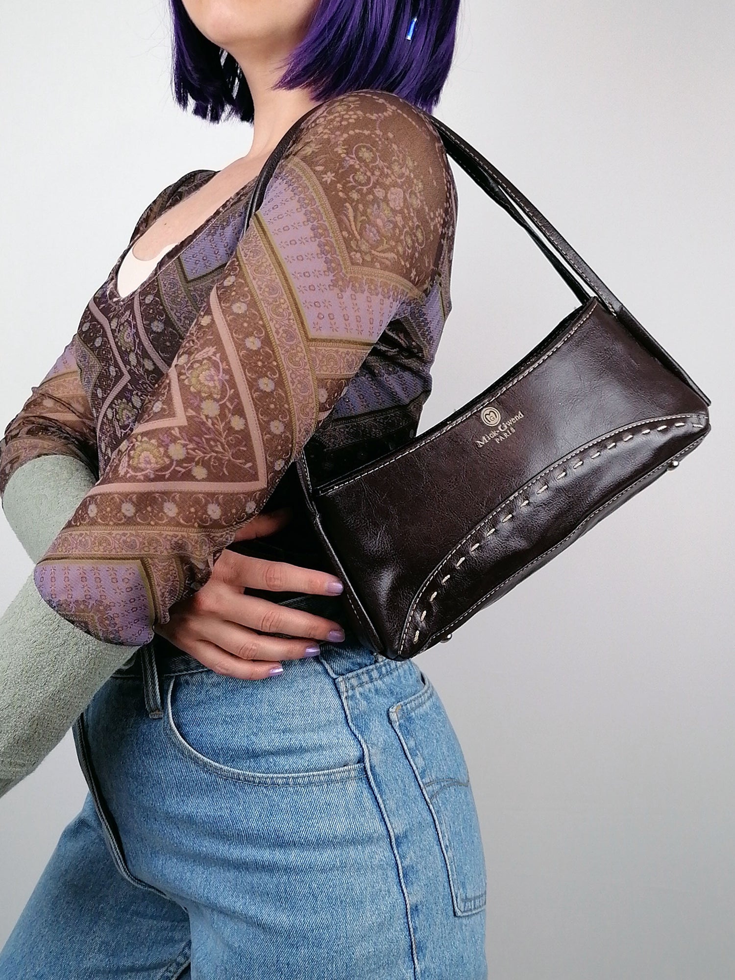 MICK GWEND vintage Y2K small baguette bag, faux leather, brown with cream stitching.