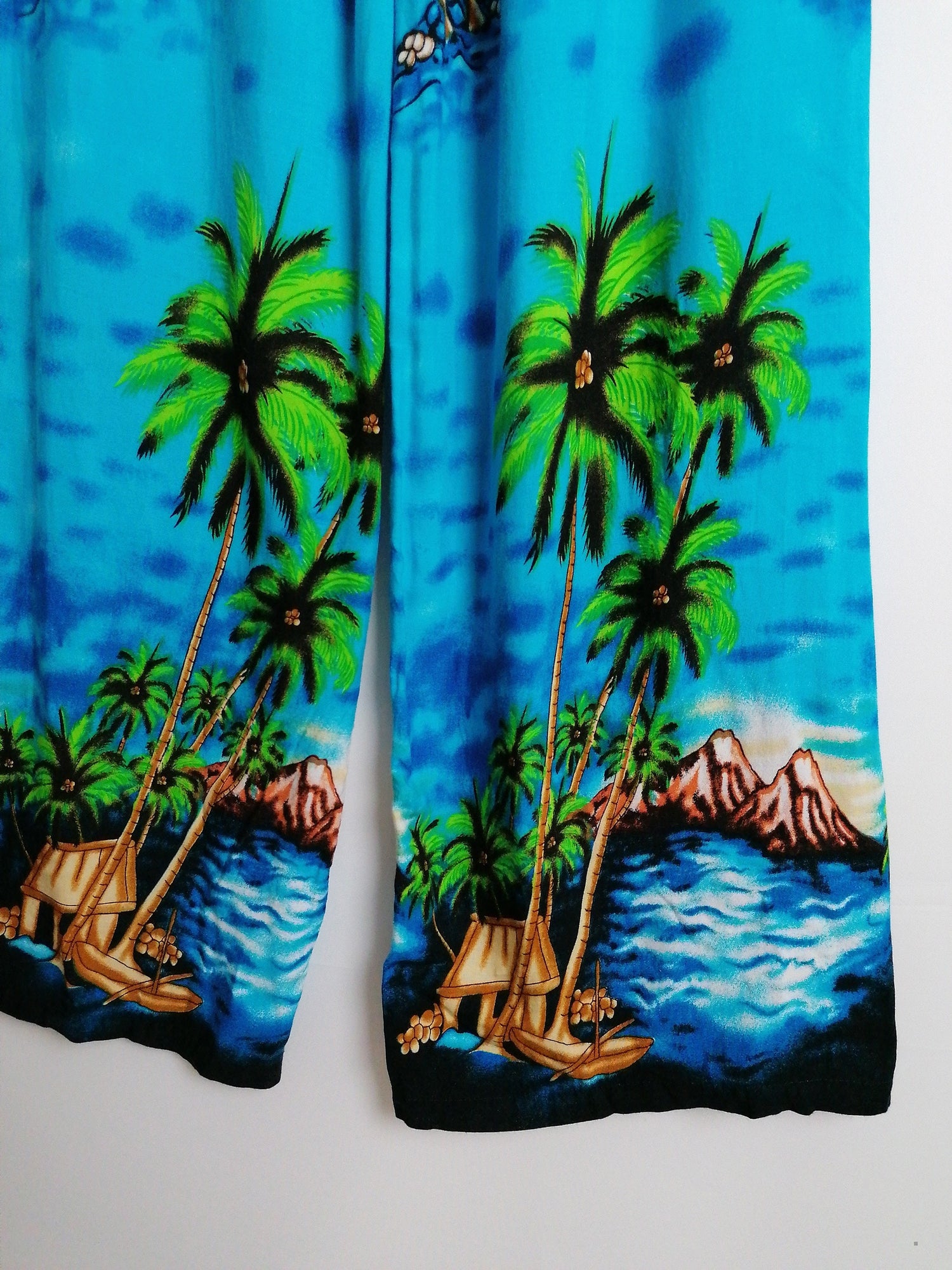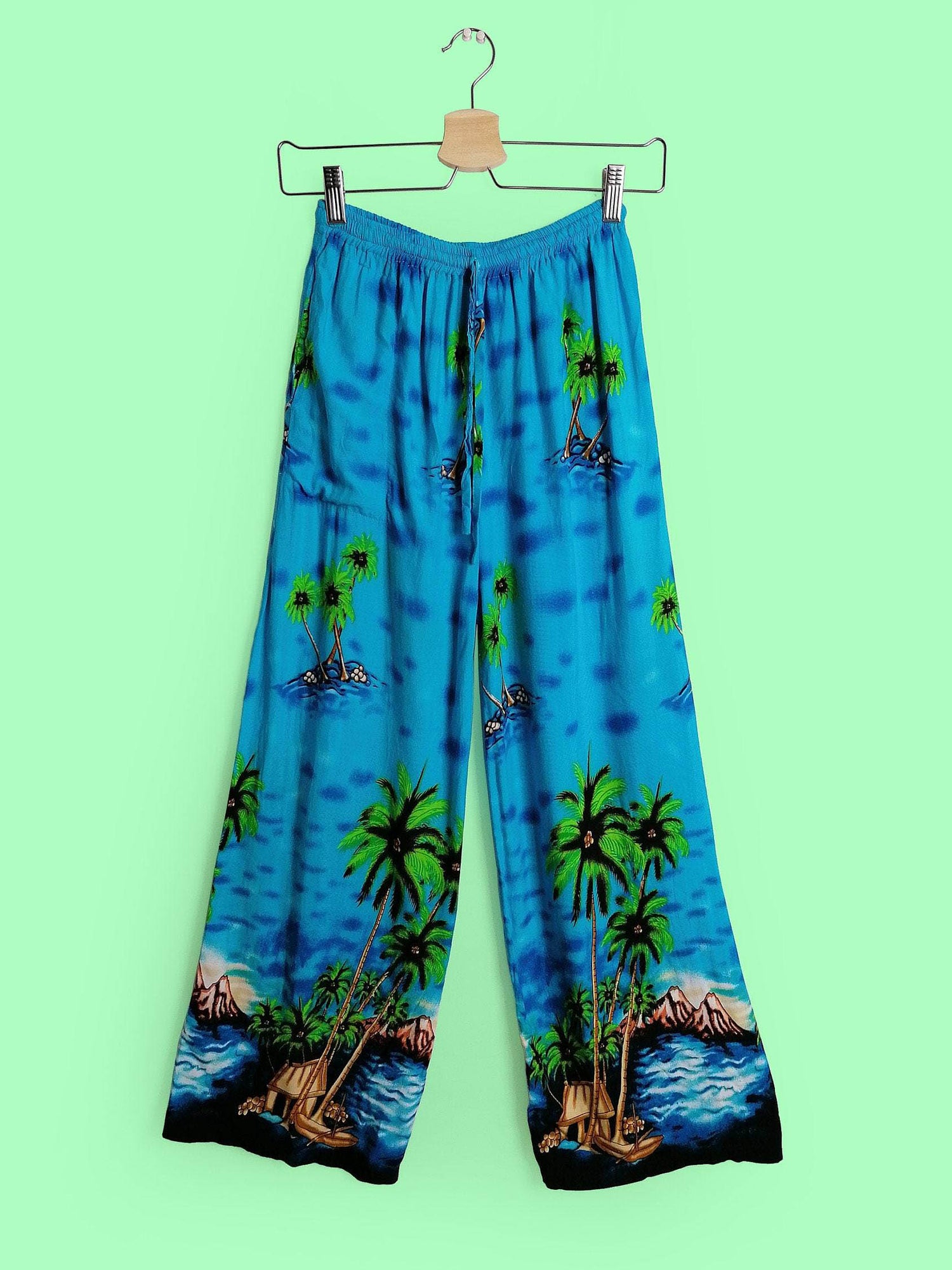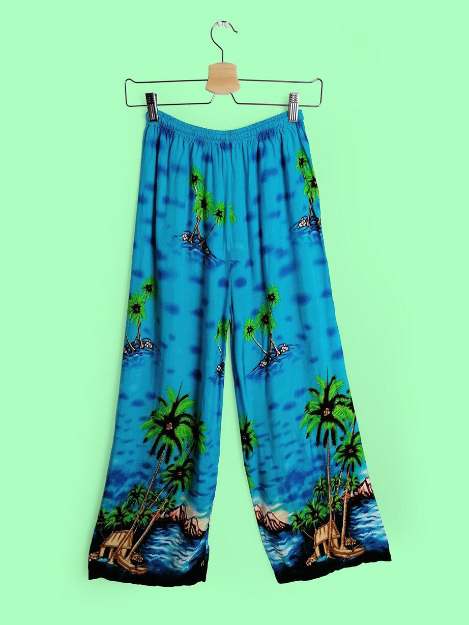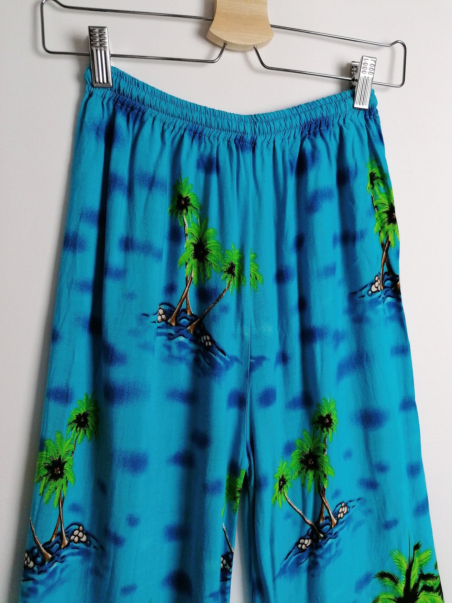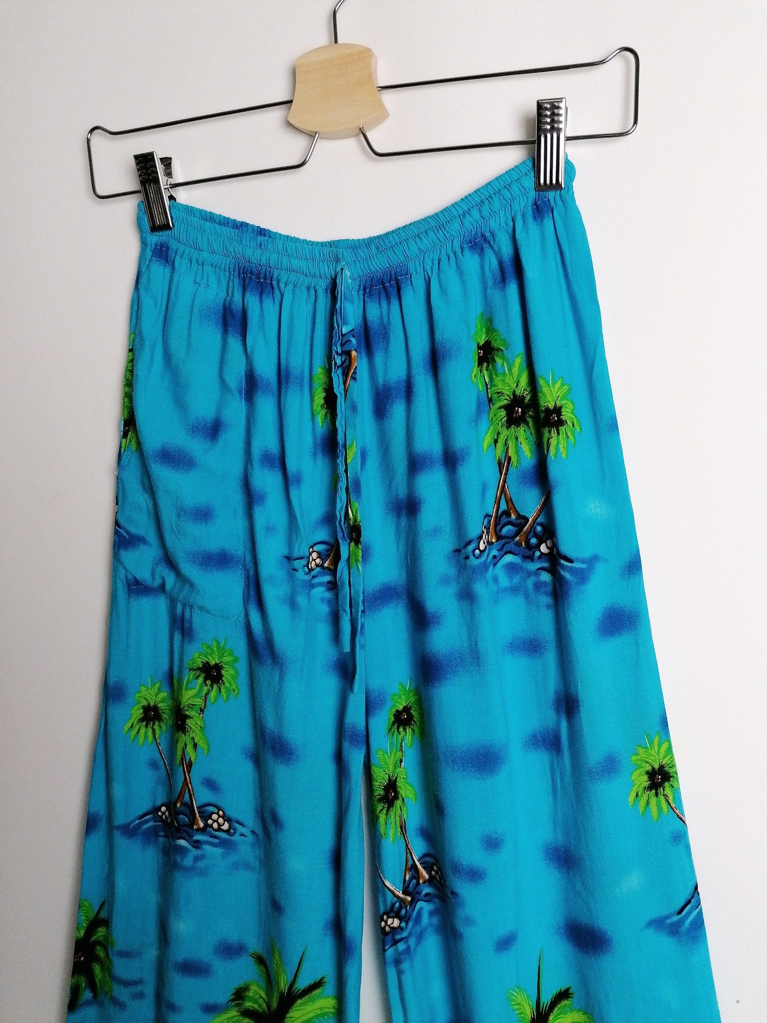 Amazing vintage summer trousers, wide leg, high waist, vibrant print, elastic waist with drawstring. They have just one side pocket, on the right side.