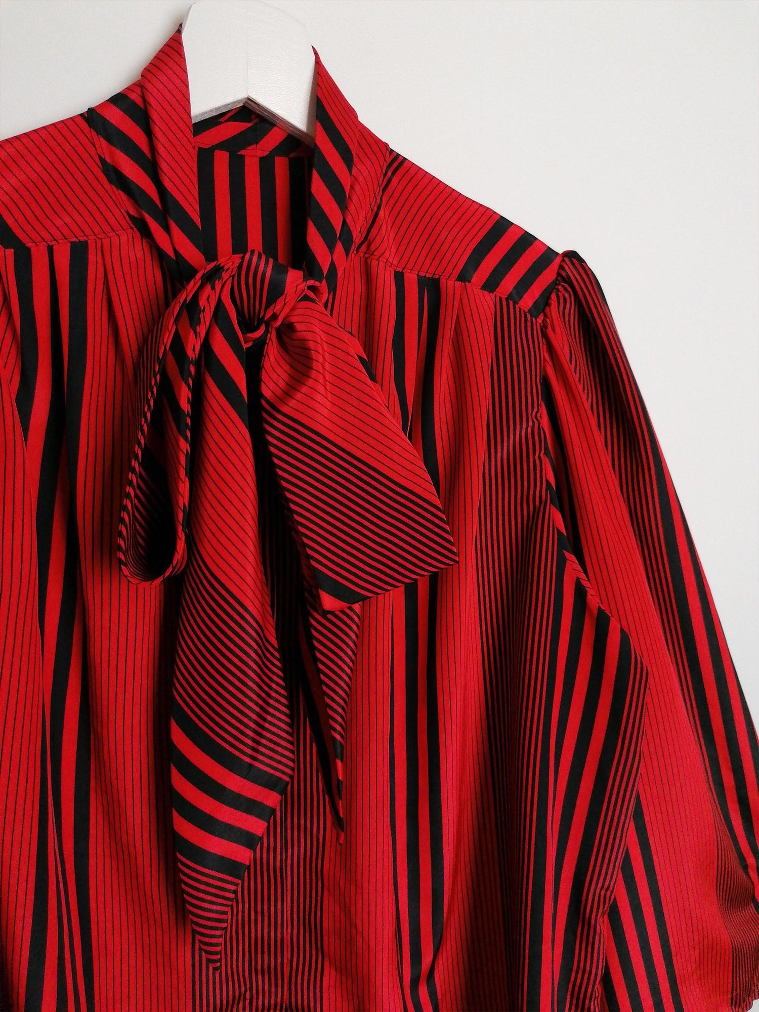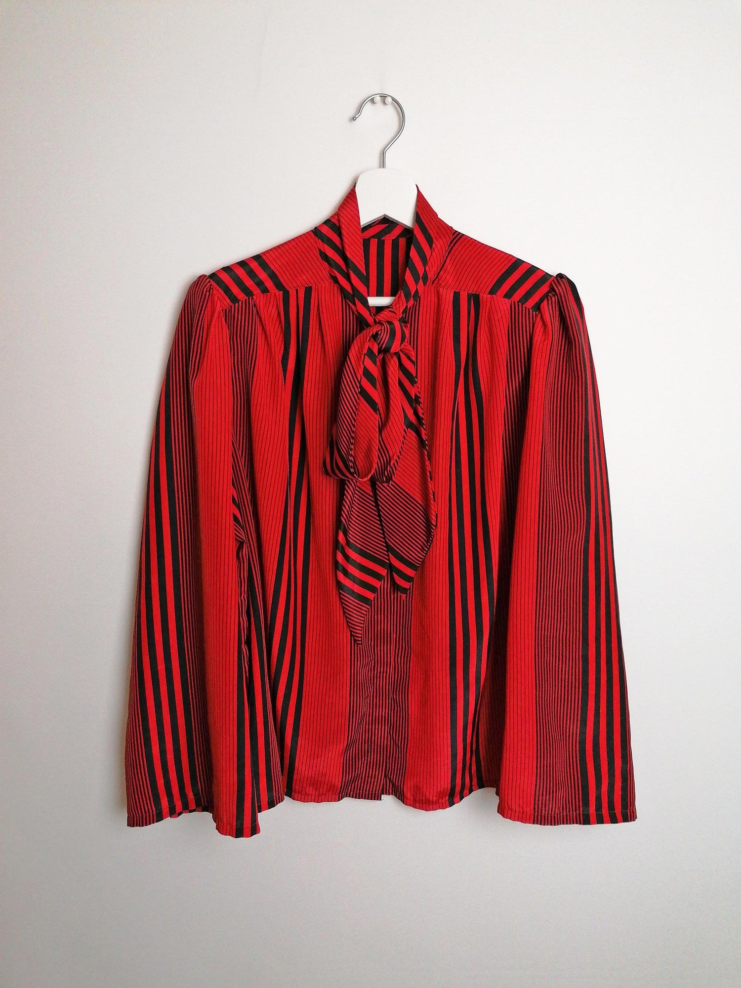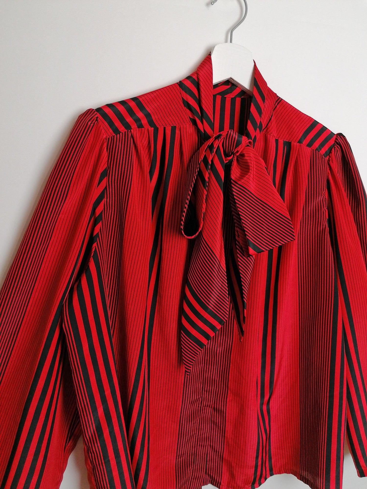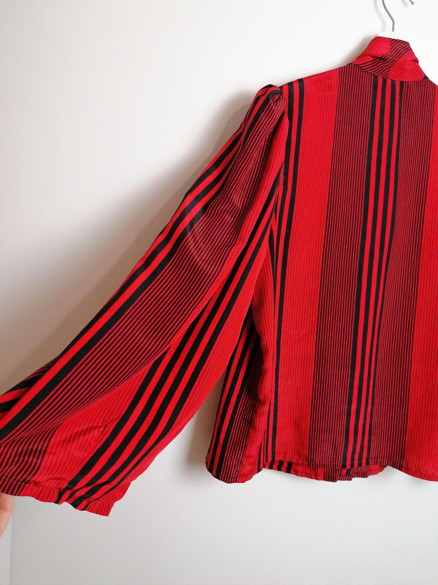 Pussy-bow Blouse Wide Sleeve Red Black Stripes - size S-M
