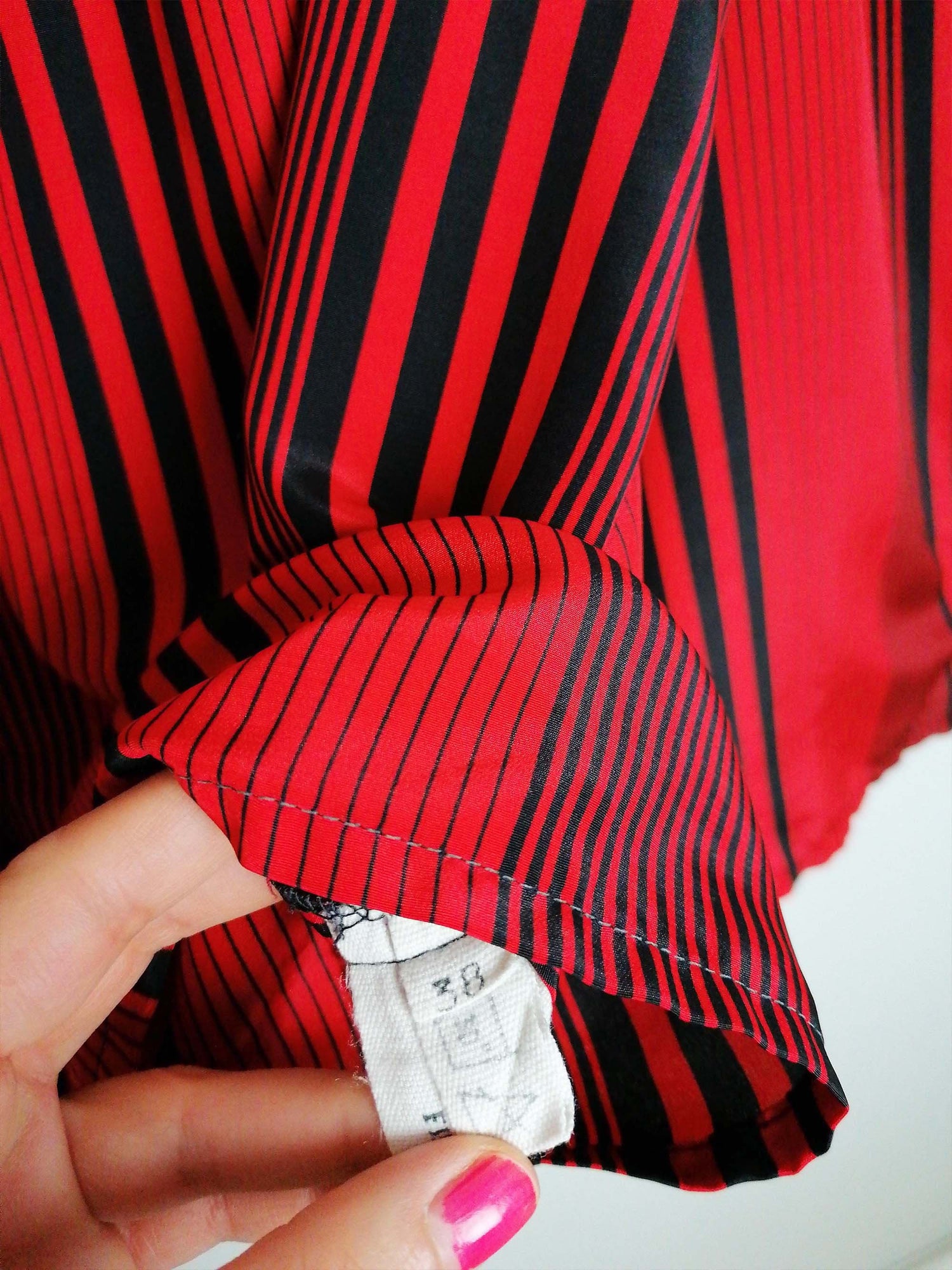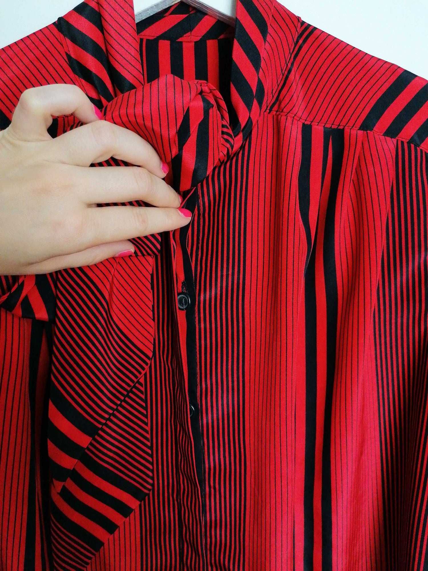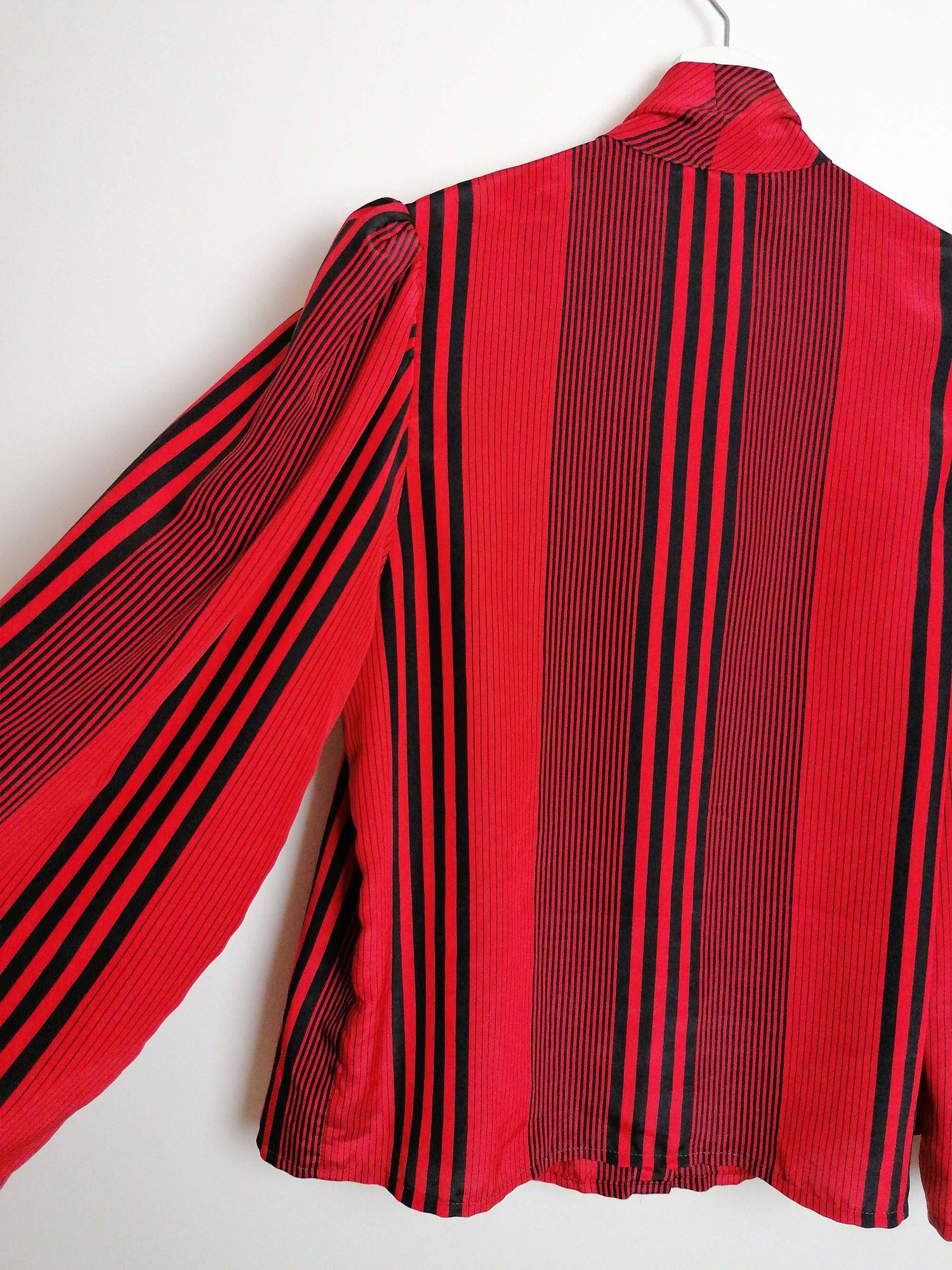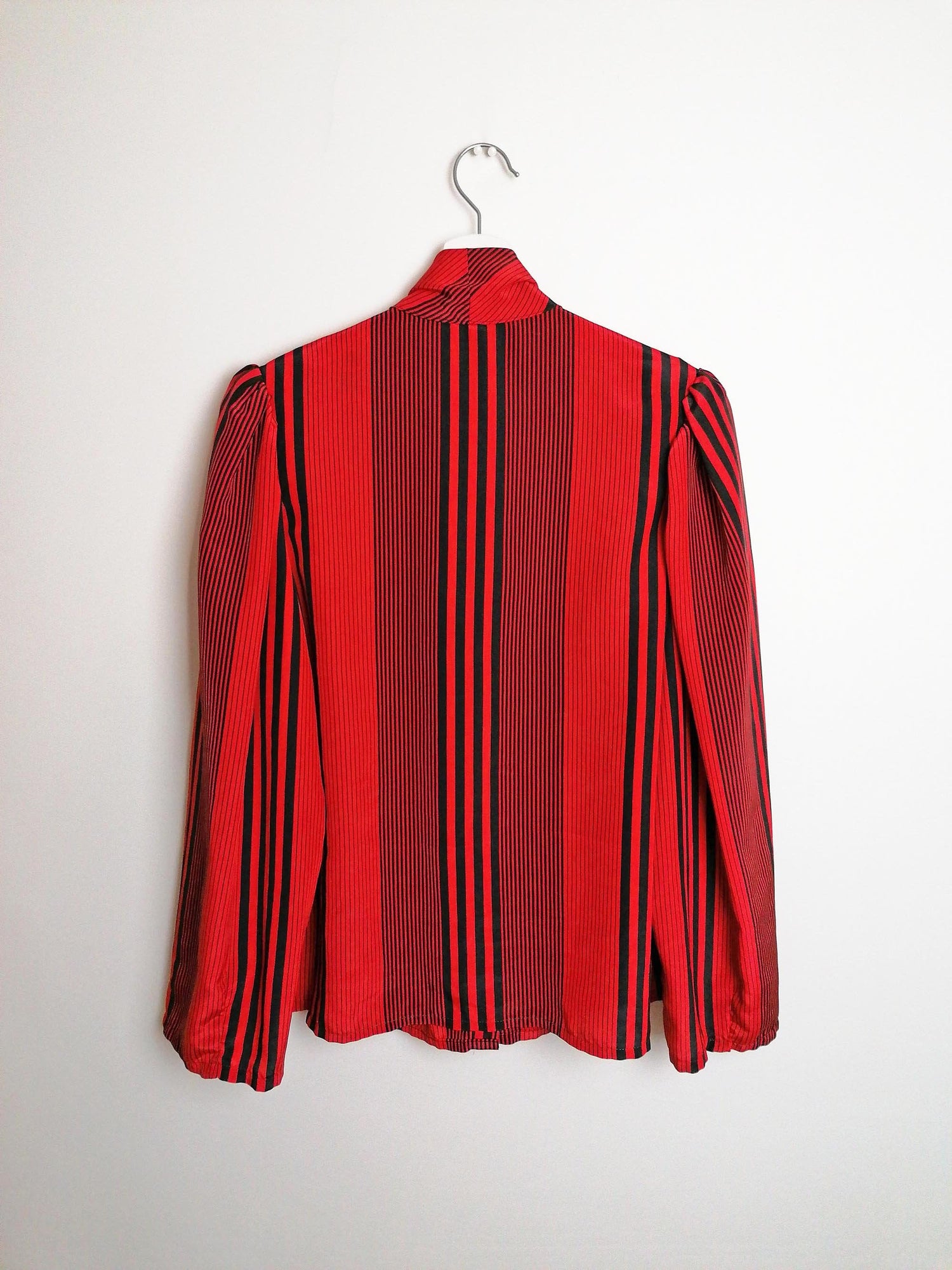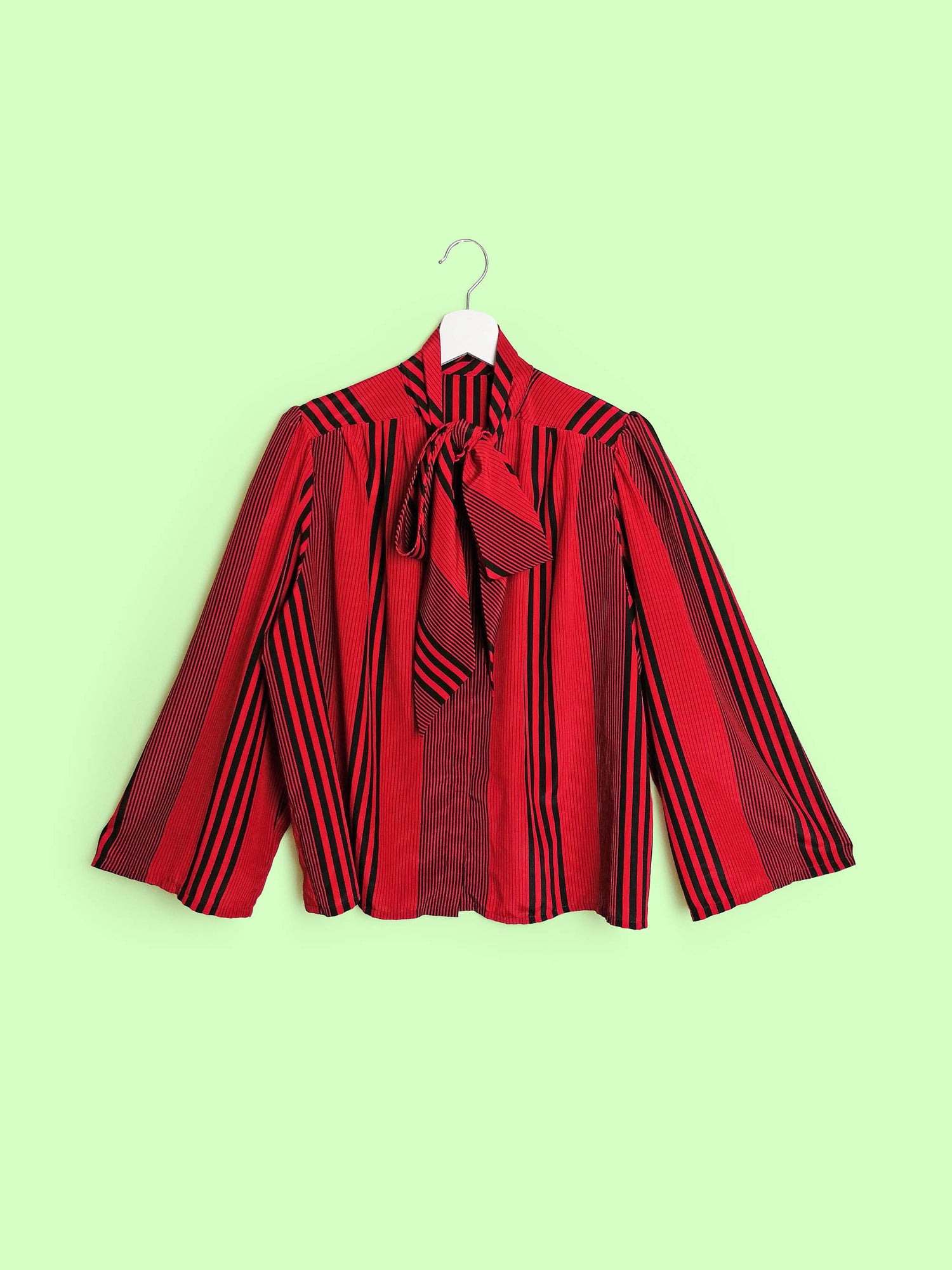 Pussy-bow Blouse Wide Sleeve Red Black Stripes - size S-M