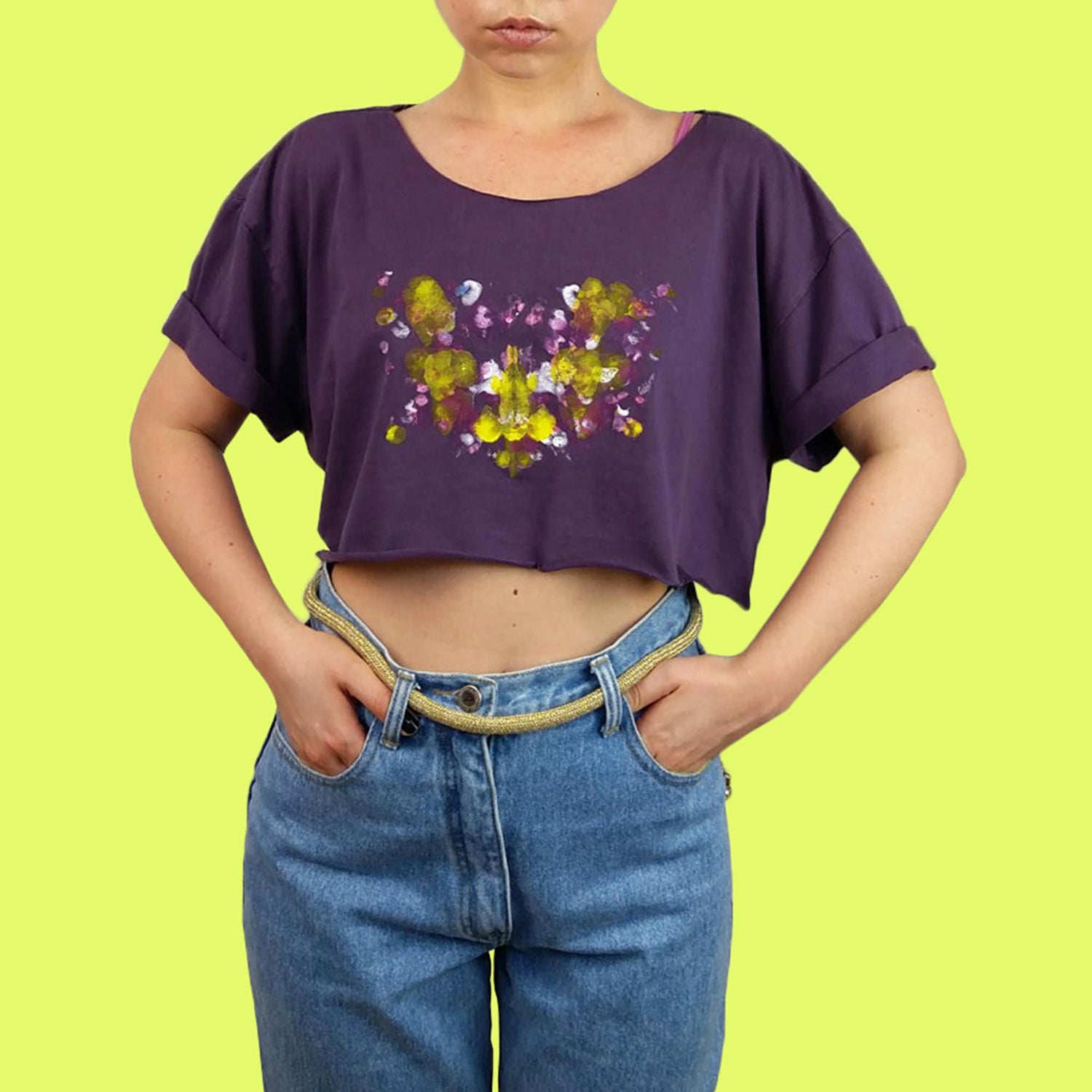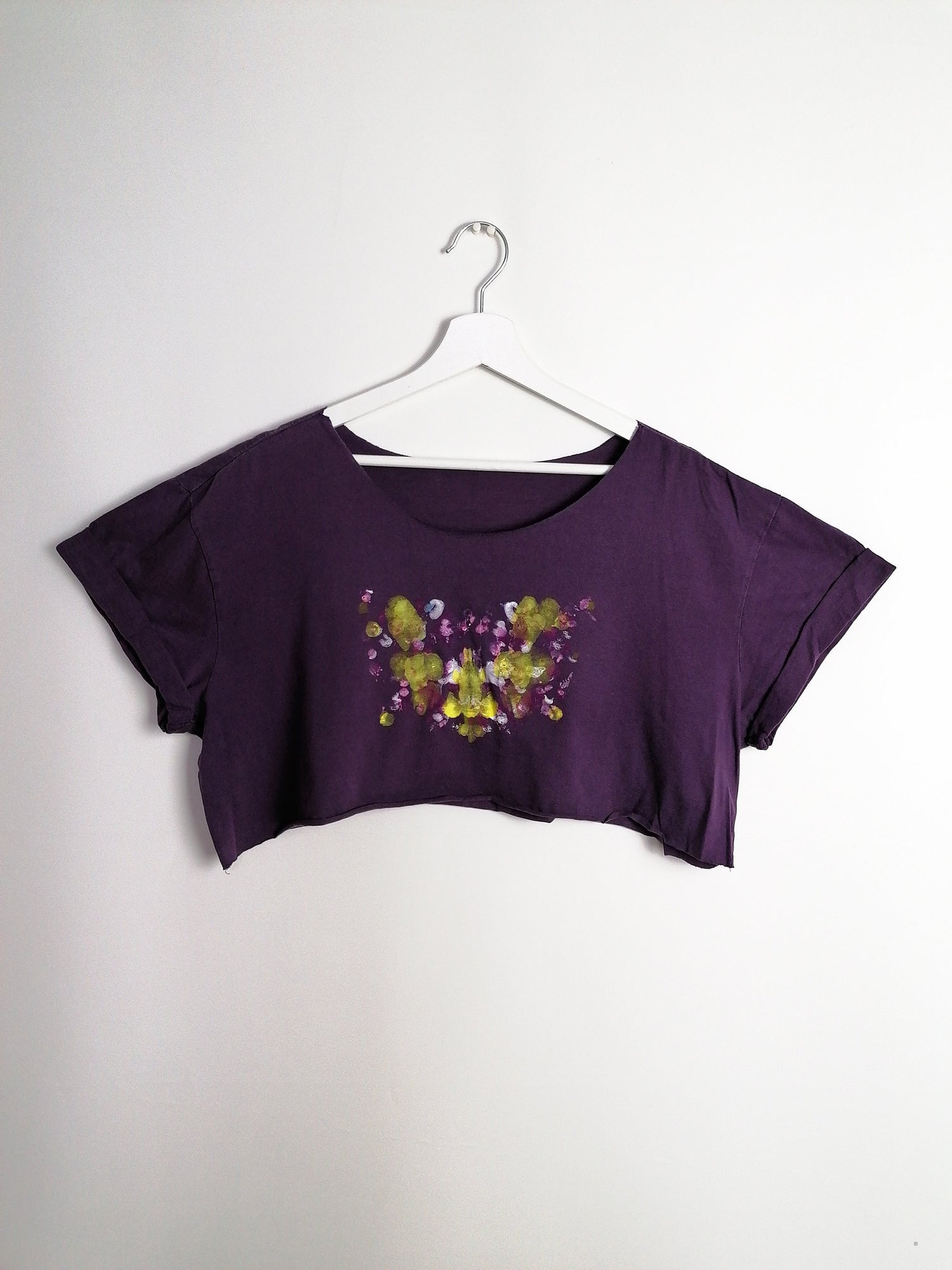 One-of-a-kind reworked crop top, loose oversized fit, raw edges on neckline and bottom, rolled up sleeves. Item is reworked from an excellent quality cotton vintage oversized t-shirt, hand-painted by yours truly with water-based special textile colours. The print is inspired by the Rorschach's inkblot test, but less gloomy. The way the colours combine is totally arbitrary, no two designs will ever be the same. I see "Richard Lionheart". What do you see in this print? :)