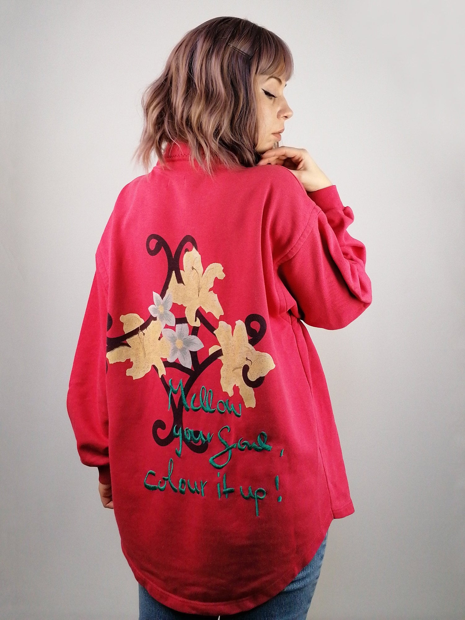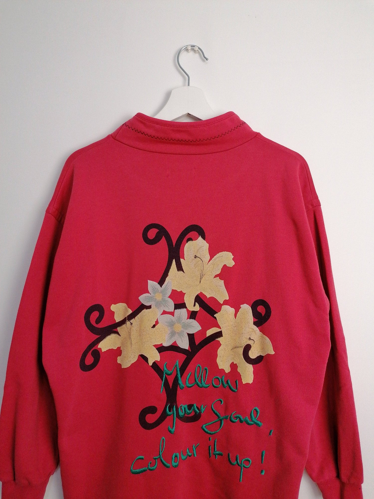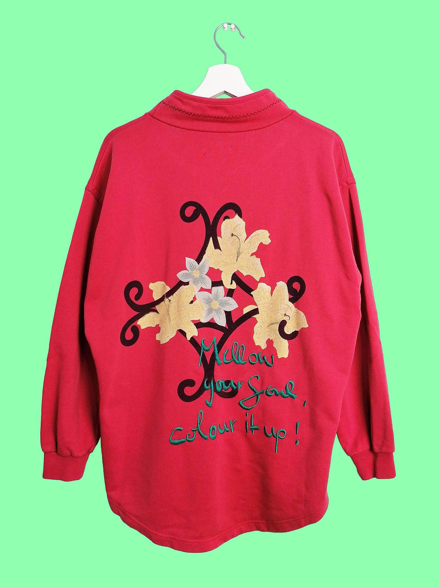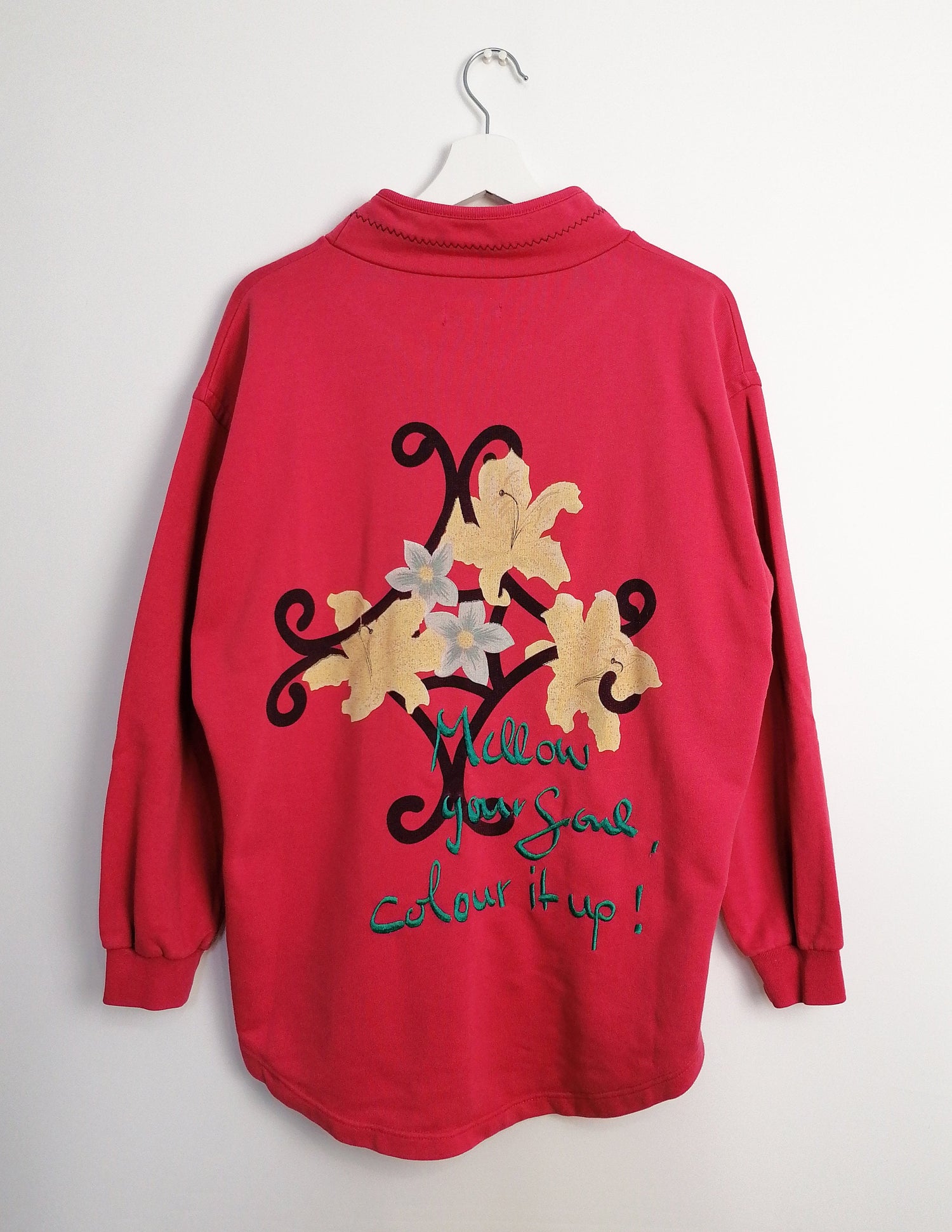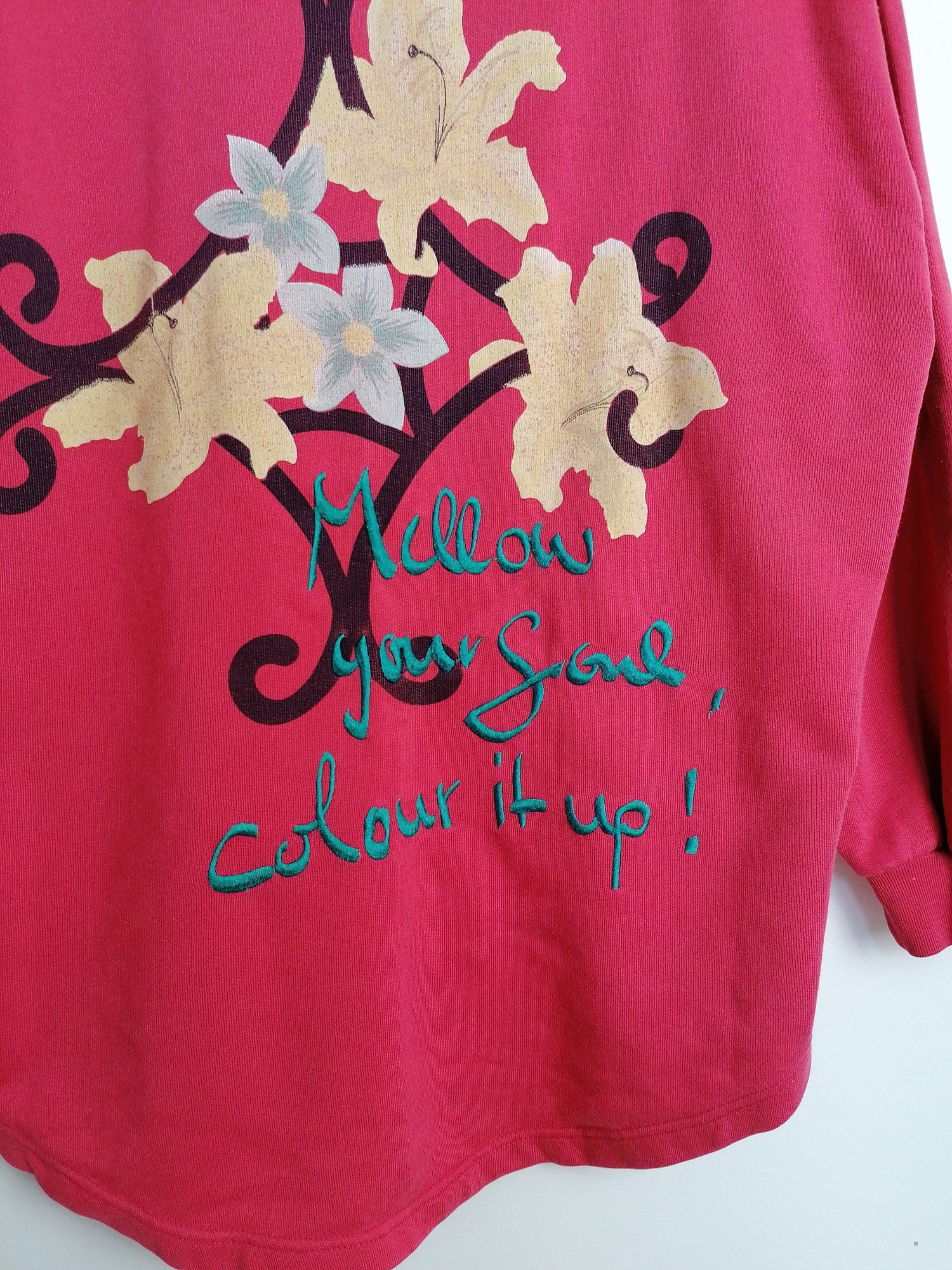 Vintage 90's s. Oliver unisex oversized sweatshirt, gorgeous large floral print on back, embroidery in beautiful turquoise that reads 'Mellow your soul, colour it up!'.