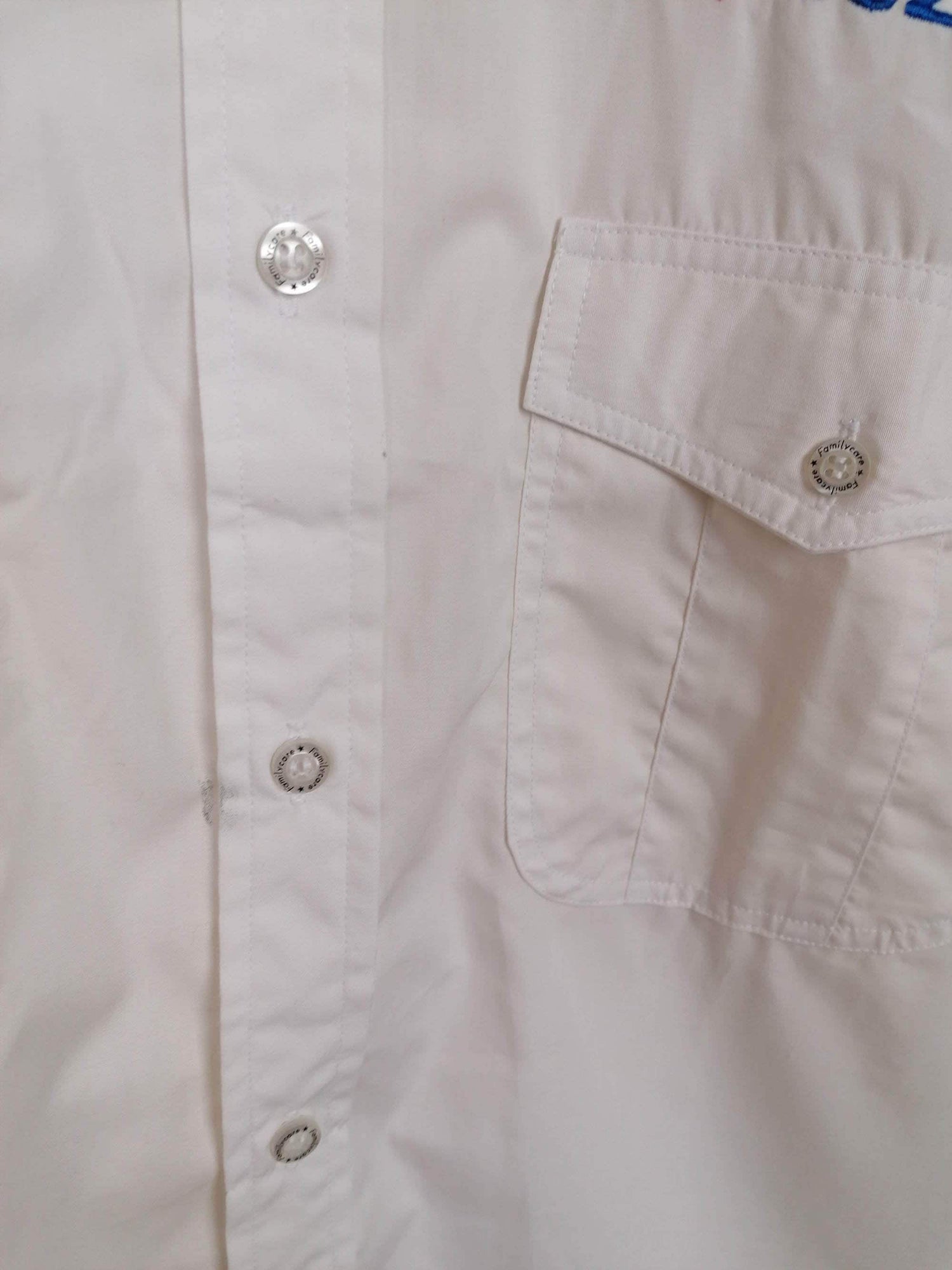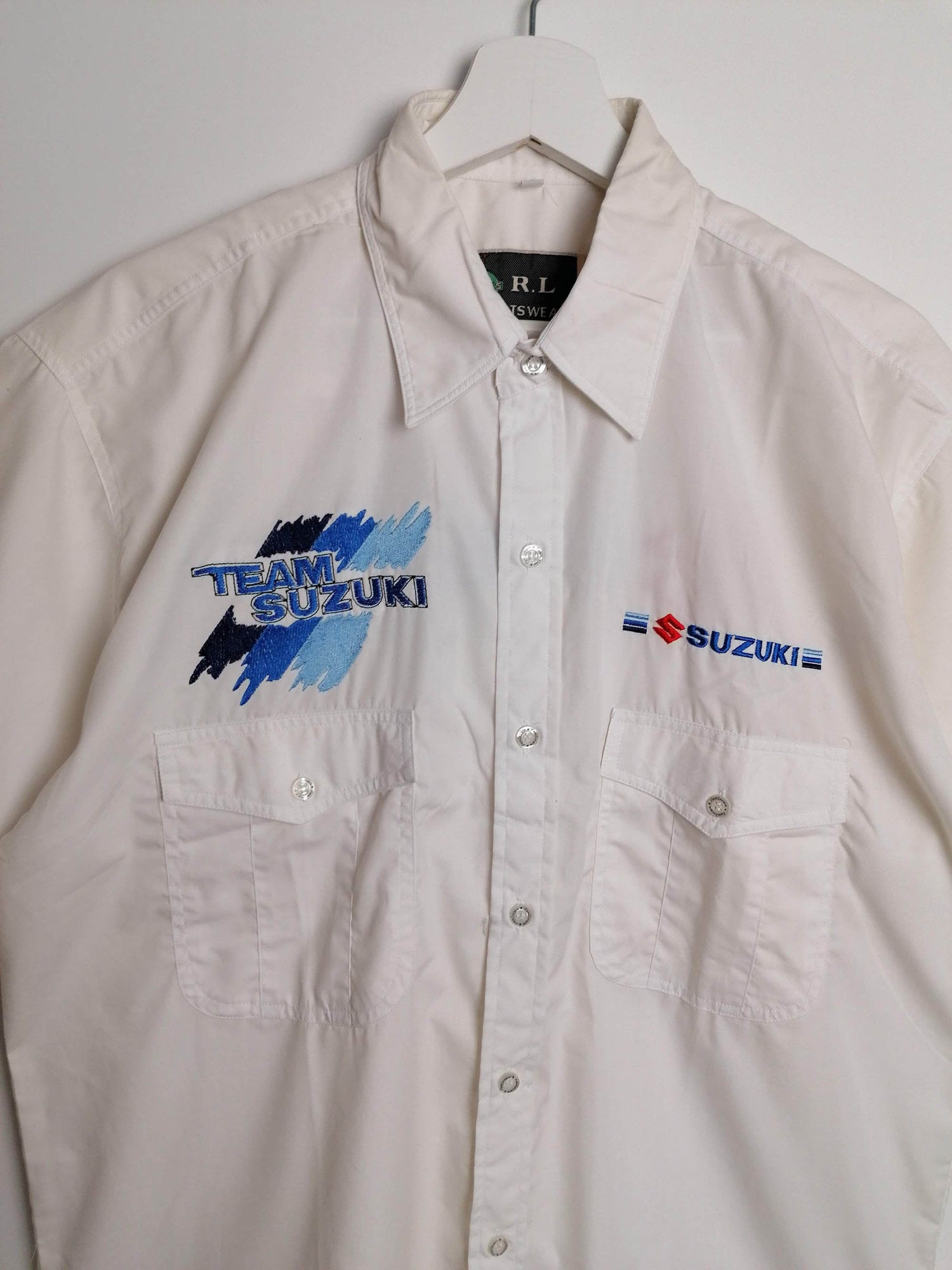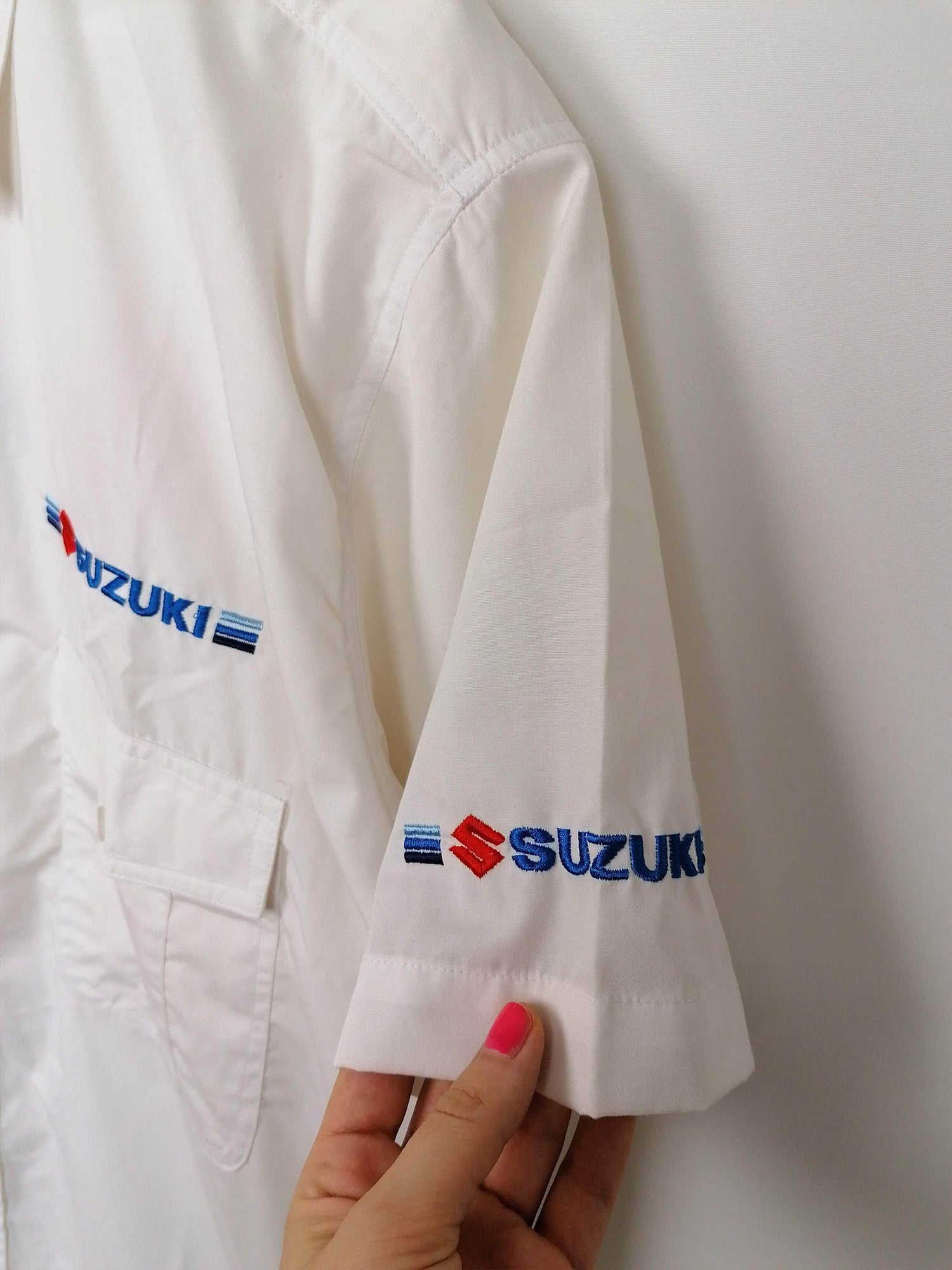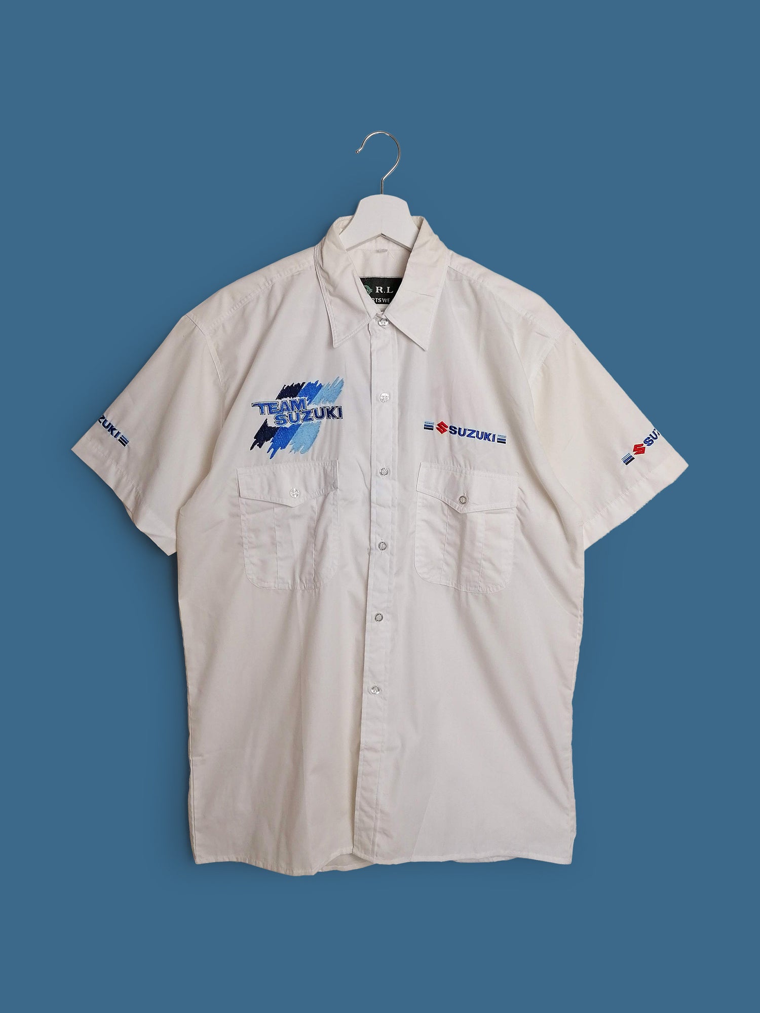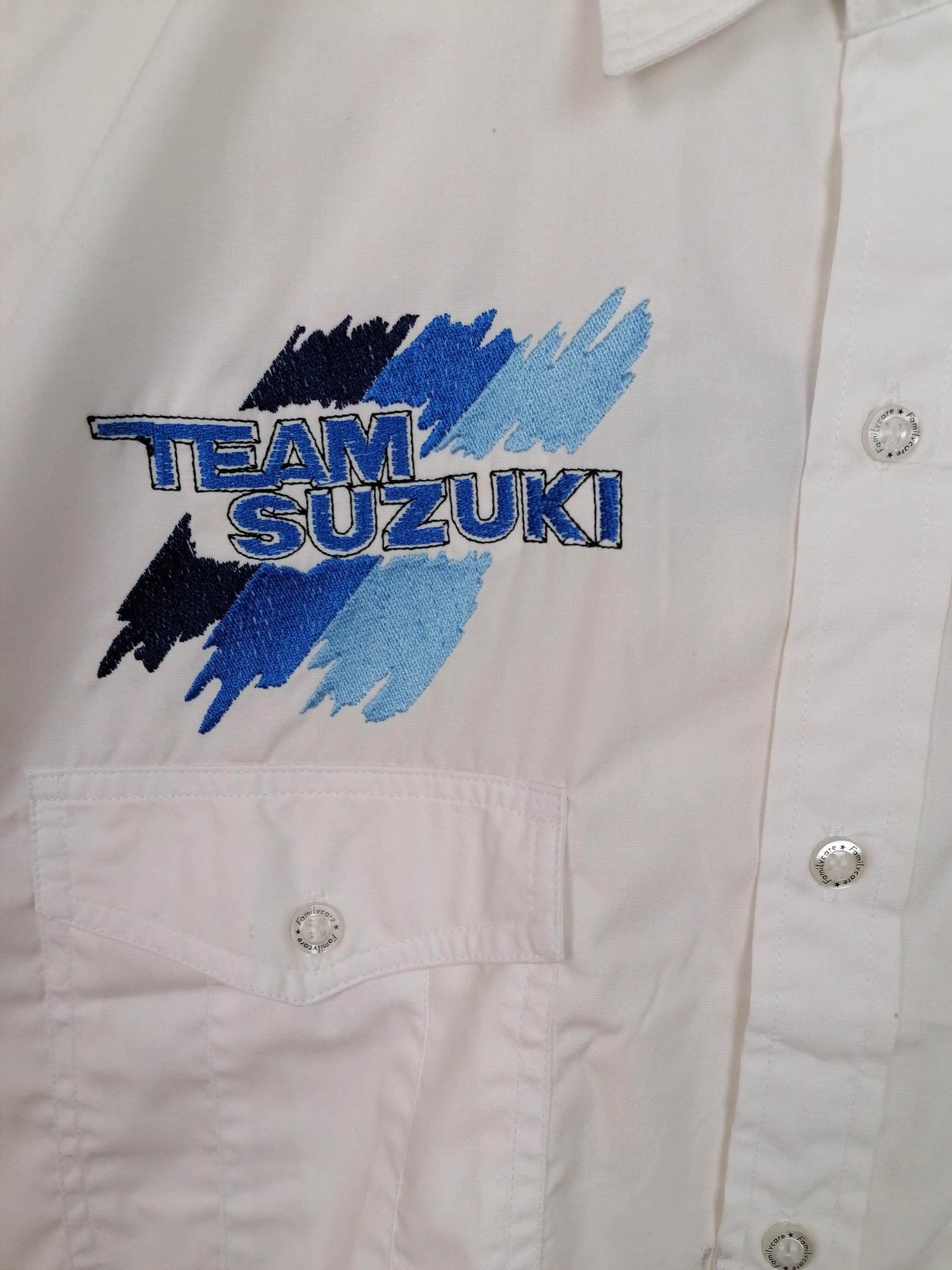White button-down short-sleeve shirt, Team Suzuki embroidery on front and back.