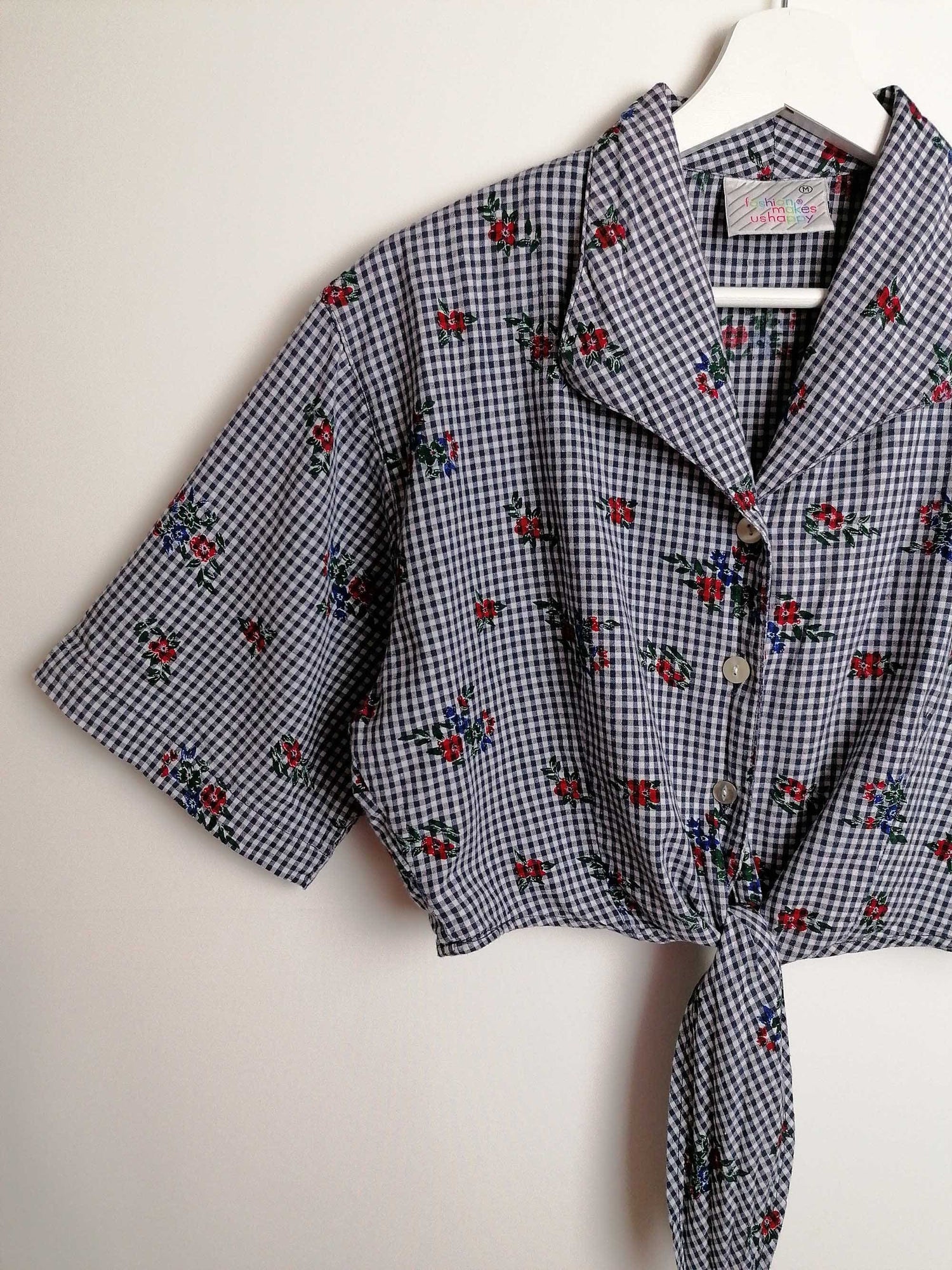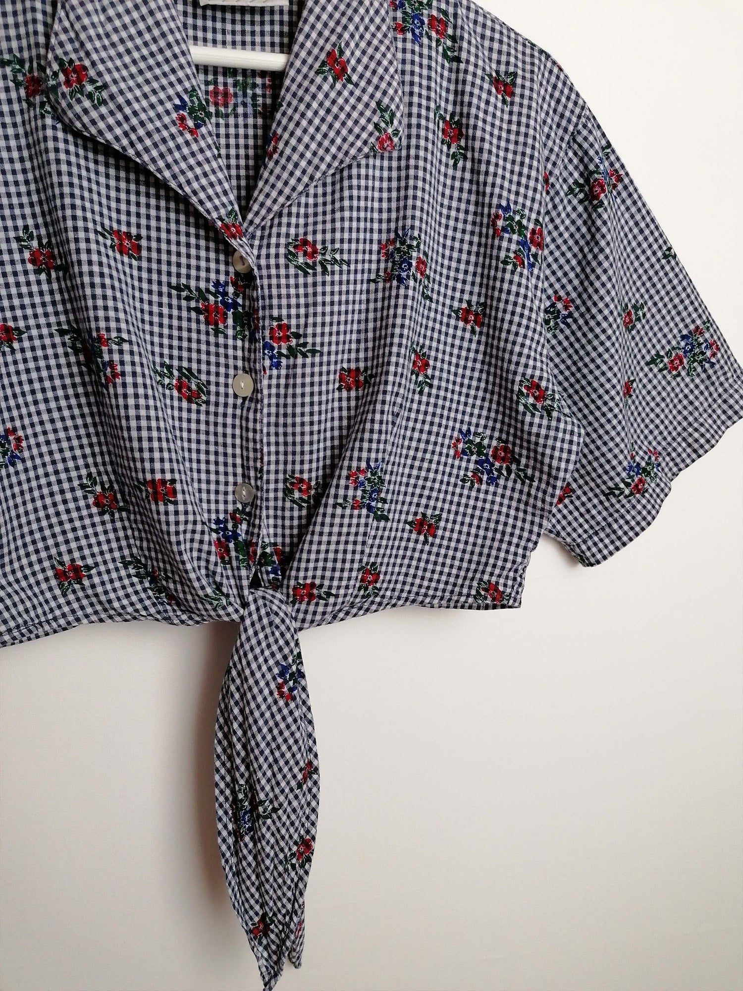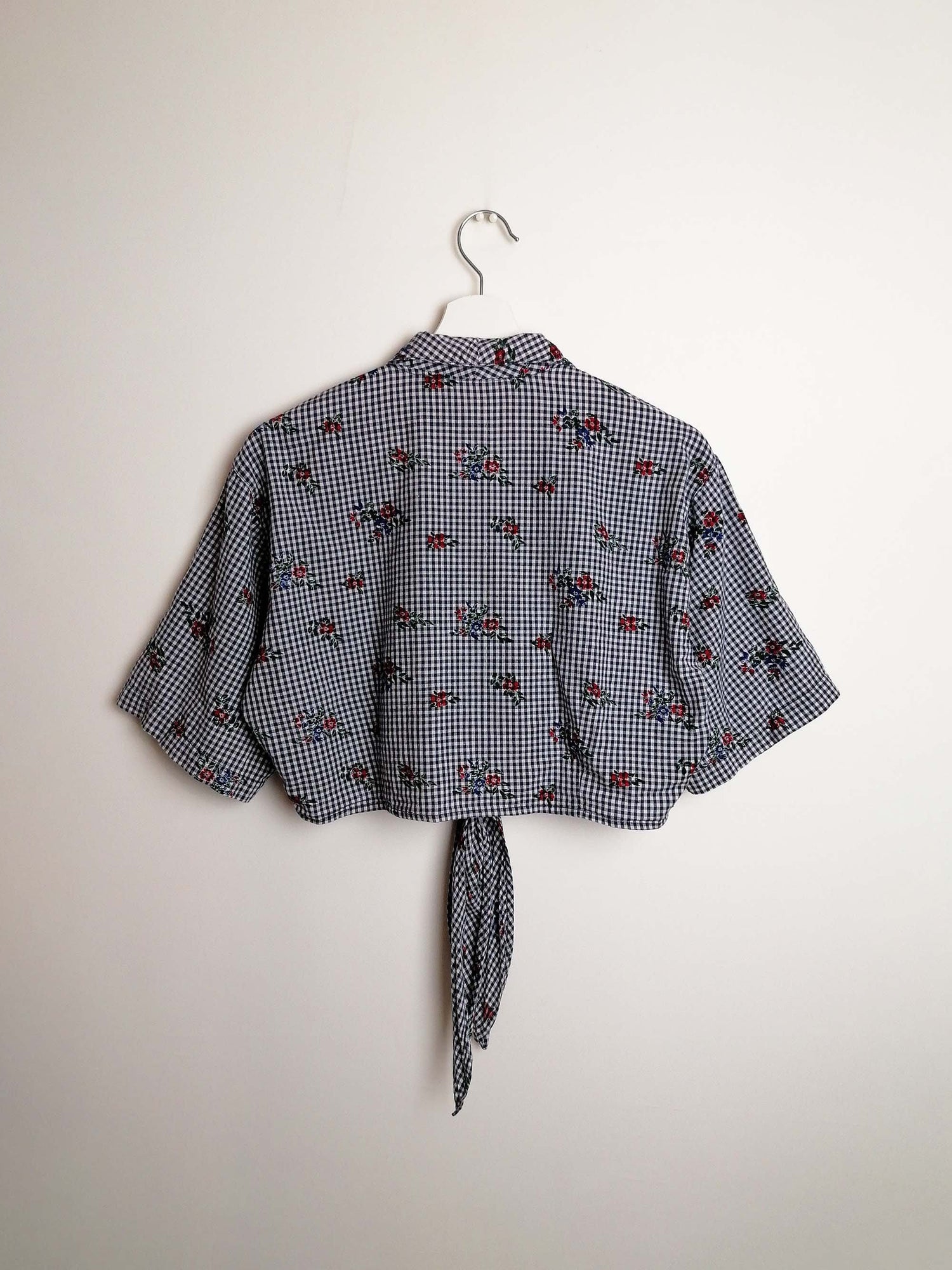 Gorgeous vintage 90's tie-up top, button-up, gingham print - white with dark navy blue.