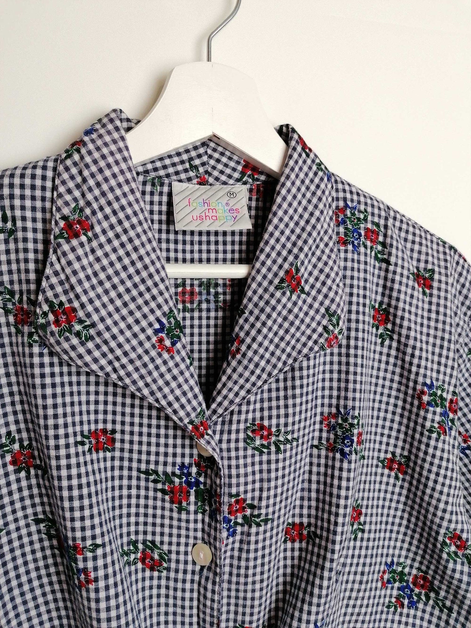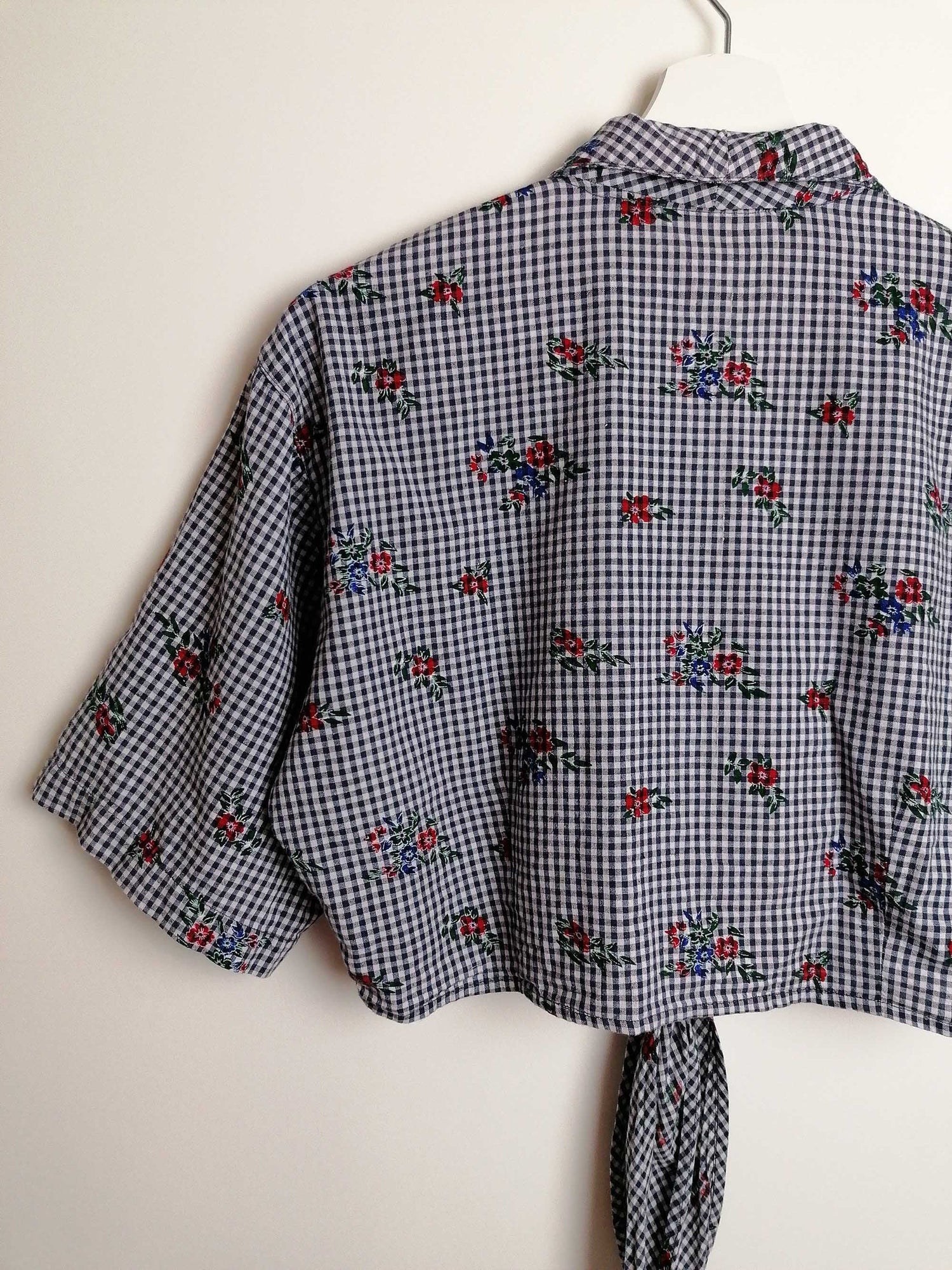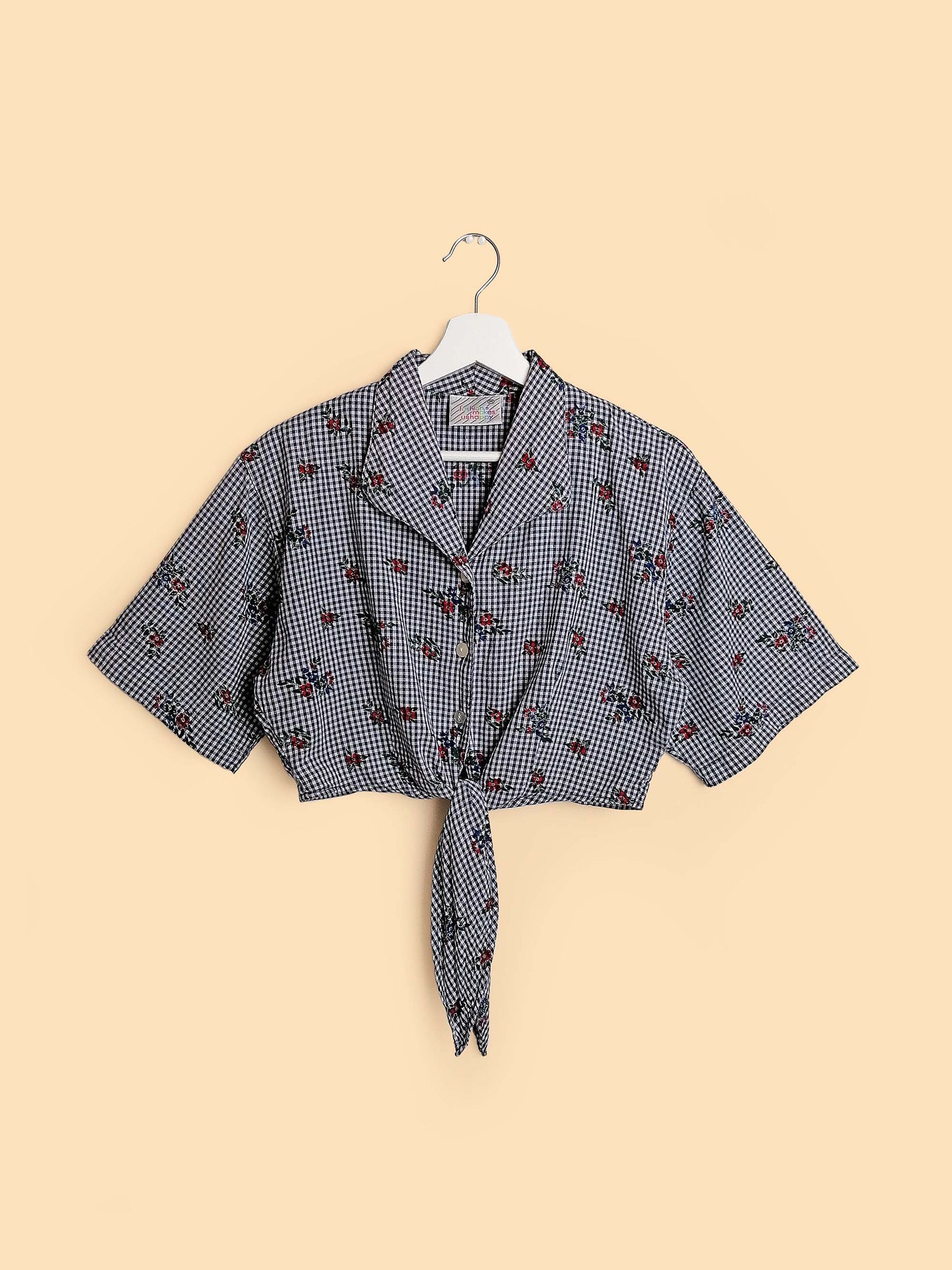 Gorgeous vintage 90's tie-up top, button-up, gingham print - white with dark navy blue.
