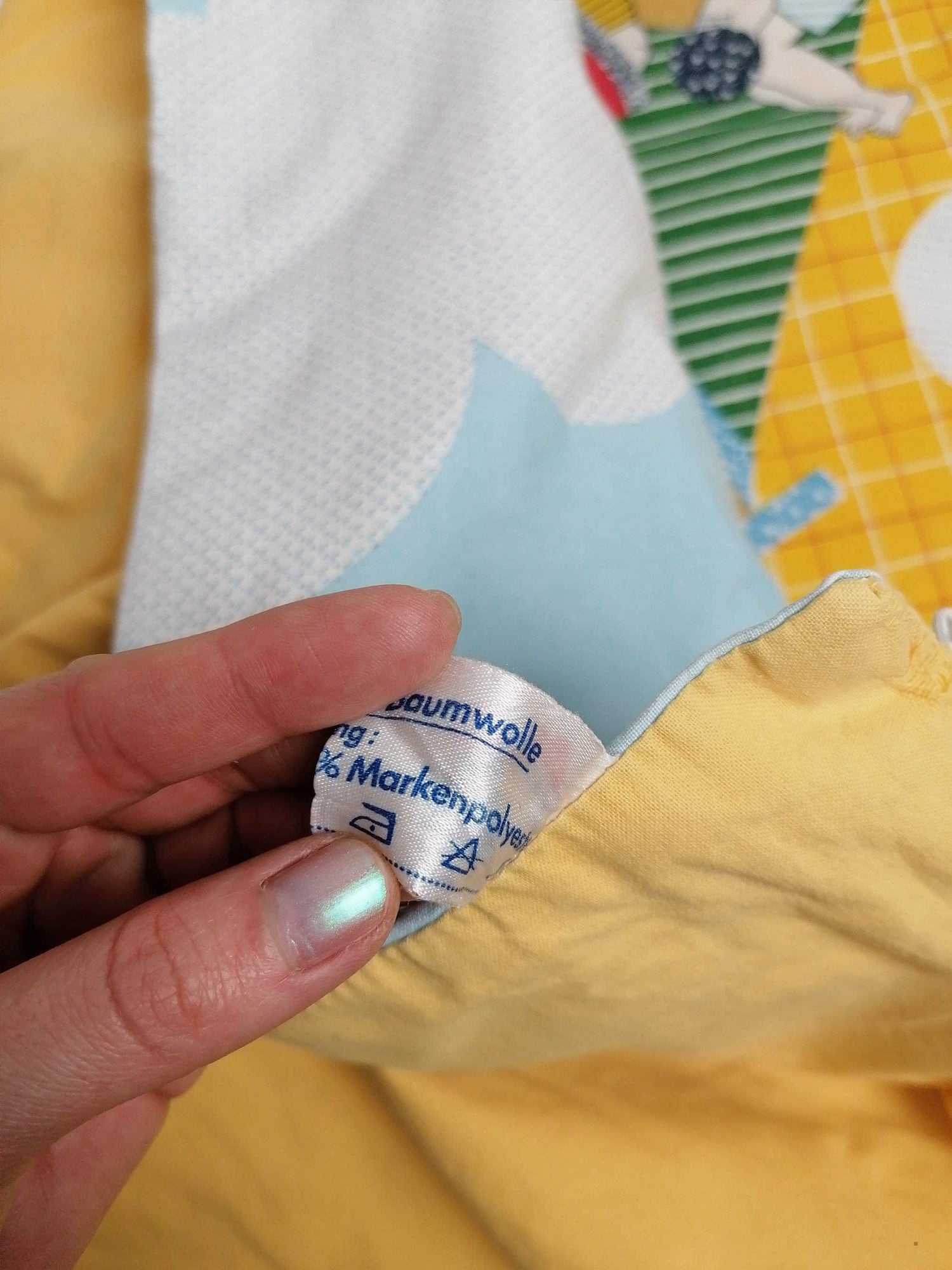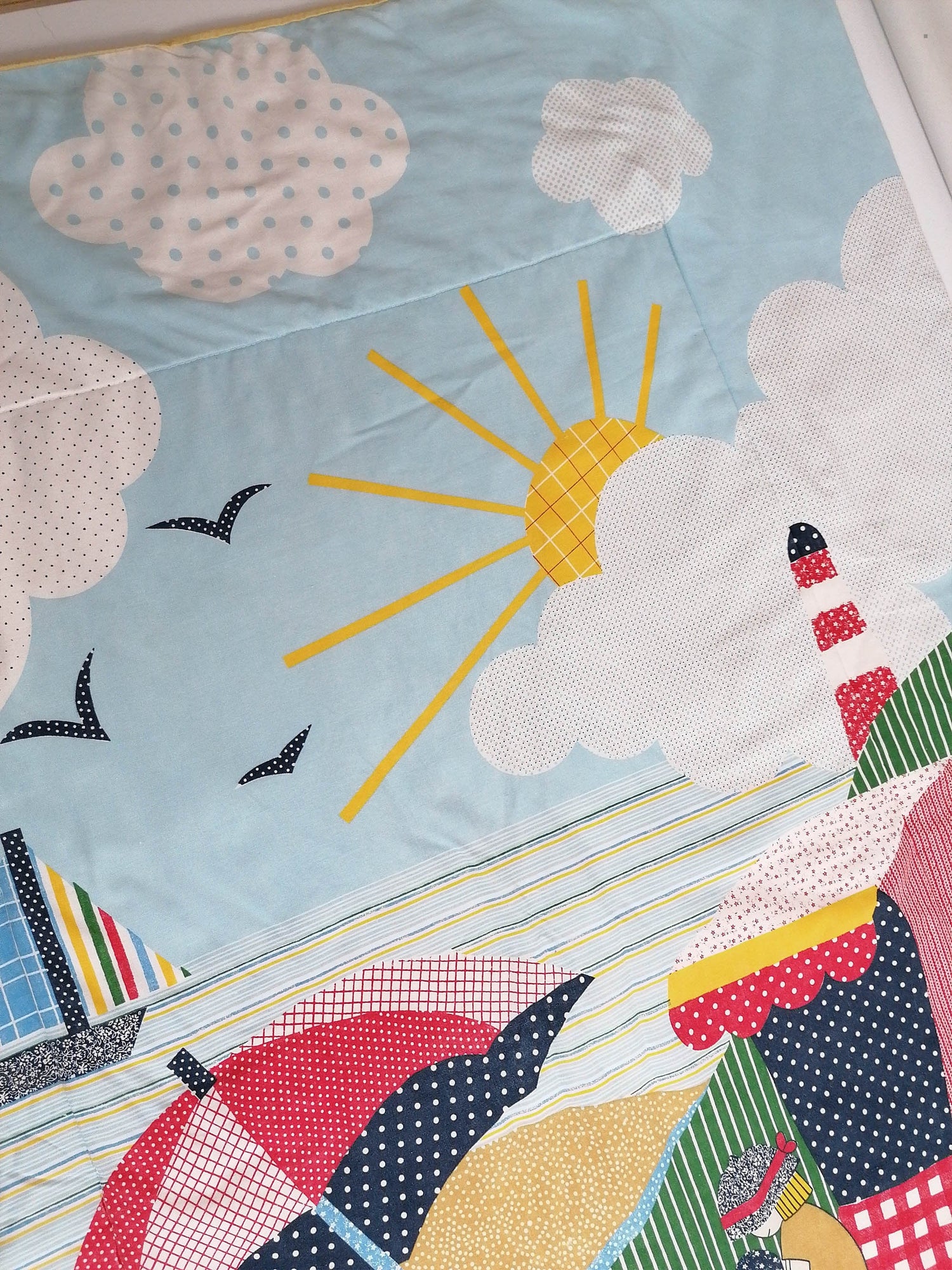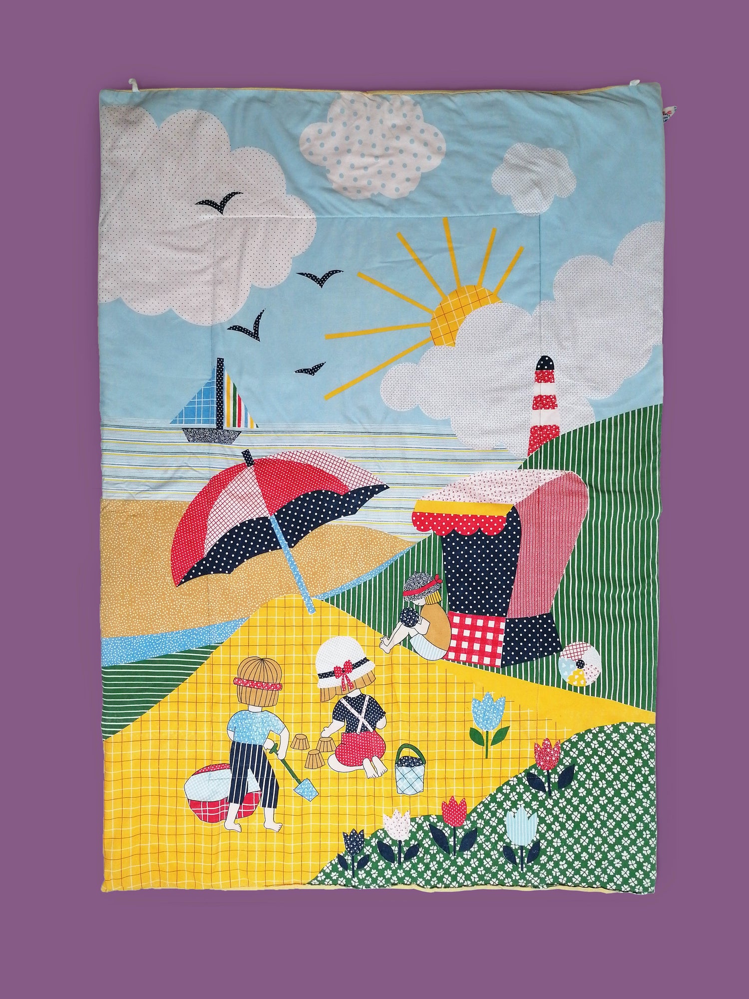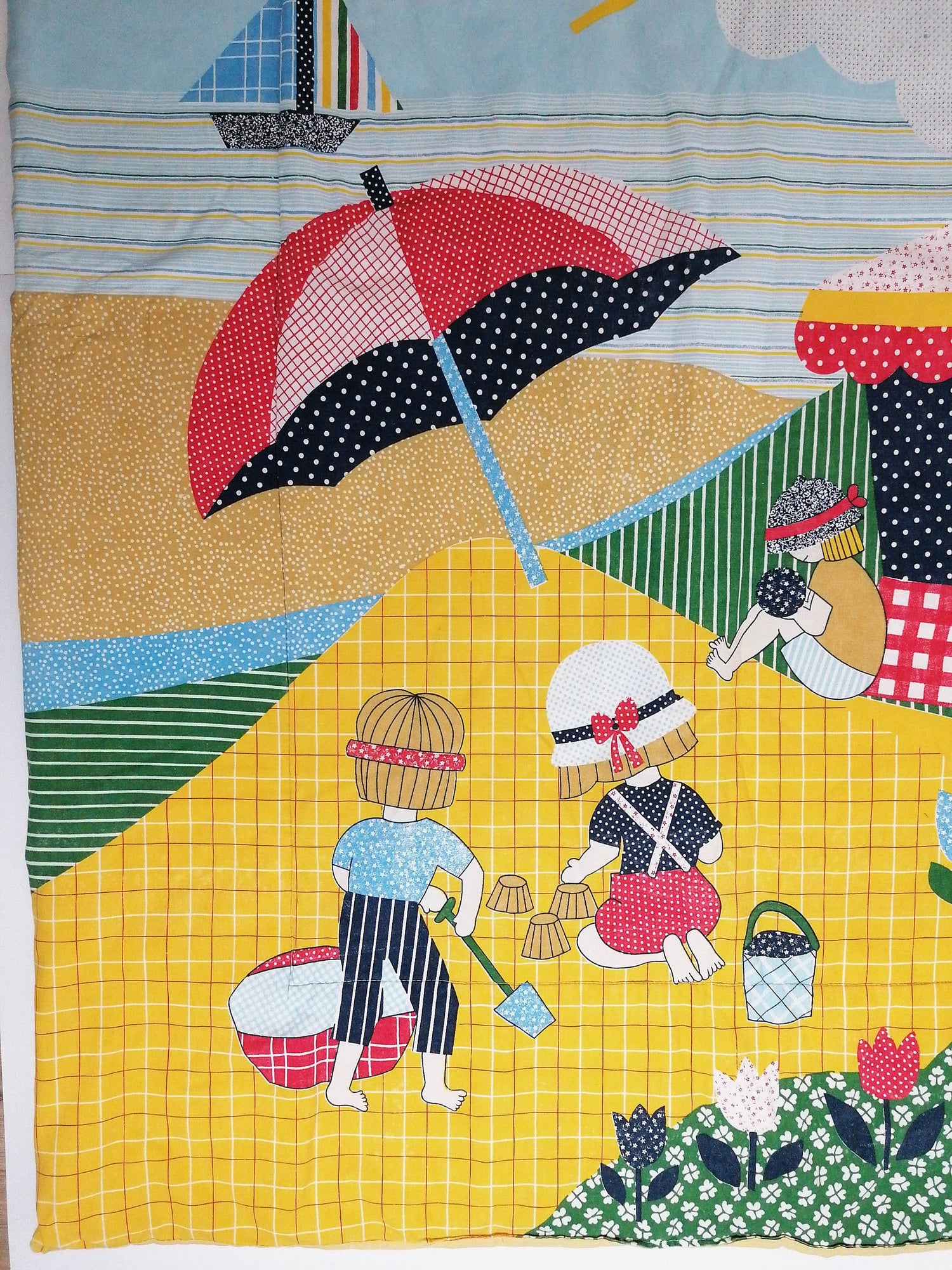 Adorable 80's vintage baby blanket with colourful beach scene.