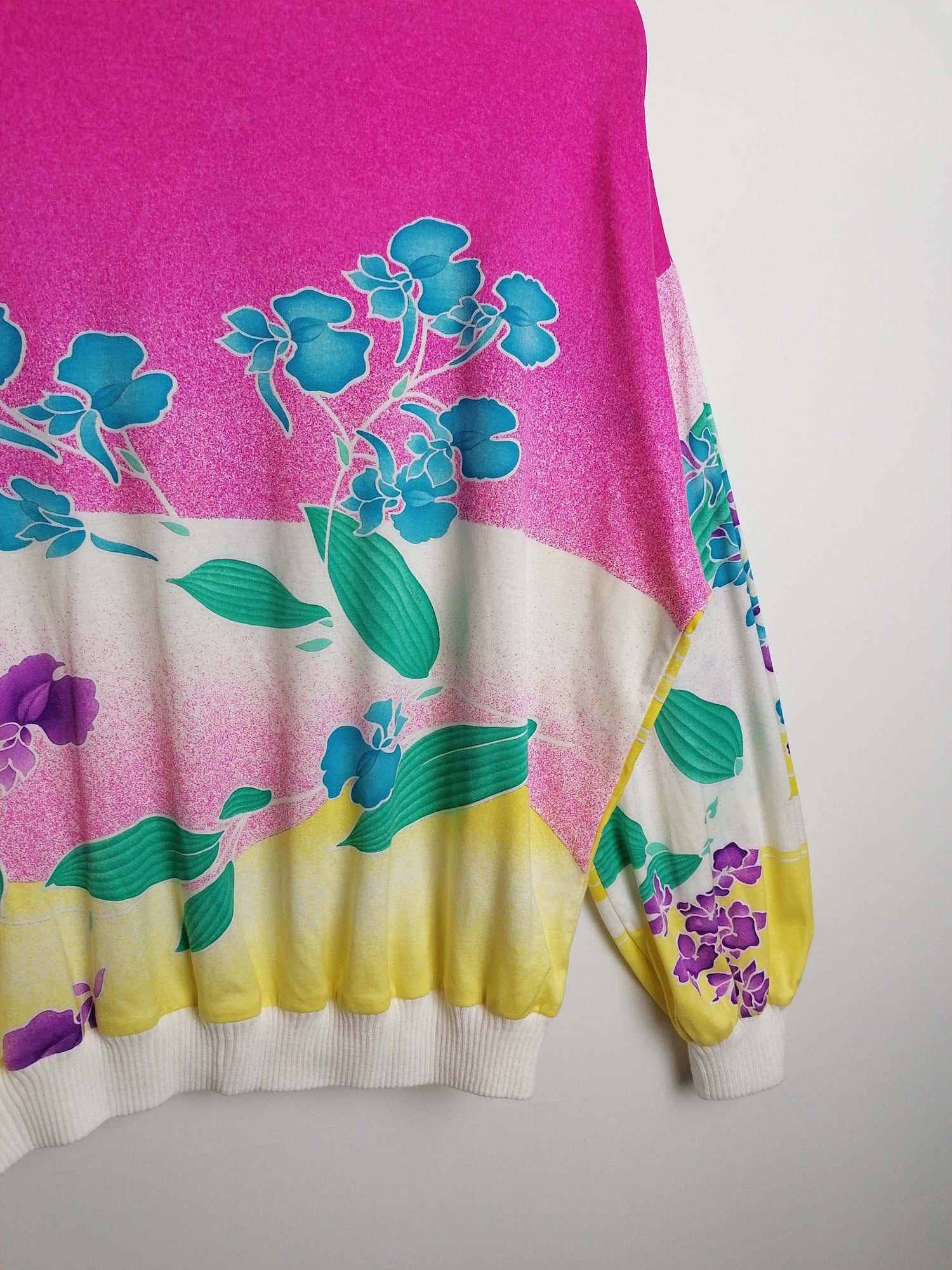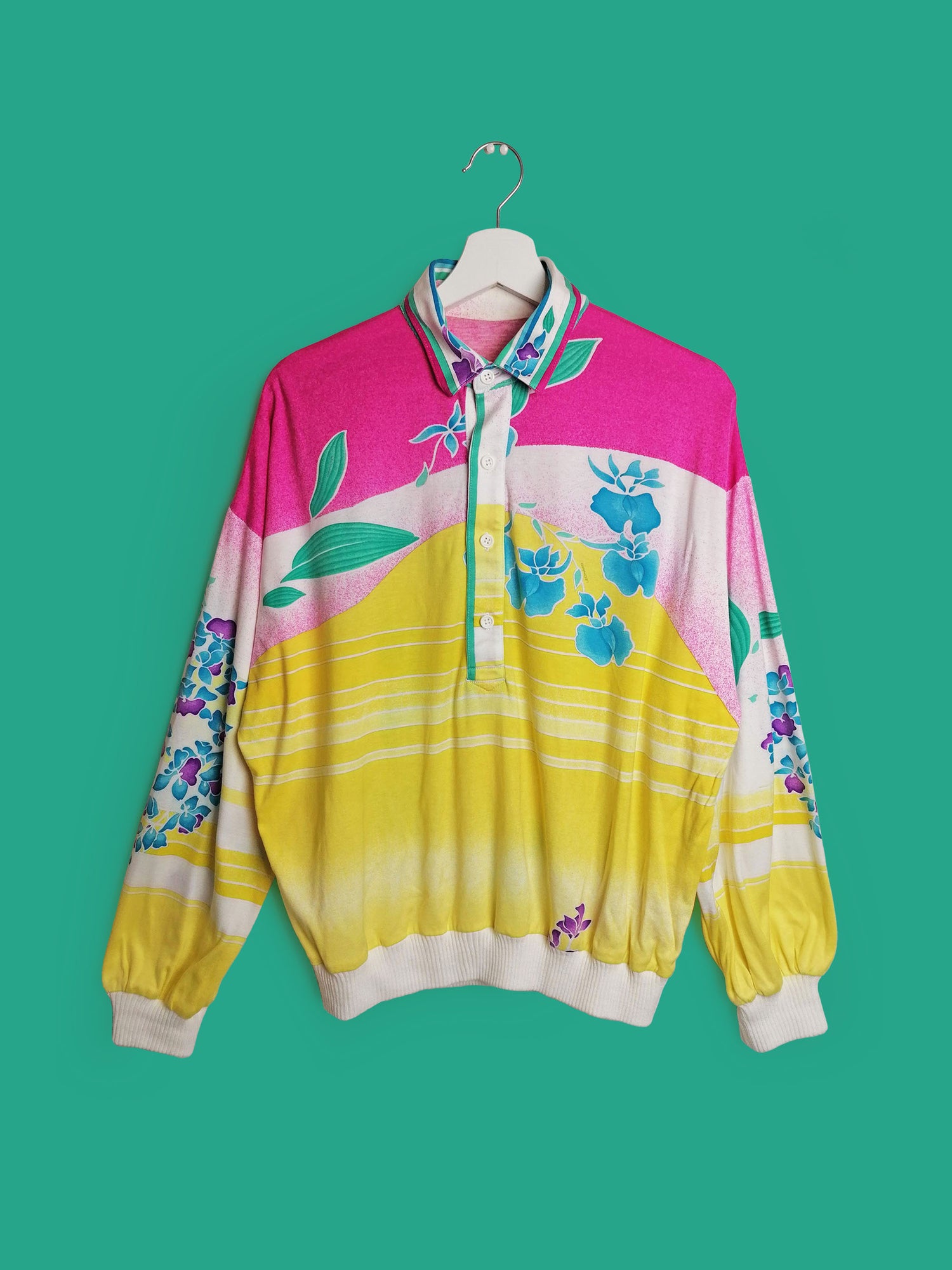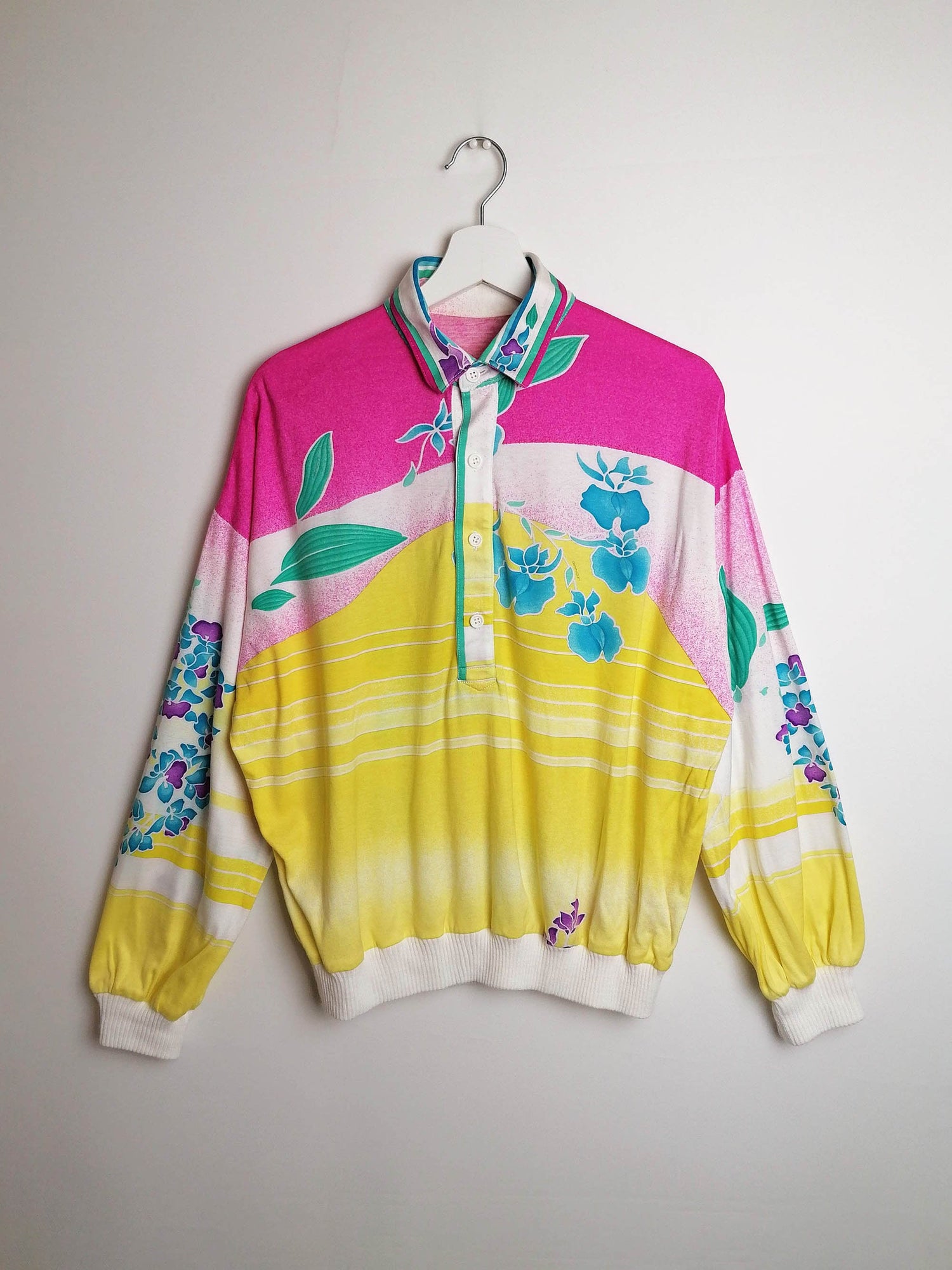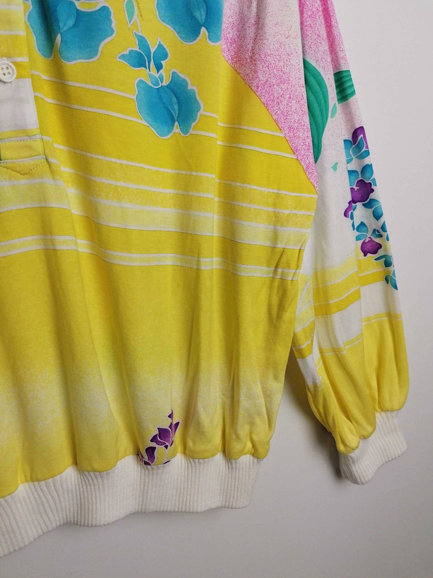 Beautiful vintage 70's LEONARD PARIS long-sleeved top, signature print, elastic cuffs and bottom. Seems to be a cotton blend, fabric is slightly see-through.