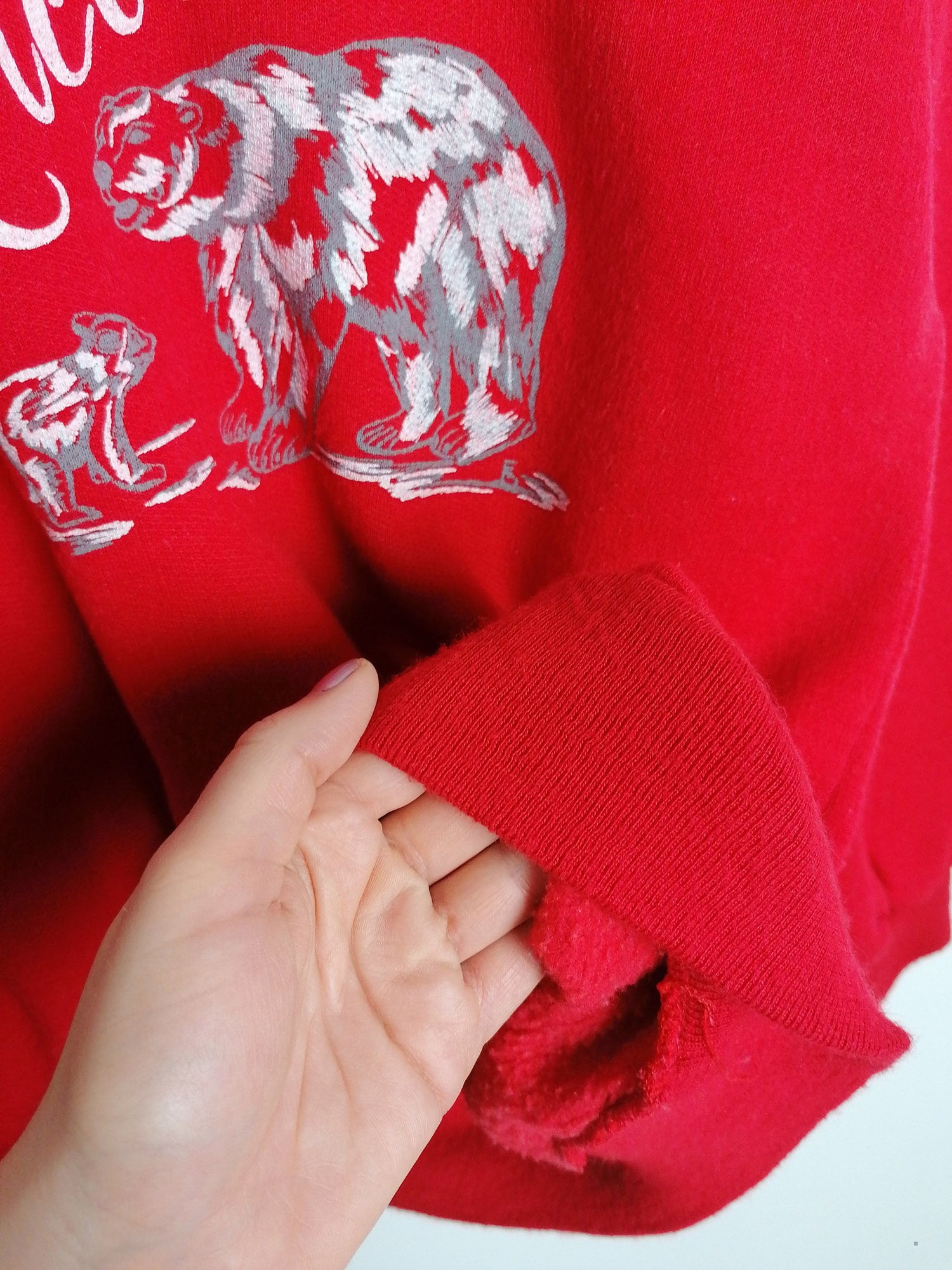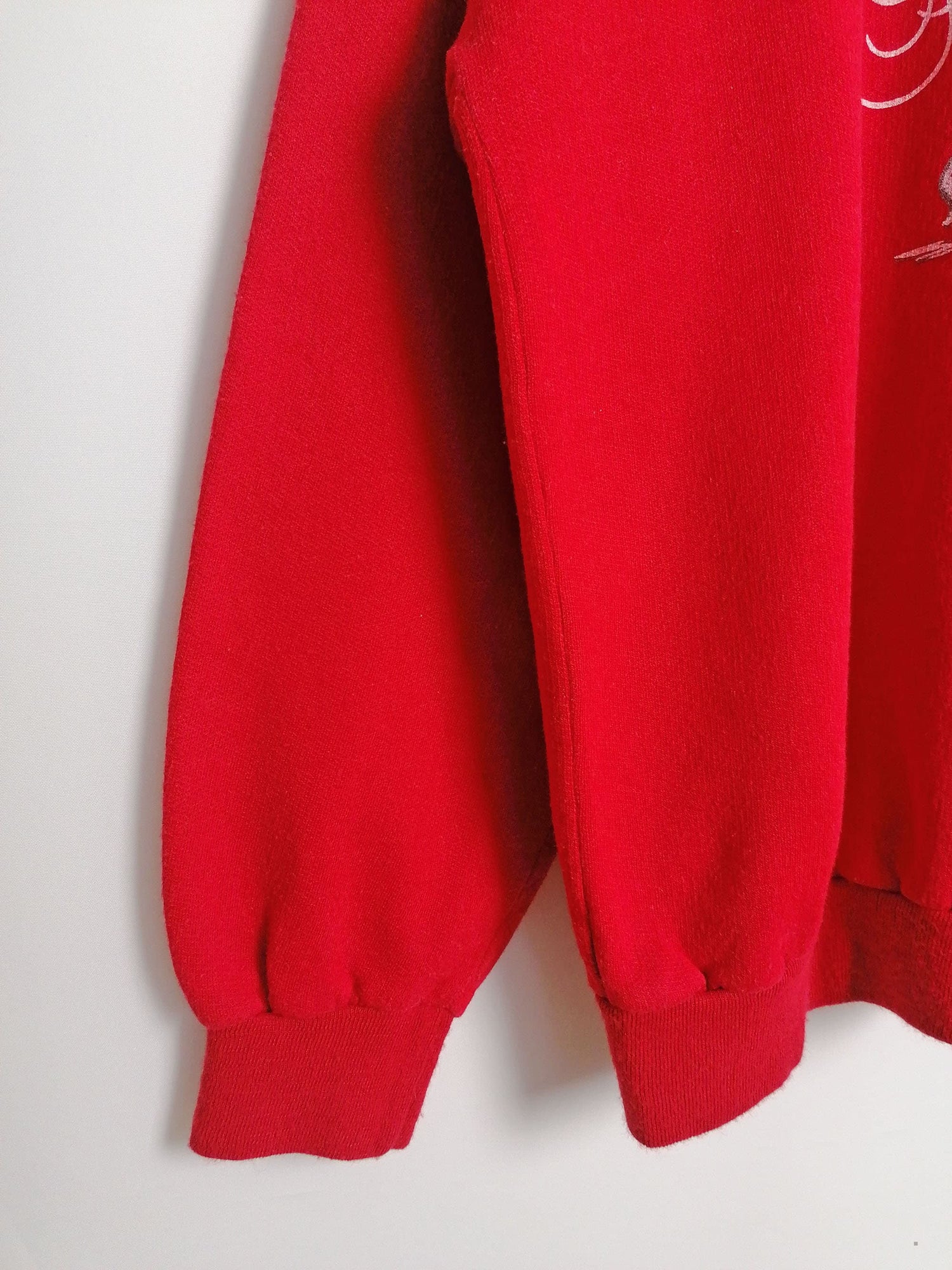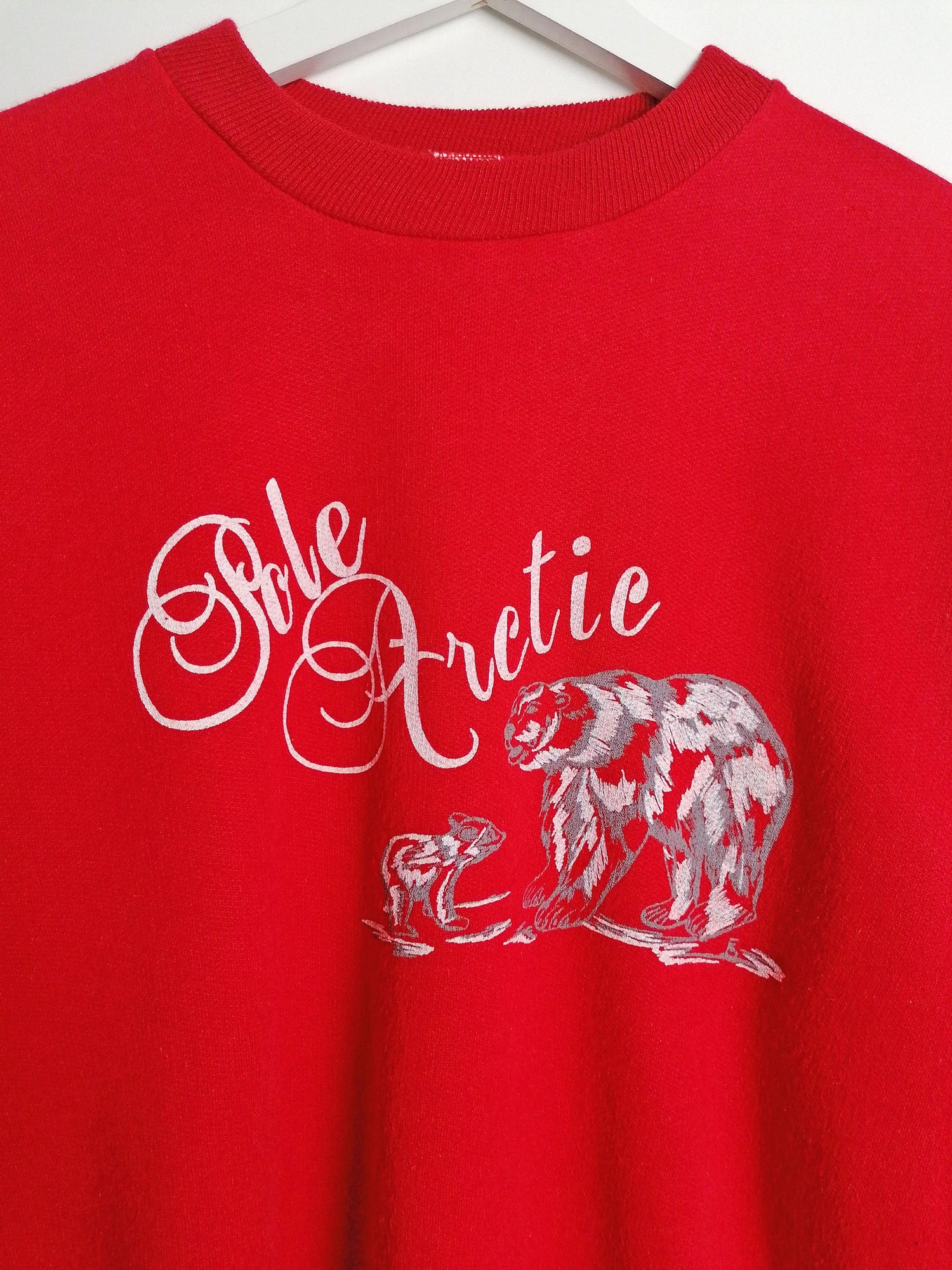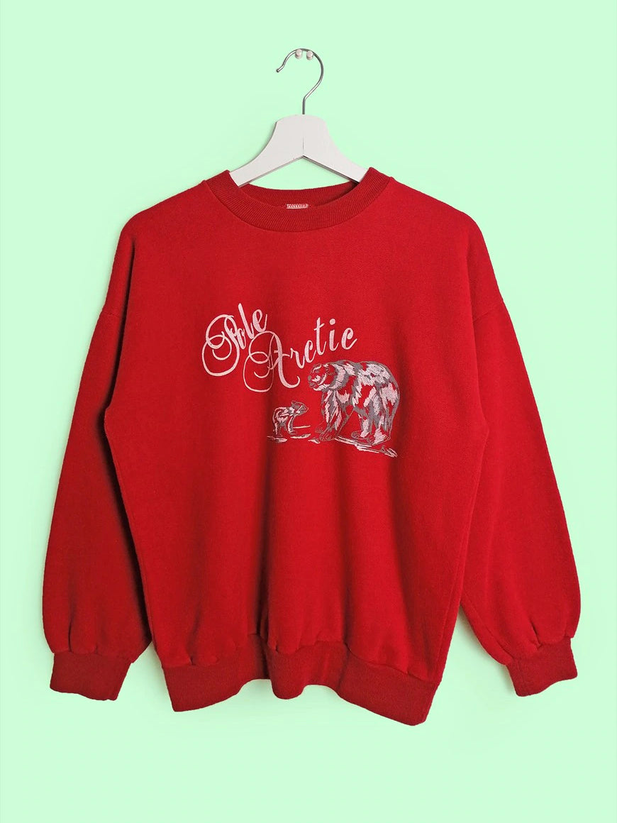 Very sweet vintage sweatshirt, polar bear print, bright red. Soft and fleecy on reverse, elastic cuffs and bottom. Made in Italy.