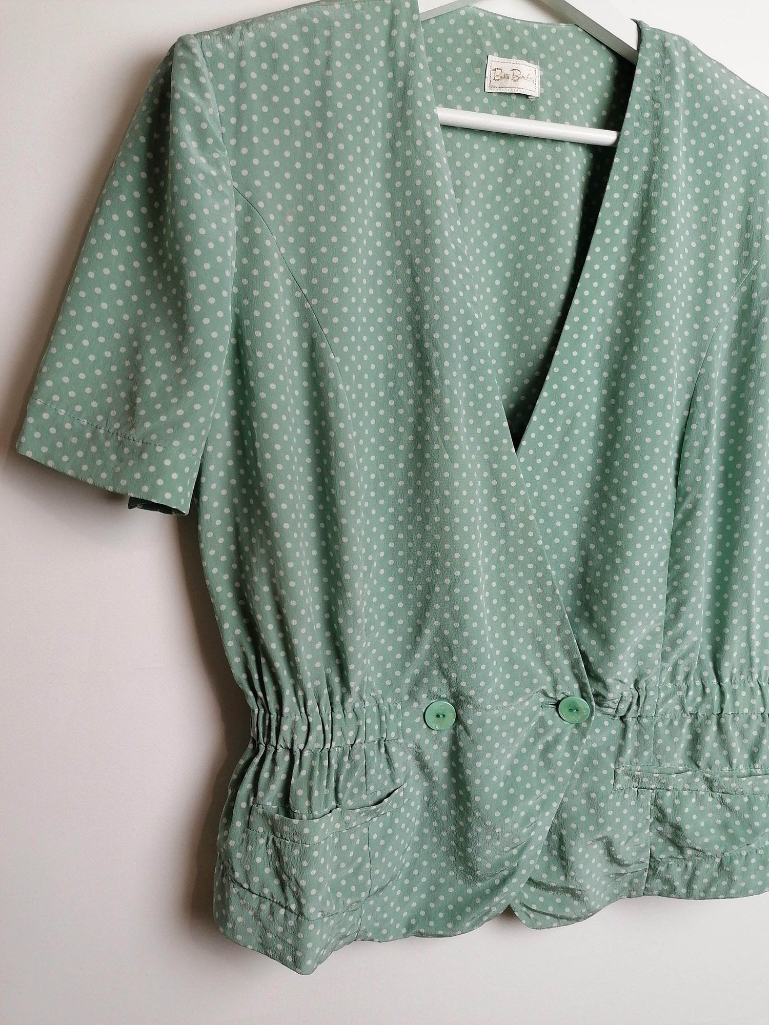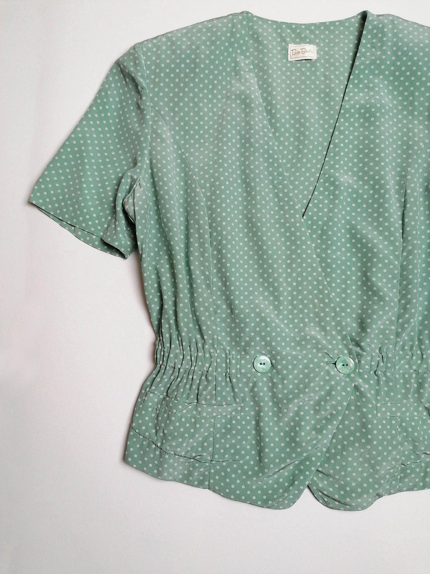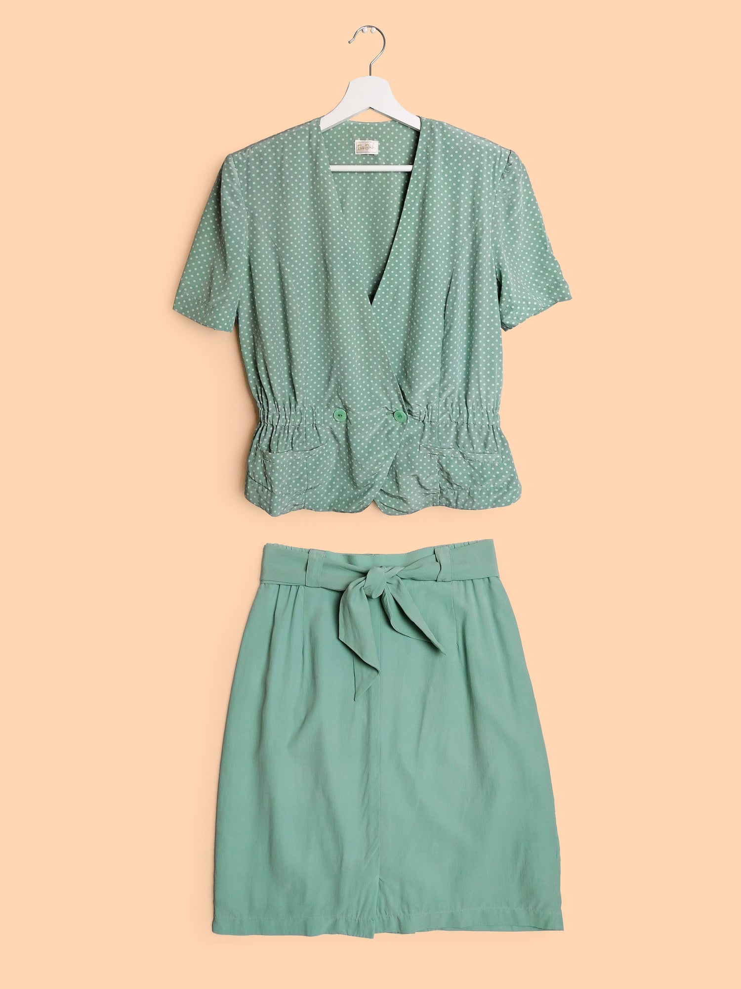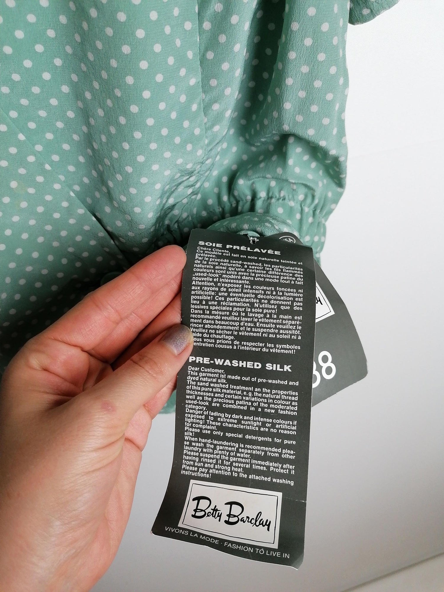 Stunning vintage 80's - 90's Betty Barclay 100% silk set, deadstock, tags still attached. Blazer is a gorgeous sea-foam green with white polka dots, shimmery buttons, skirt is solid. Top is a blazer, elastic waist, padded shoulders. Skirt is high waist, above the knee, has a fabric belt.